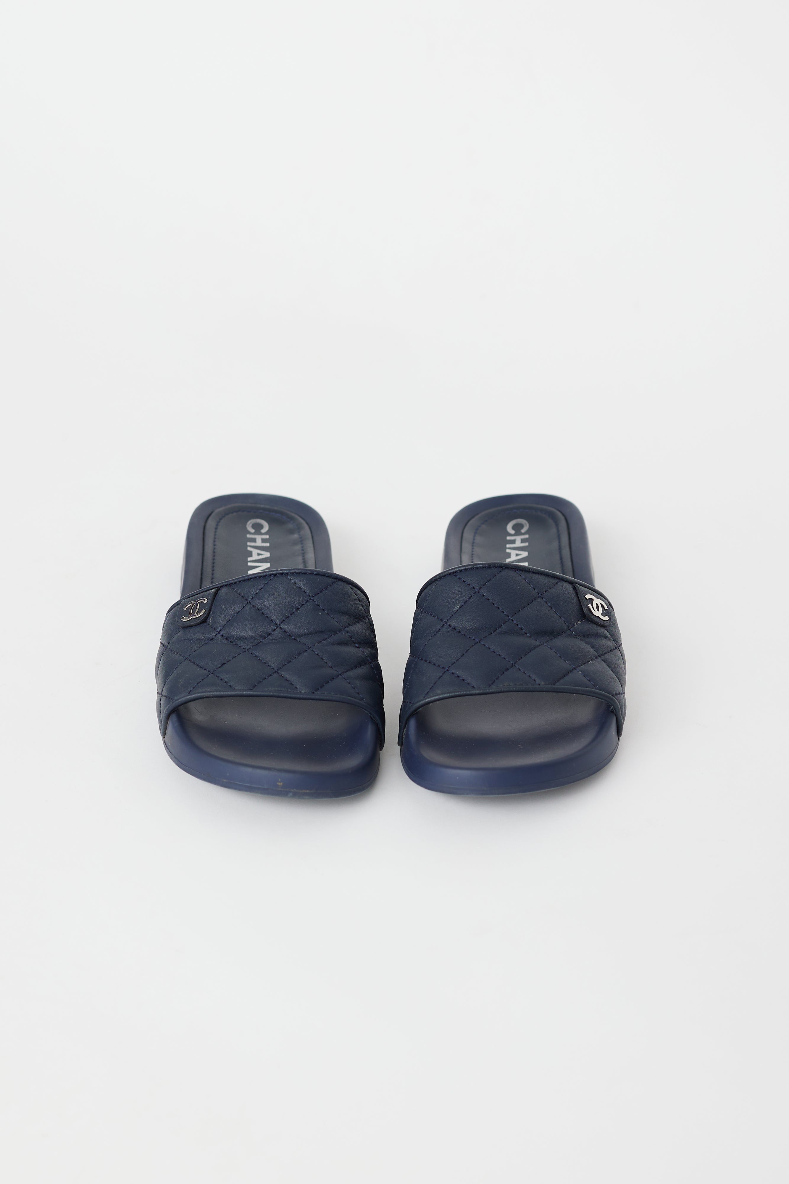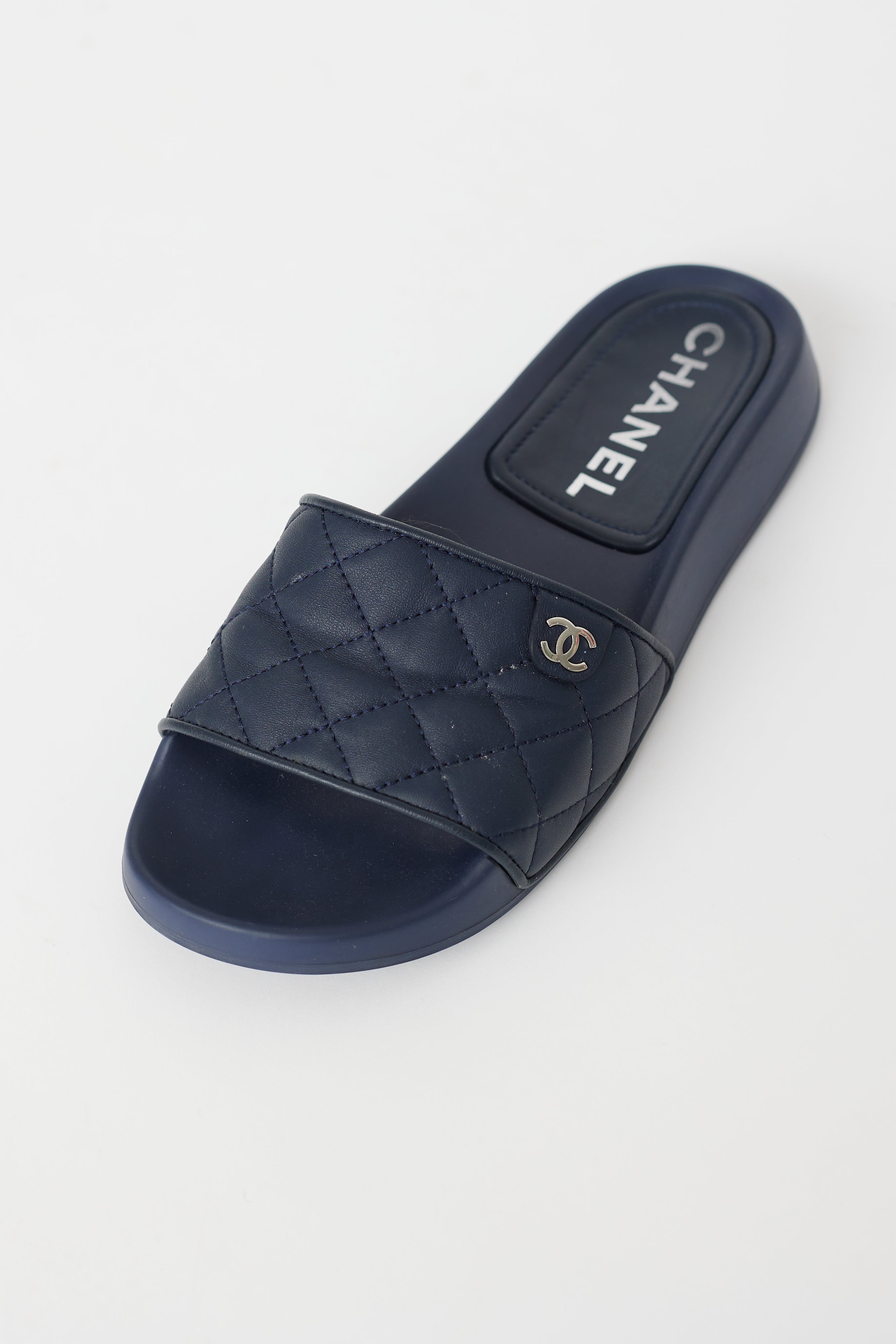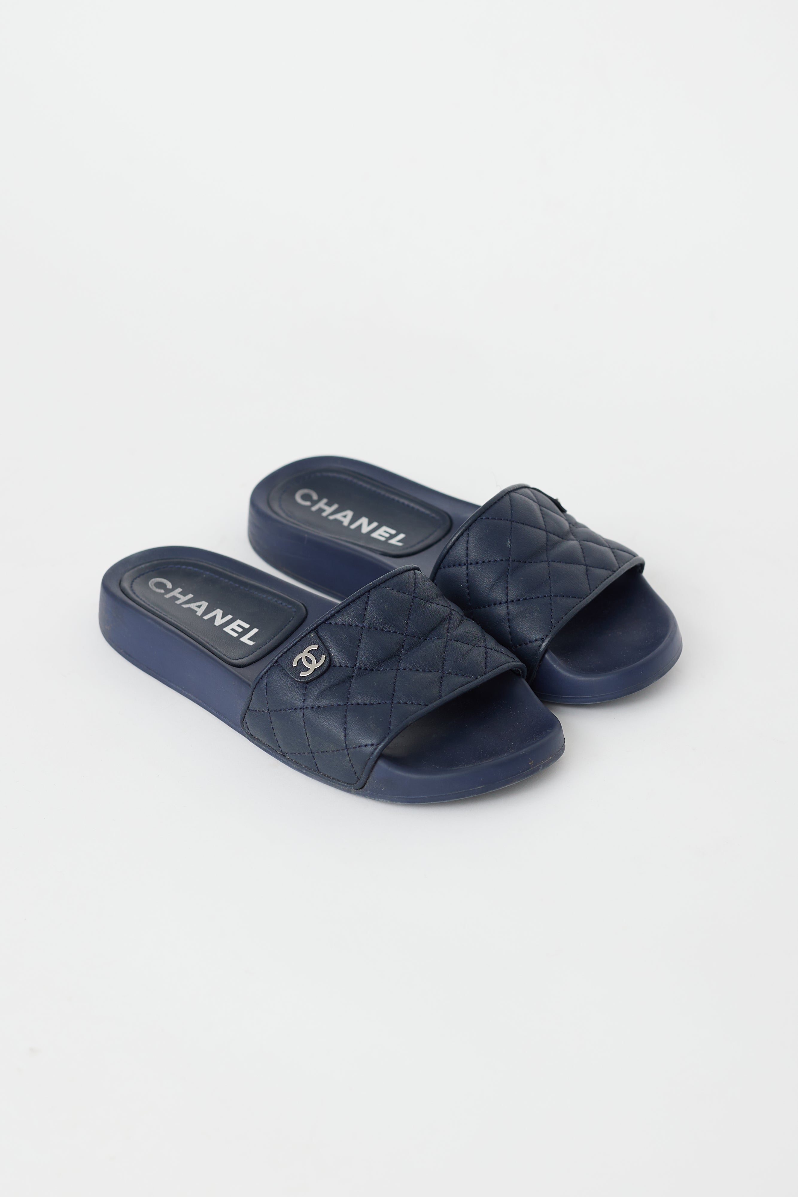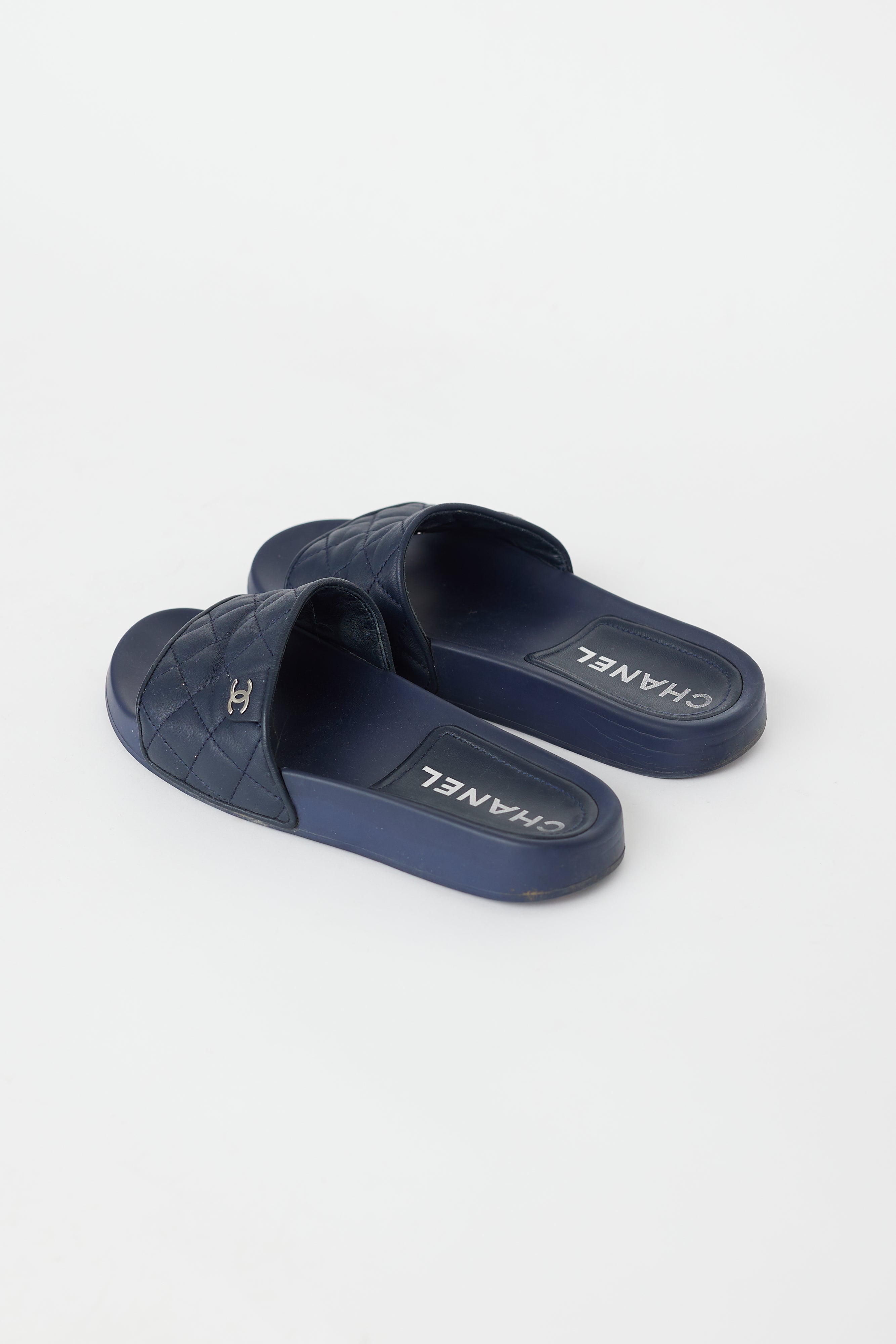 Pre-owned Chanel navy rubber slides featuring open rounded toe, quilted strap at front, silver tone CC logo at tongue, and silver stamped logo at insole.