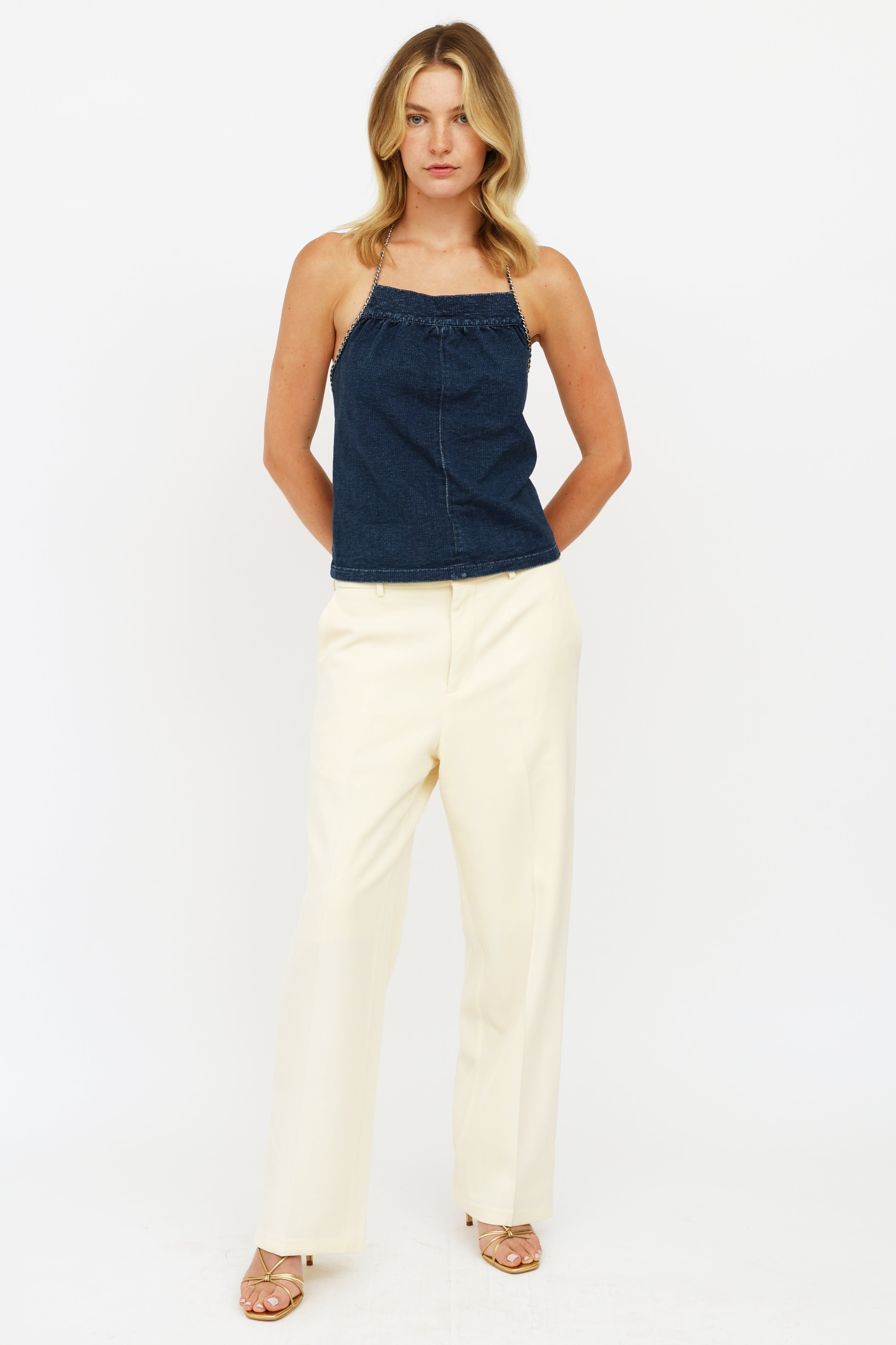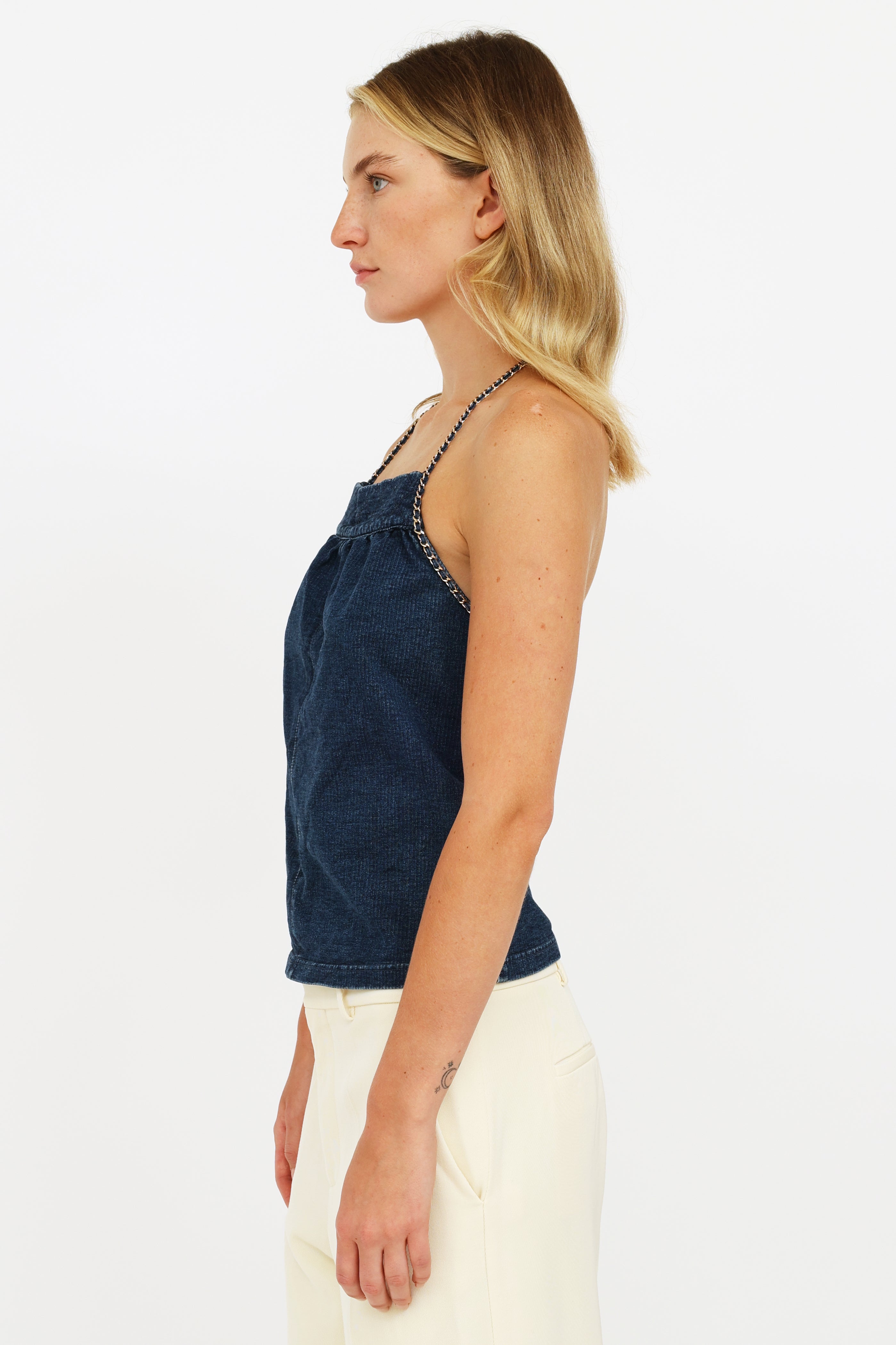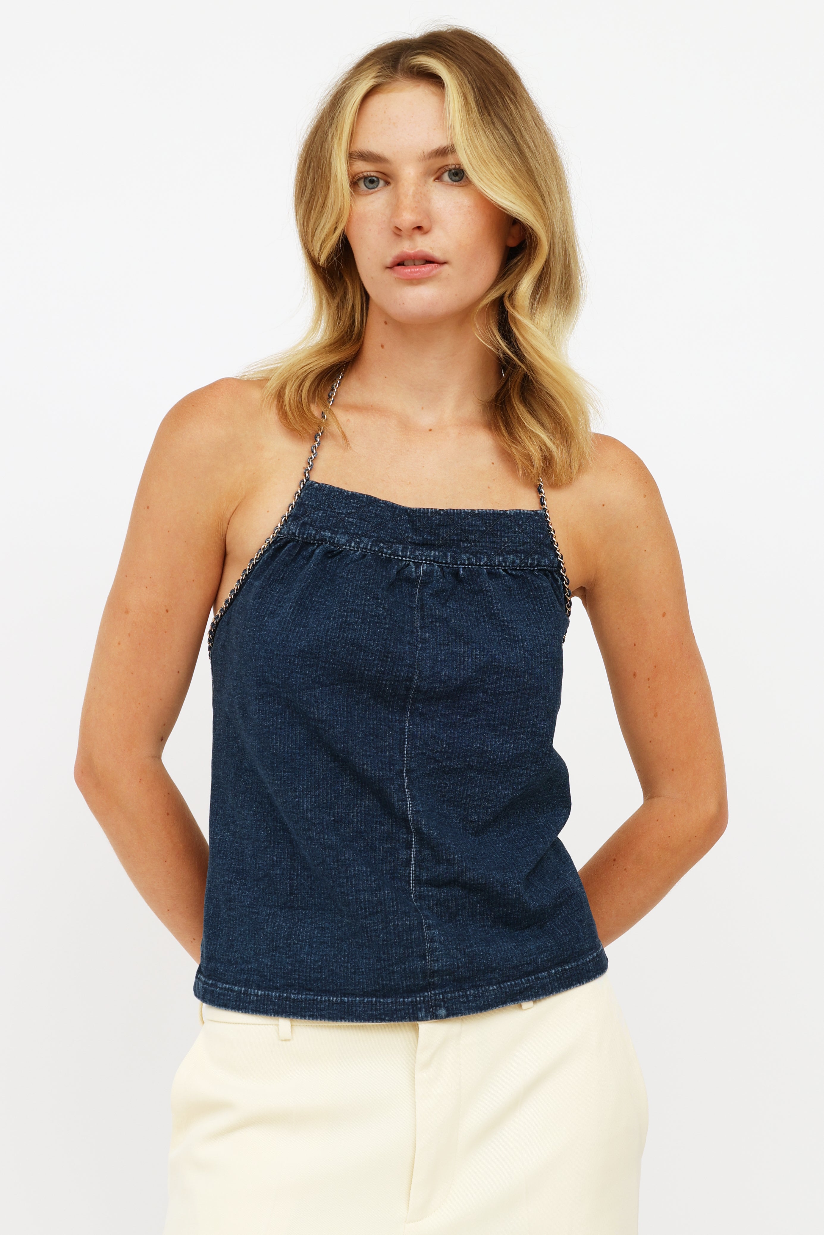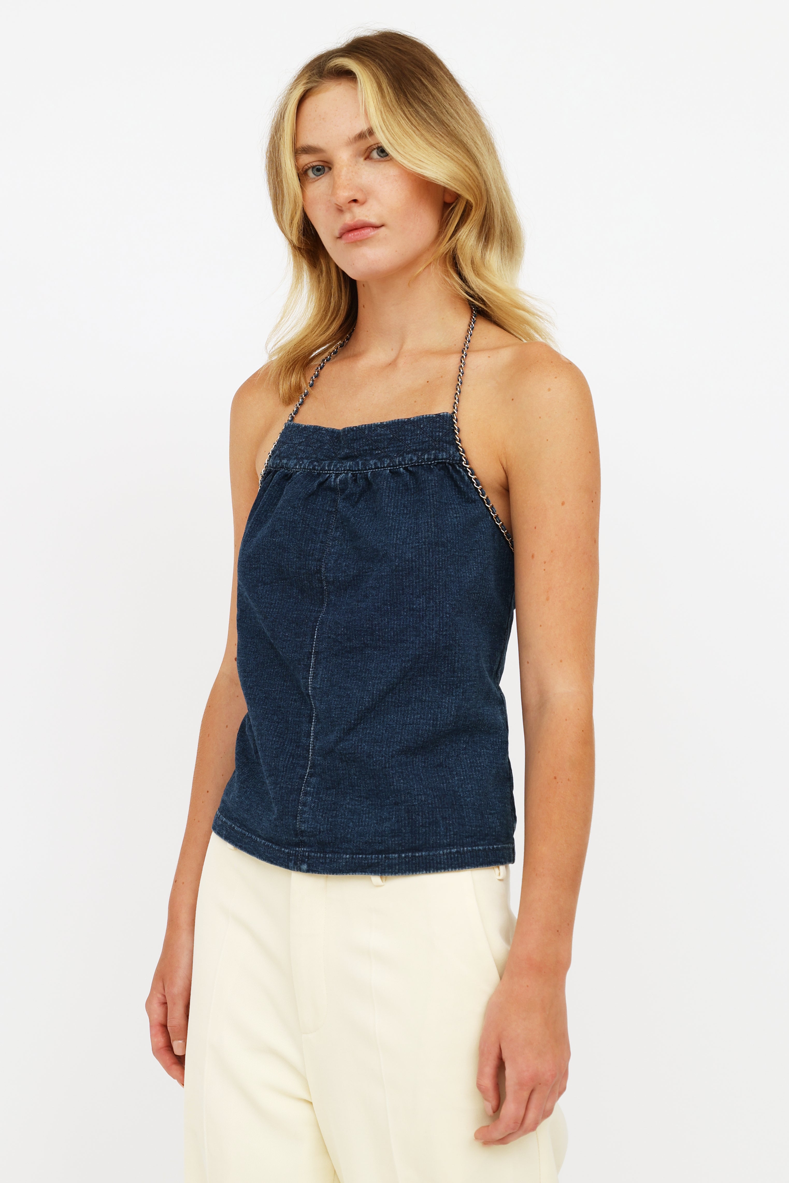 Pre-owned Chanel denim halter top featuring a quilted neckline, gold-tone chain and denim intertwined strap with clasp that trails down along sides, and zip closure on back.