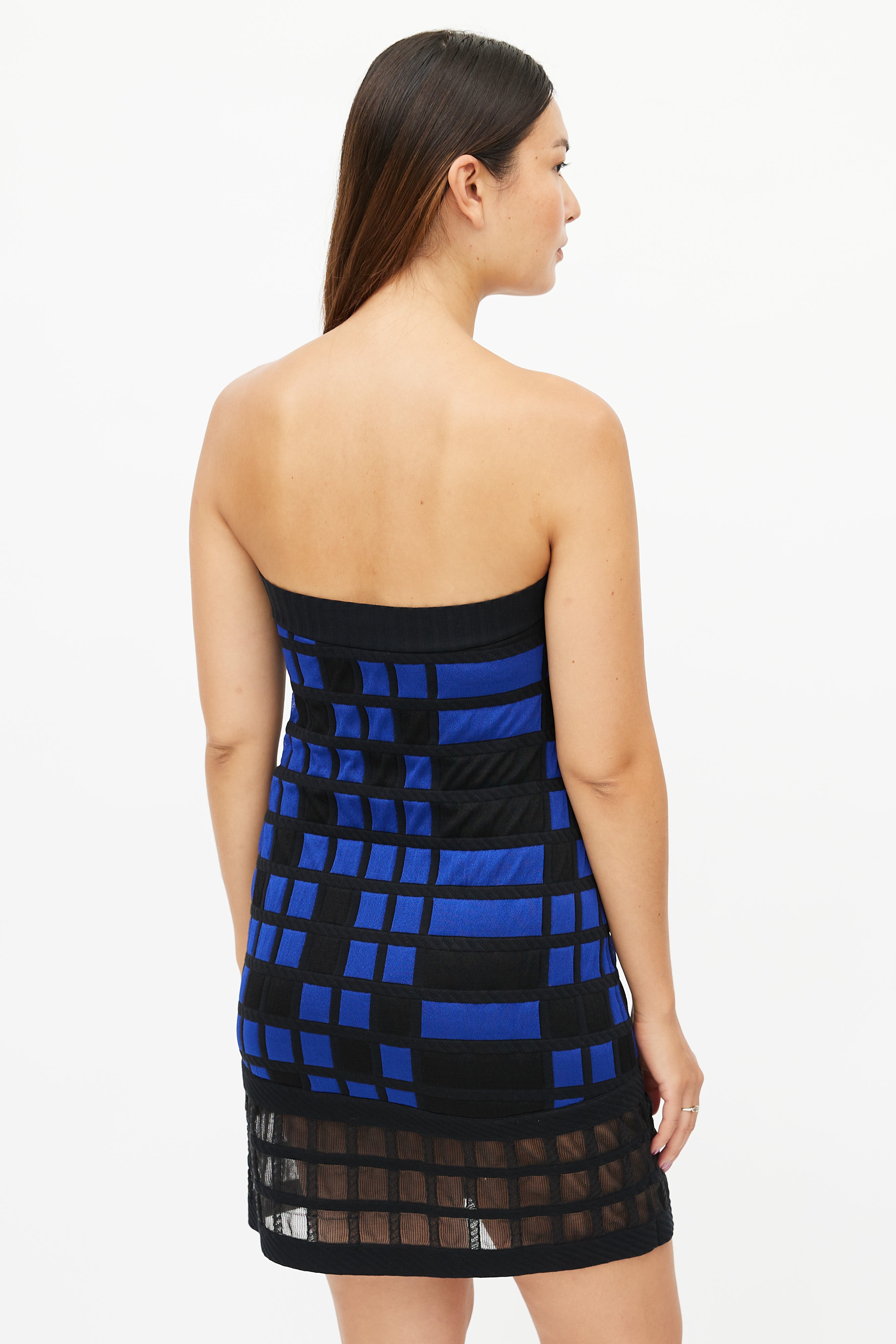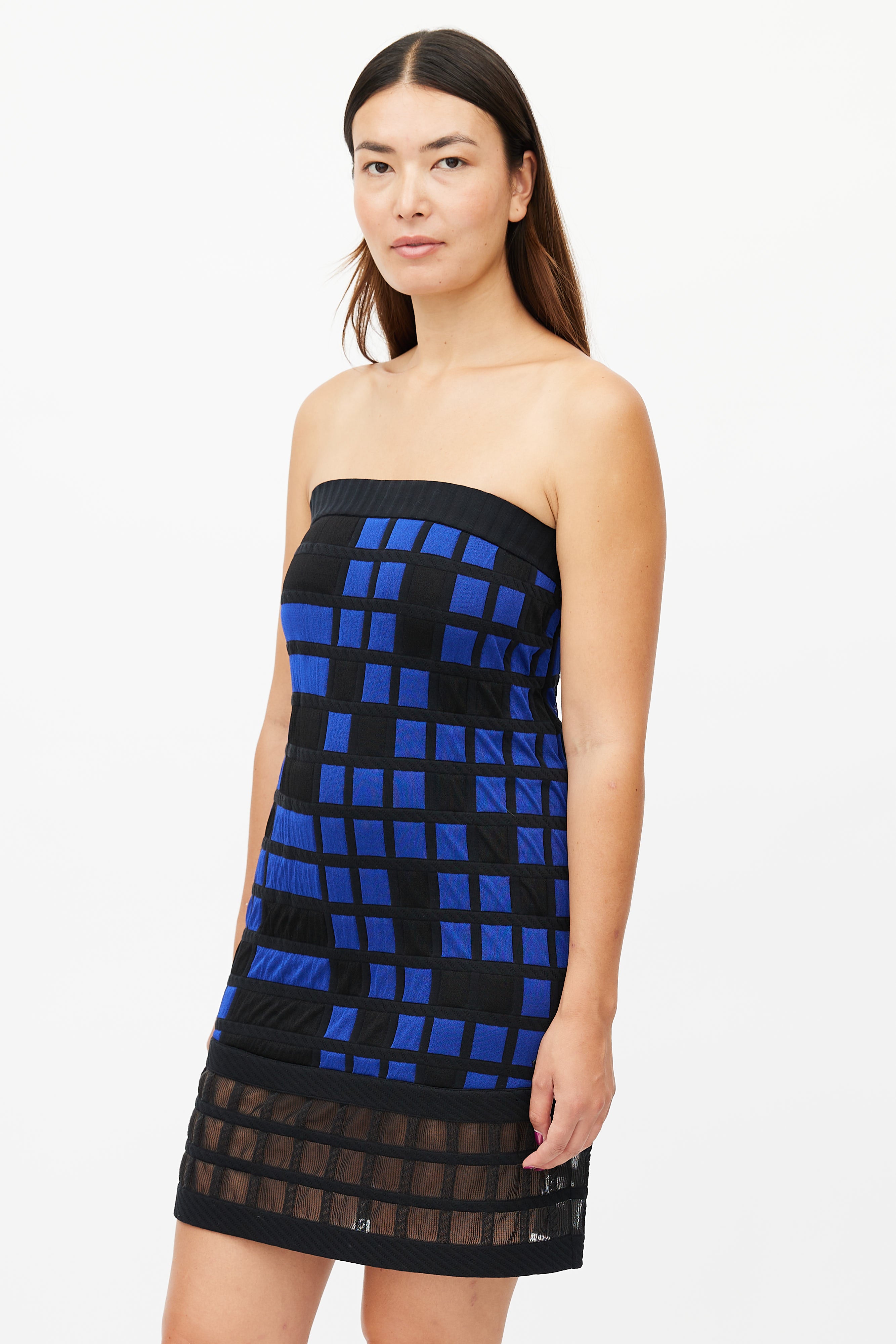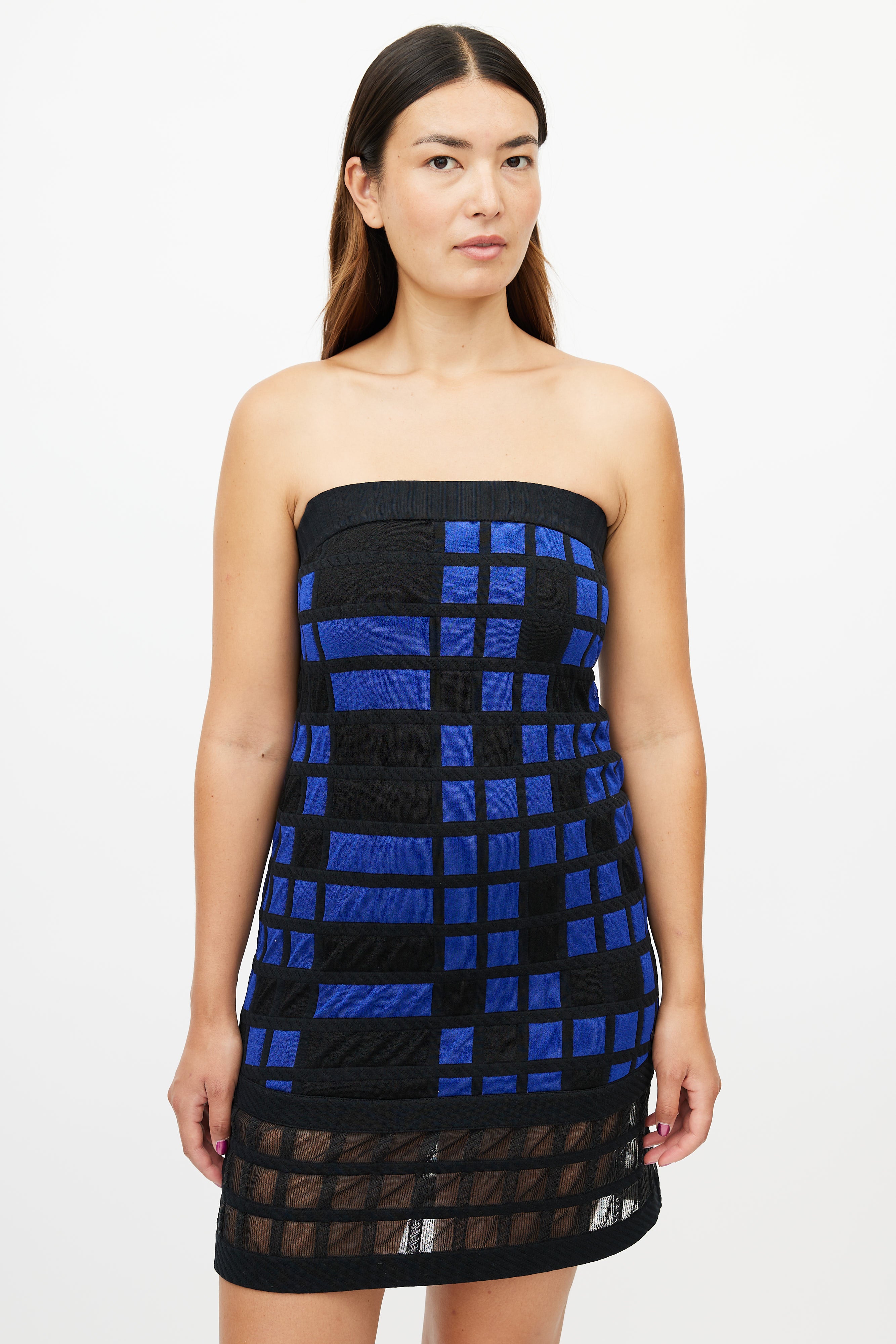 Pre-owned Spring 2013 Chanel black and blue dress featuring concealed zip closure at side, checked intarsia, logo hardware at hem, and sheer checked panel at hem. Look 35 from the collection.