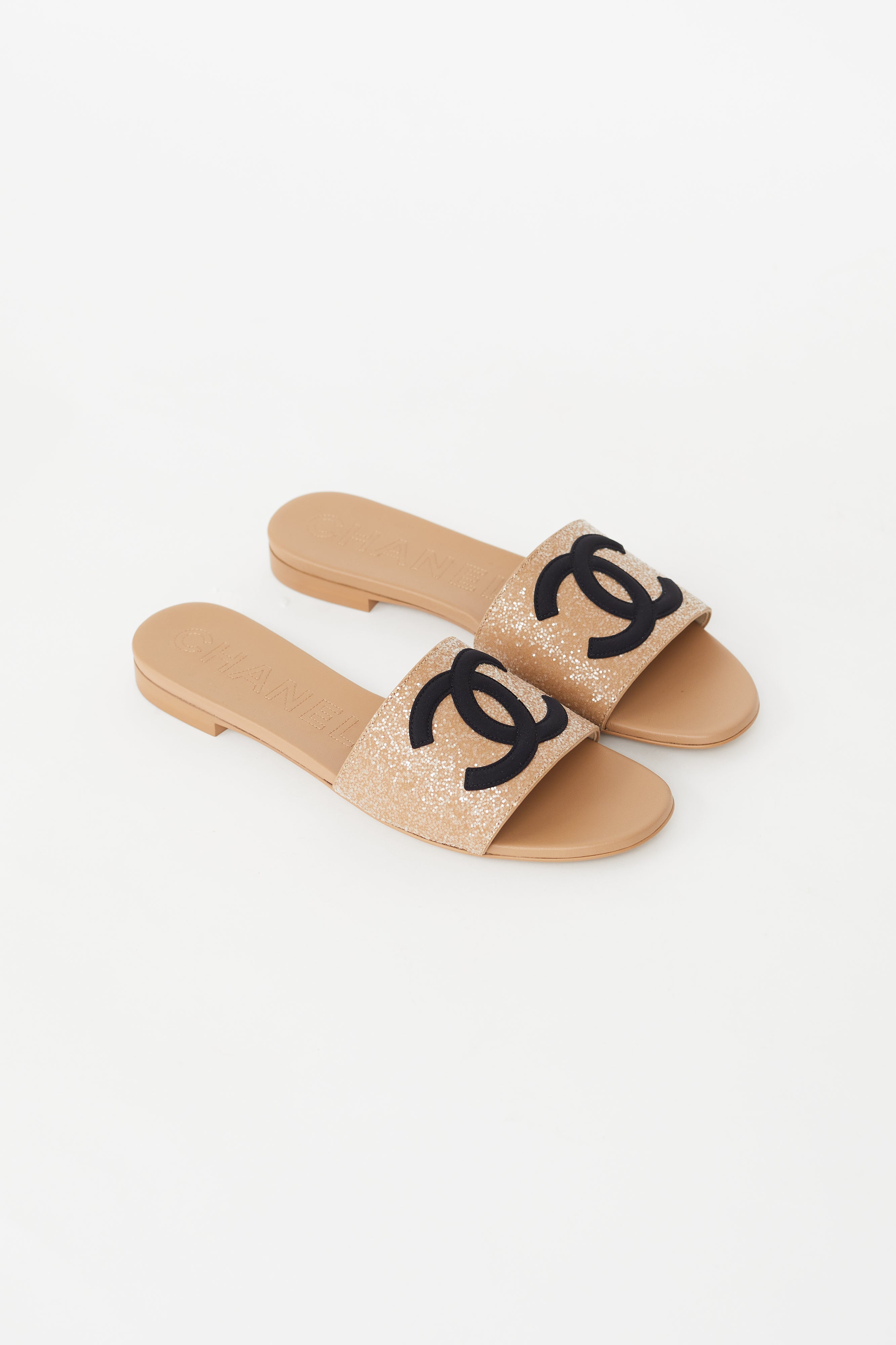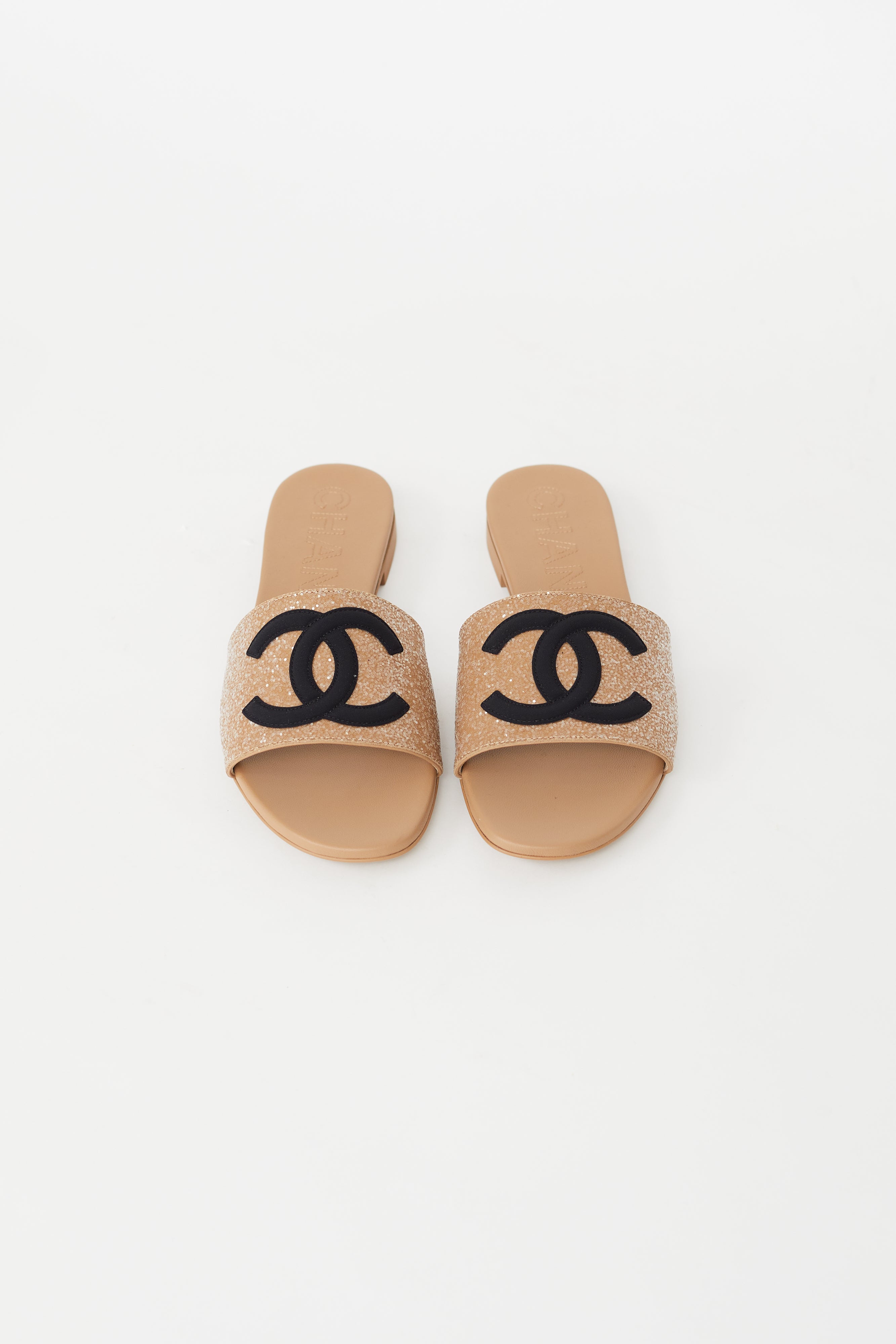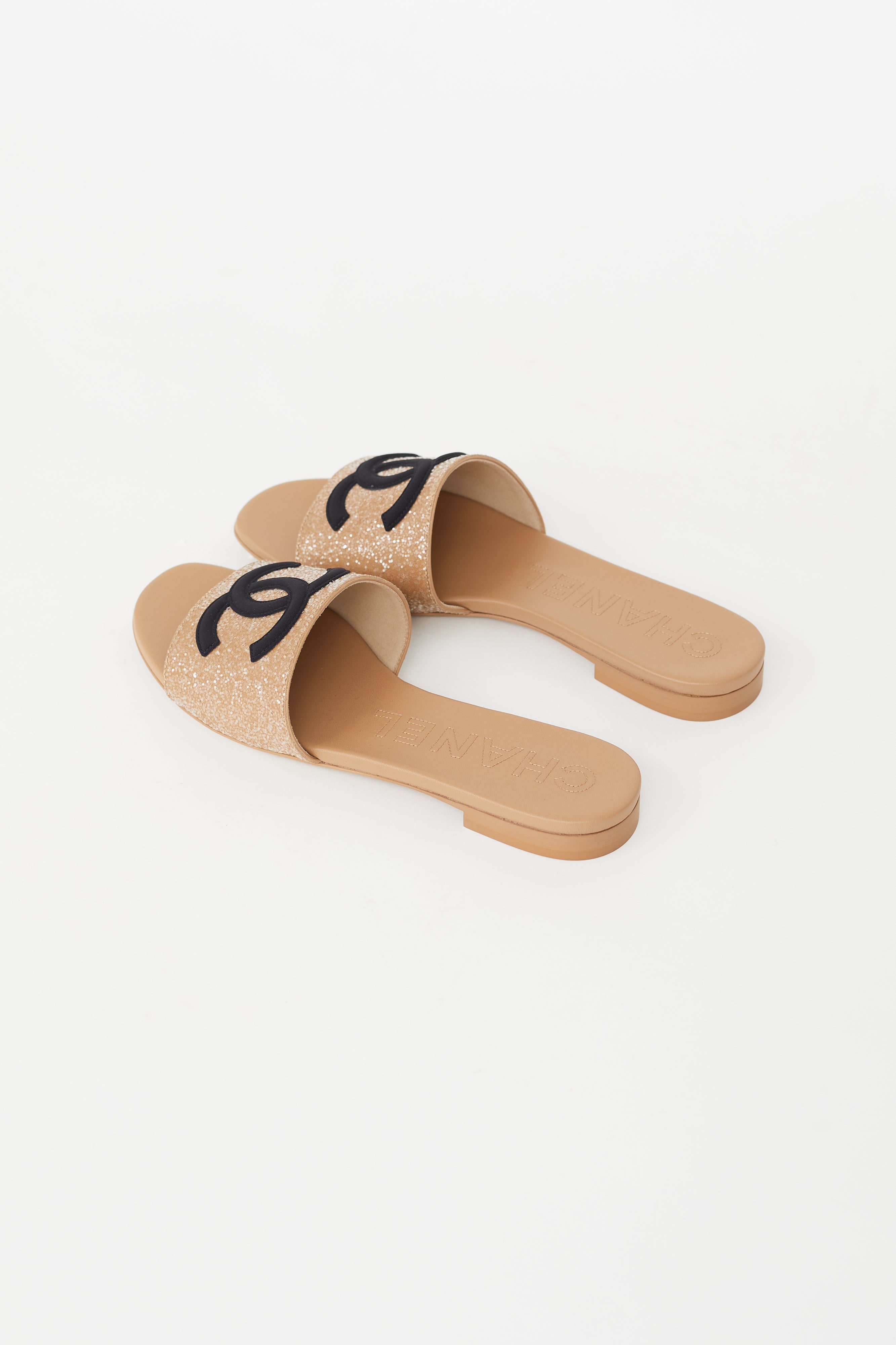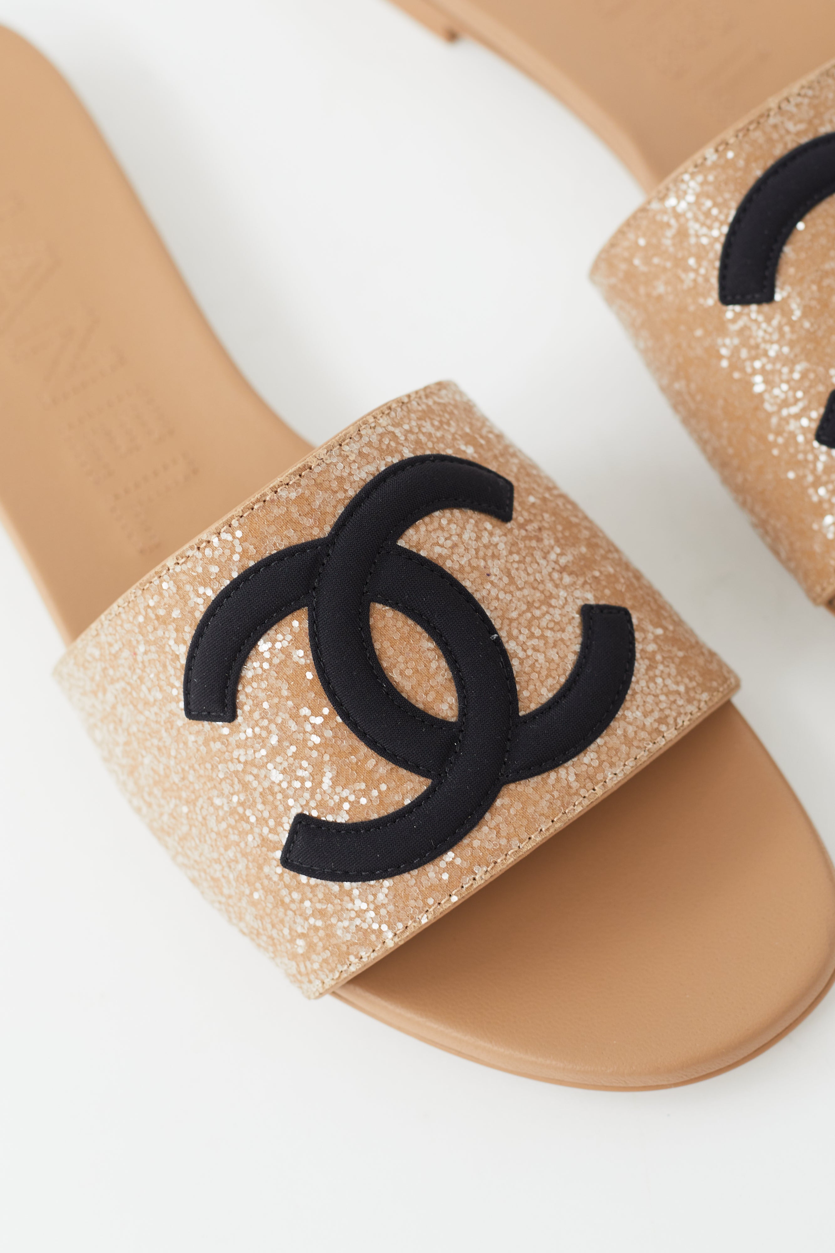 Pre-owned Spring 2023 Chanel beige slides featuring open rounded toe, glitter embellished vamp, black CC patch at vamp, embroidered logo at insole, and short stacked heel. Comes with original box and dust bag.