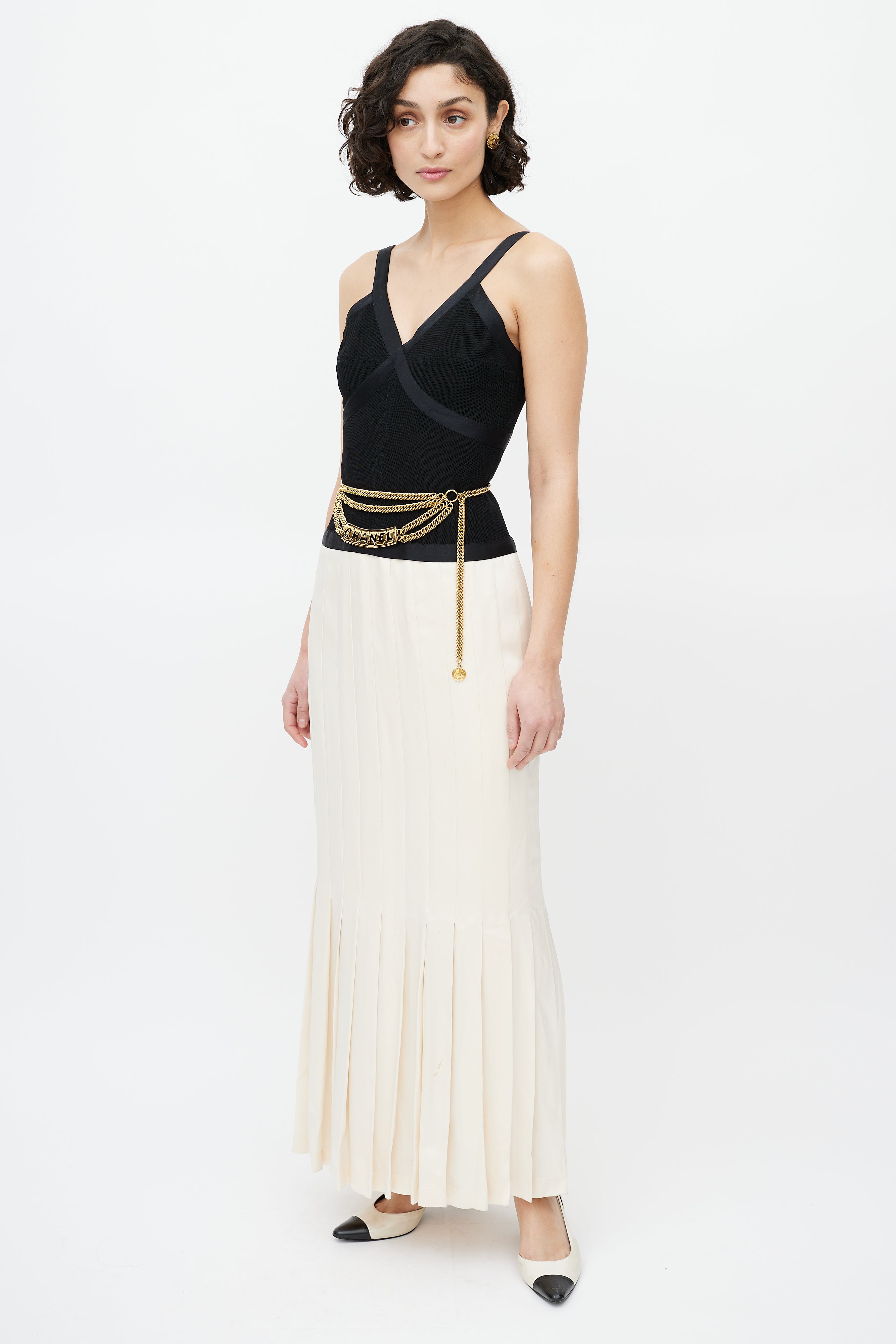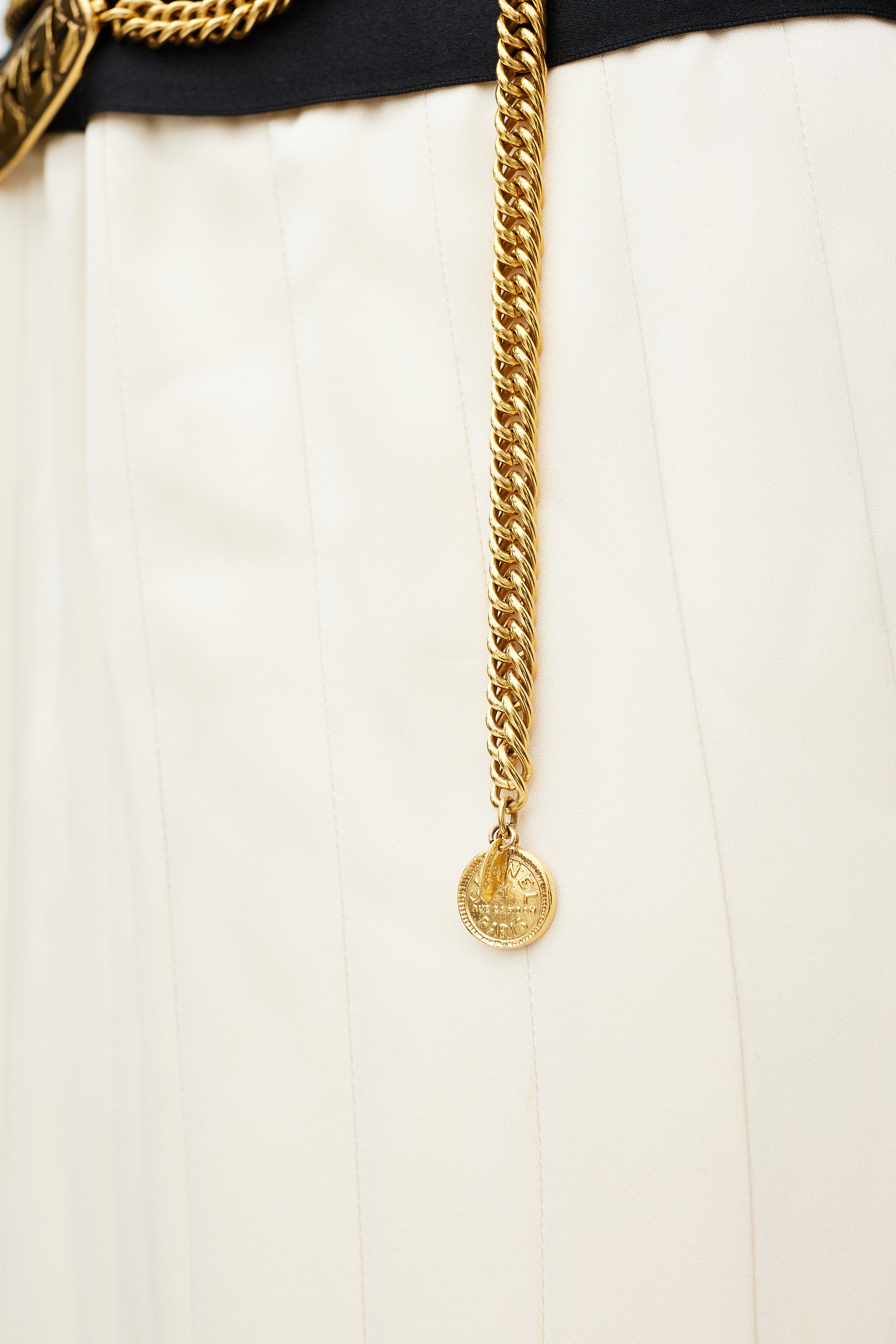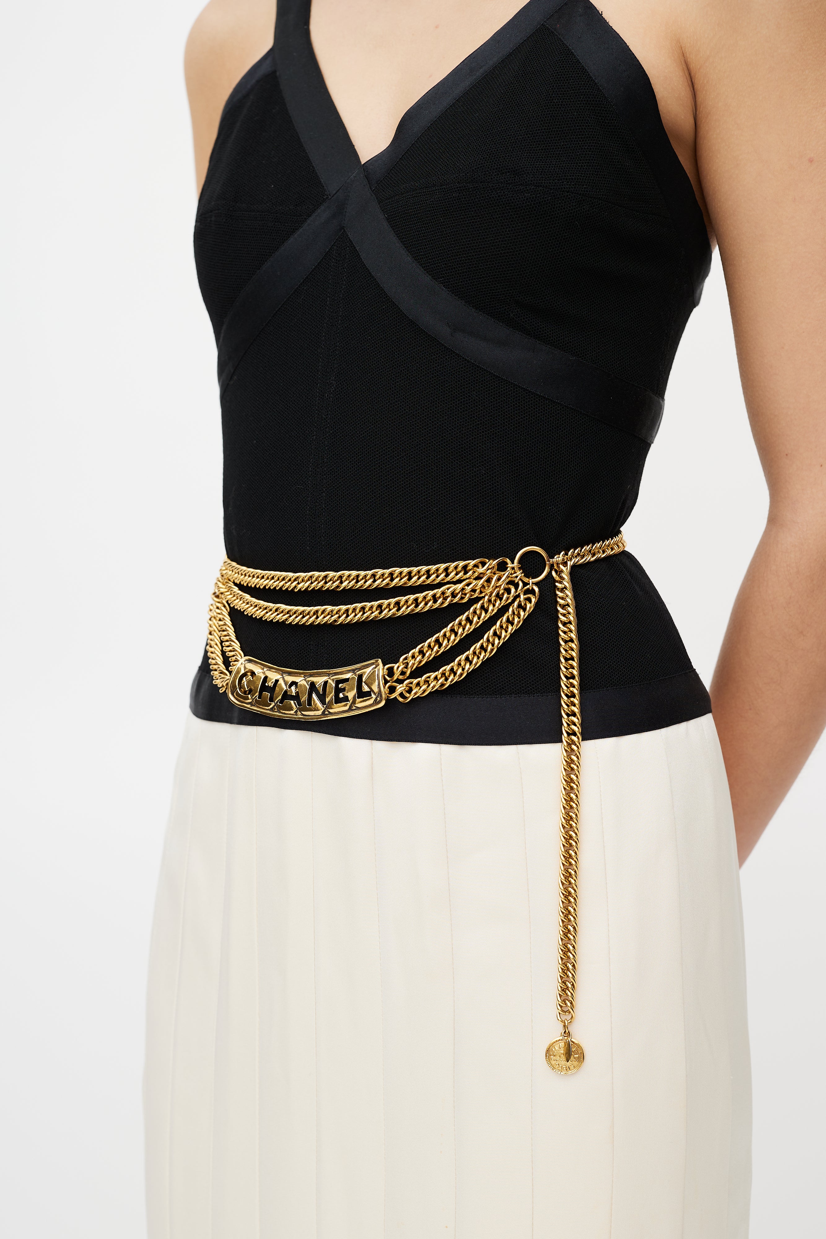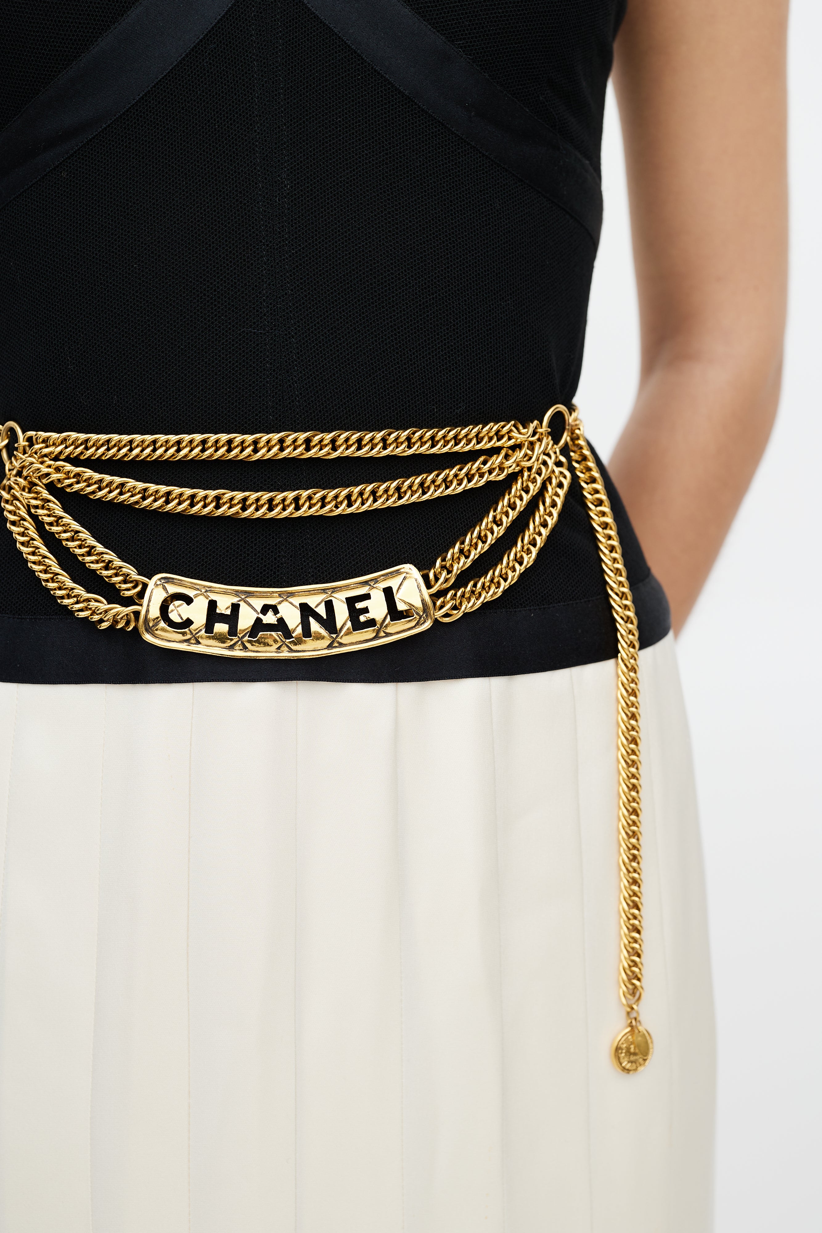 Pre-owned Chanel gold belt featuring multi chain link layer, logo charm at end, logo cut out with quilt motif, and clasp closure.