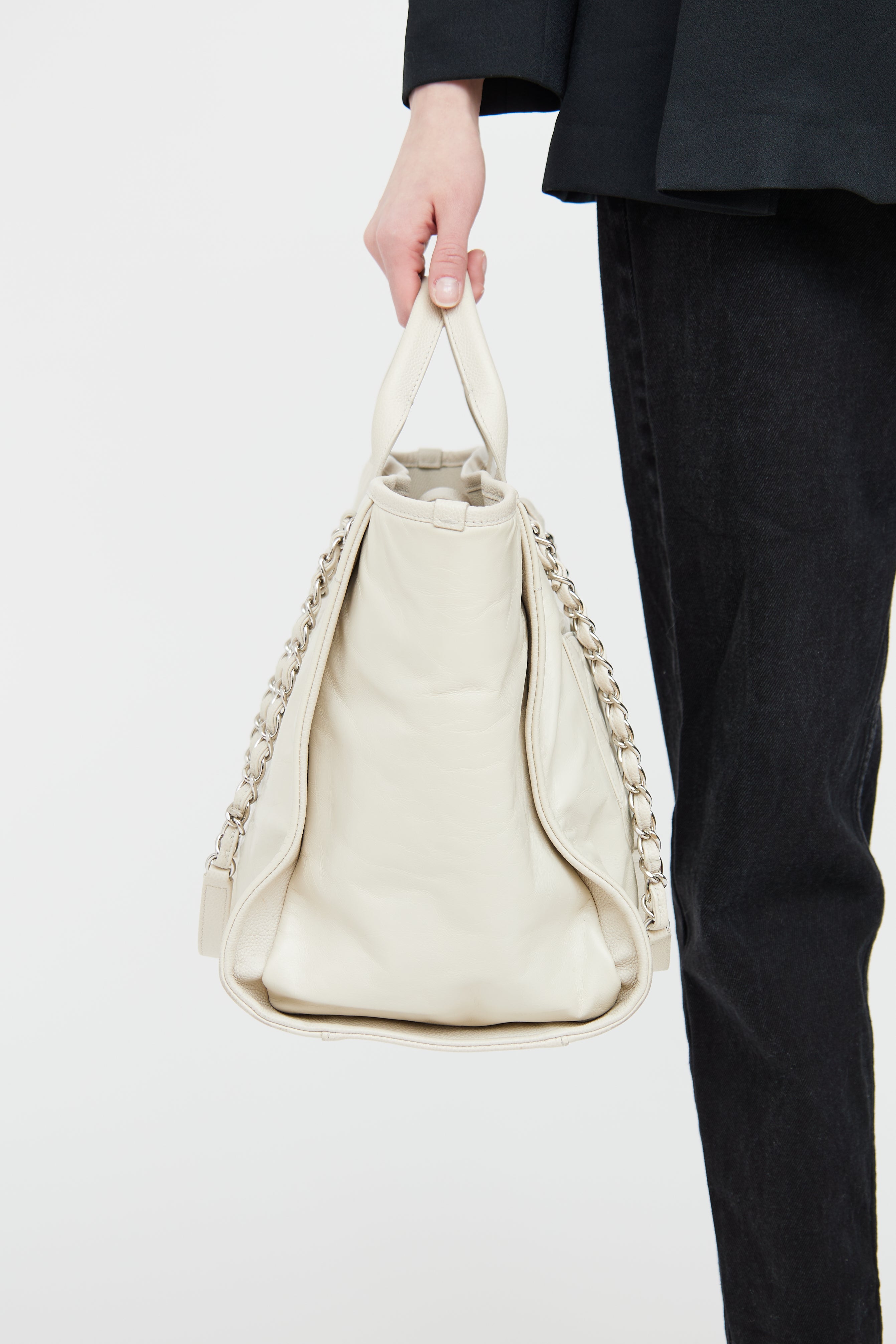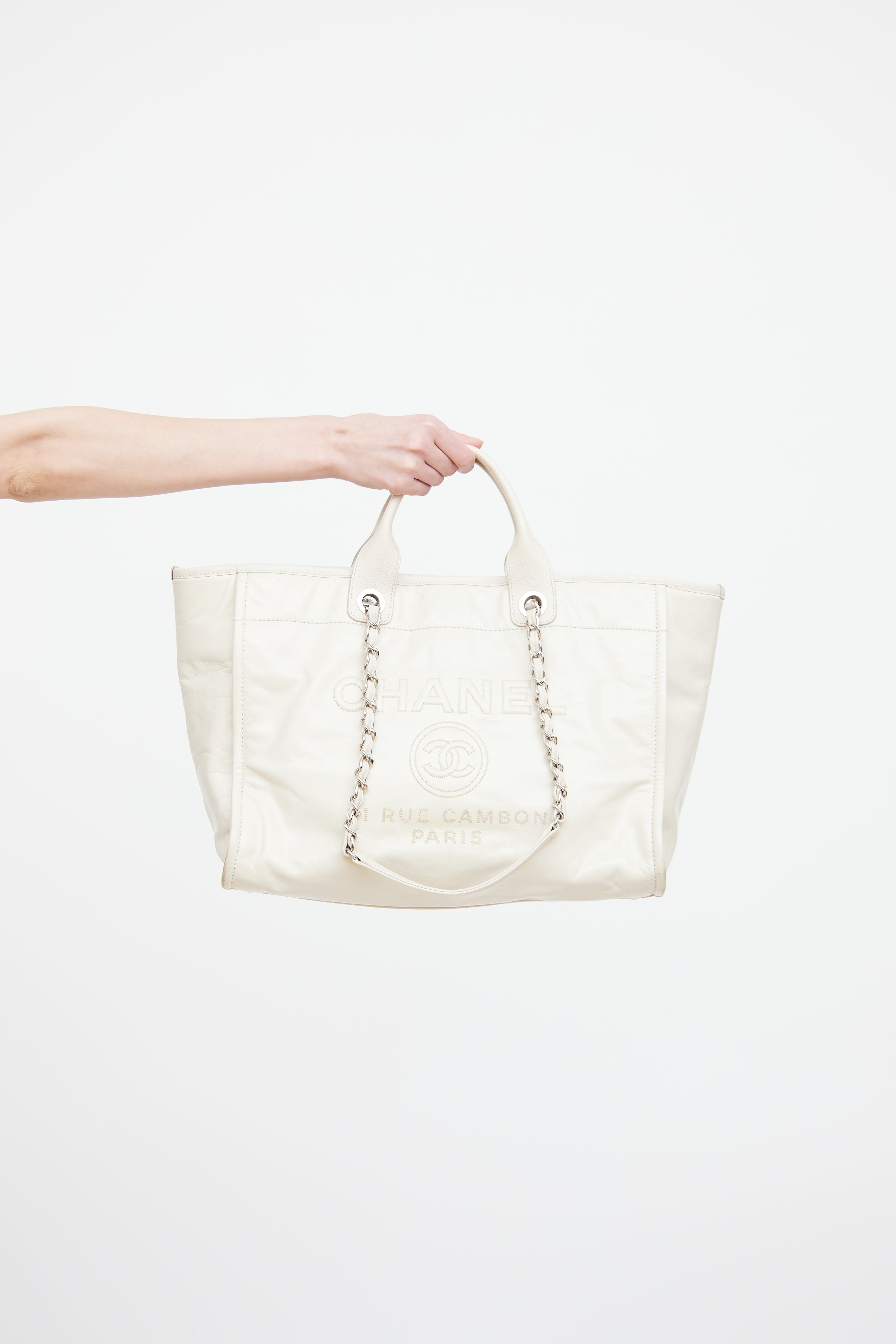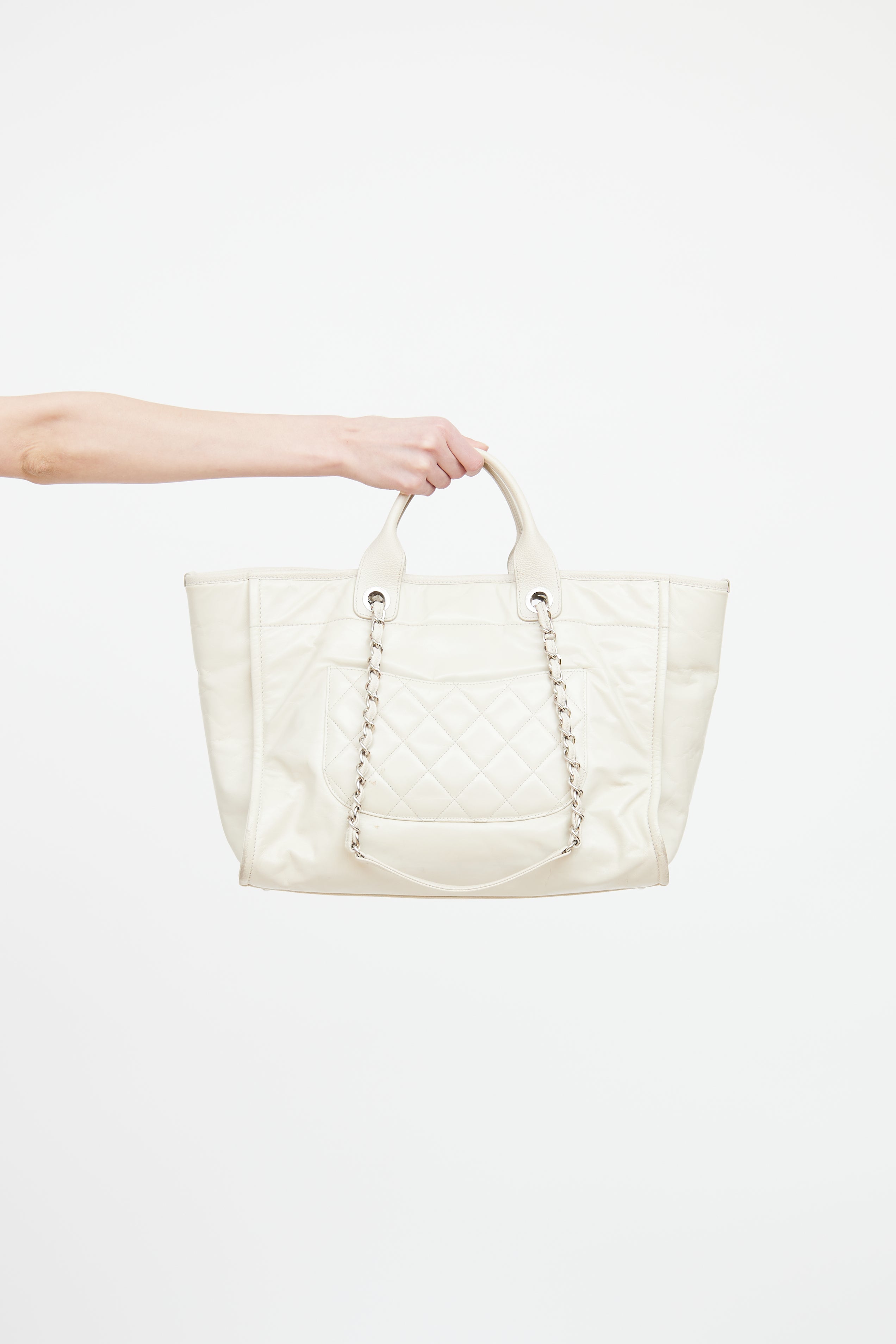 Pre-owned Chanel white glazed Deauville Shopper featuring dual rolled top handle bag, removable shoulder chain, silver tone hardware, front embroidered logo, back slip pocket, one main canvas lined interior, interior D-ring, dual interior slip pockets, and interior zip pocket.