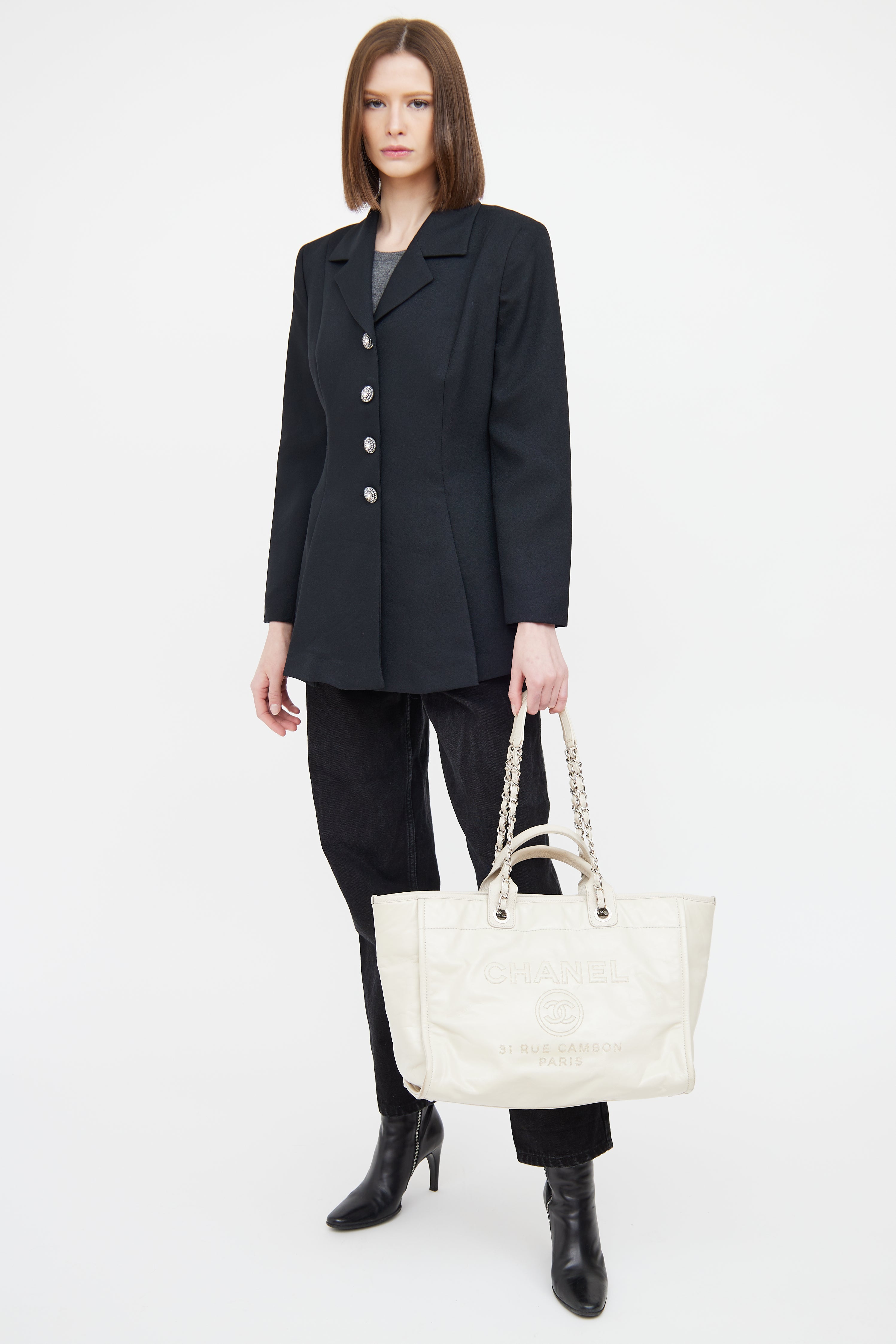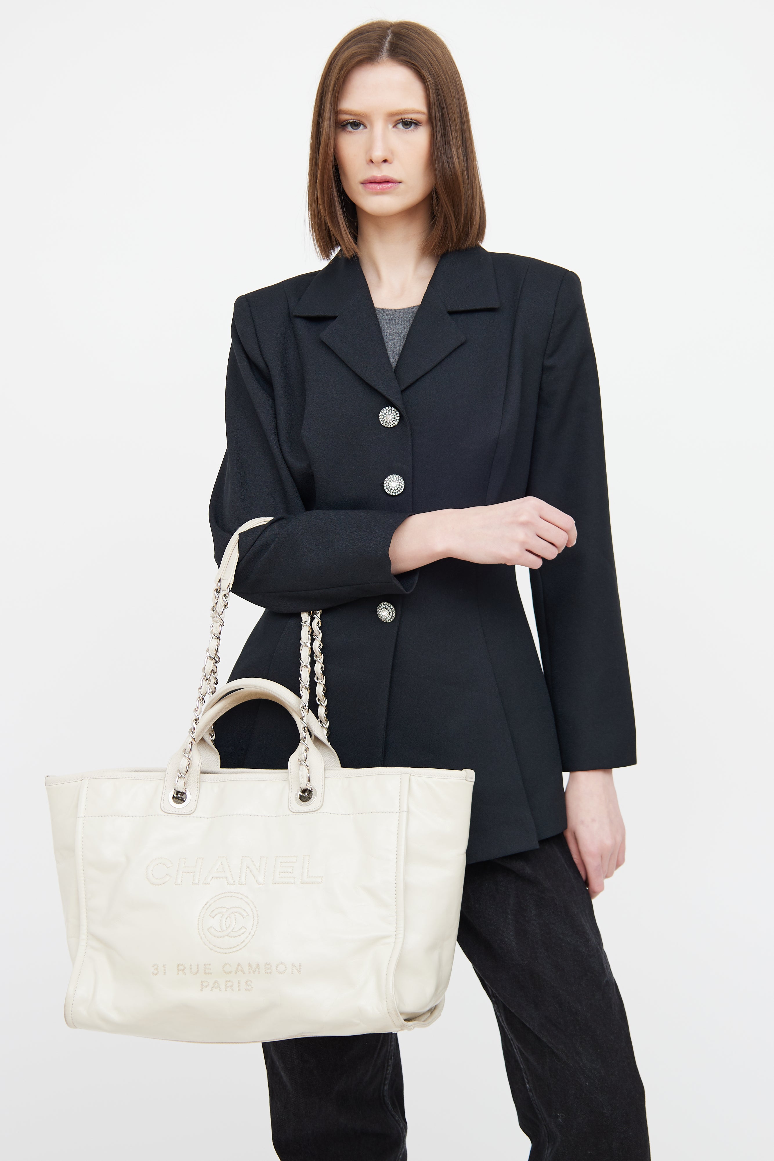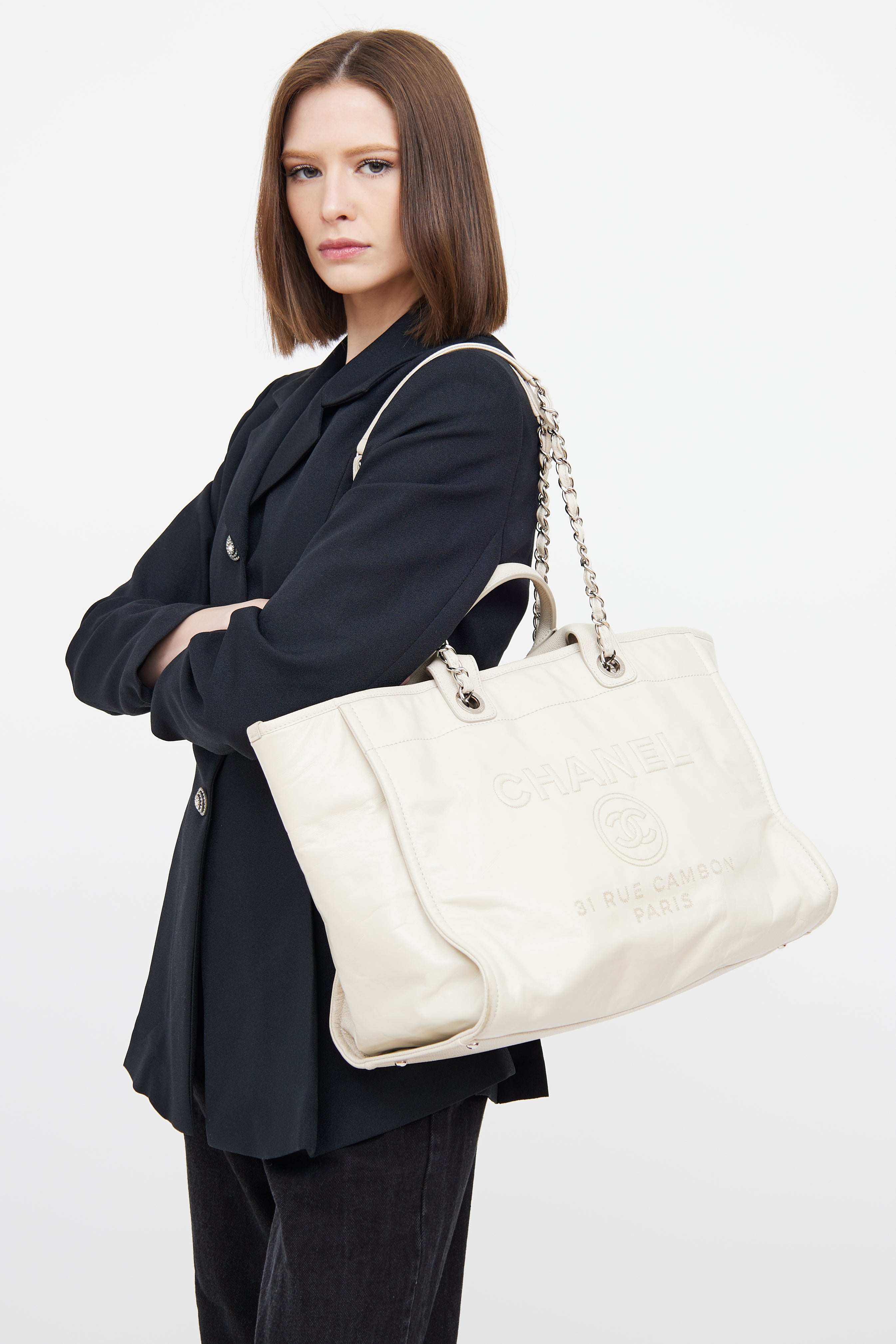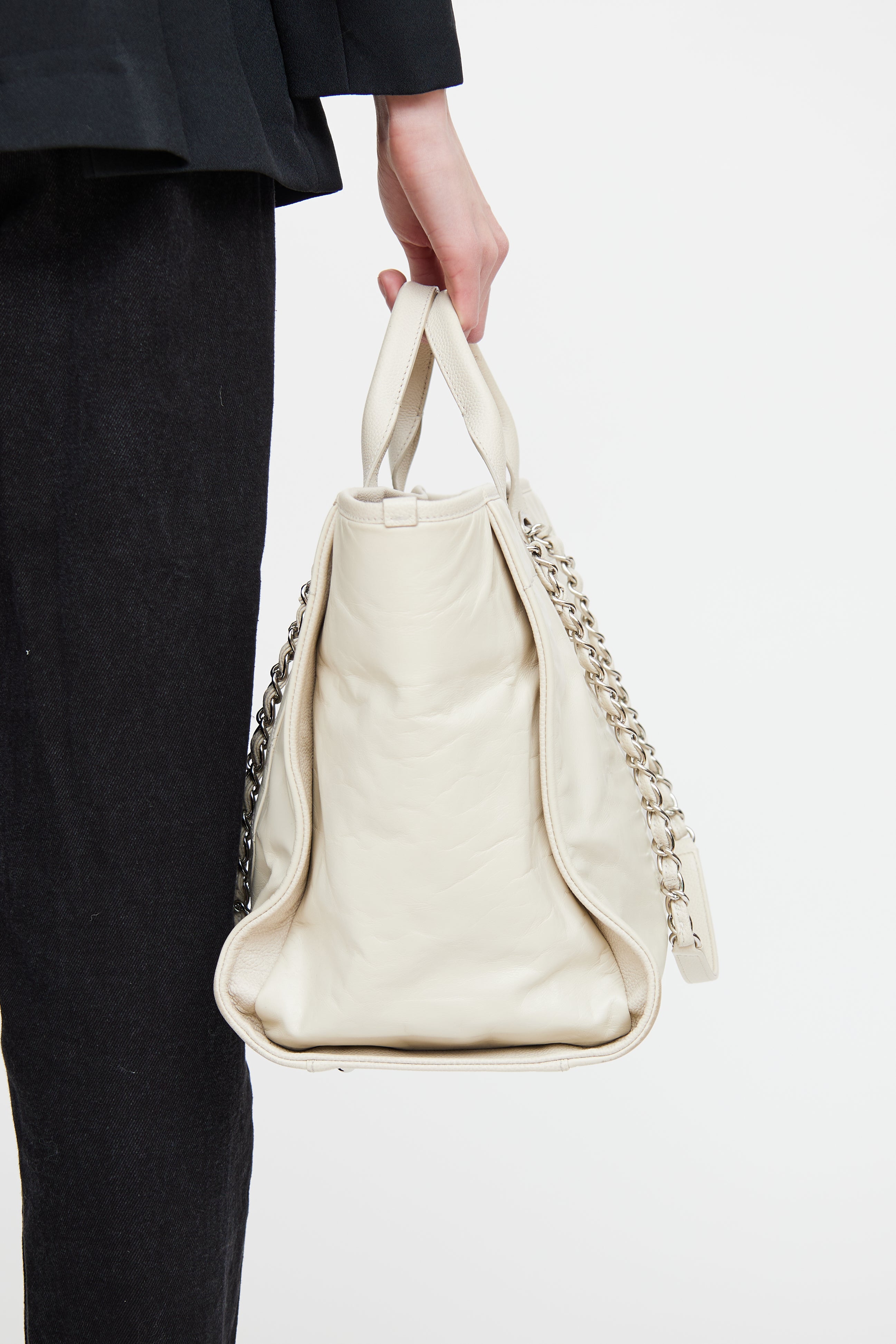 Pre-owned Chanel white glazed Deauville Shopper featuring dual rolled top handle bag, removable shoulder chain, silver tone hardware, front embroidered logo, back slip pocket, one main canvas lined interior, interior D-ring, dual interior slip pockets, and interior zip pocket.