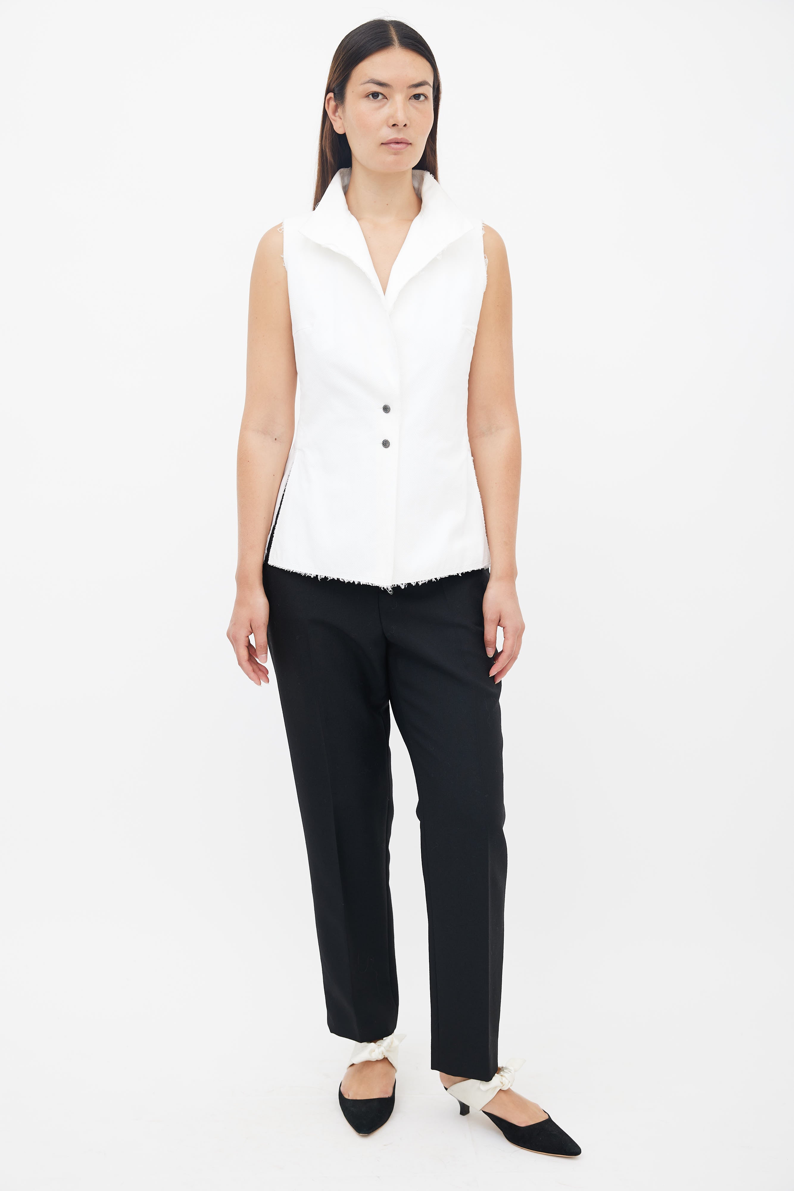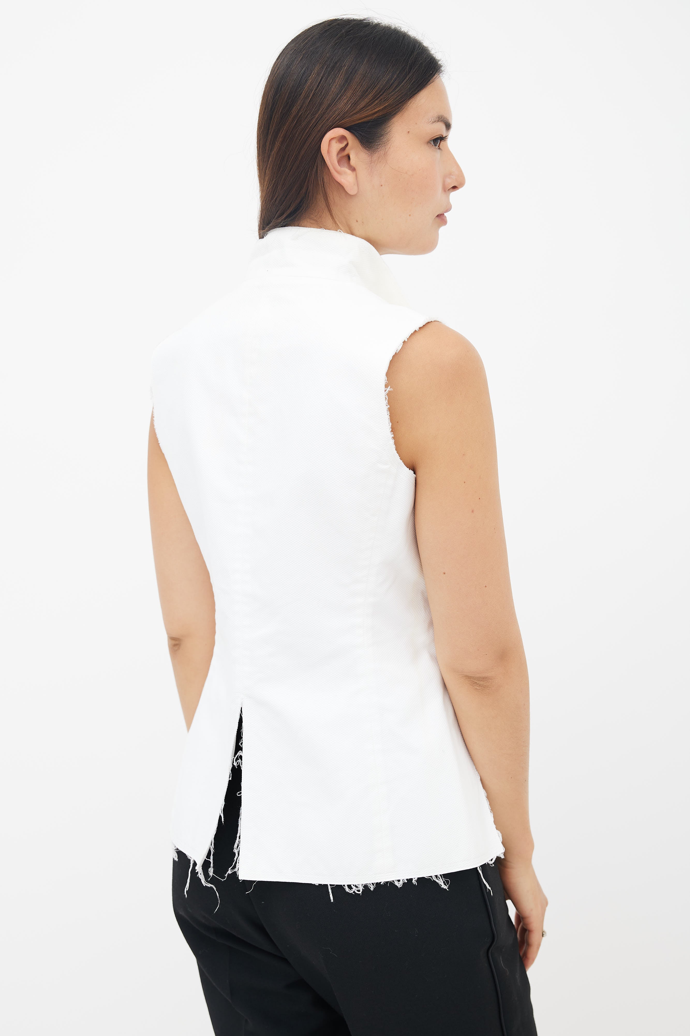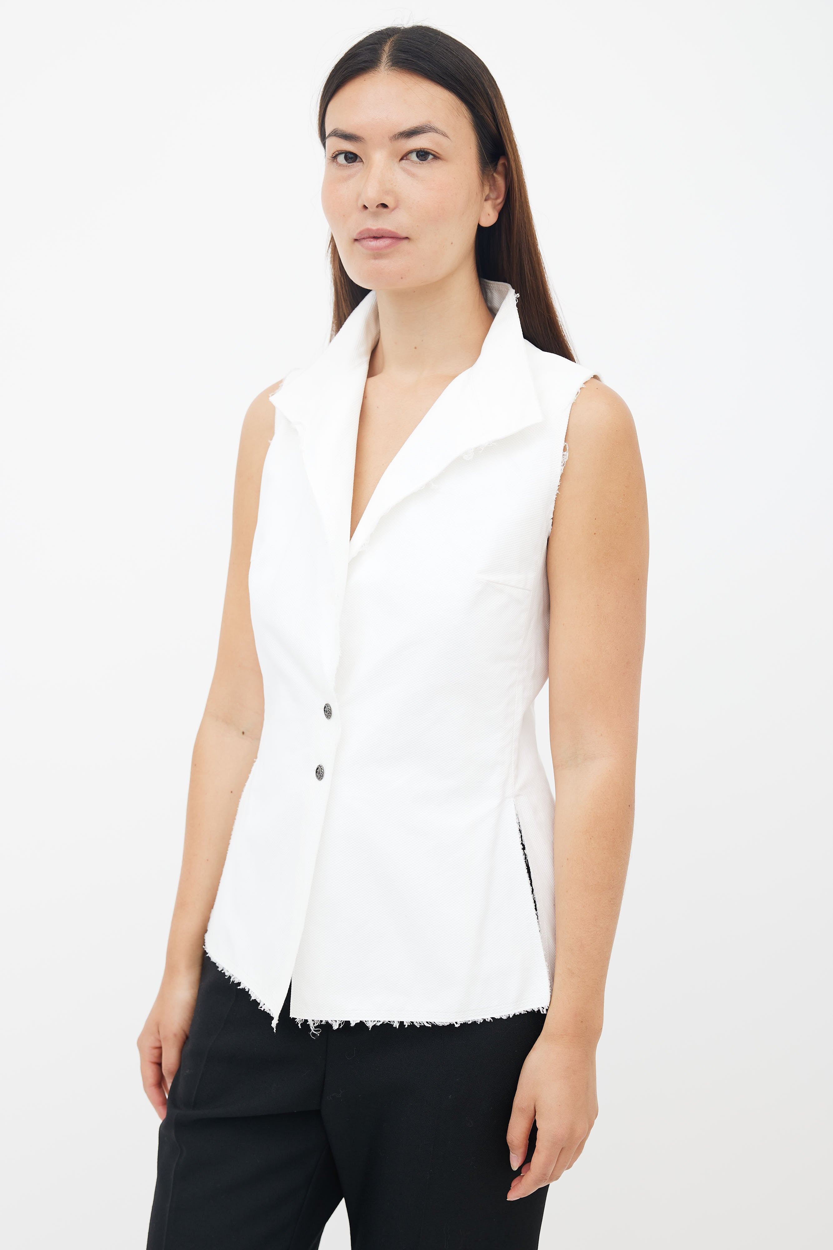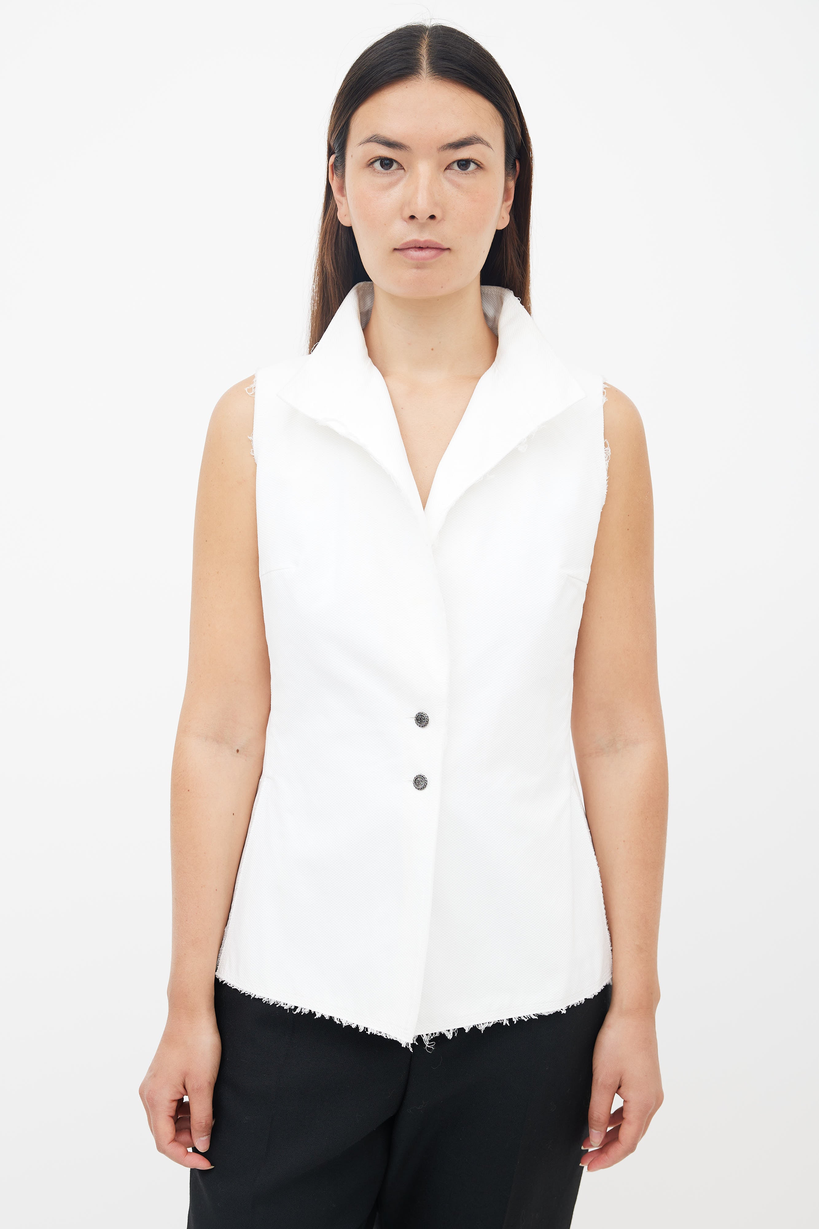 Pre-owned Chanel collared vest top in white featuring front button closure with logo engraved in gun-metal tone hardware, side slits, raw edges and single back vent.