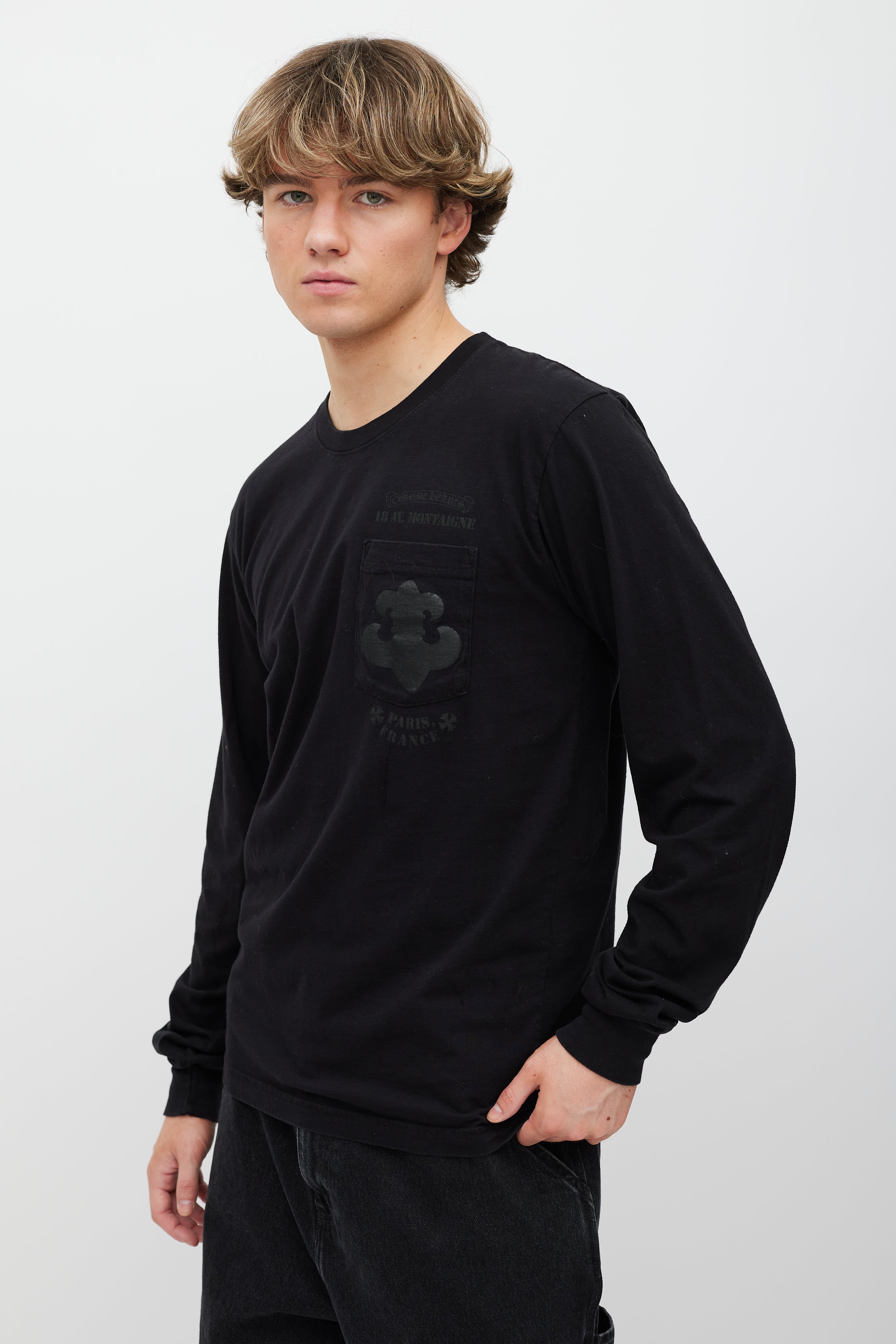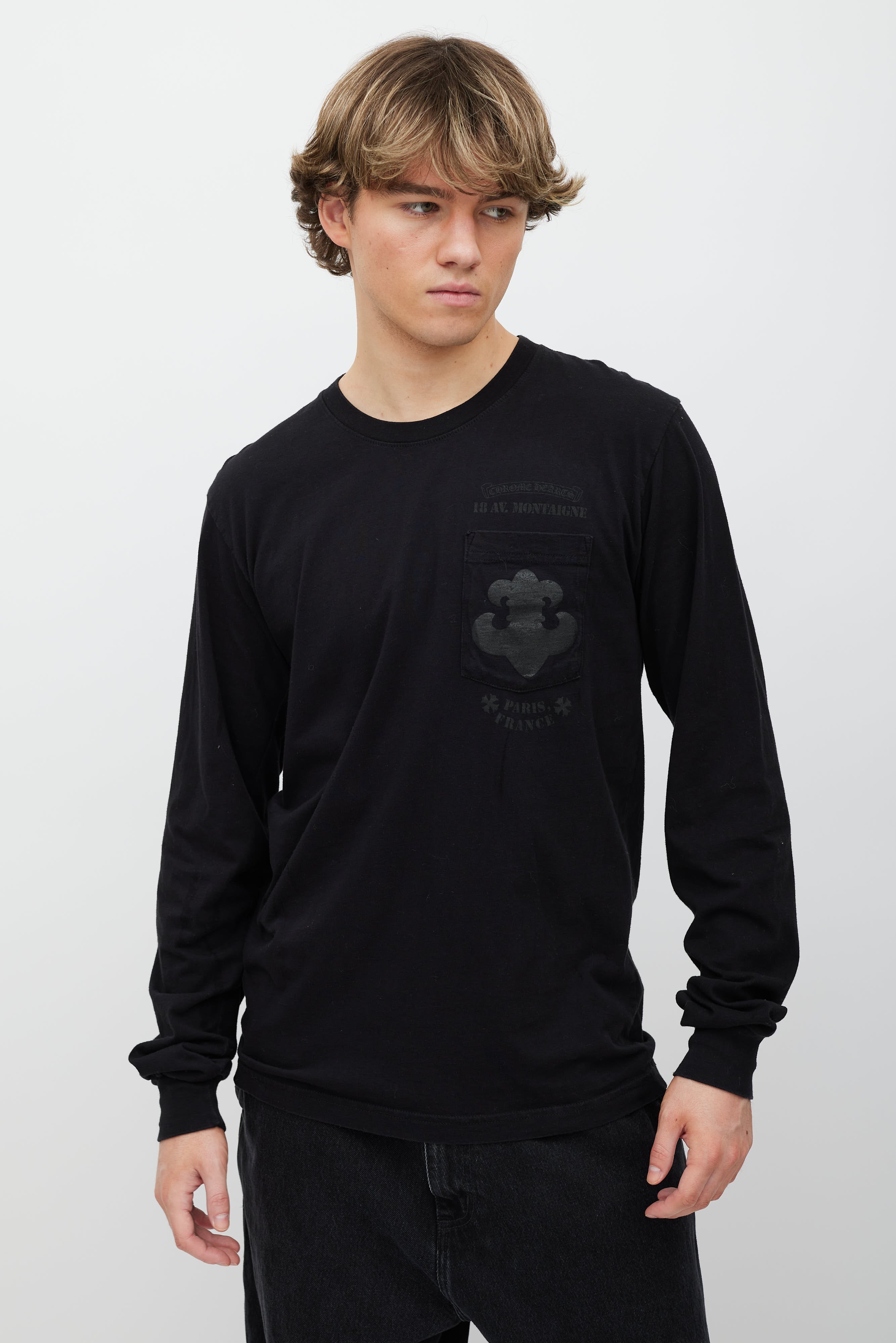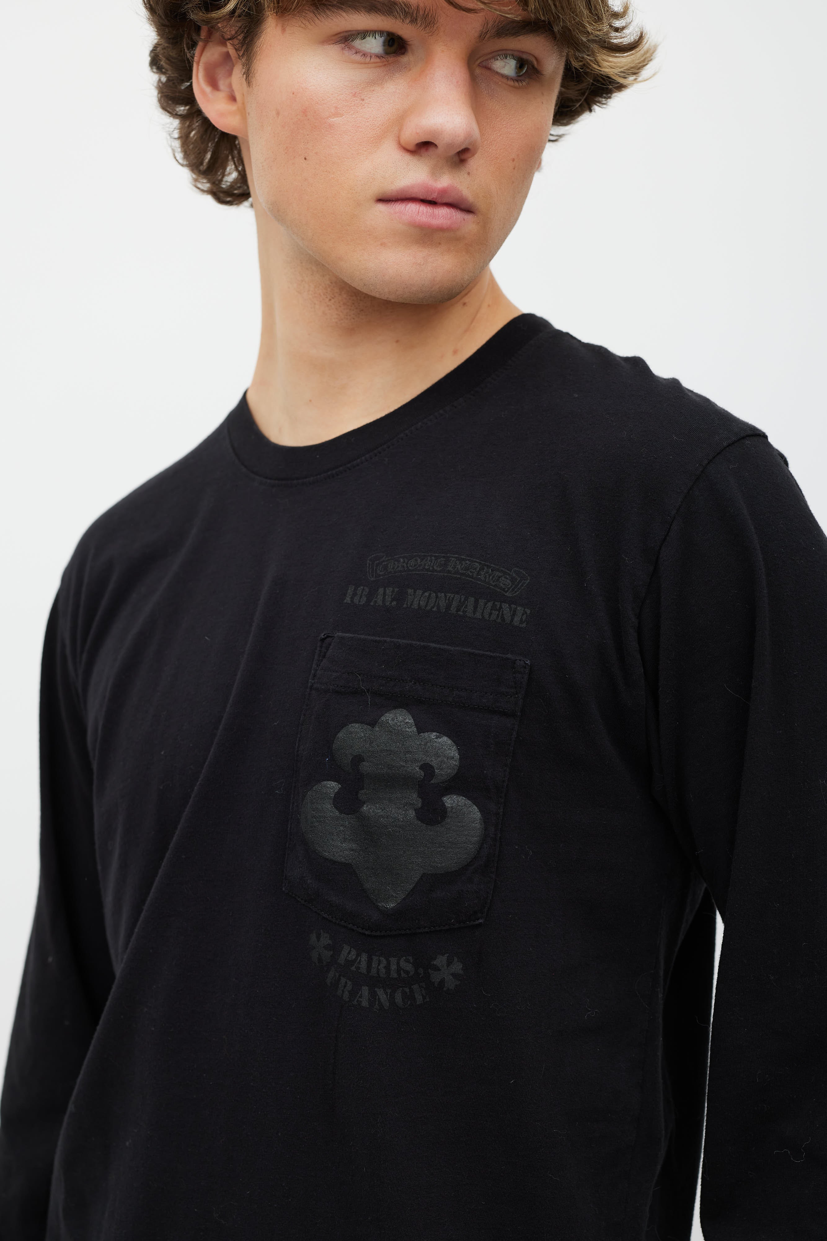 Pre-owned Chrome Hearts black long sleeved top featuring a crew neckline, one patch pocket at left chest, long sleeves with ribbed cuffs, and graphics printed at left chest and back.