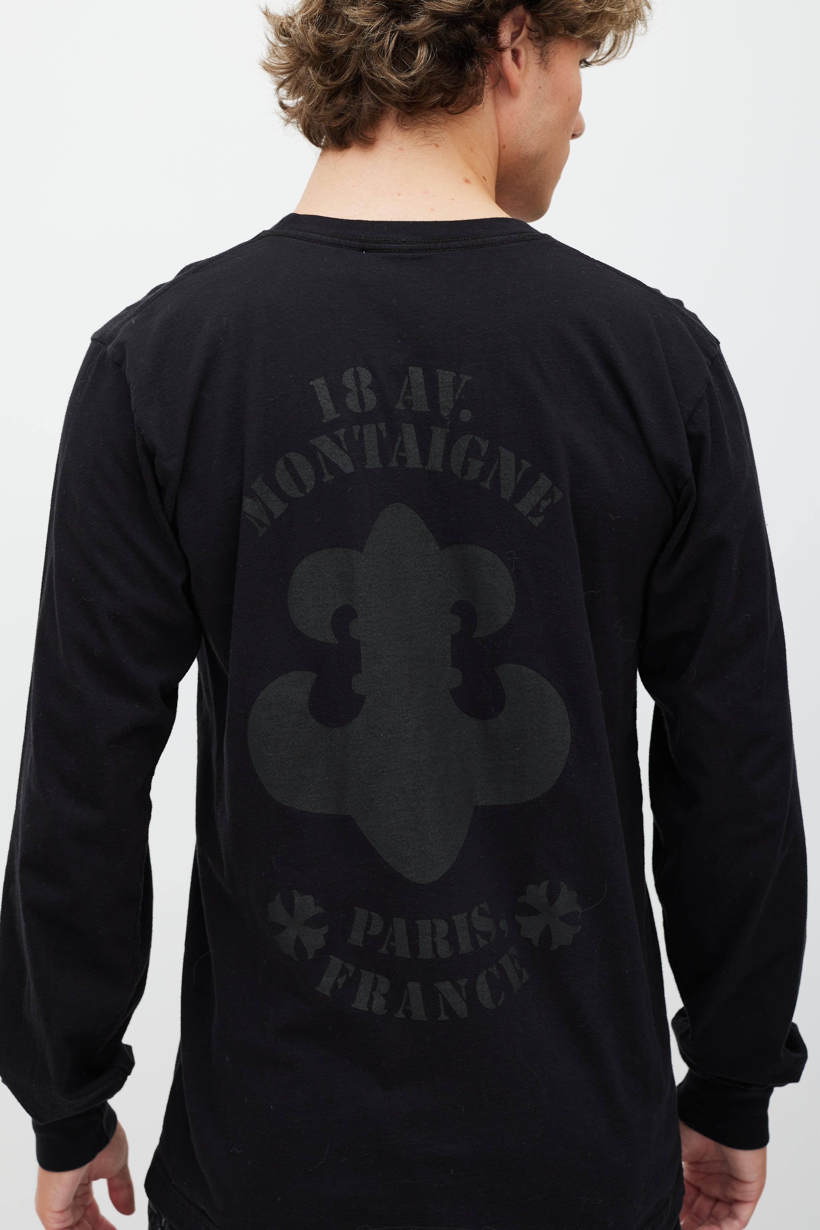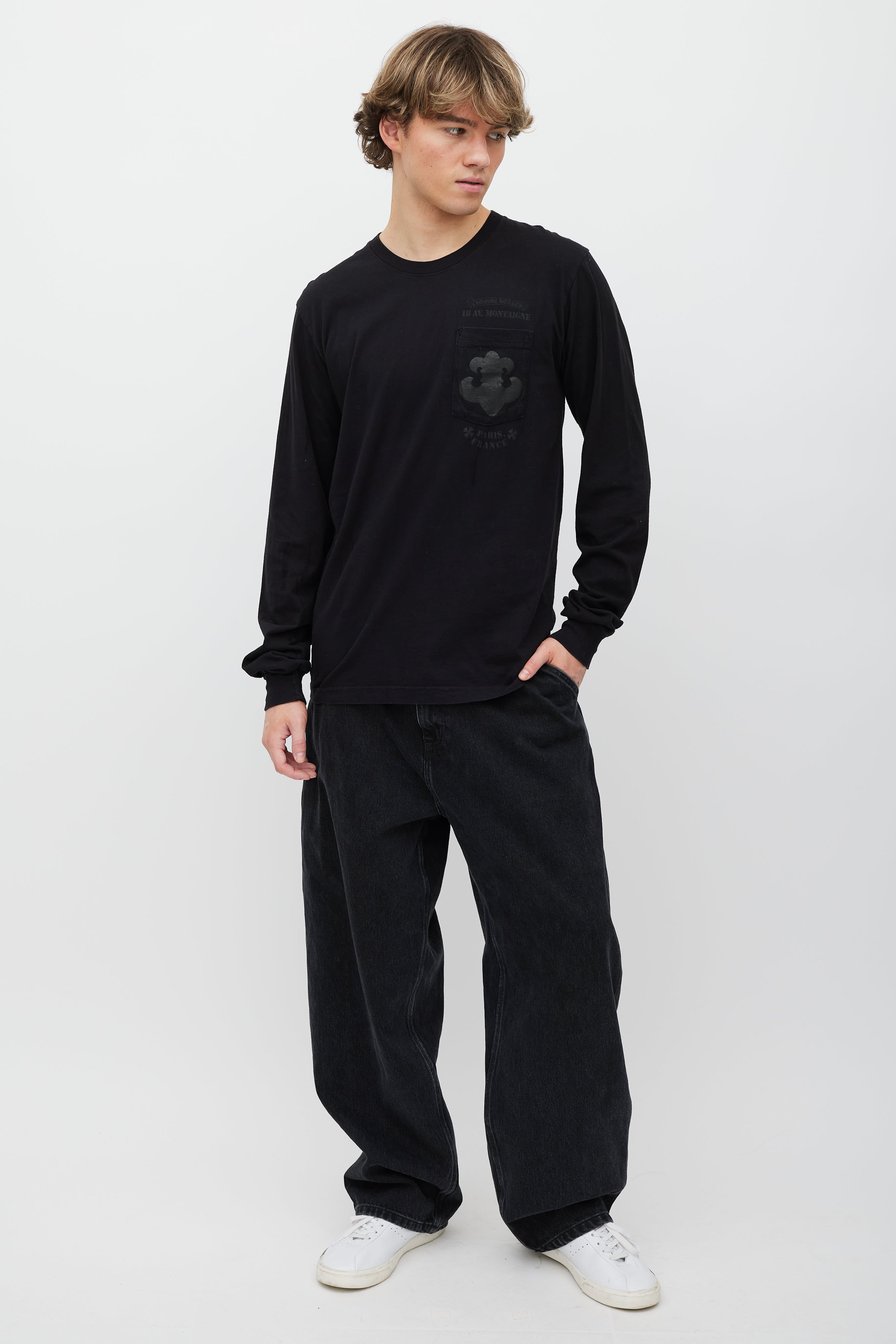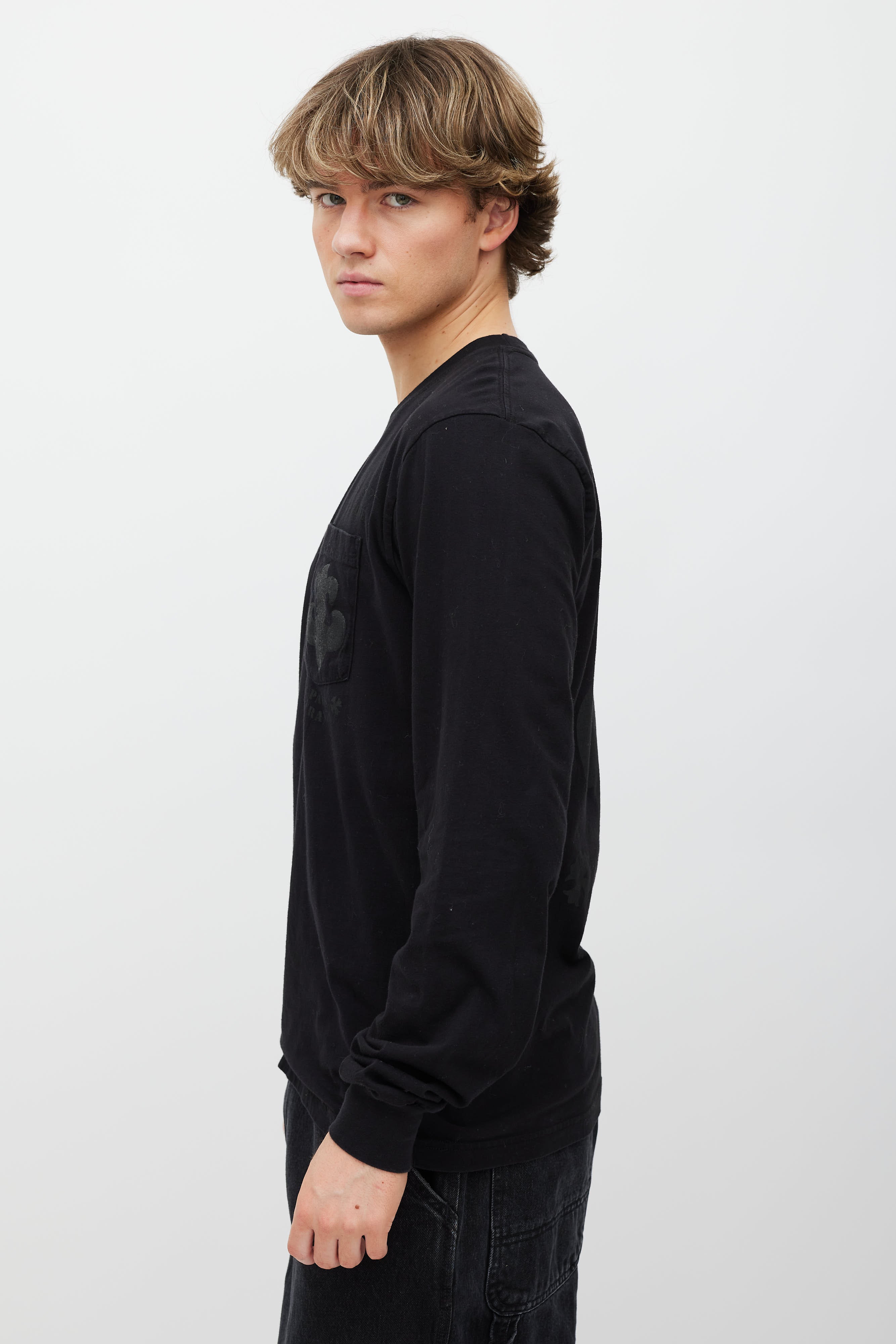 Pre-owned Chrome Hearts black long sleeved top featuring a crew neckline, one patch pocket at left chest, long sleeves with ribbed cuffs, and graphics printed at left chest and back.