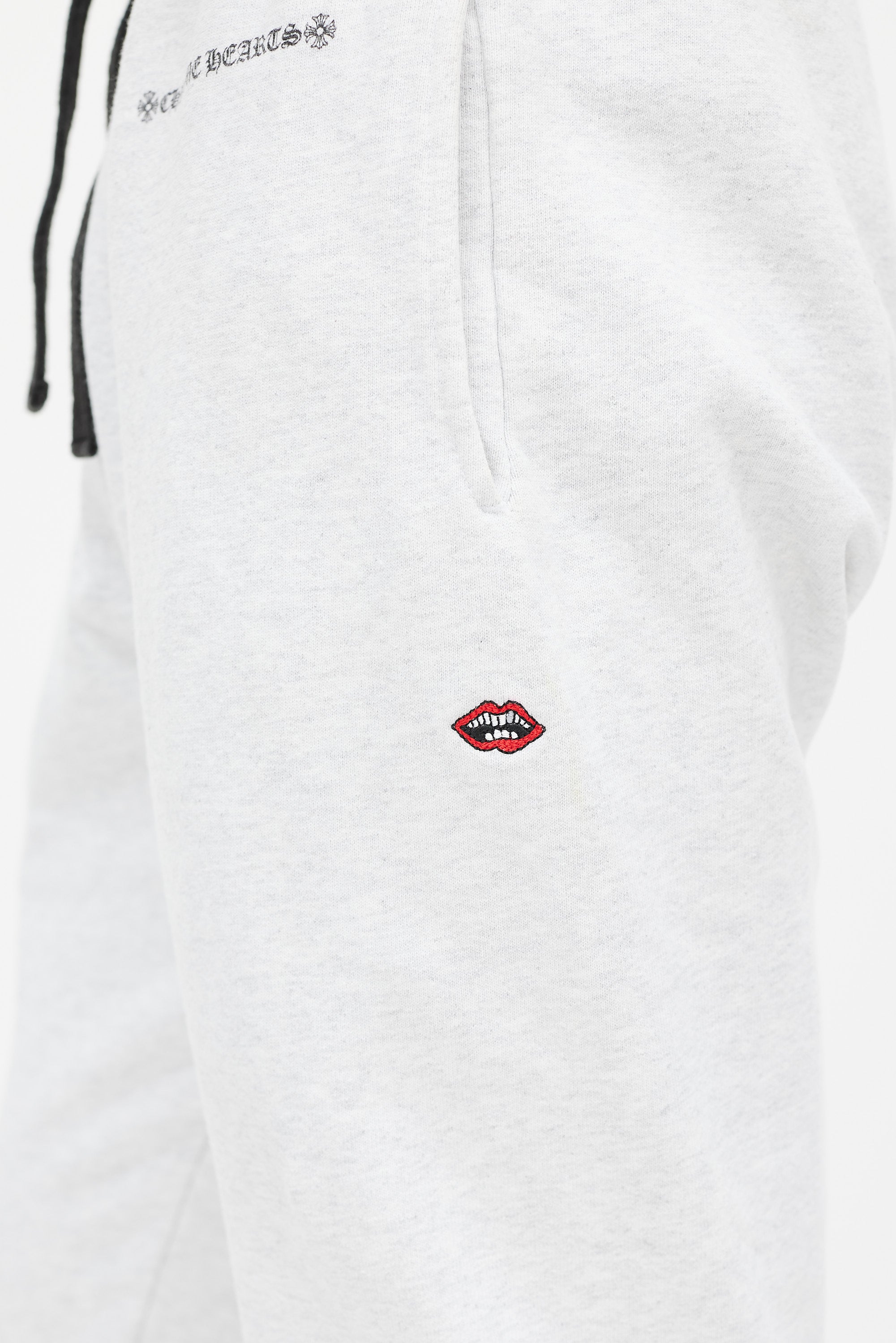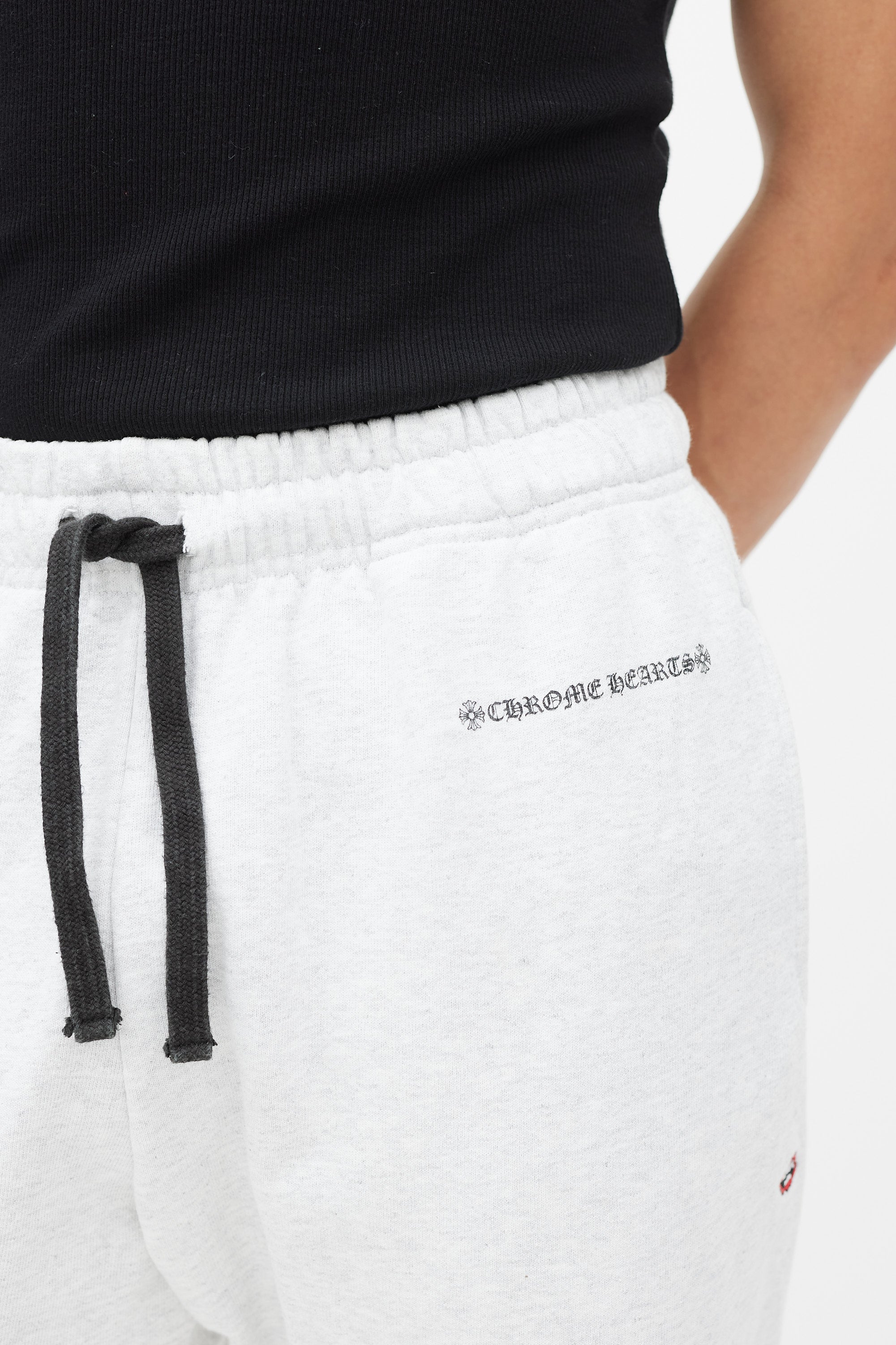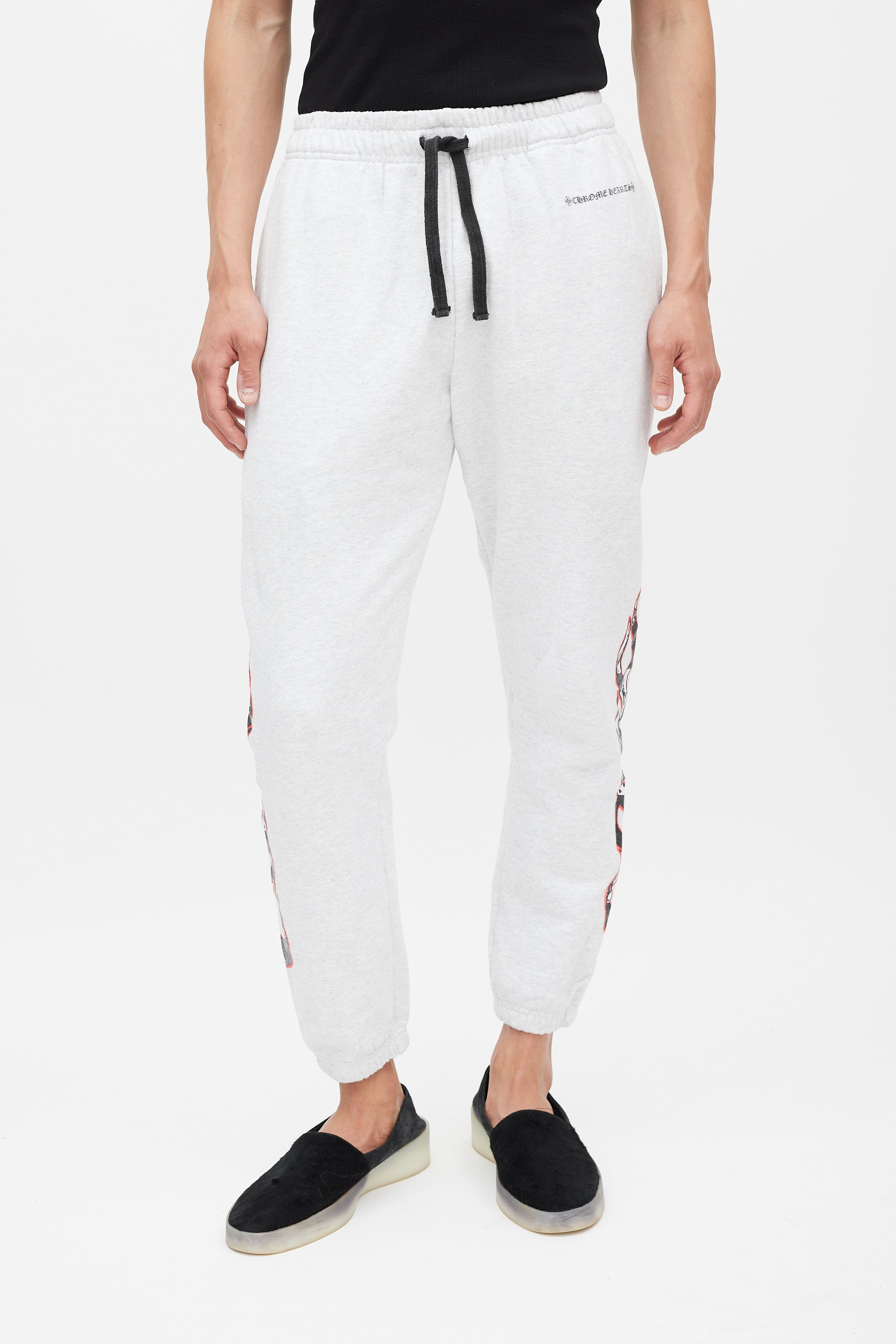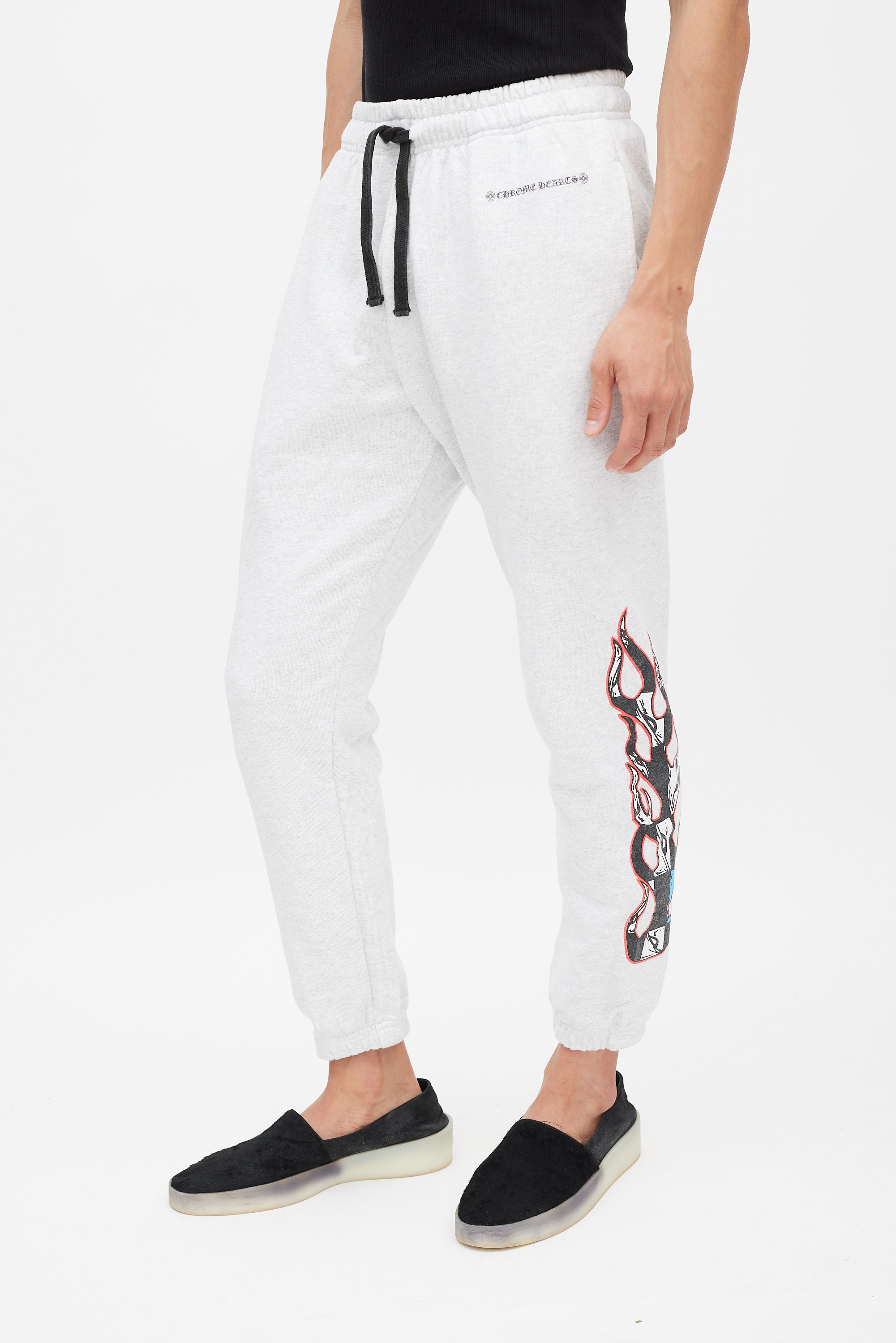 Pre-owned Chrome Hearts x Matty Boy Flame grey sweatpants featuring a multicolour flame print at sides, elasticized drawstring waist, printed logo at waist, two slip pockets at hip, and ribbed hem.