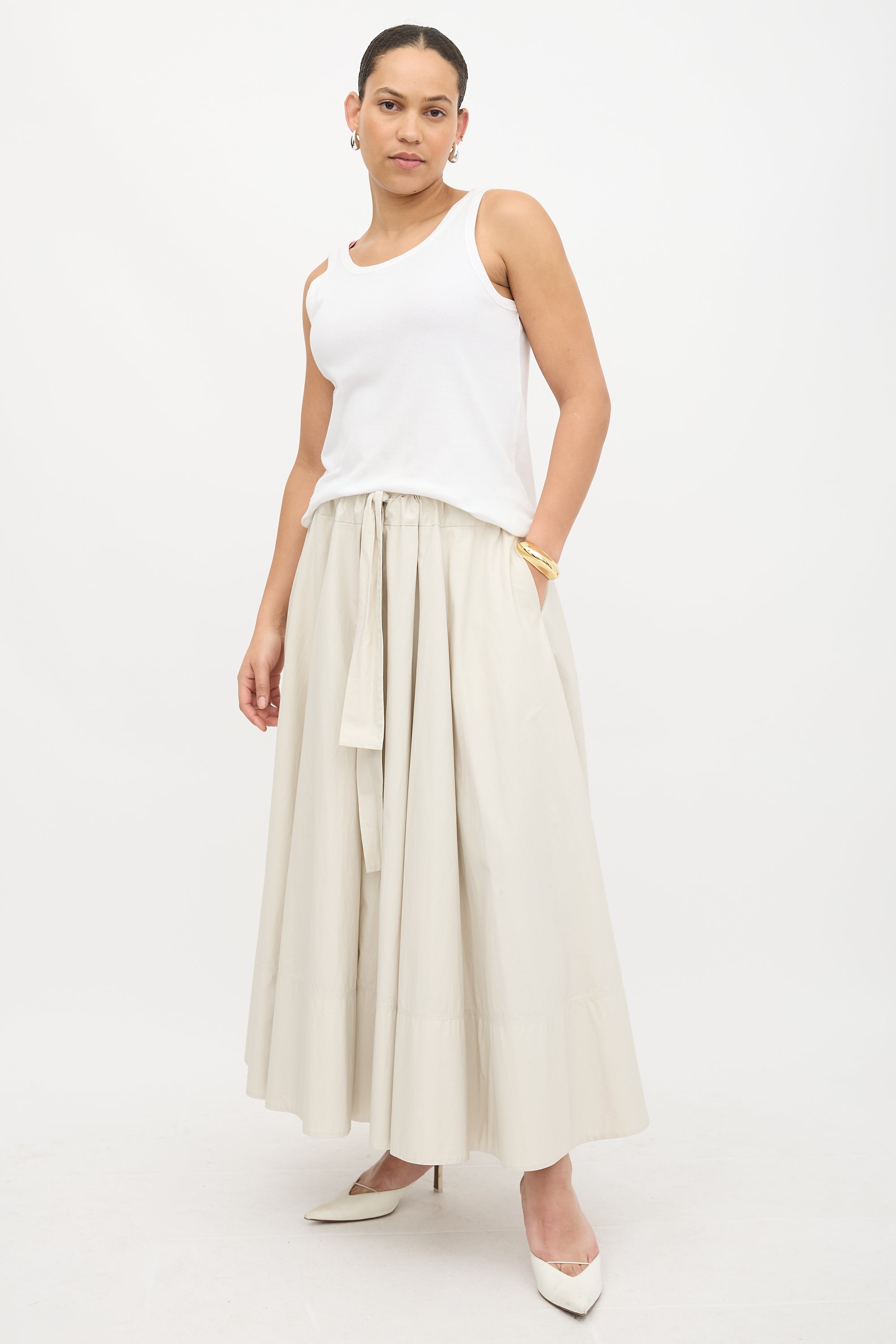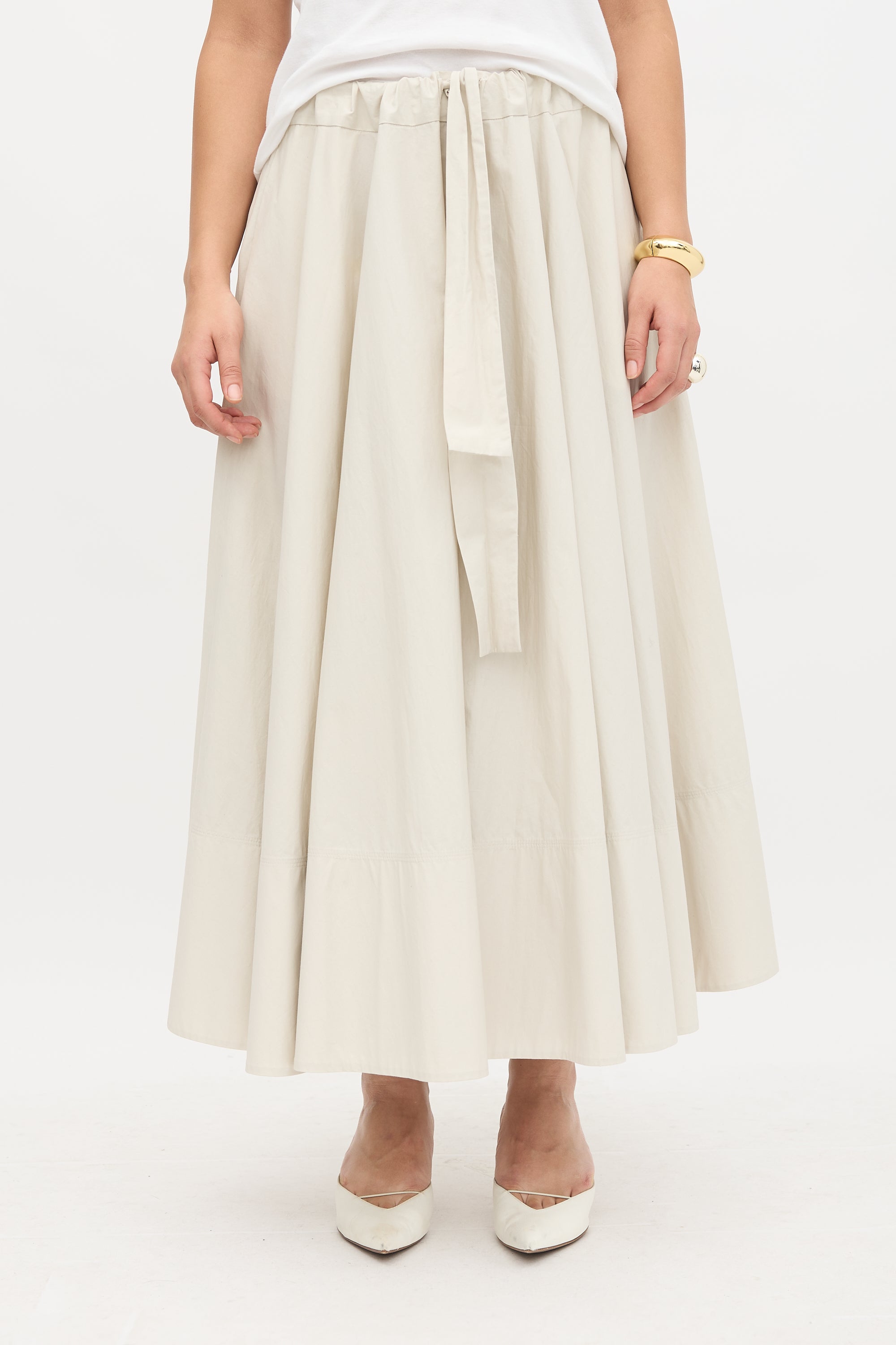 Pre-owned CO Fall/Winter 2019 beige cotton maxi skirt featuring drawstring waist, in seam pockets, and A-line design.