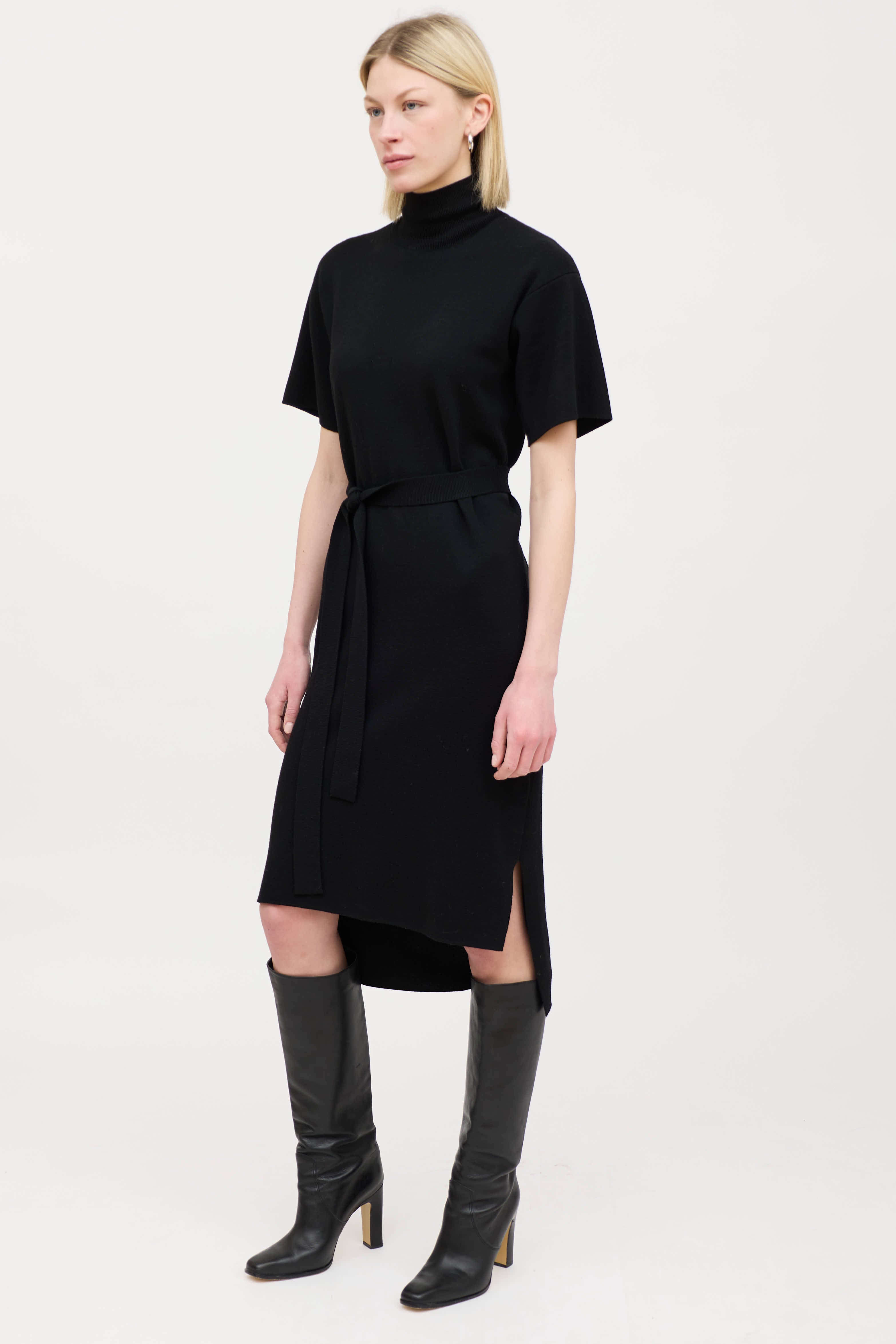 Pre-owned black CO wool knit dress featuring a mock neck collar, short sleeves, tie belt at waist, and high low hem.