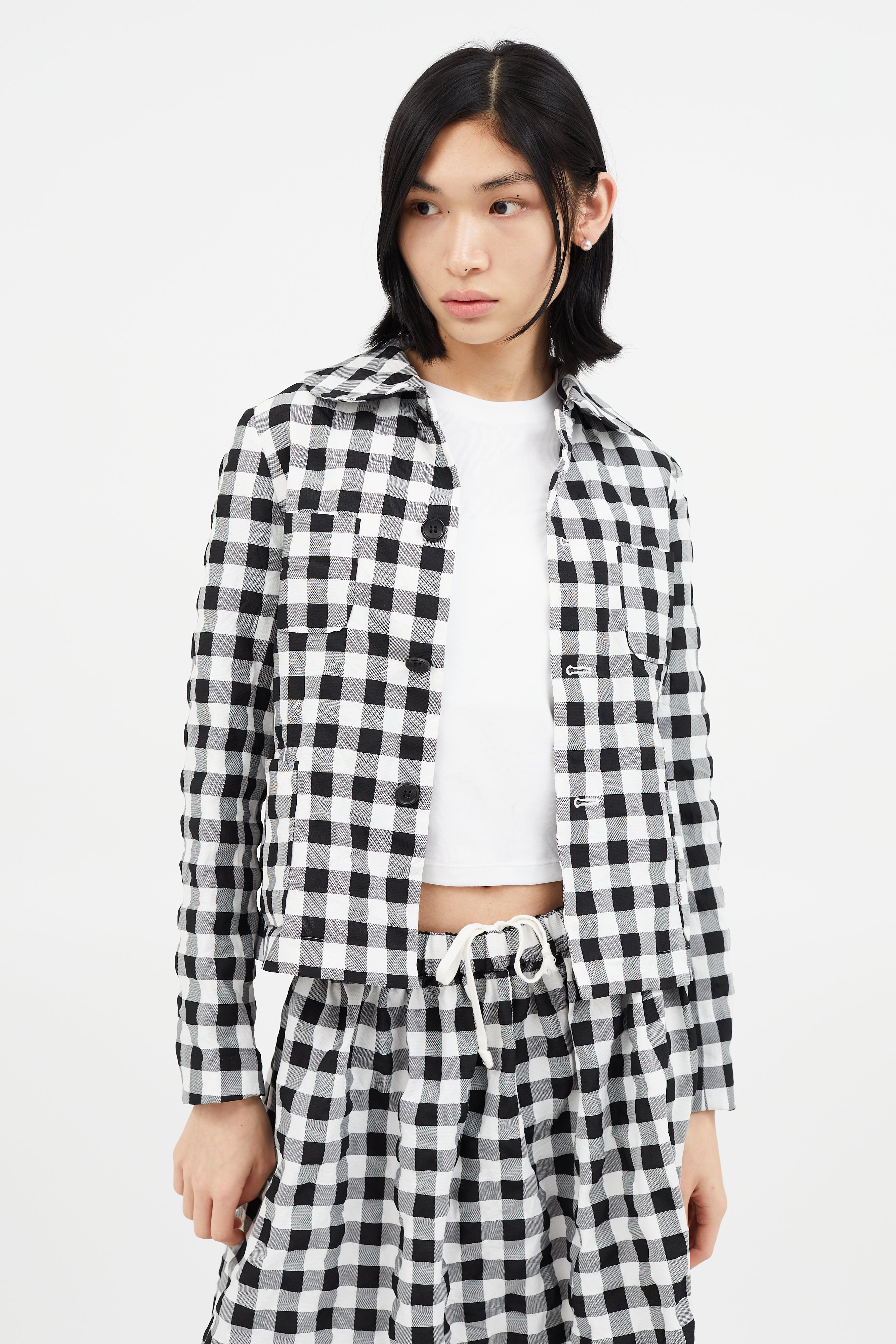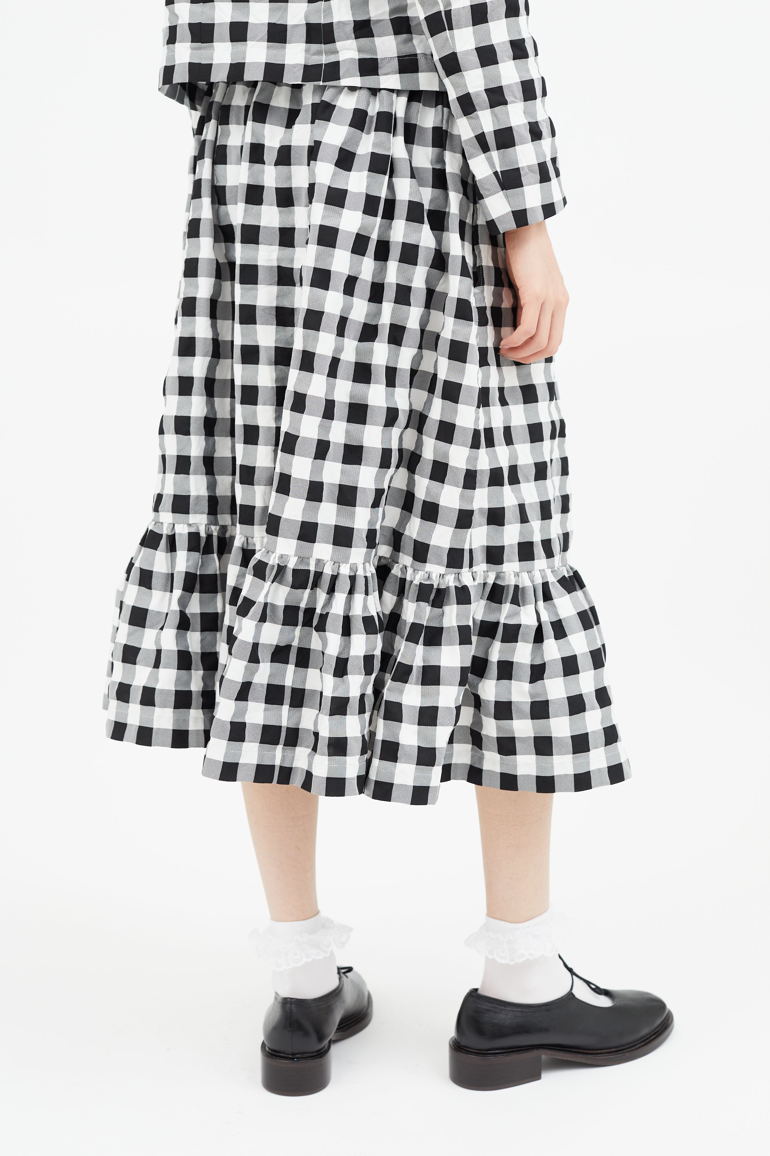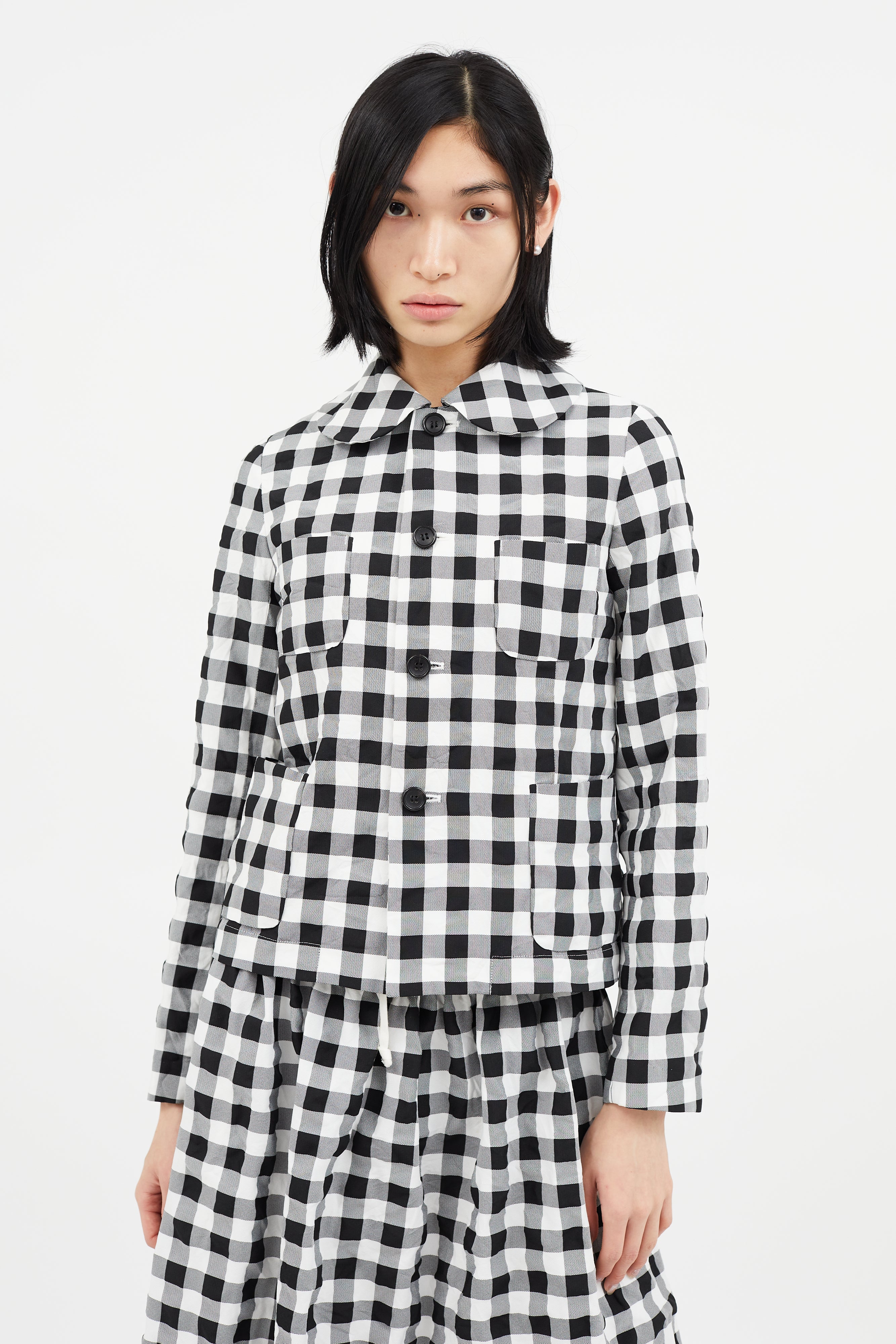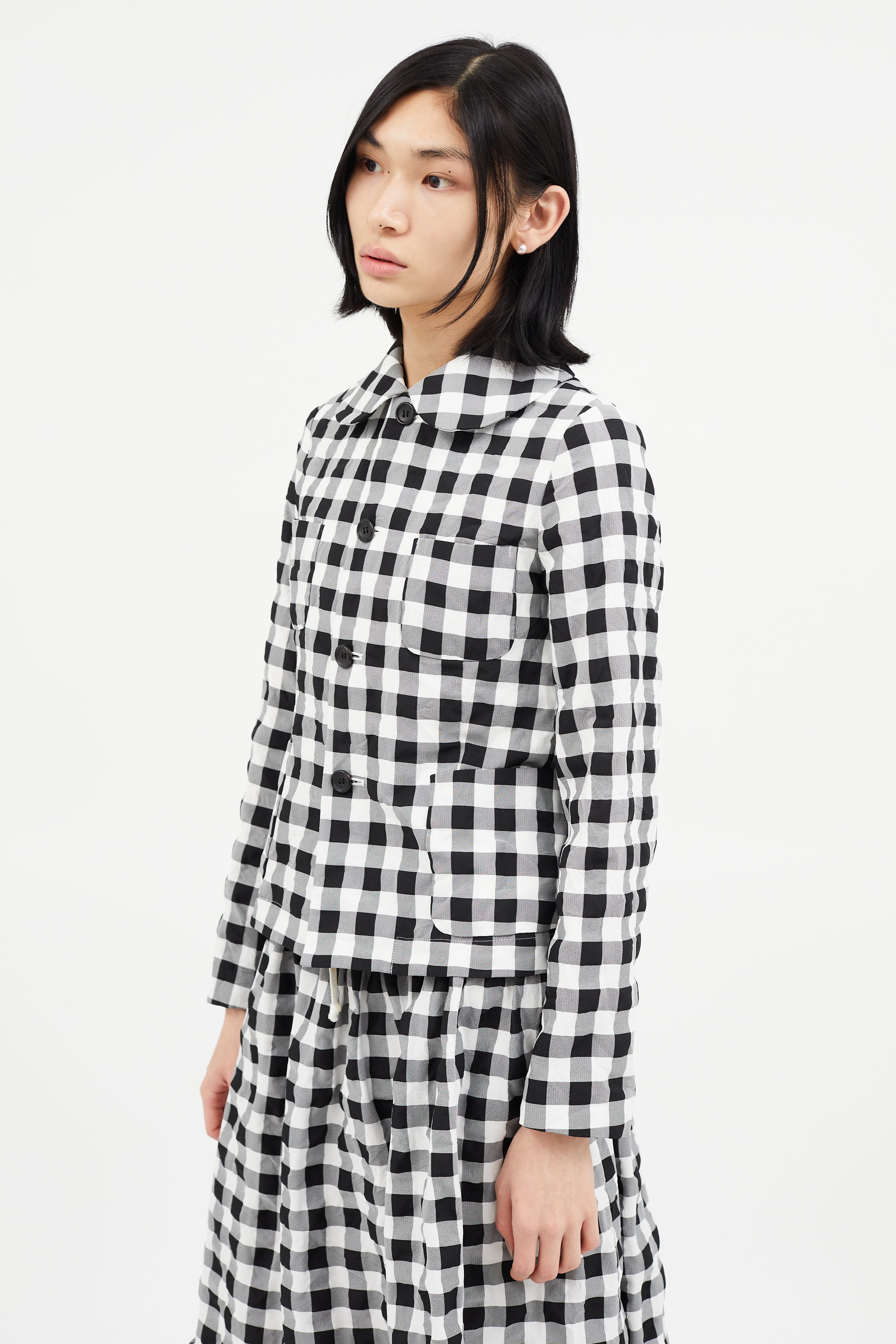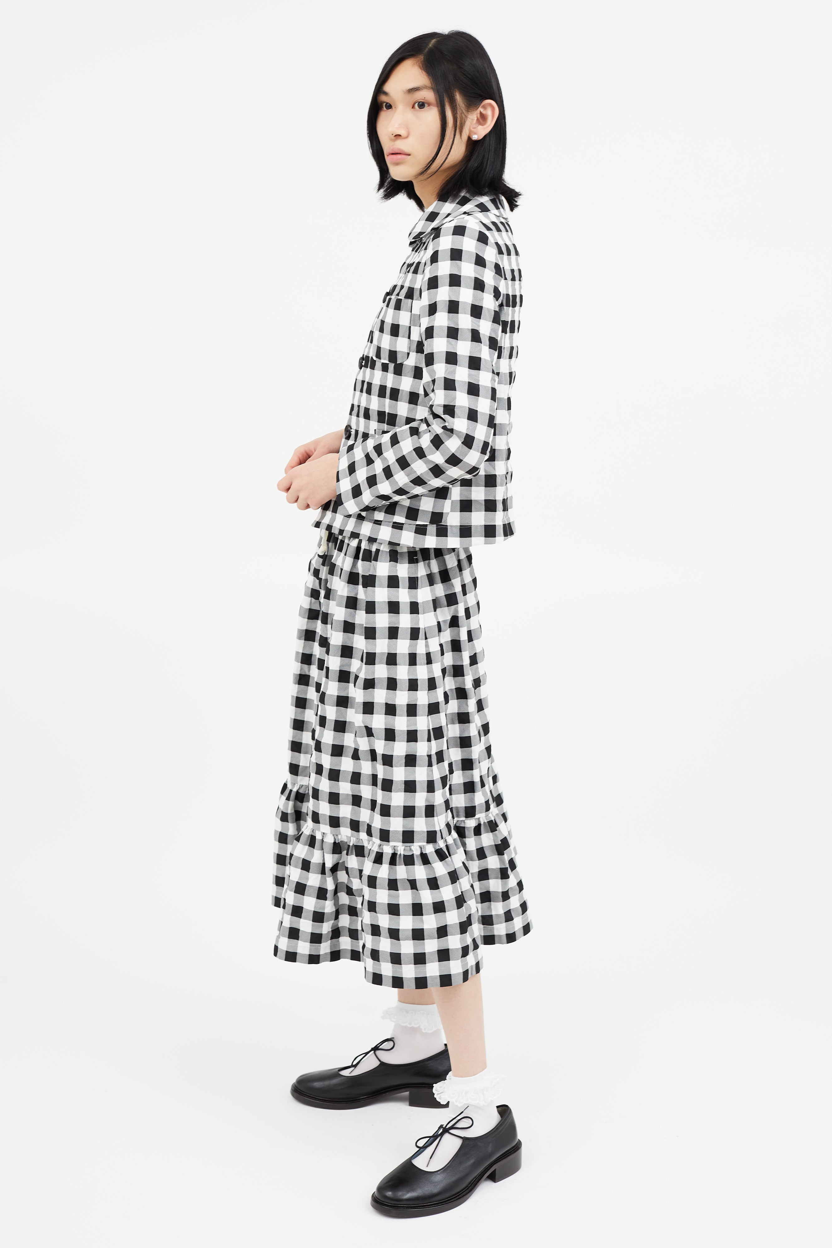 Pre-owned Comme des Garçons GIRL black and white textured blazer featuring peter pan collar, button up front, four patch pockets, and check print. Matching skirt featuring elasticized waist with drawstring fastening, two slash pockets, and ruffle hem.