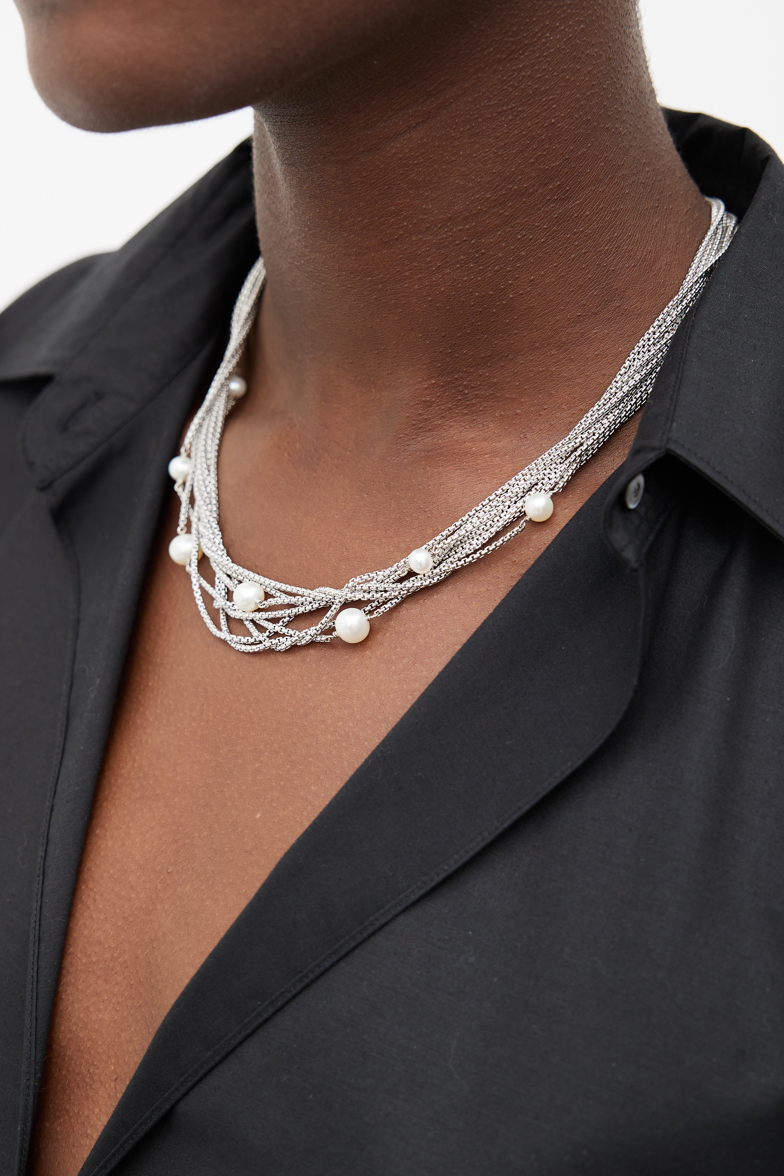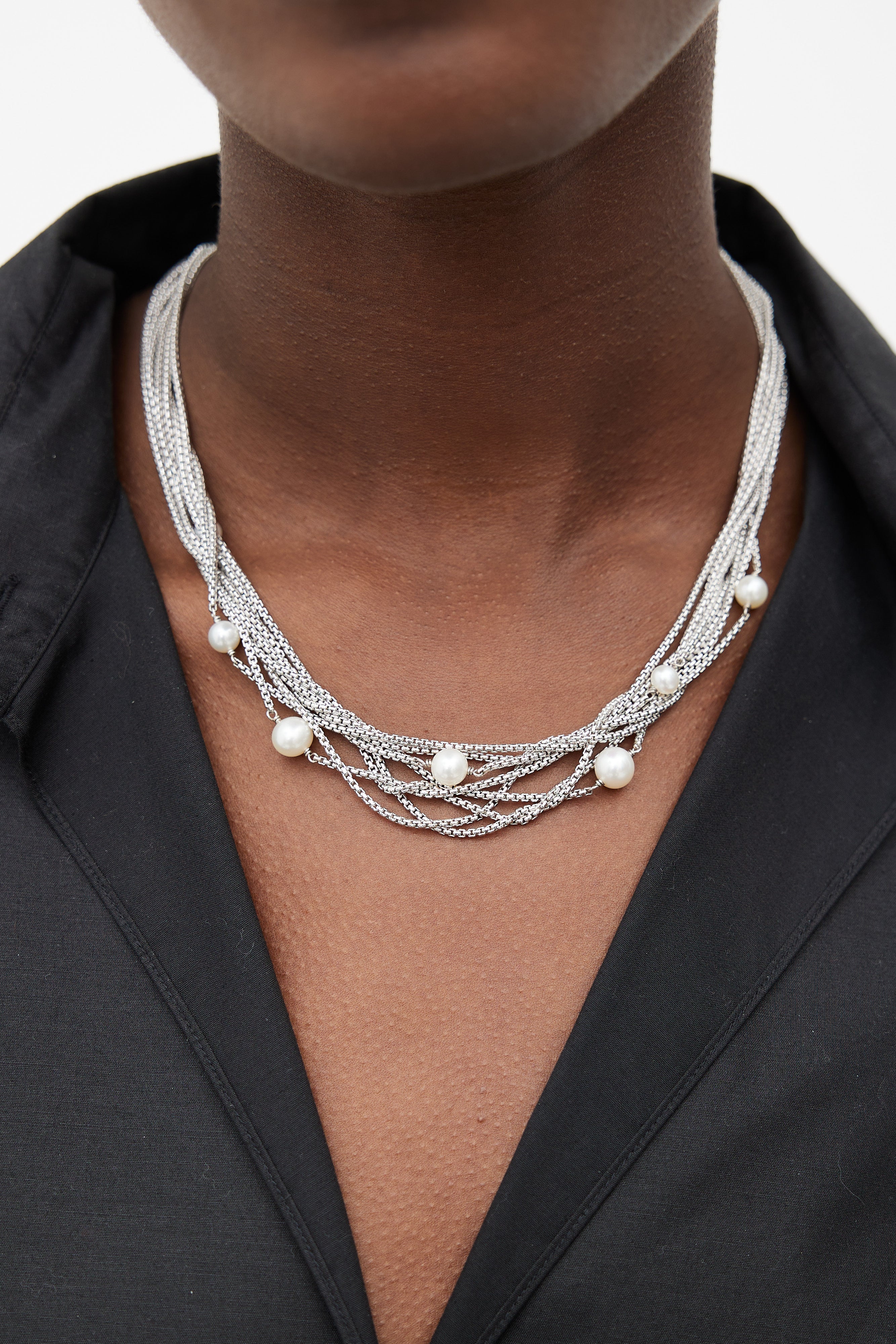 Pre-owned David Yurman necklace in sterling silver featuring multi strand design, hook closure, and pearl embellishment throughout.