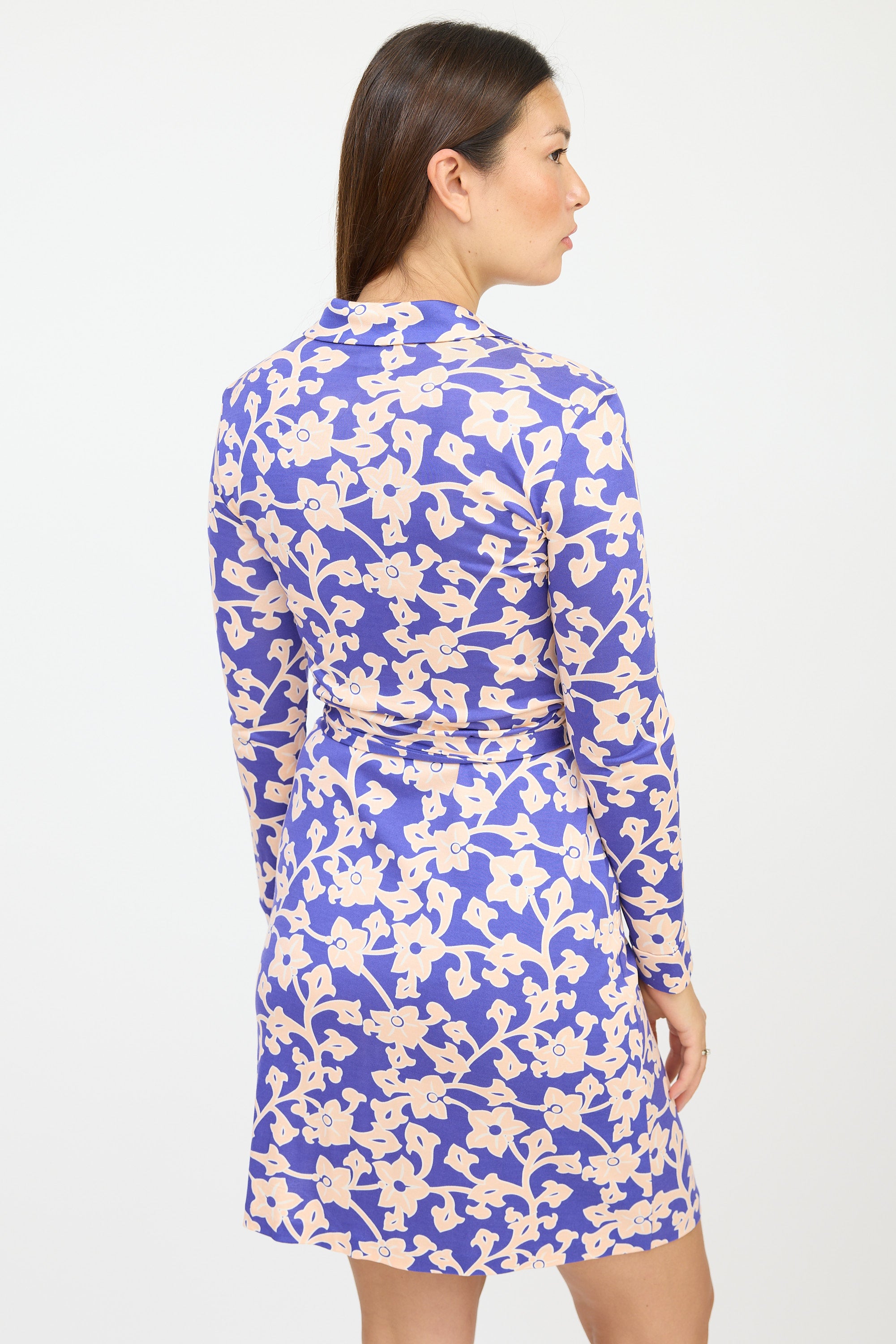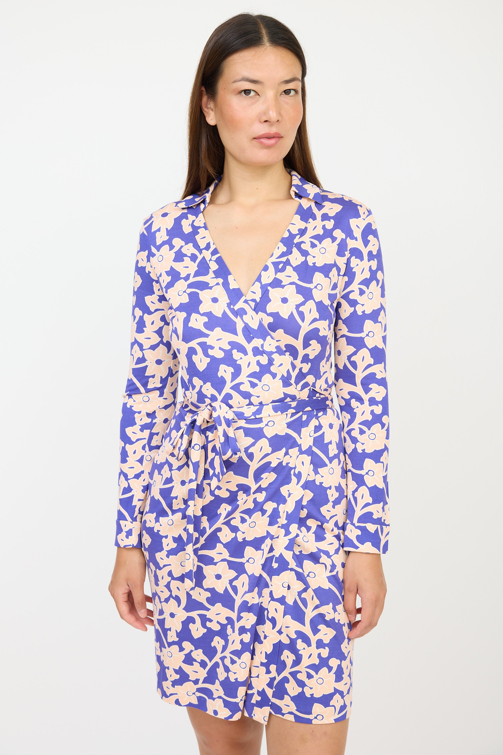 Pre-owned Diane von Furstenberg blue silk dress featuring a pink floral pattern throughout, pointed surplice collar, long sleeves, and wrap closure.