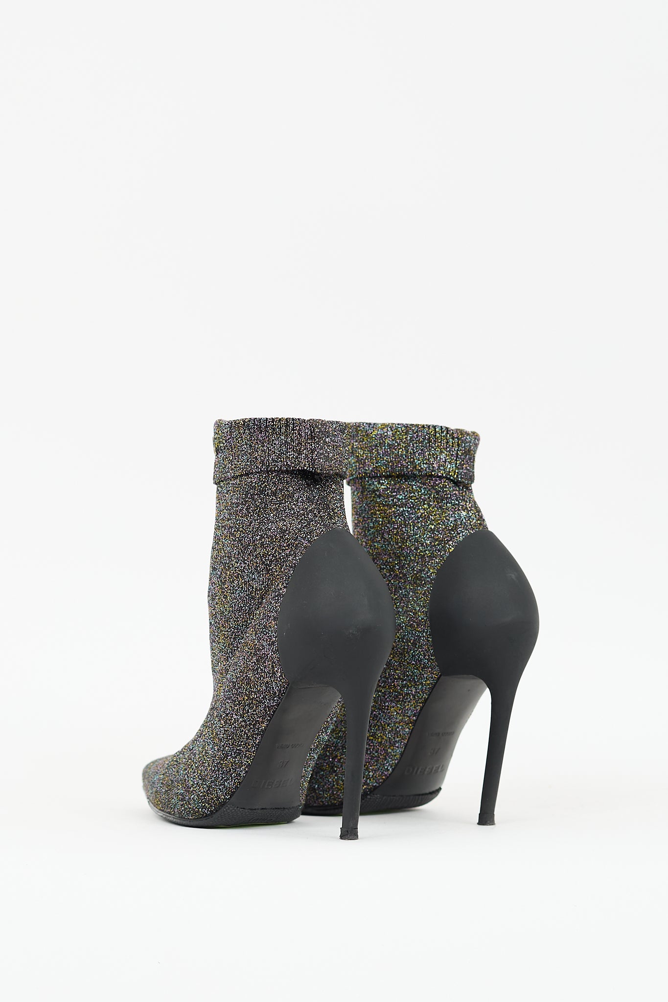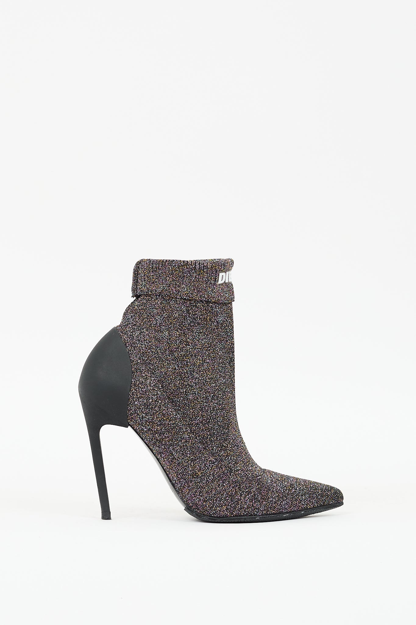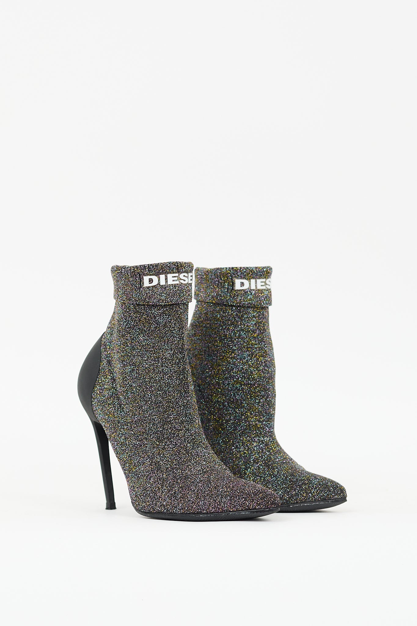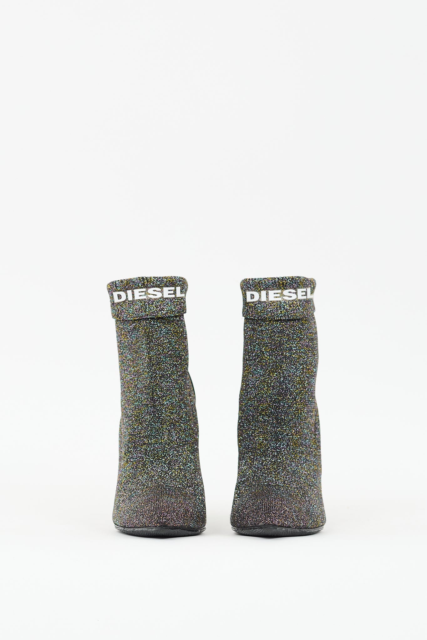 Pre-owned Diesel black and multicolour D-Slanty sock boots featuring pointed toe, sparkly stretch knit upper, rubber counter and stiletto heel, and elasticized entry. Comes with original dust bag.