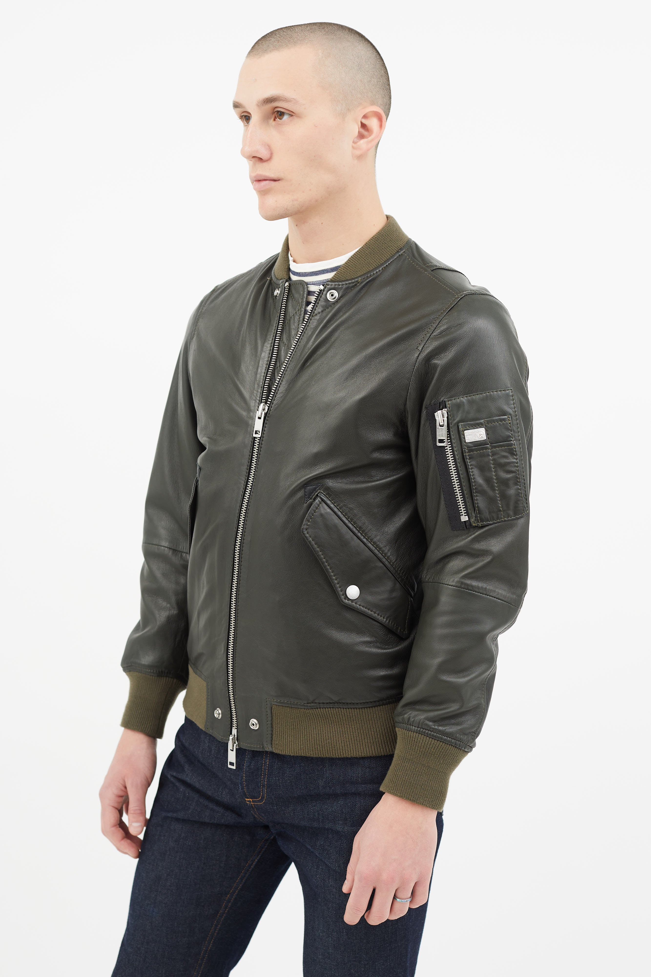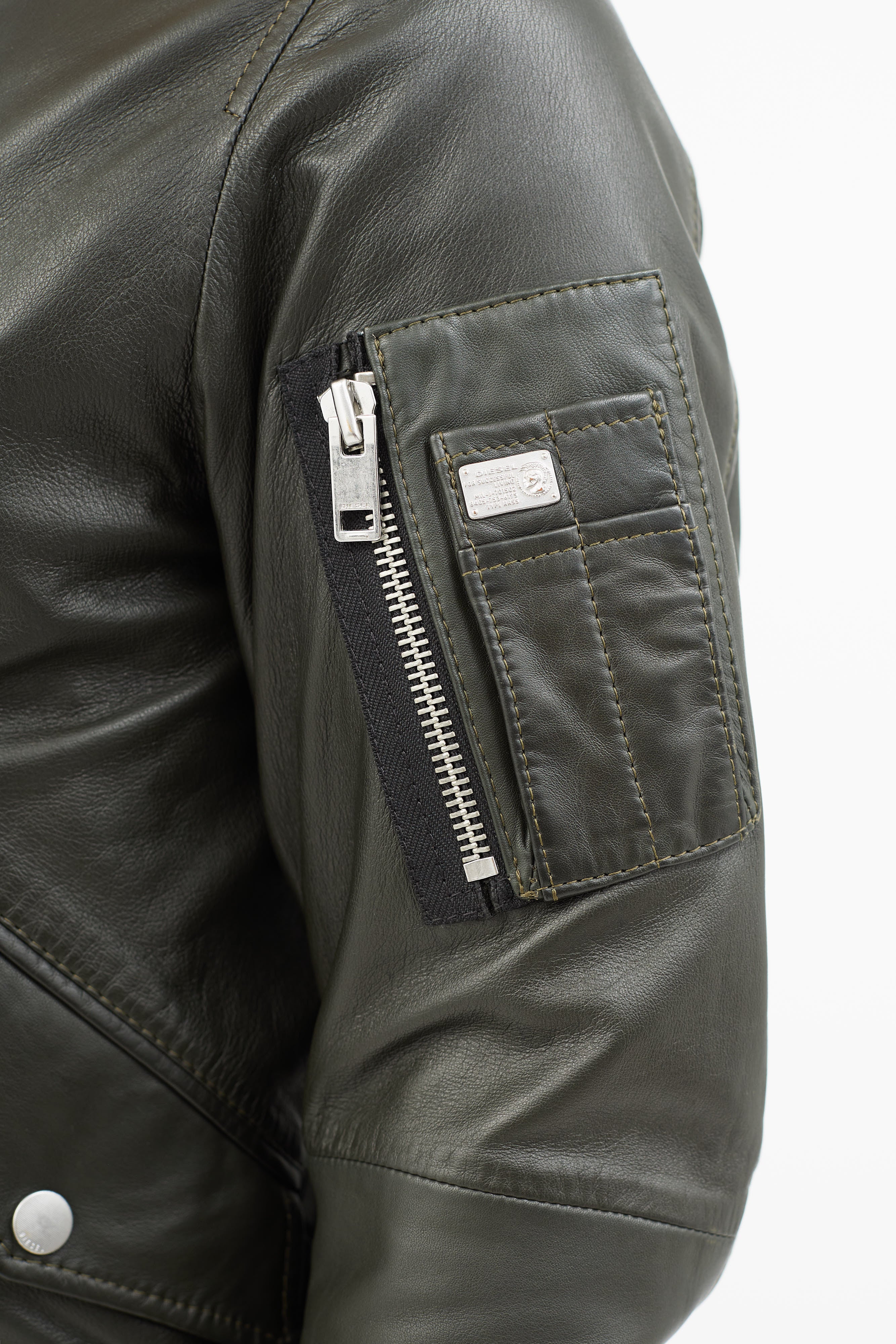 Pre-owned Diesel green bomber jacket featuring full zip closure, stand collar, two snap buttoned pockets at side, zip pocket at left sleeve, and ribbed knit hem.