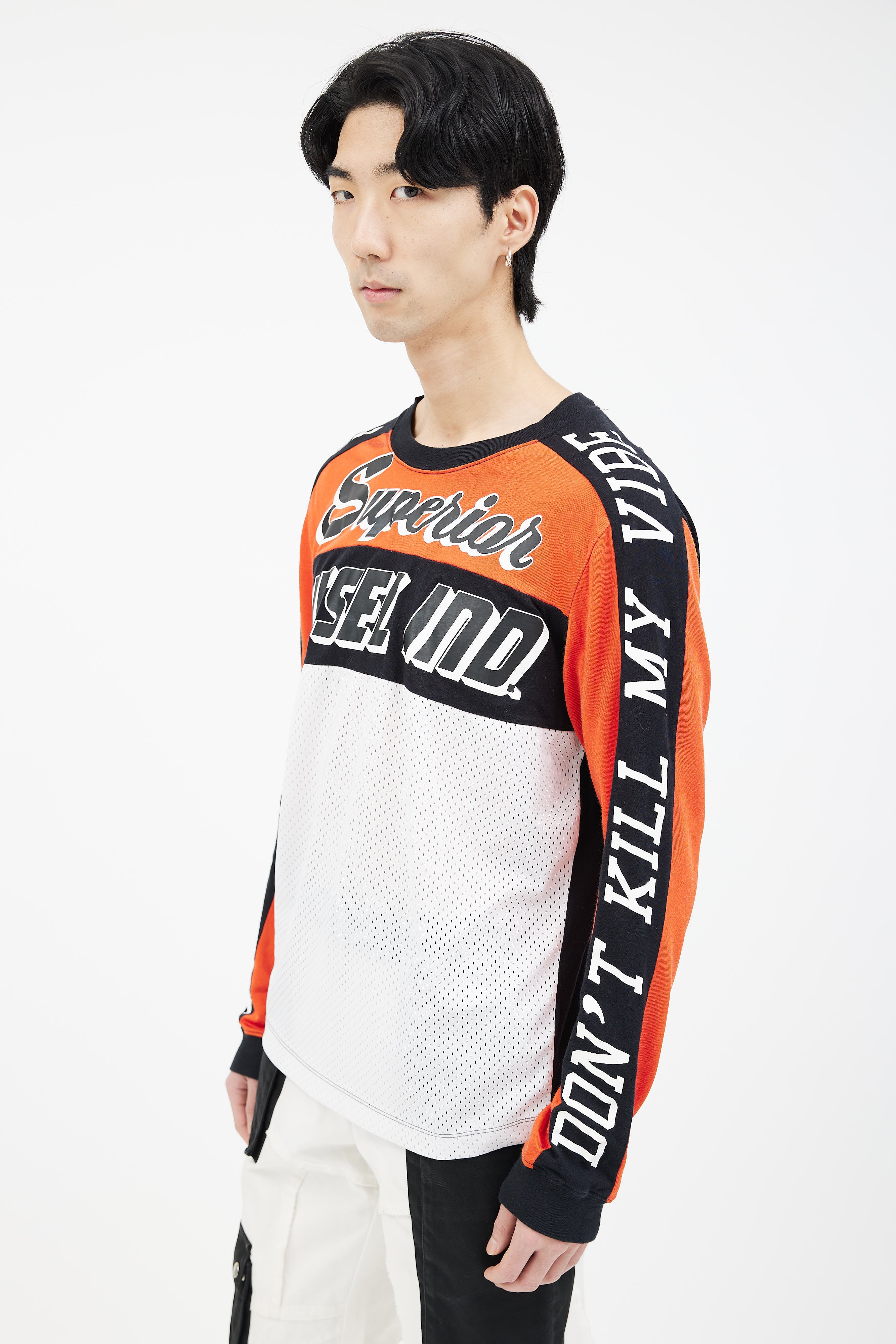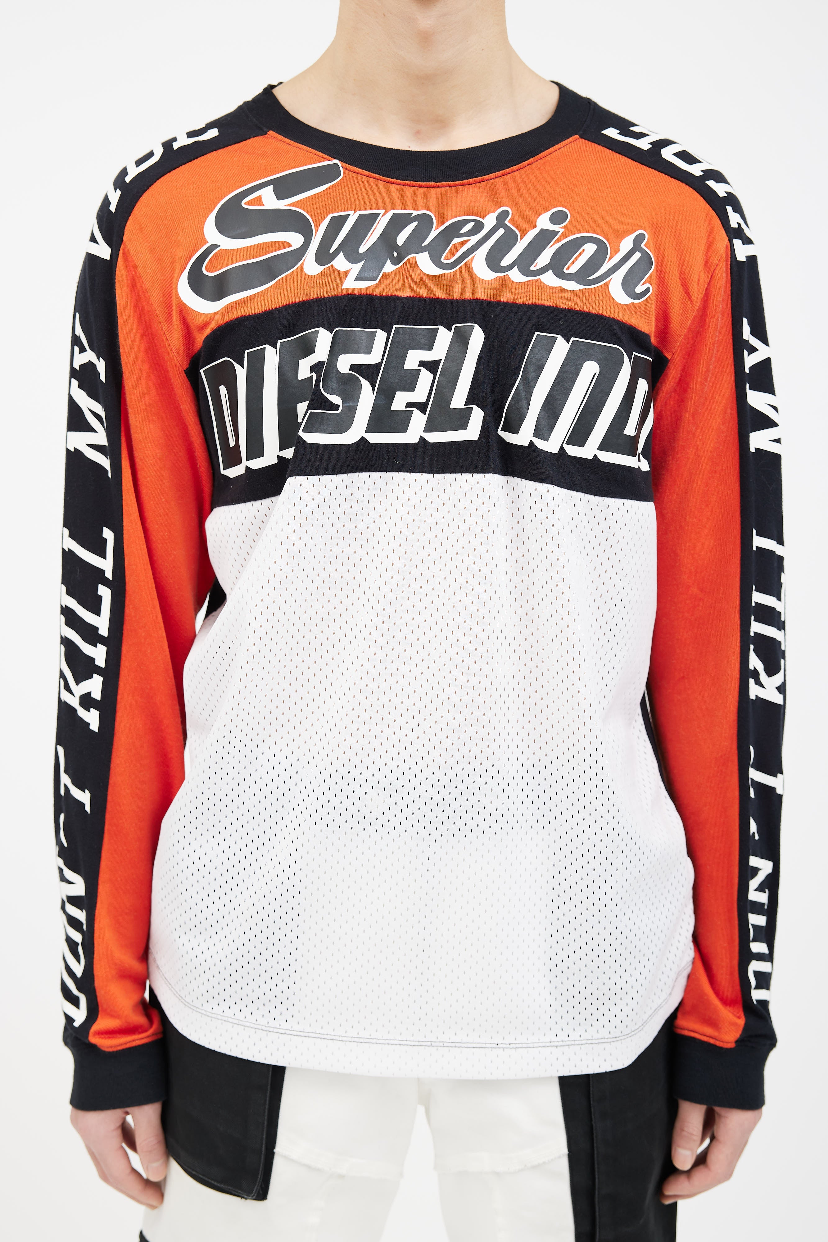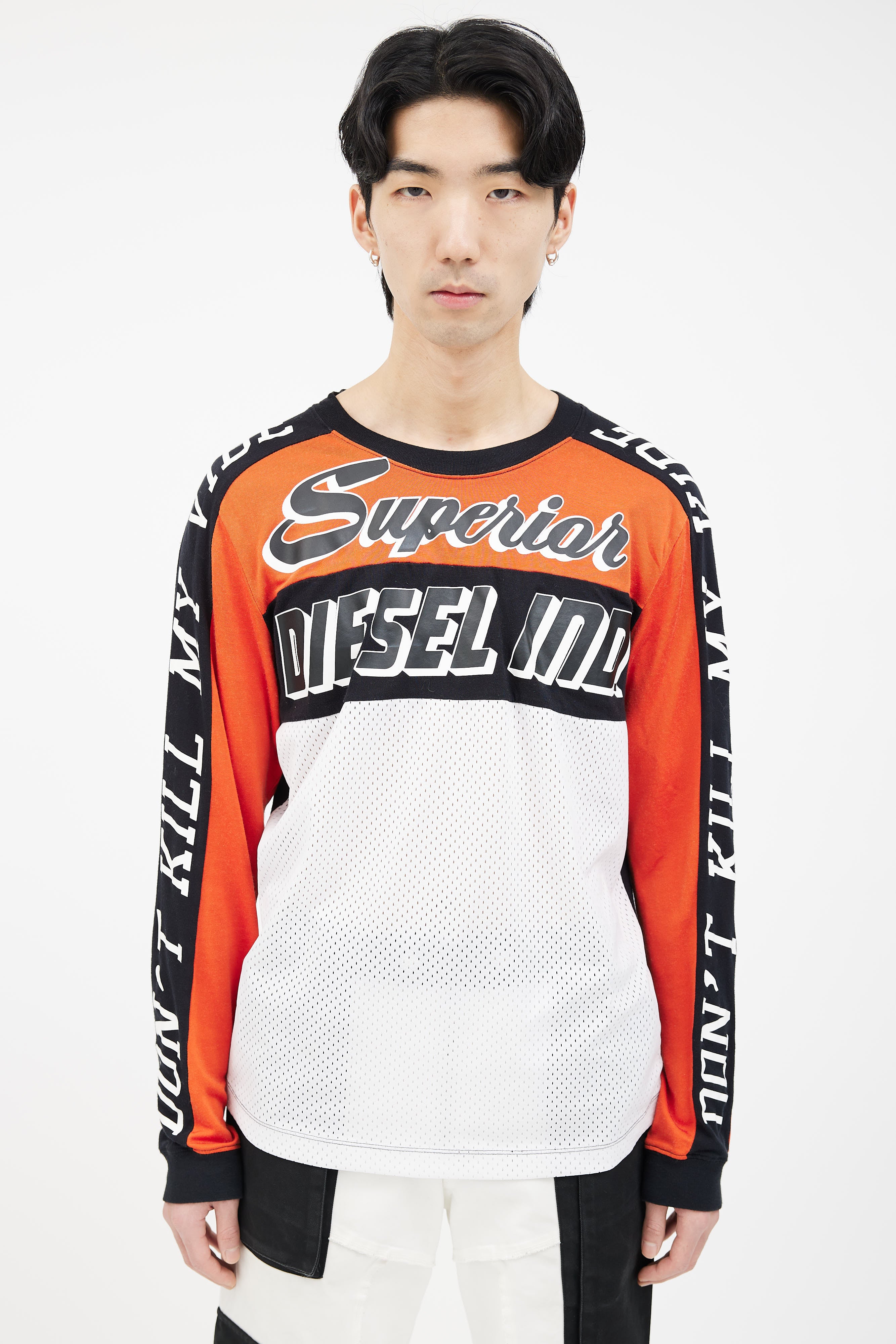 Pre-owned Diesel black, orange and white top featuring rib knit round collar, long sleeves with printed white lettering "Don't Kill My Vibe" at sides and rib knit cuffs, printed black and white lettering "Superior" and "Diesel Ind." at front, white mesh panel at front and solid black at back.