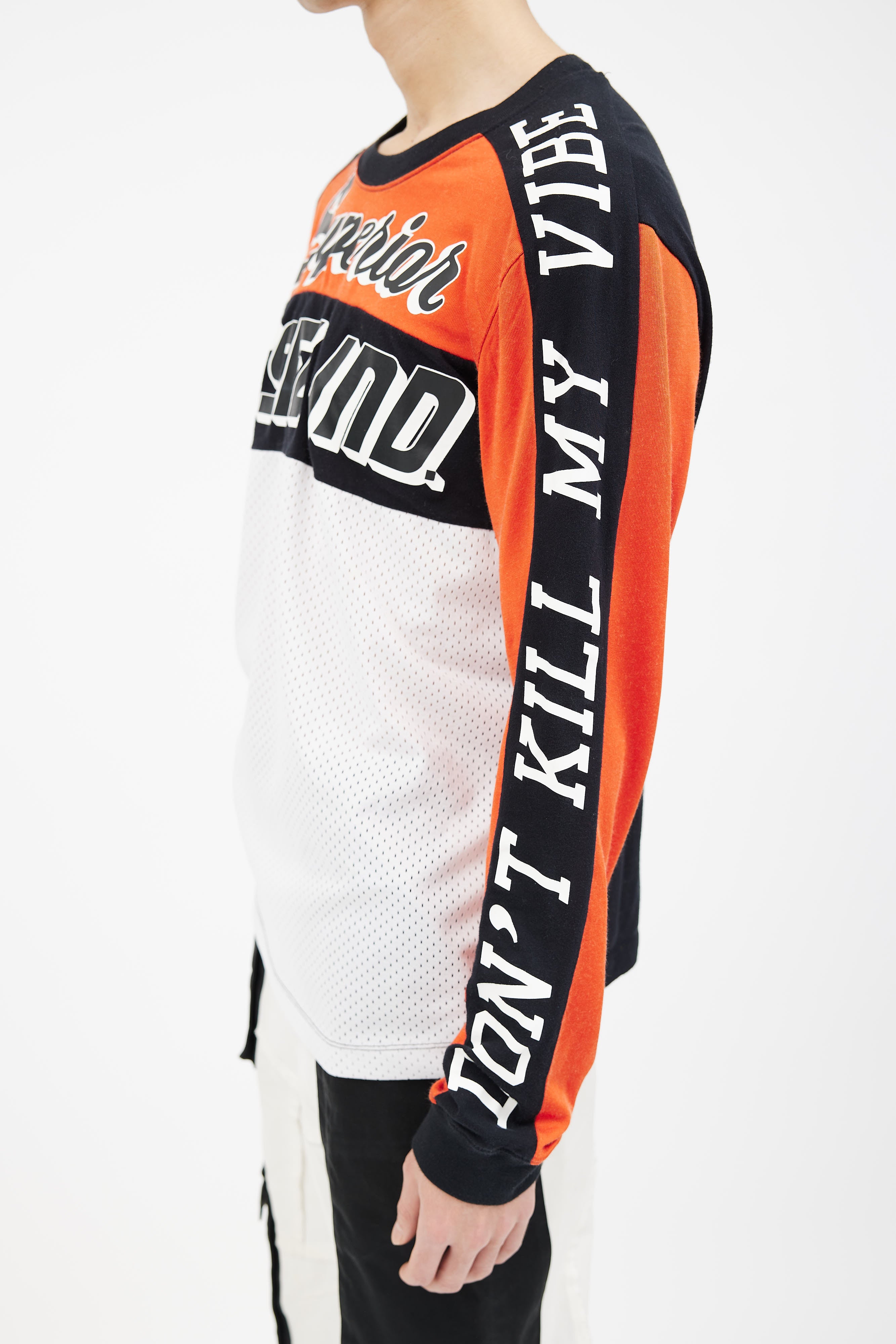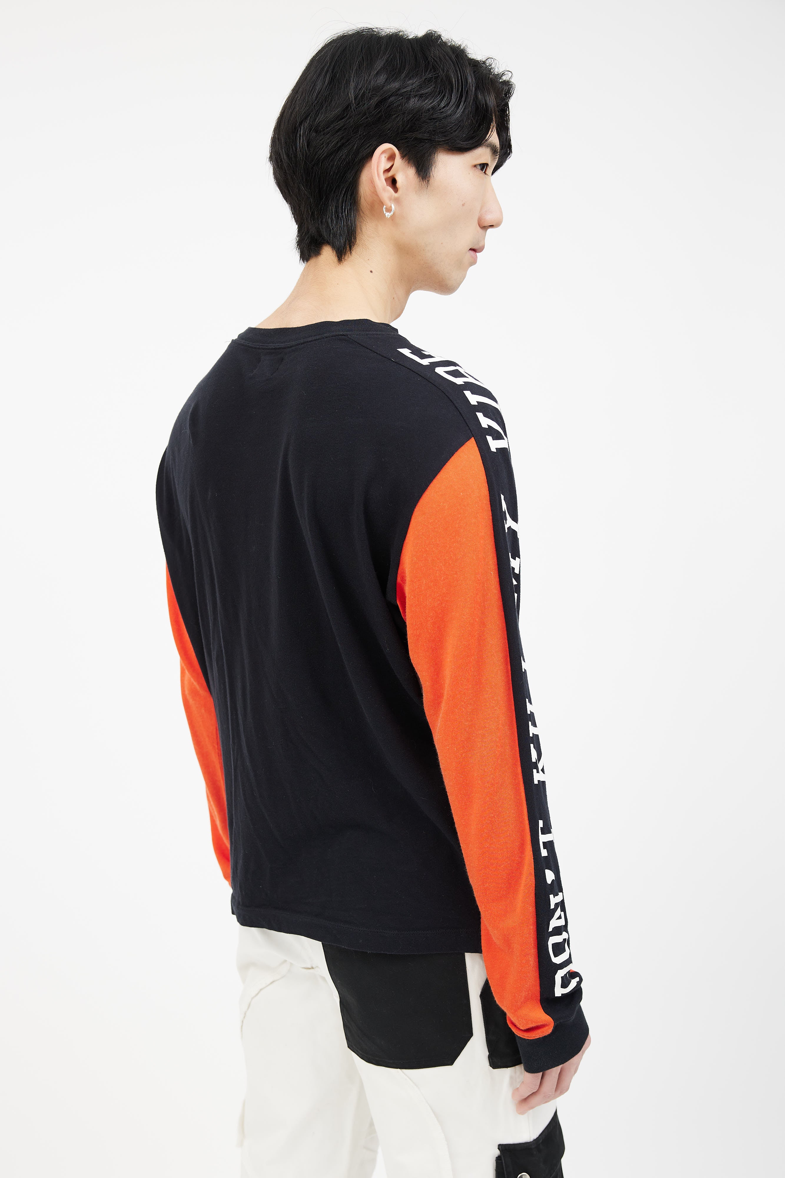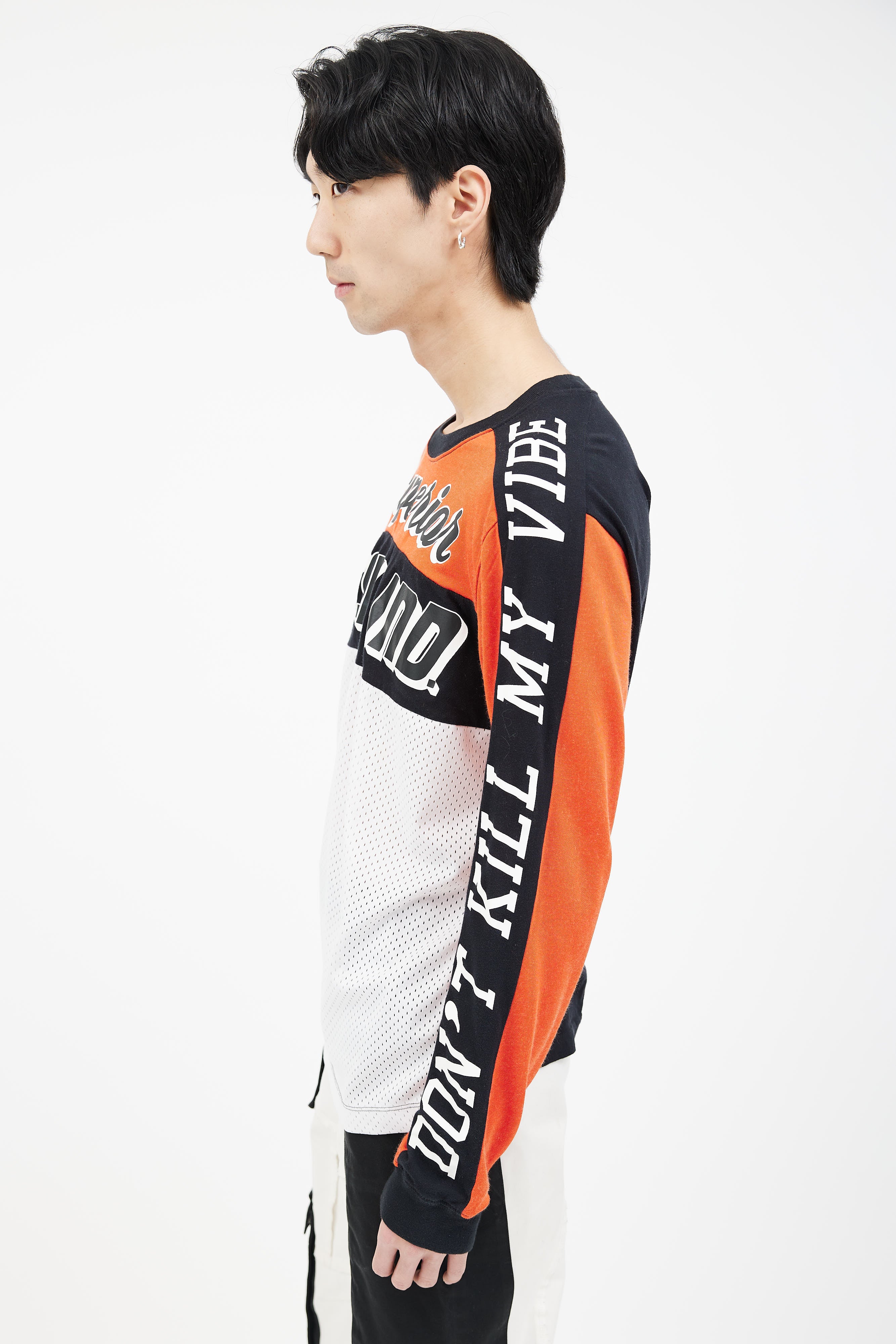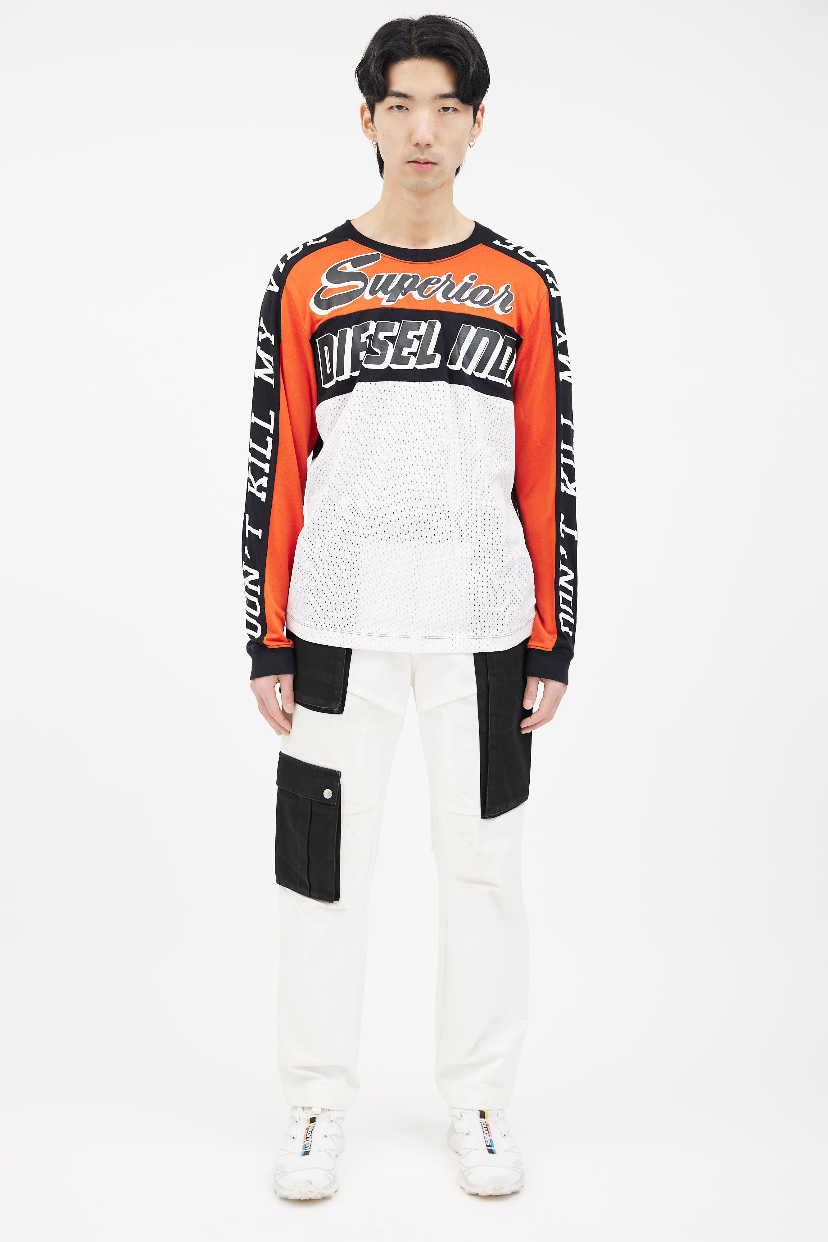 Pre-owned Diesel black, orange and white top featuring rib knit round collar, long sleeves with printed white lettering "Don't Kill My Vibe" at sides and rib knit cuffs, printed black and white lettering "Superior" and "Diesel Ind." at front, white mesh panel at front and solid black at back.
