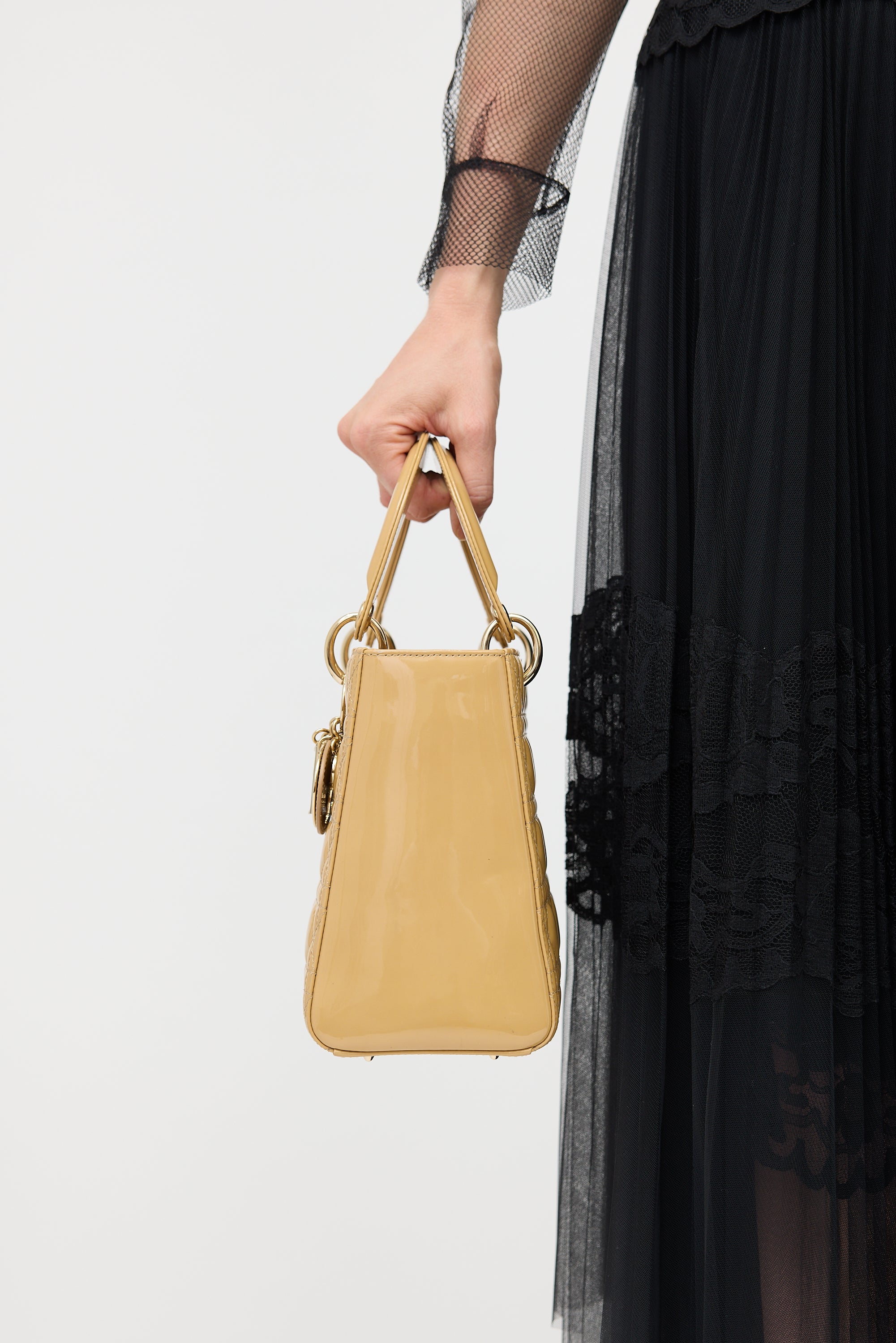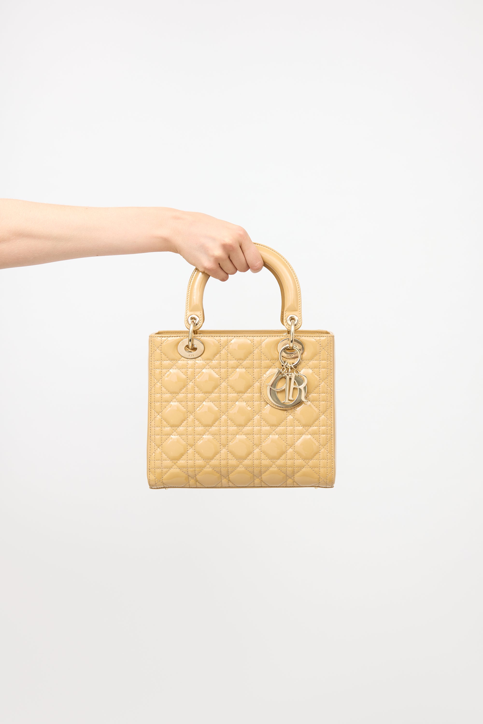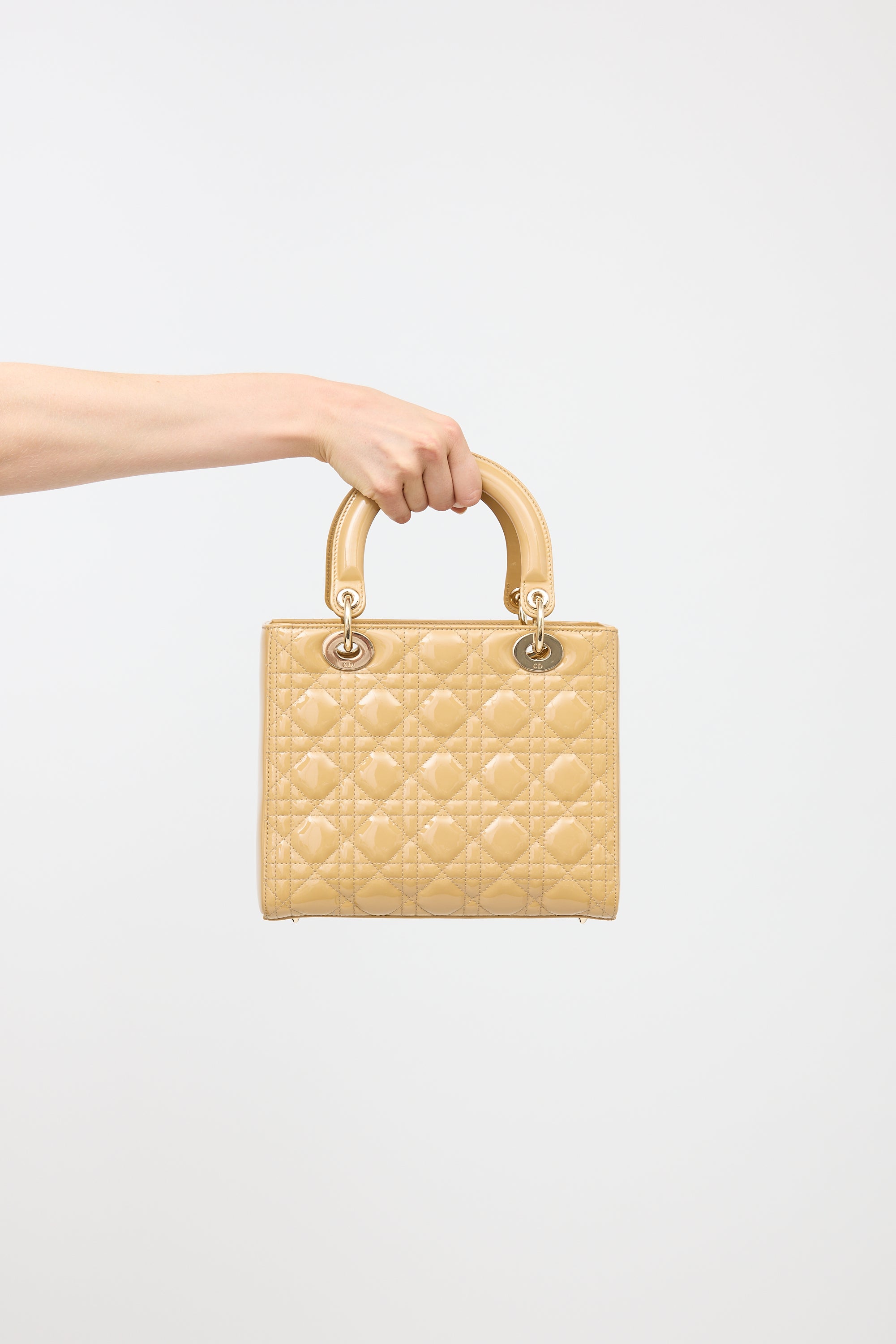 Pre-owned Christian Dior 2014 beige patent leather medium Lady Dior bag featuring silver tone hardware, detachable shoulder strap, dual flat top handles, "D.I.O.R." charm at front, four protective feet at base, top zip closure, and one lined main compartments with one zip pocket. Comes with original dust bag.