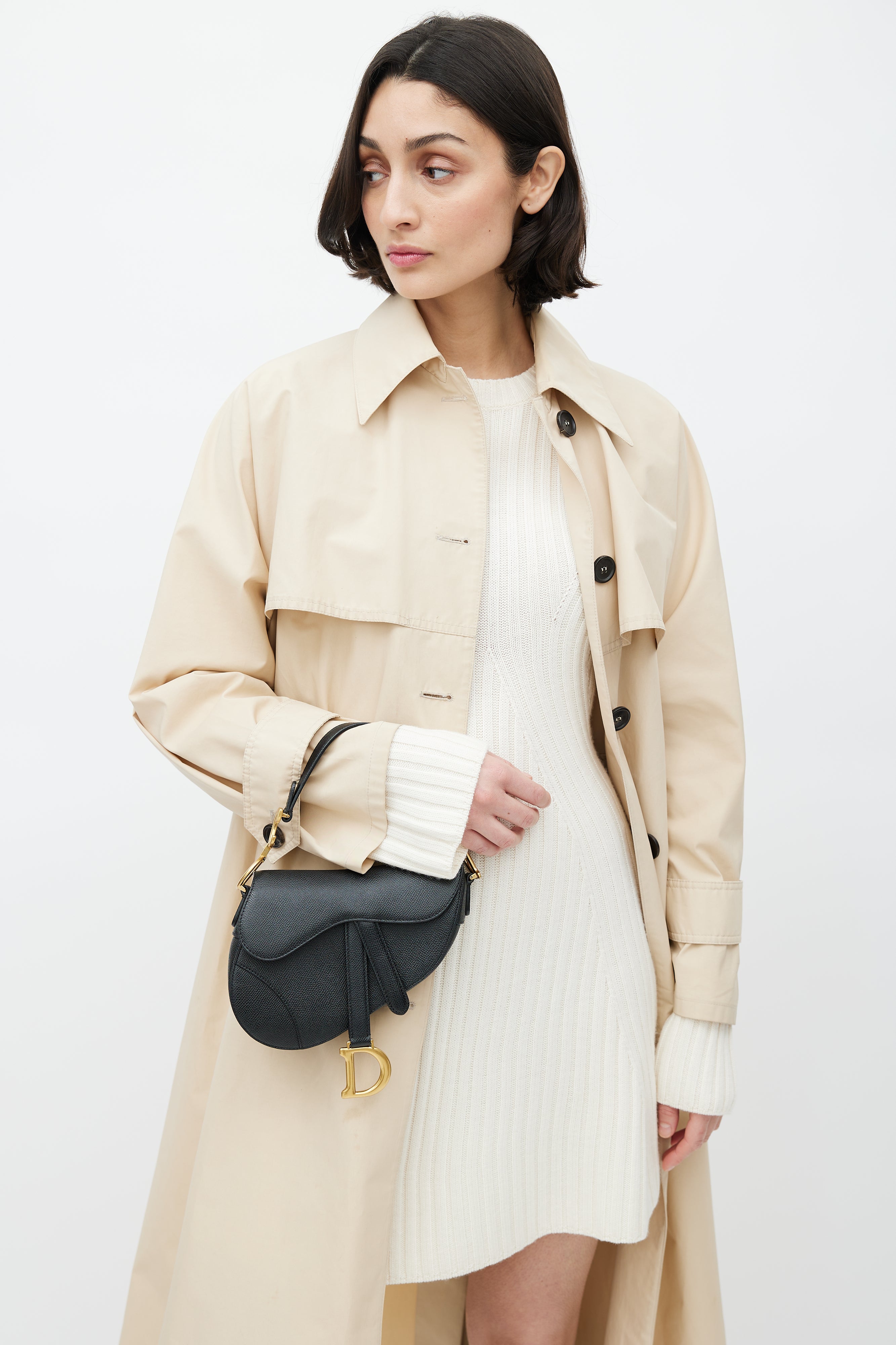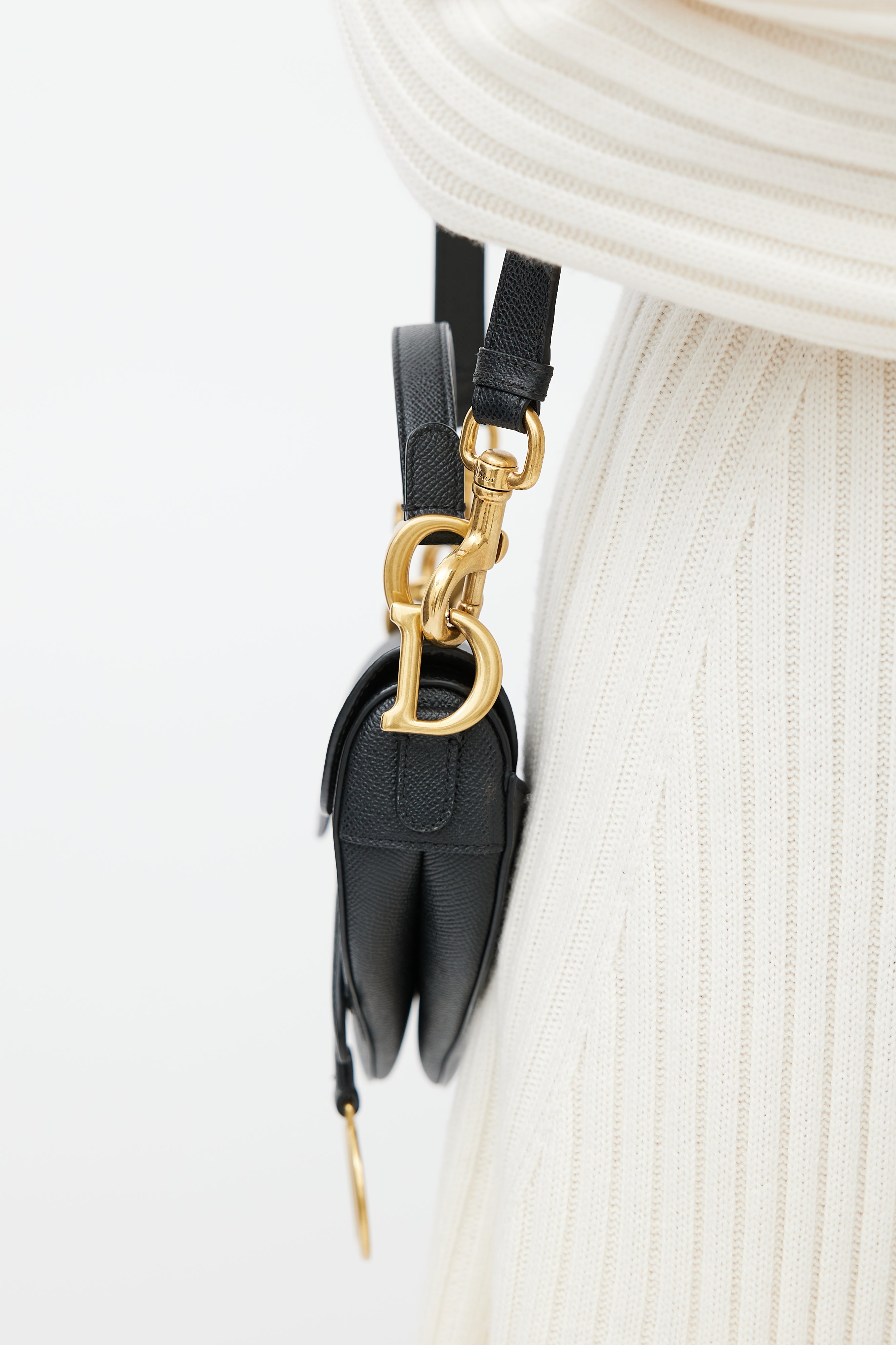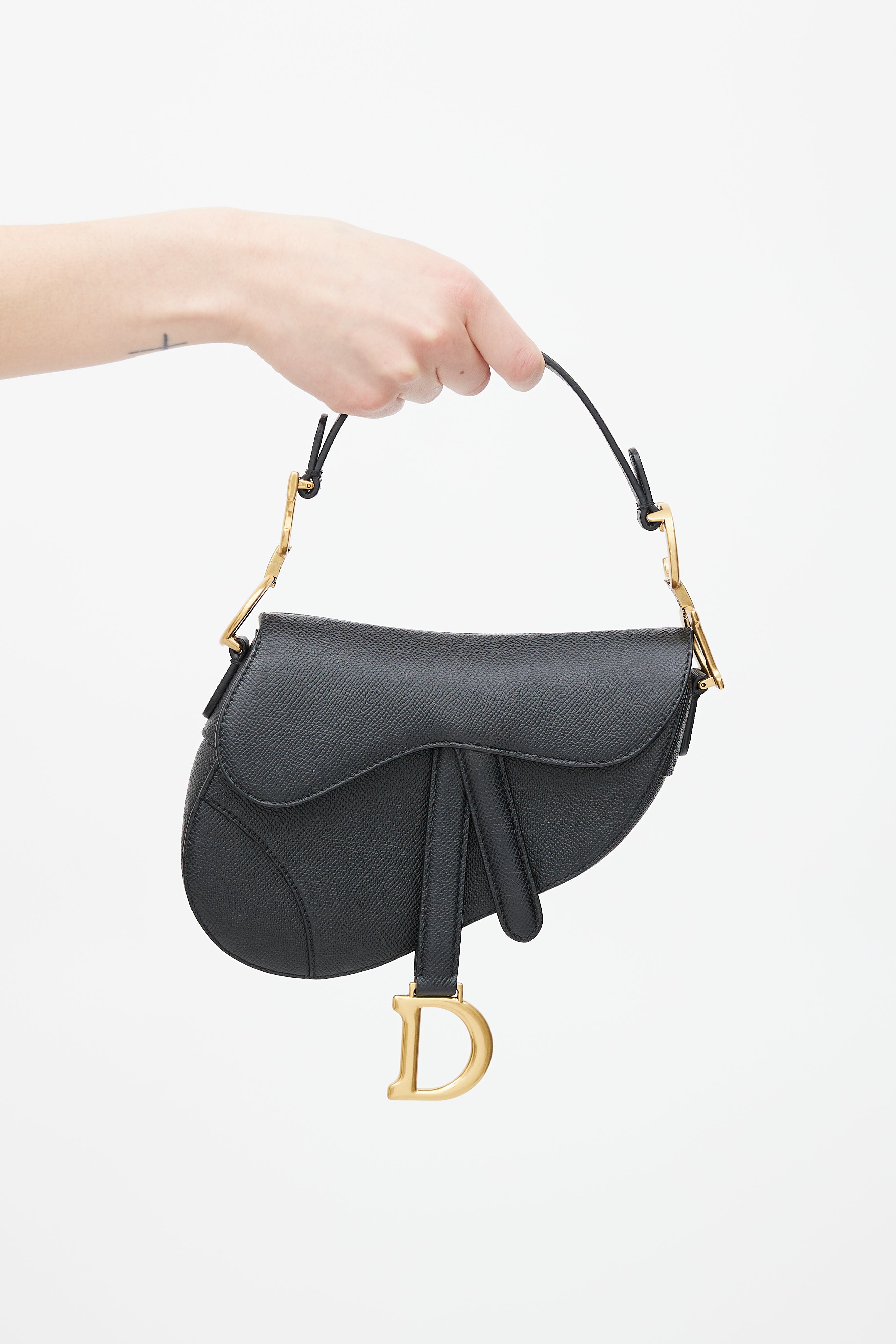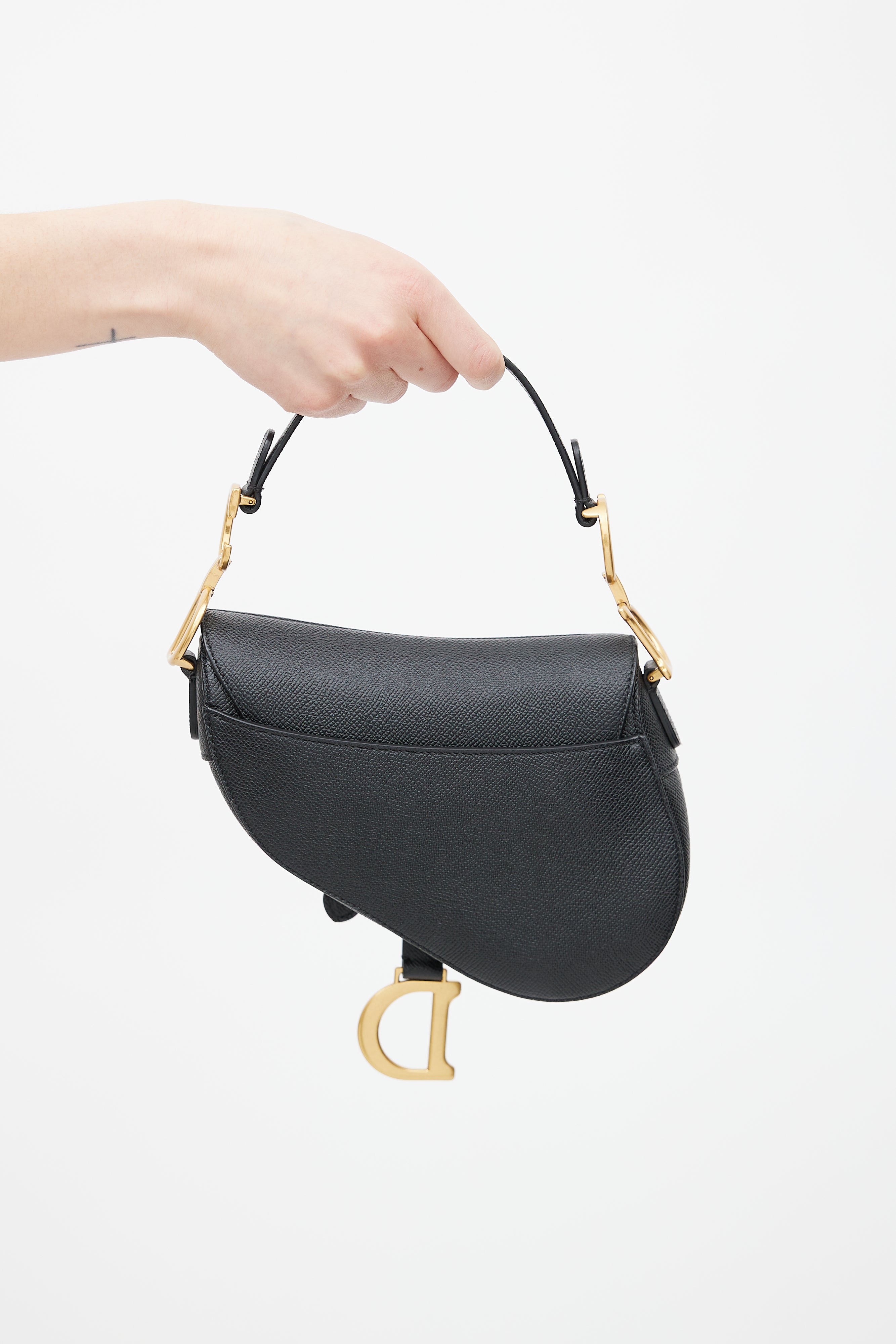 Pre-owned Dior 2022 black leather Mini Saddle bag featuring a single shoulder strap with gold tone CD logo at ends, detachable crossbody strap, curved saddle body, slip pocket at outer back, top flap with magnetic closure and one main compartment. Comes with original dust bag.