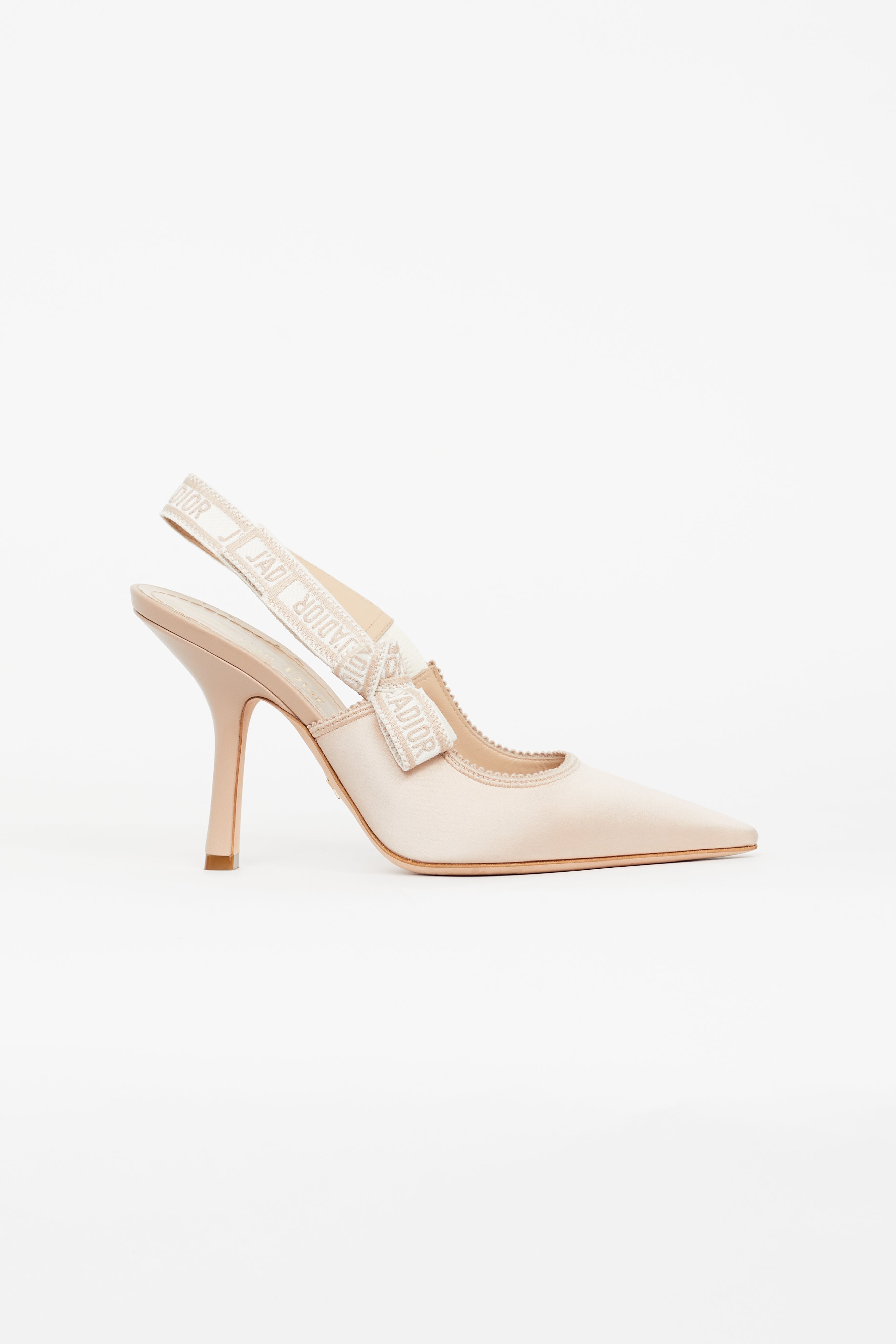 Pre-owned Dior beige pumps featuring pointed toe, slingback strap with embroidered "J'adior" throughout, satin upper, and stiletto heel. Comes with original box and dust bag.