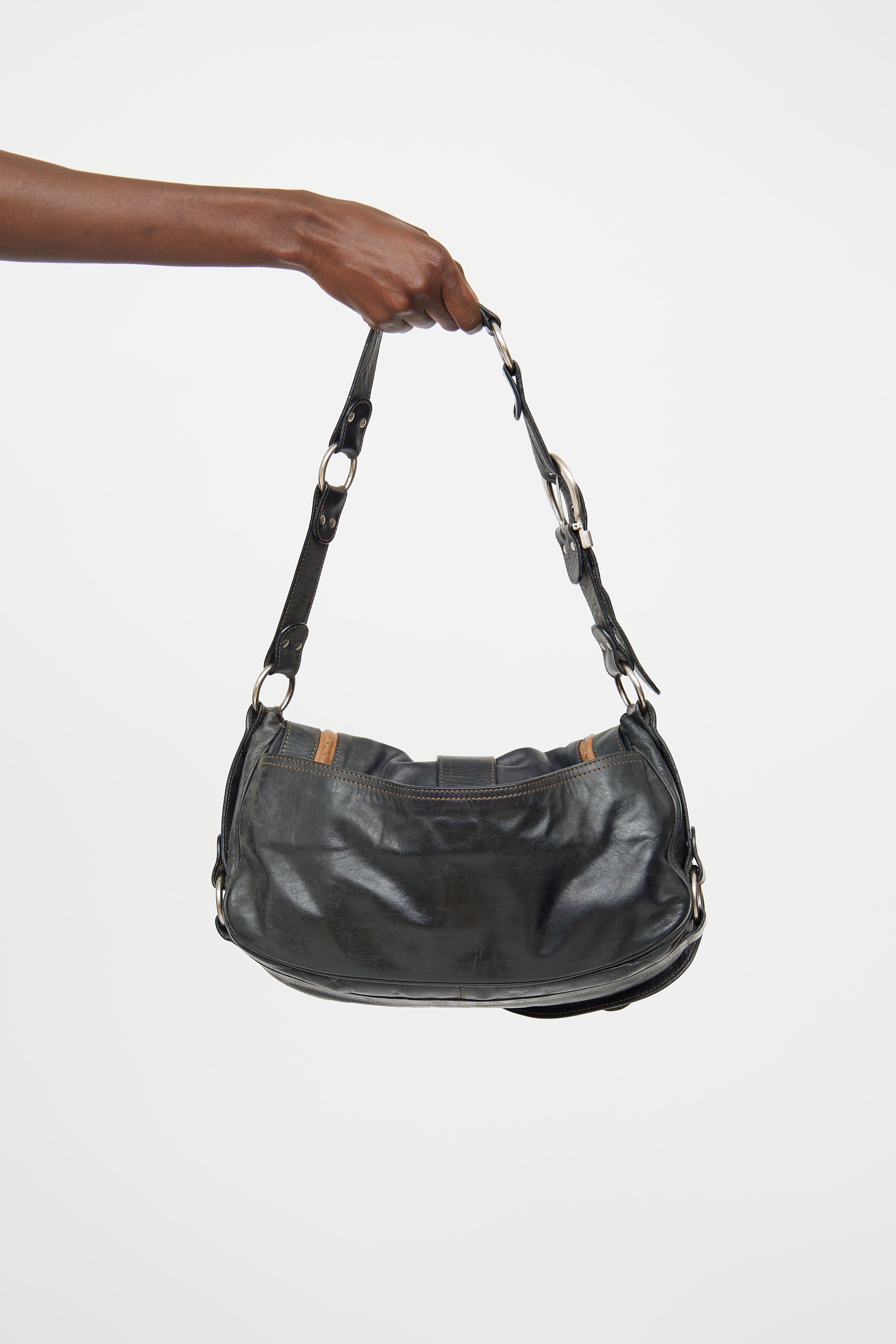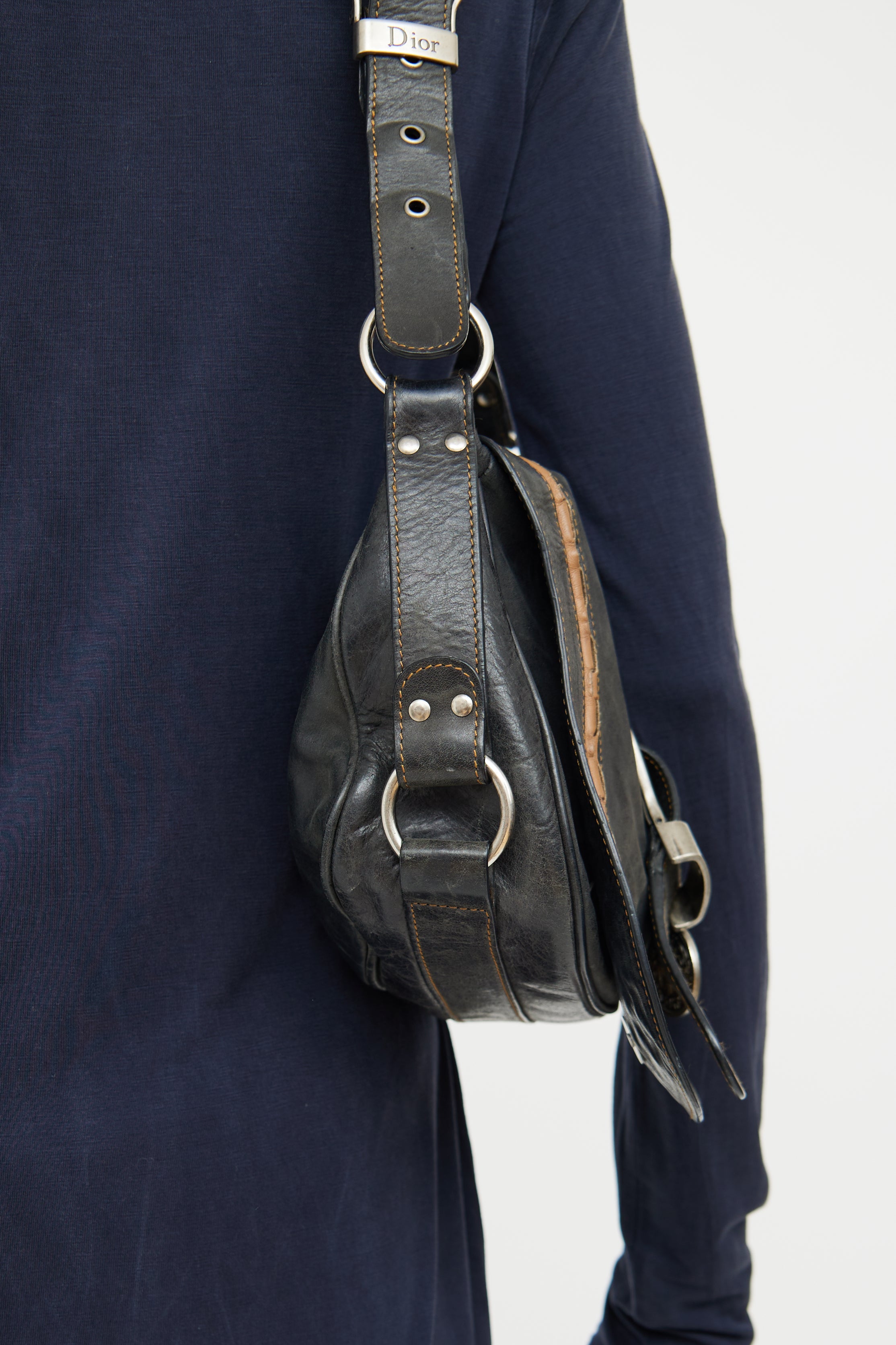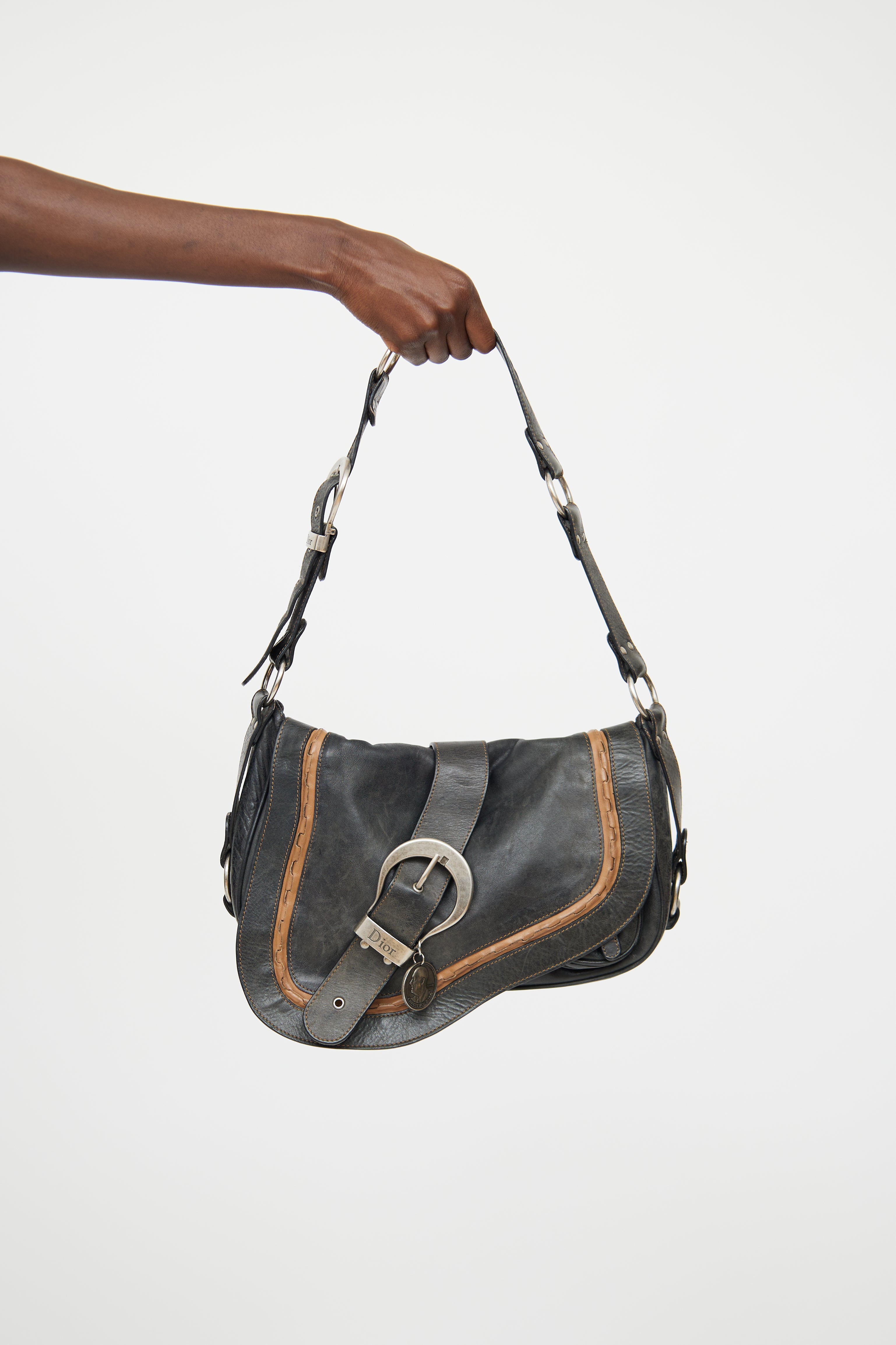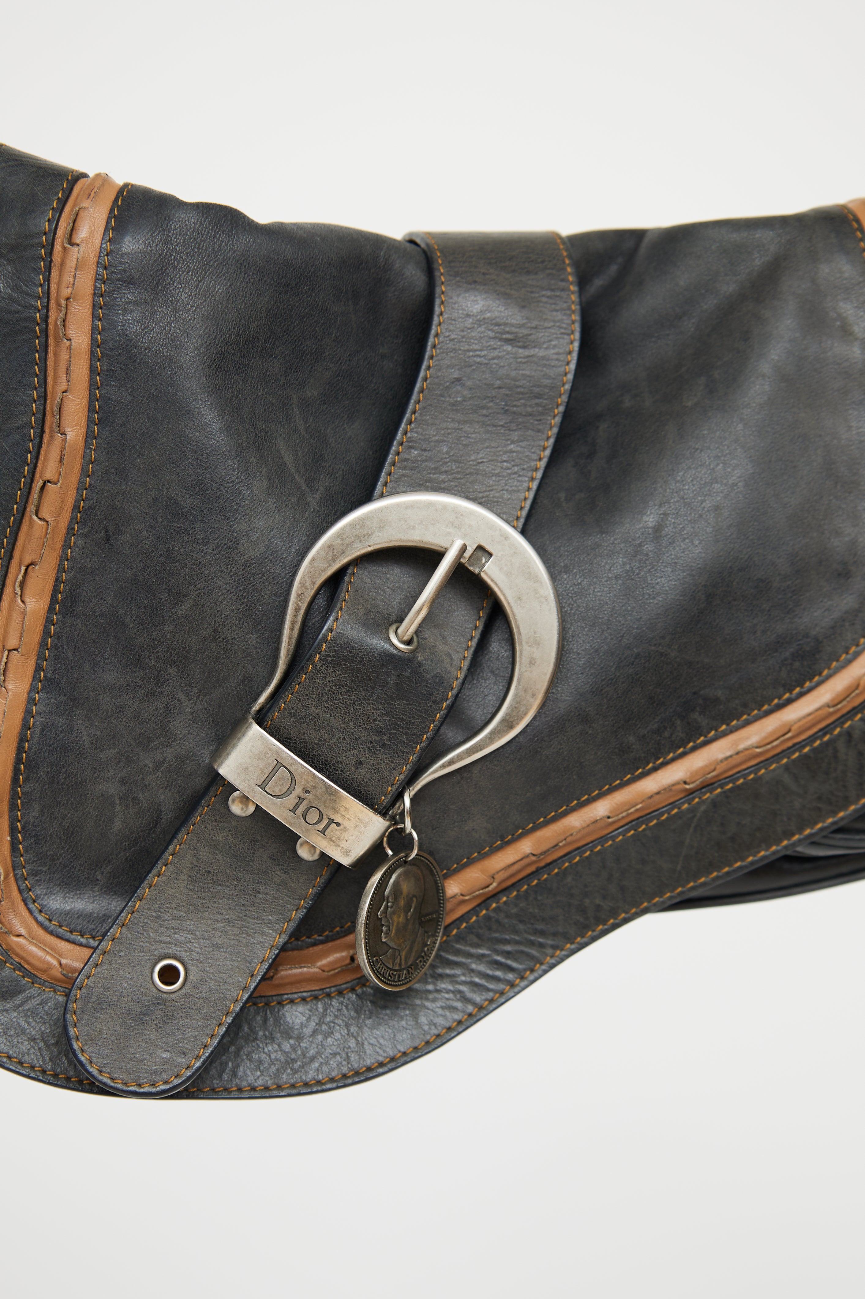 Pre-owned Dior black and brown Gaucho bag featuring distressed leather, rolled edge trim, contrast stitching, single flat adjustable strap with buckle, silver tone hardware, logo stamped hardware, signate saddle bag styling with belted strap detail on flap, embossed medallion, snap button closure slip pocket on back, snap button closure flap and snap button closure flap pocket underneath flap with strap detail. Canvas lined logo print main compartment and single zip pocket. John Galliano era design.