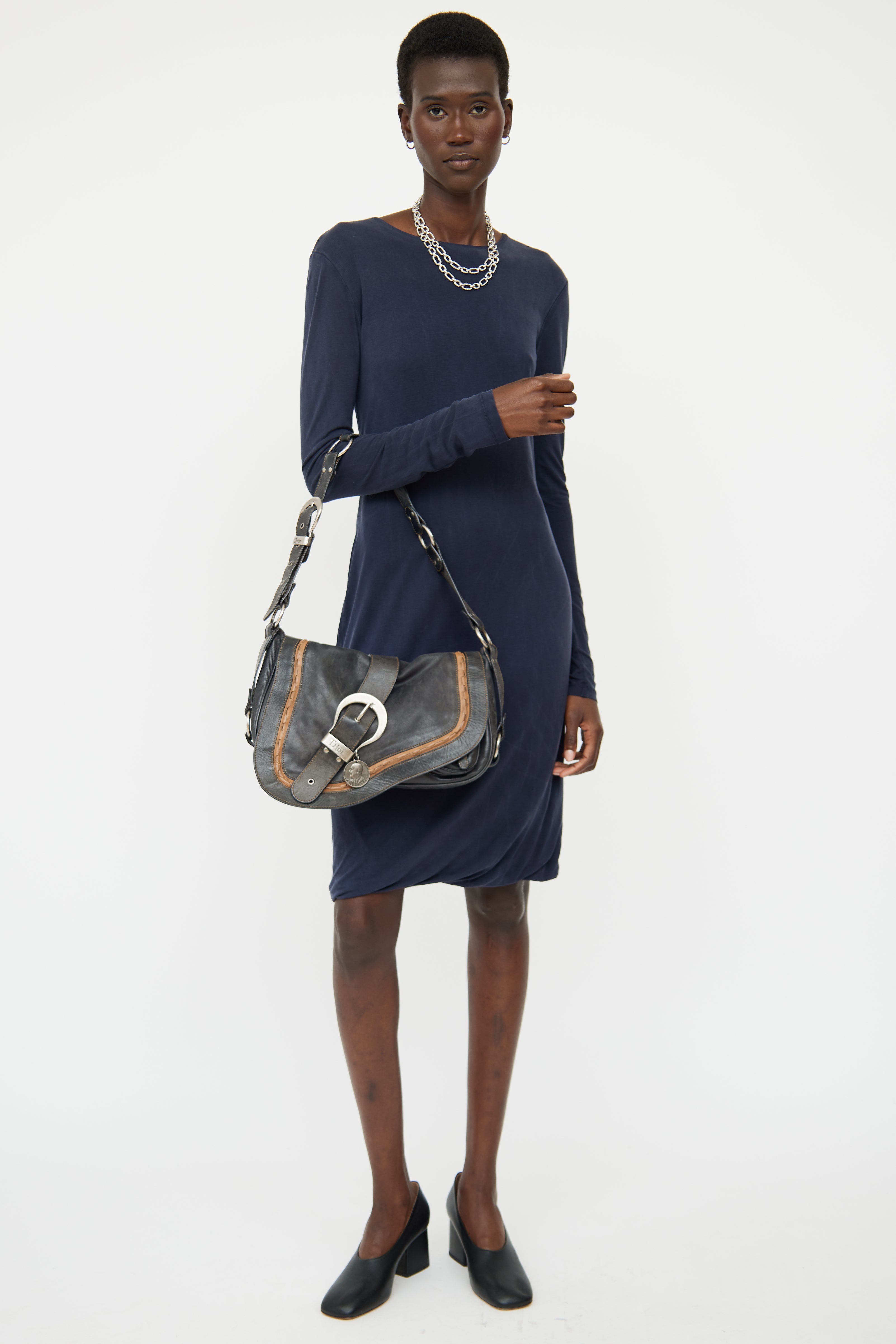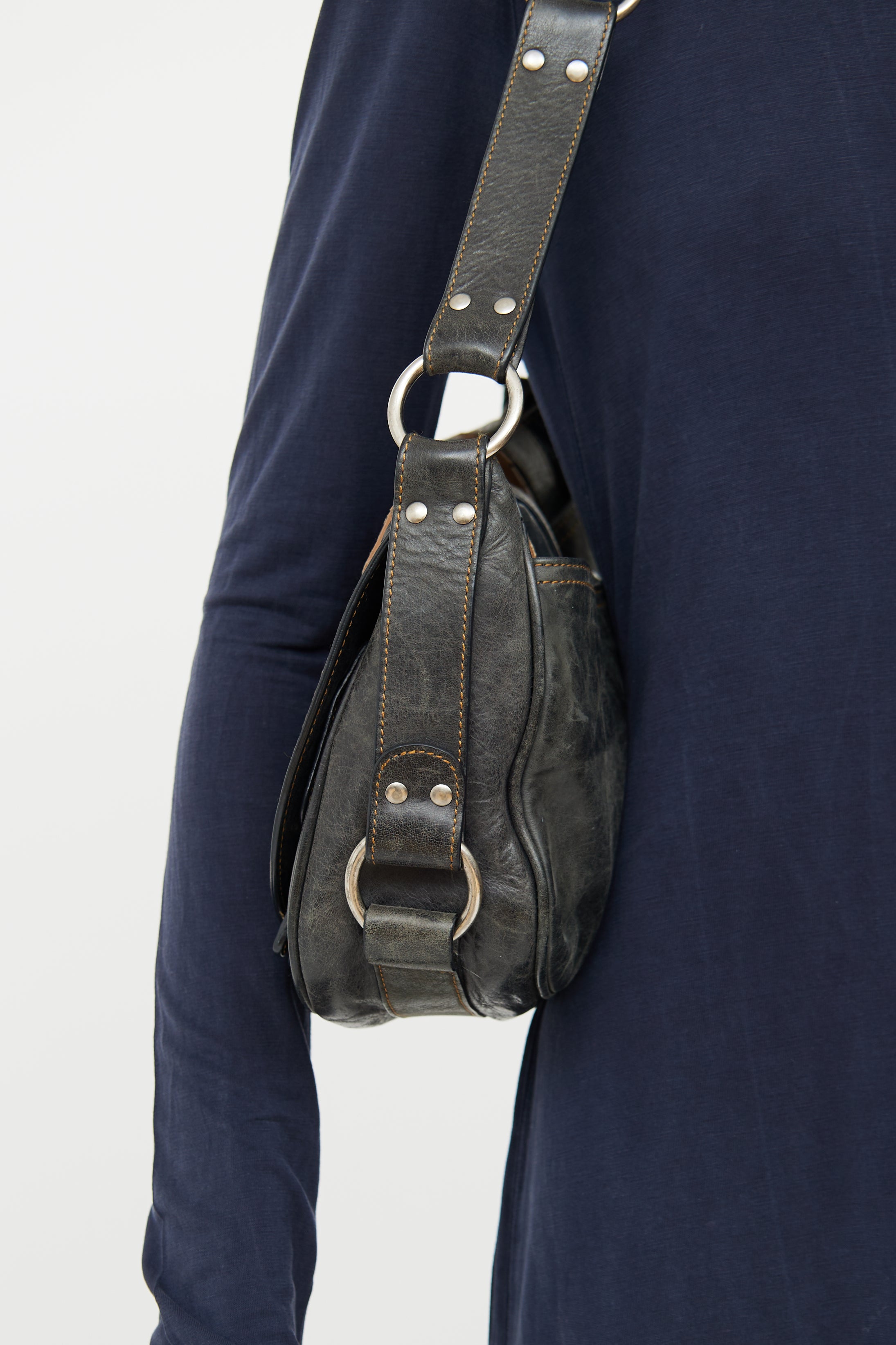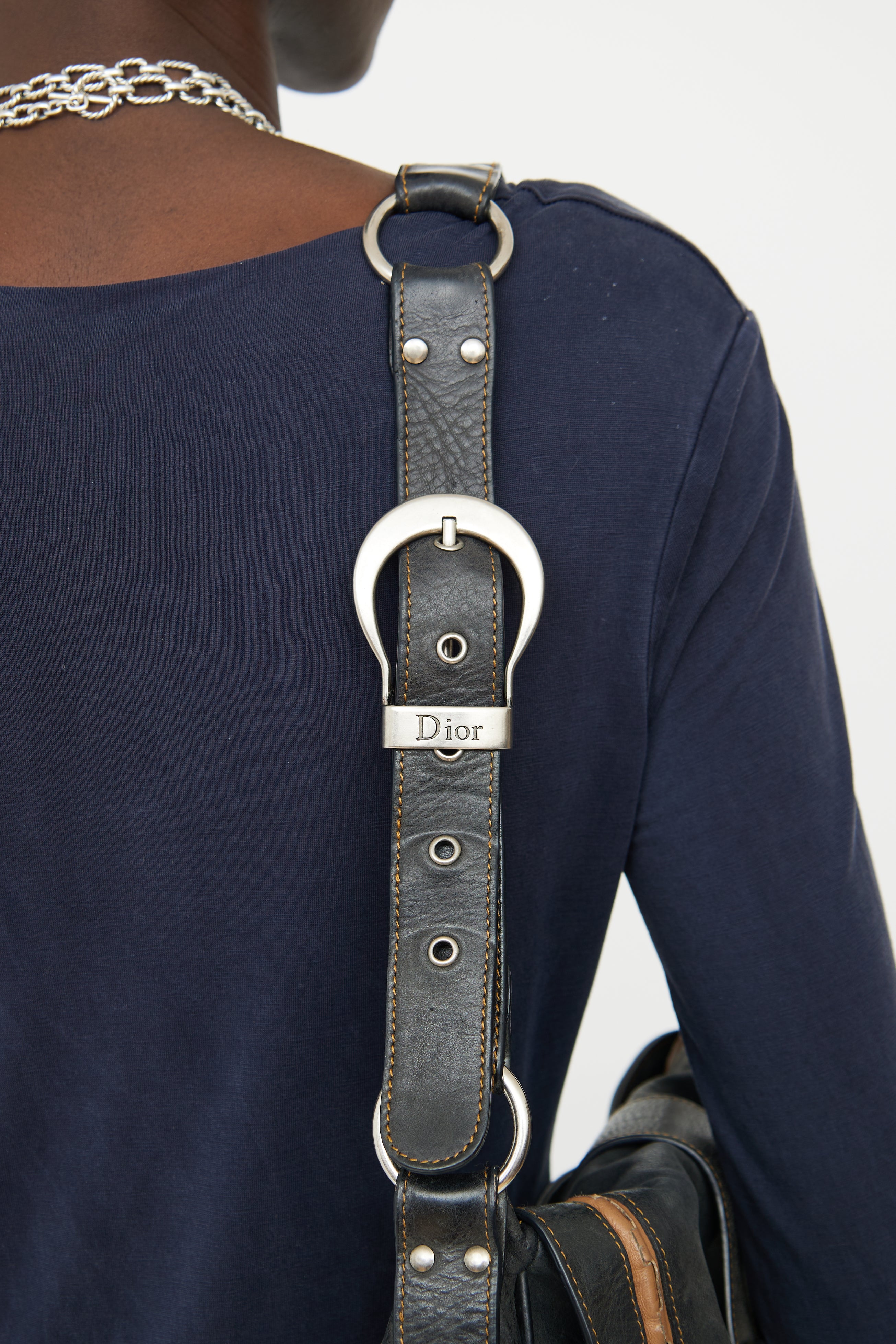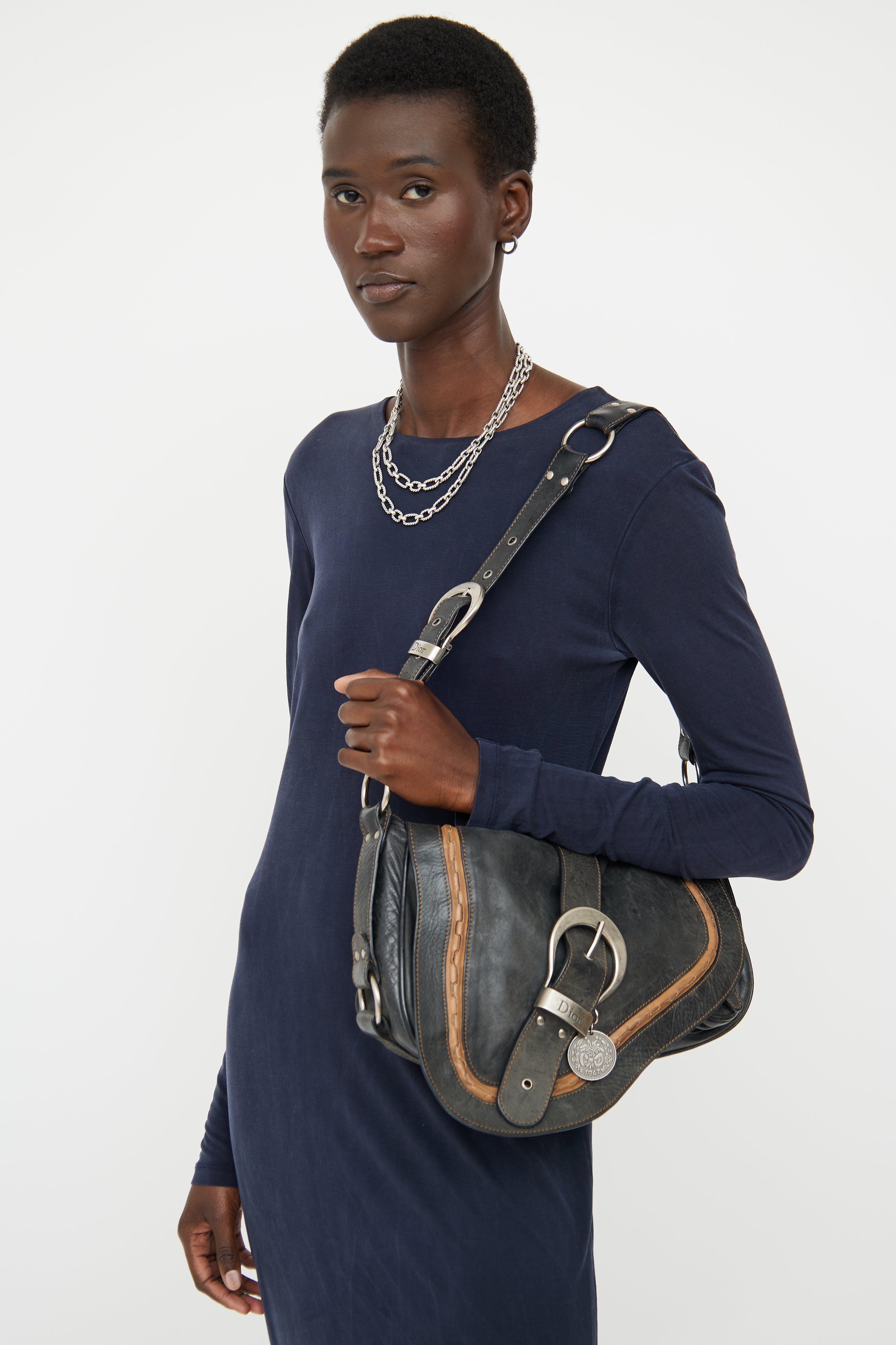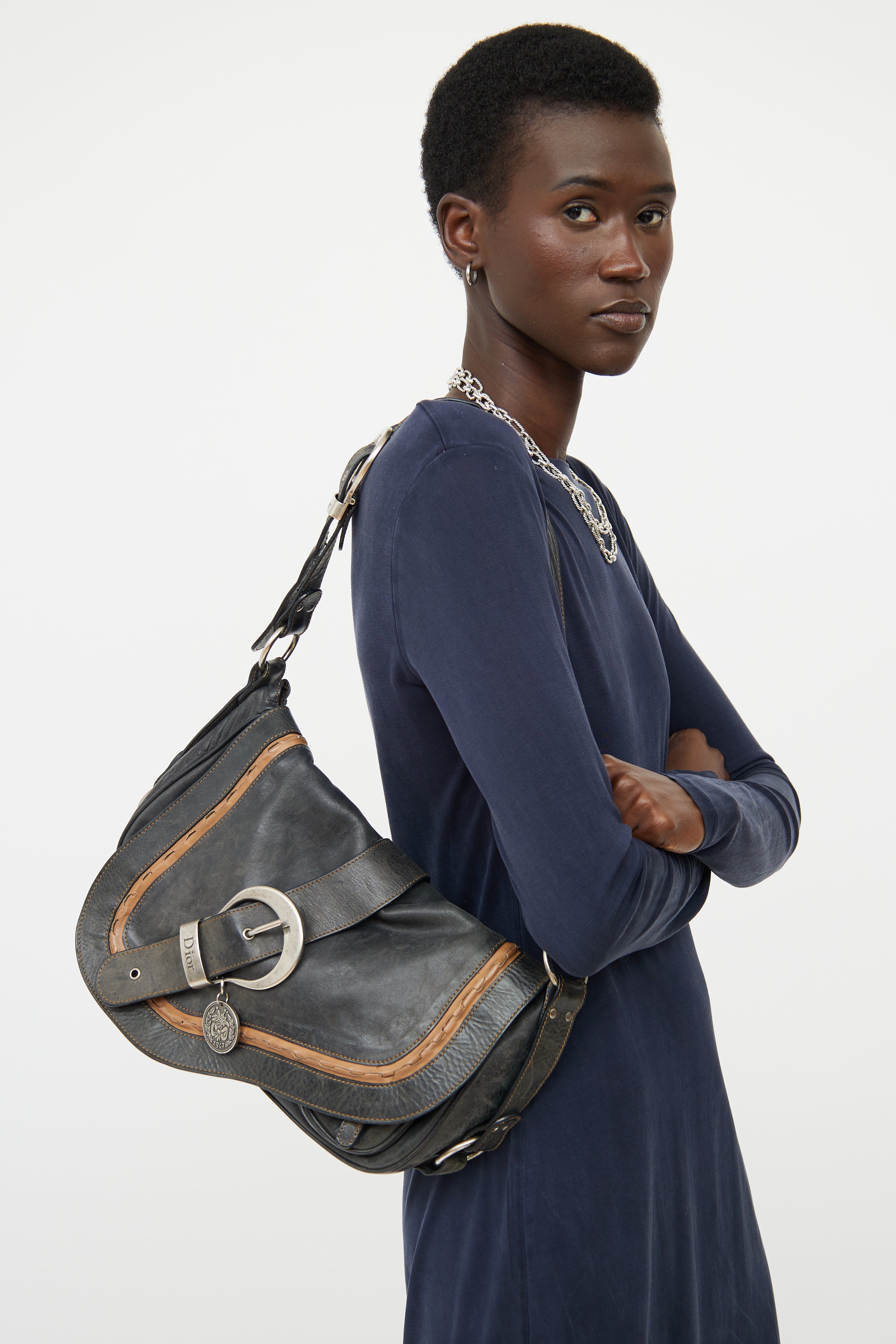 Pre-owned Dior black and brown Gaucho bag featuring distressed leather, rolled edge trim, contrast stitching, single flat adjustable strap with buckle, silver tone hardware, logo stamped hardware, signate saddle bag styling with belted strap detail on flap, embossed medallion, snap button closure slip pocket on back, snap button closure flap and snap button closure flap pocket underneath flap with strap detail. Canvas lined logo print main compartment and single zip pocket. John Galliano era design.