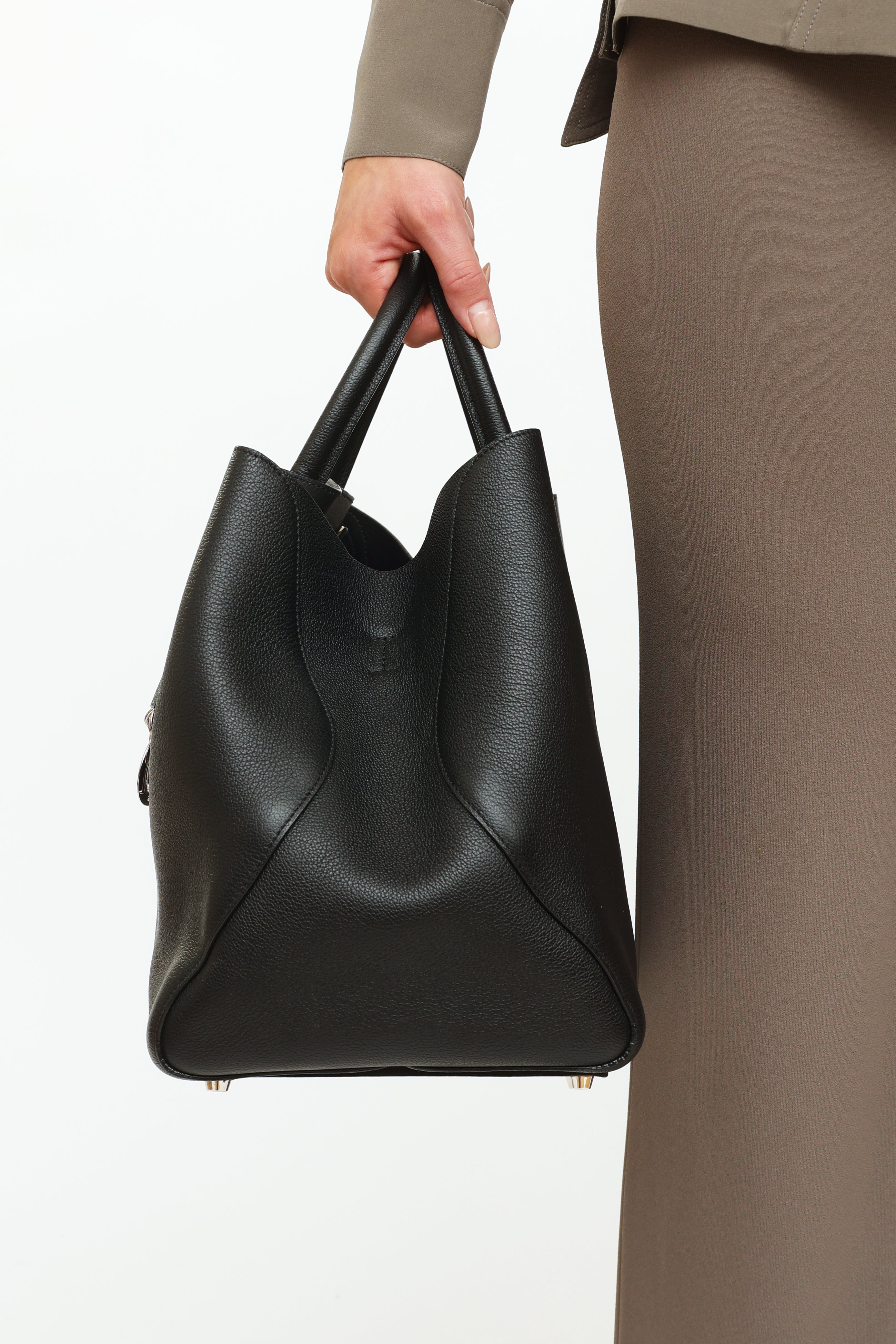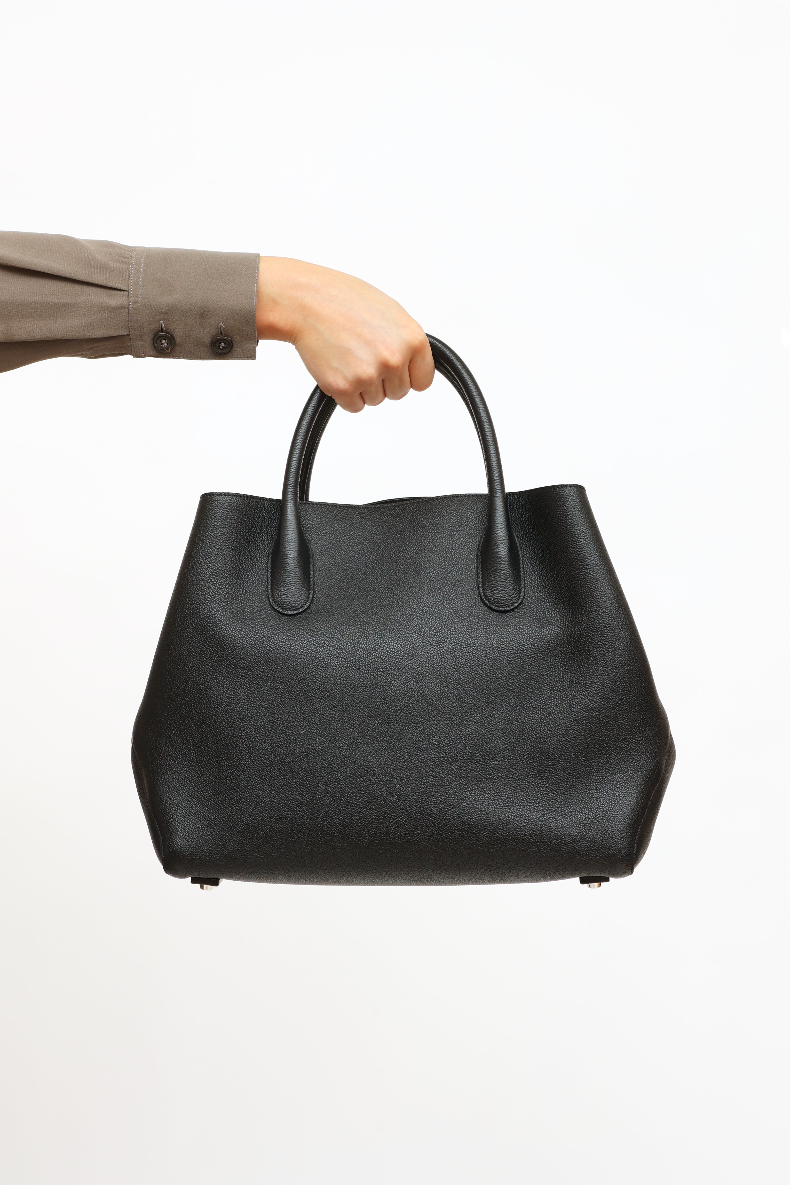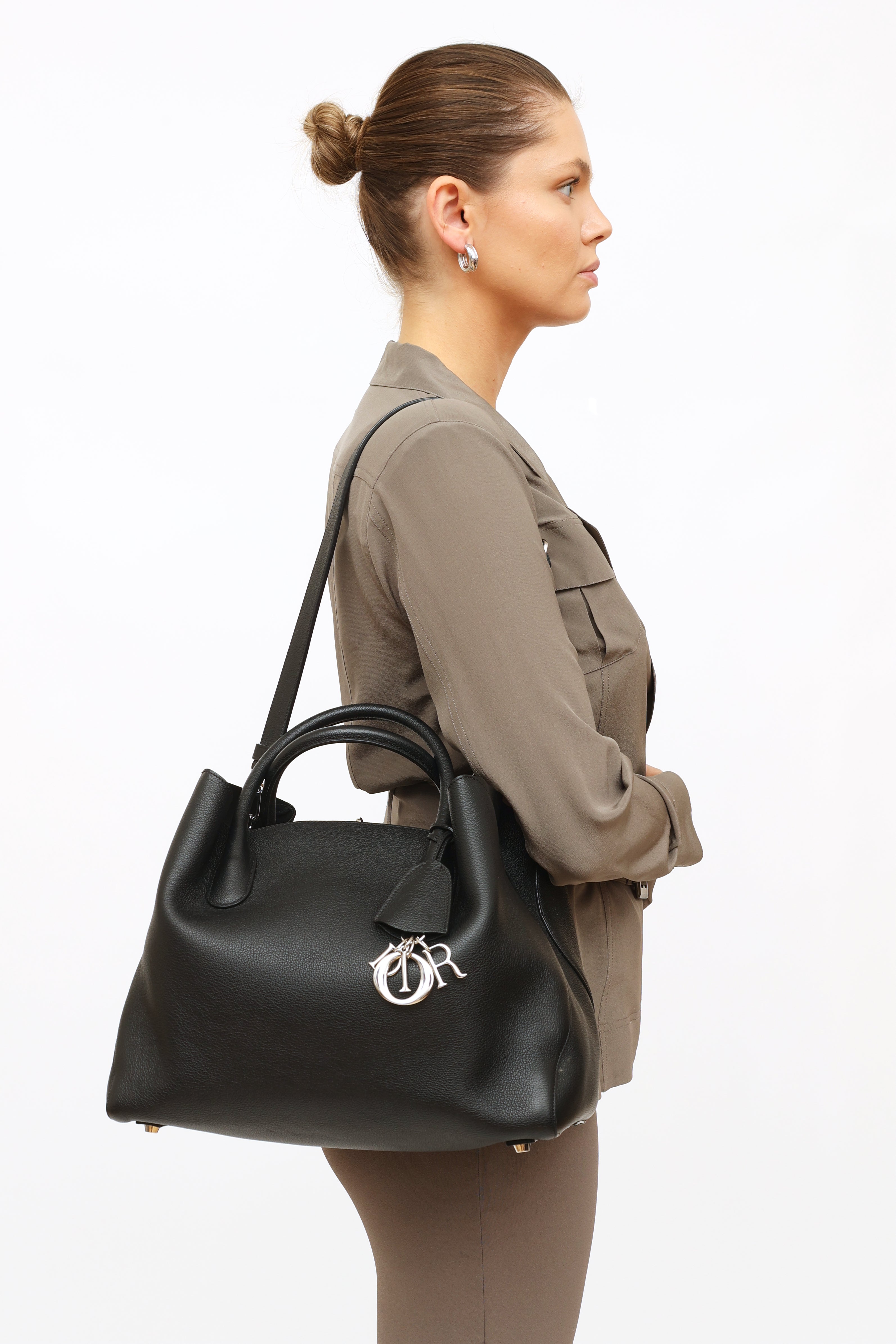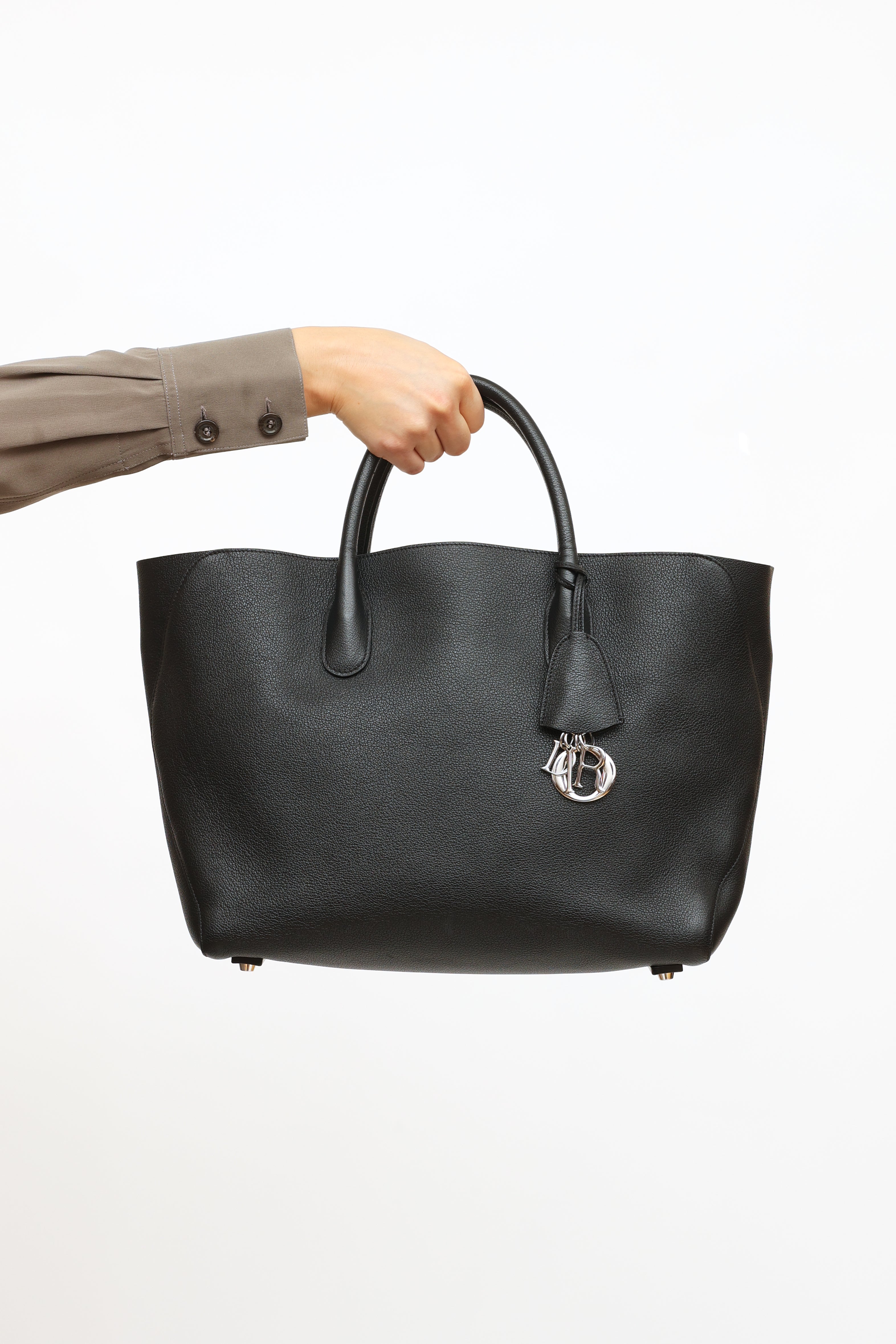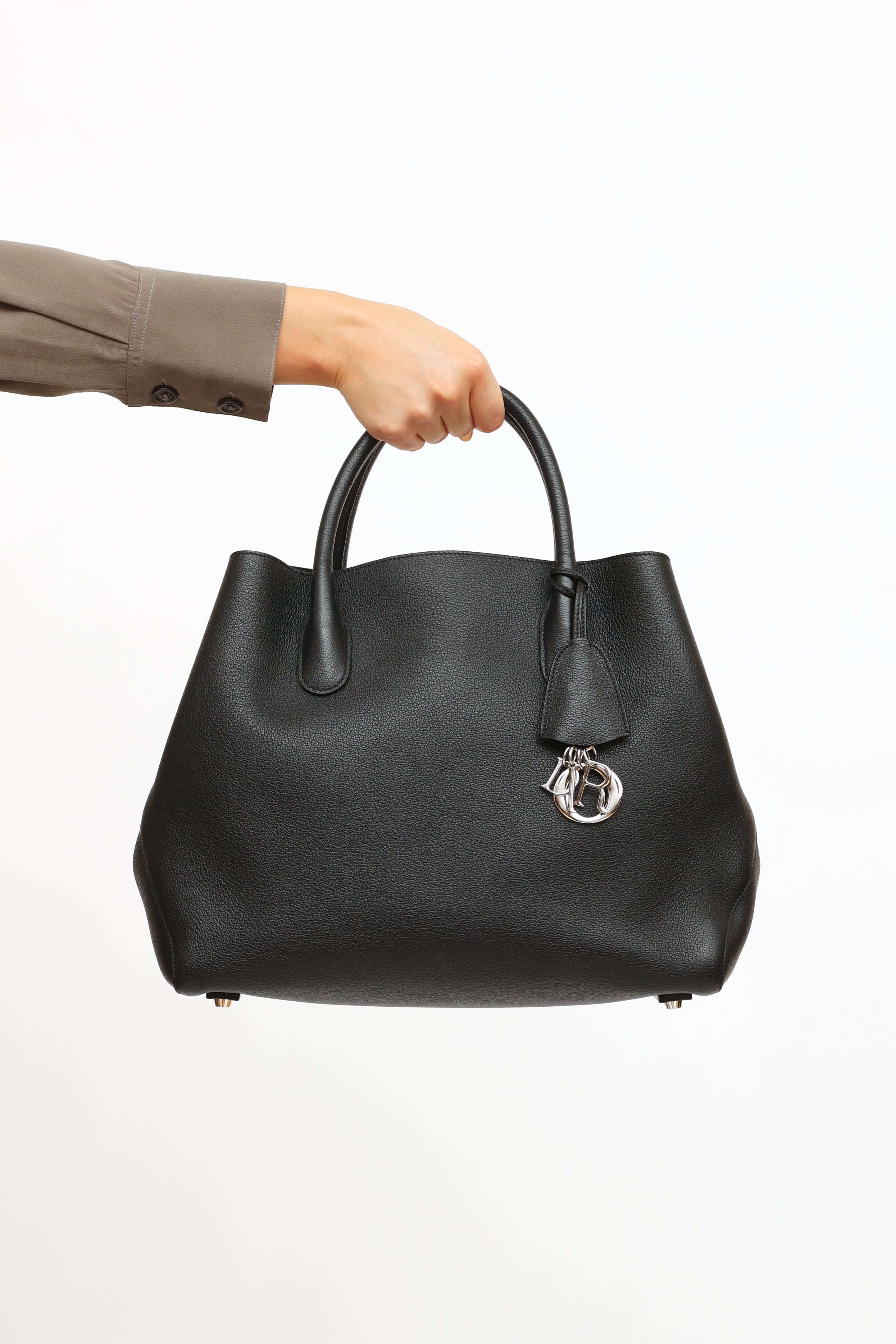 Pre-owned Christian Dior black leather Open Bar tote bag featuring two rolled leather handles and one adjustable and detachable shoulder strap. Open top interior with twist lock strap across. Interior features one snap button pocket and 3 compartments. Removable clochette with silver-tone logo letter charms and silver-tone bag feet.