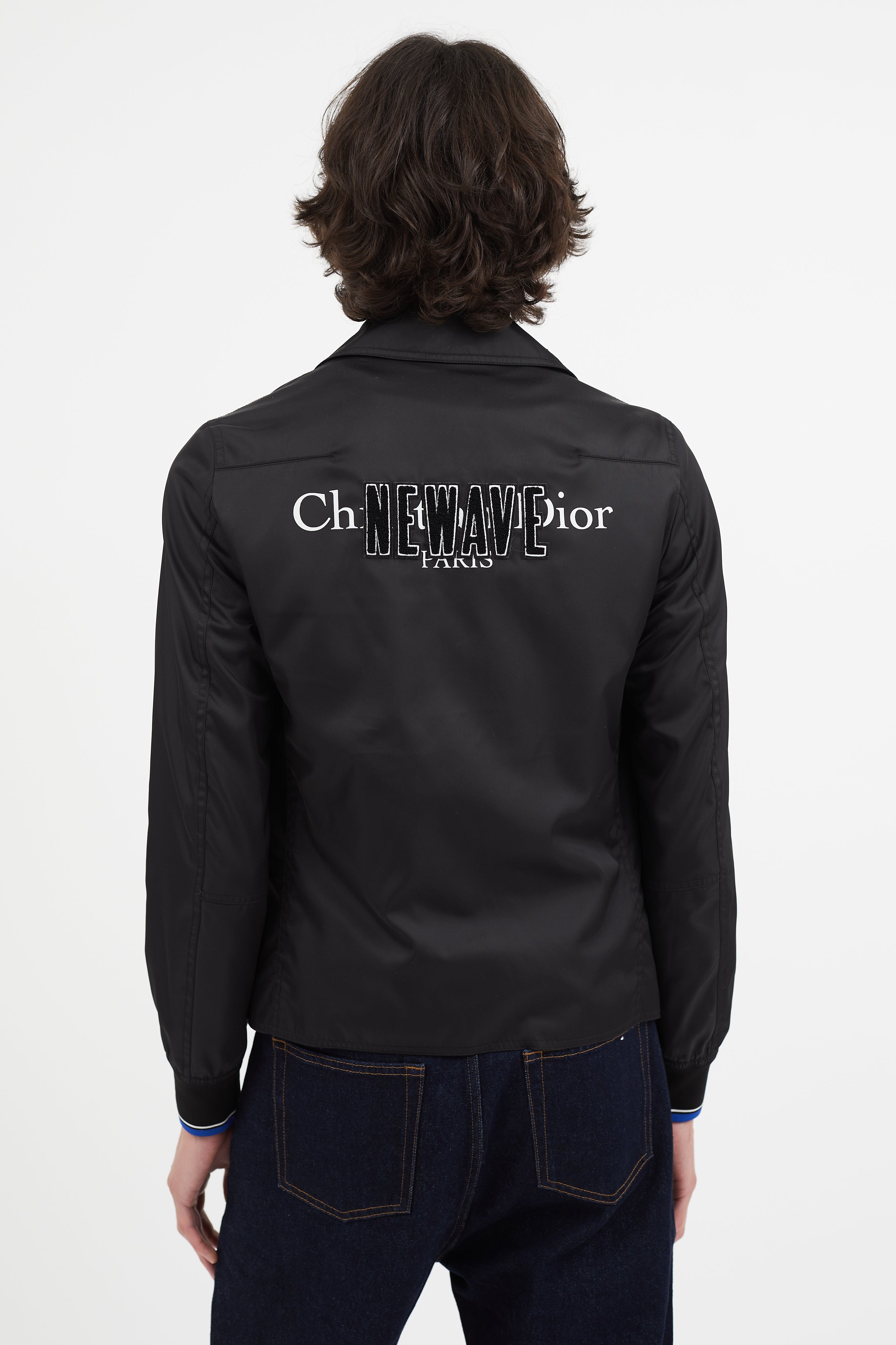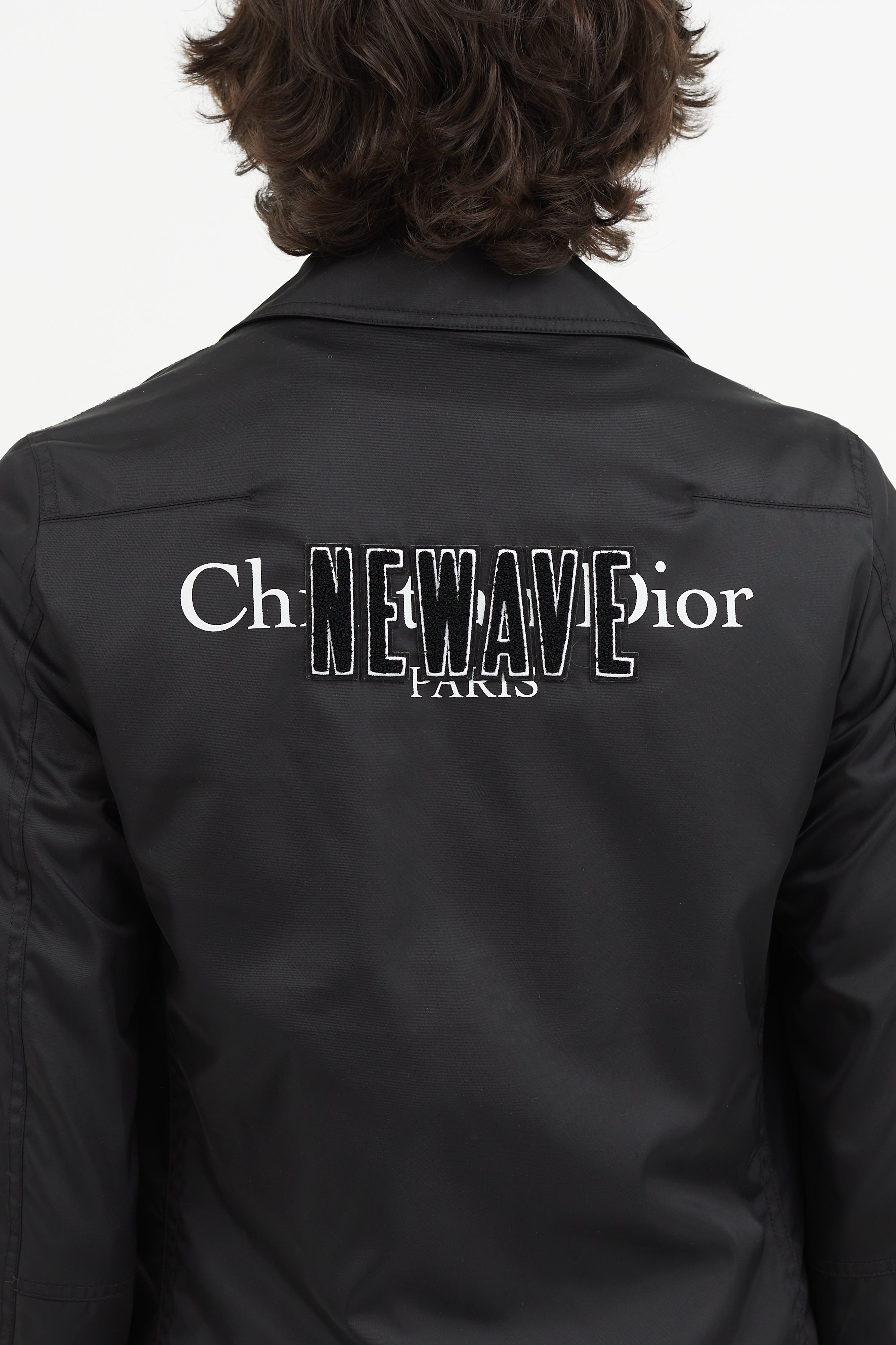 Pre-owned Dior black nylon jacket featuring a pointed collar, two buttoned slash pockets at hip, printed New Wave patch logo at back, and a snap button front. Lined.