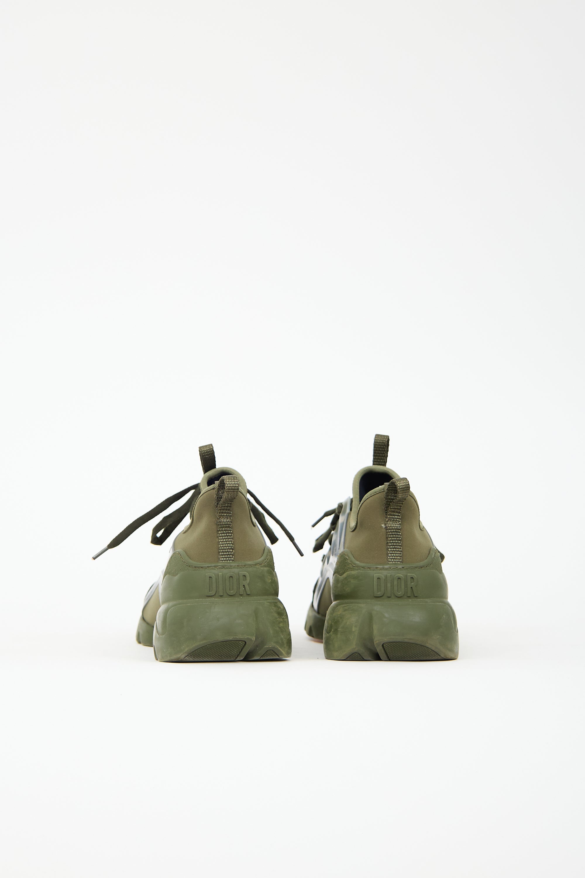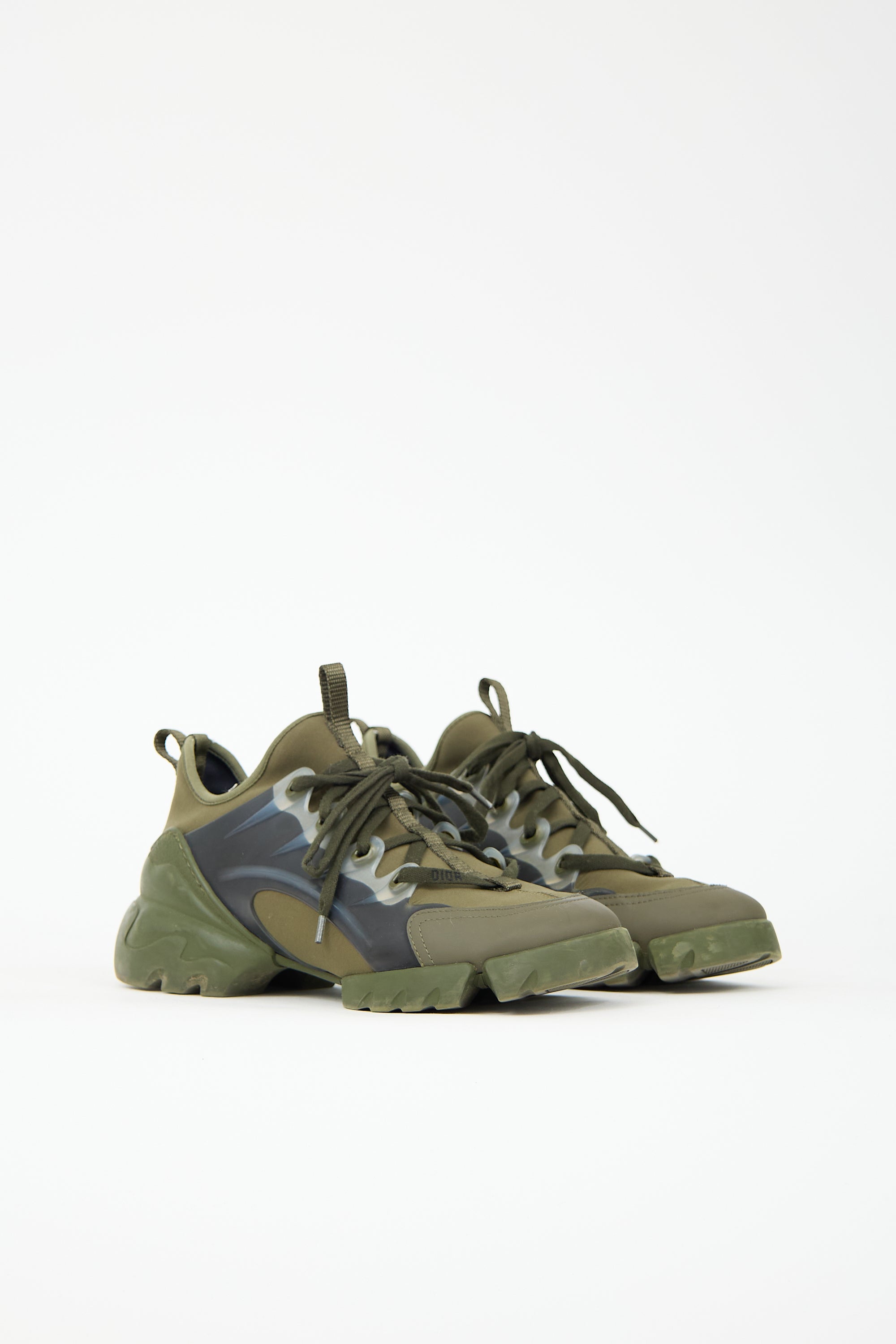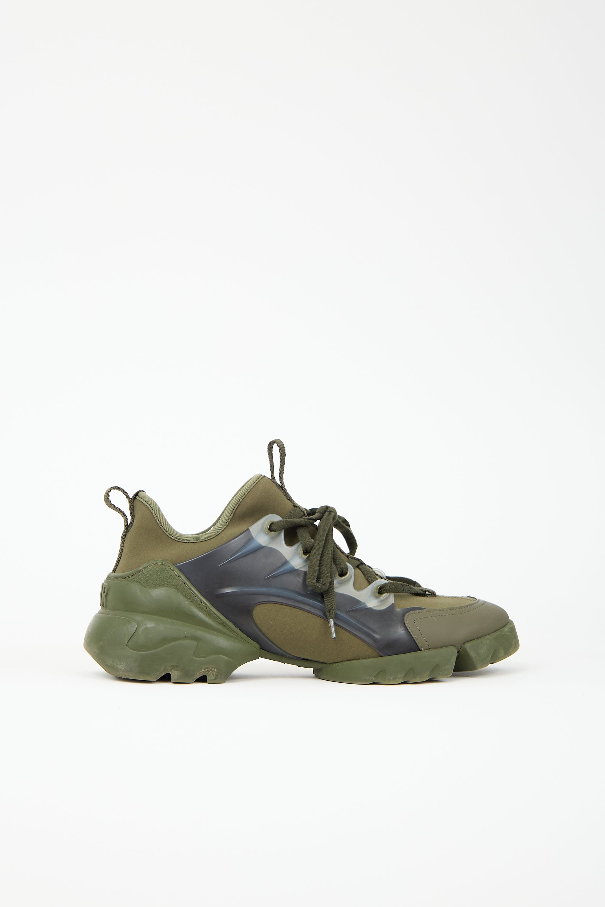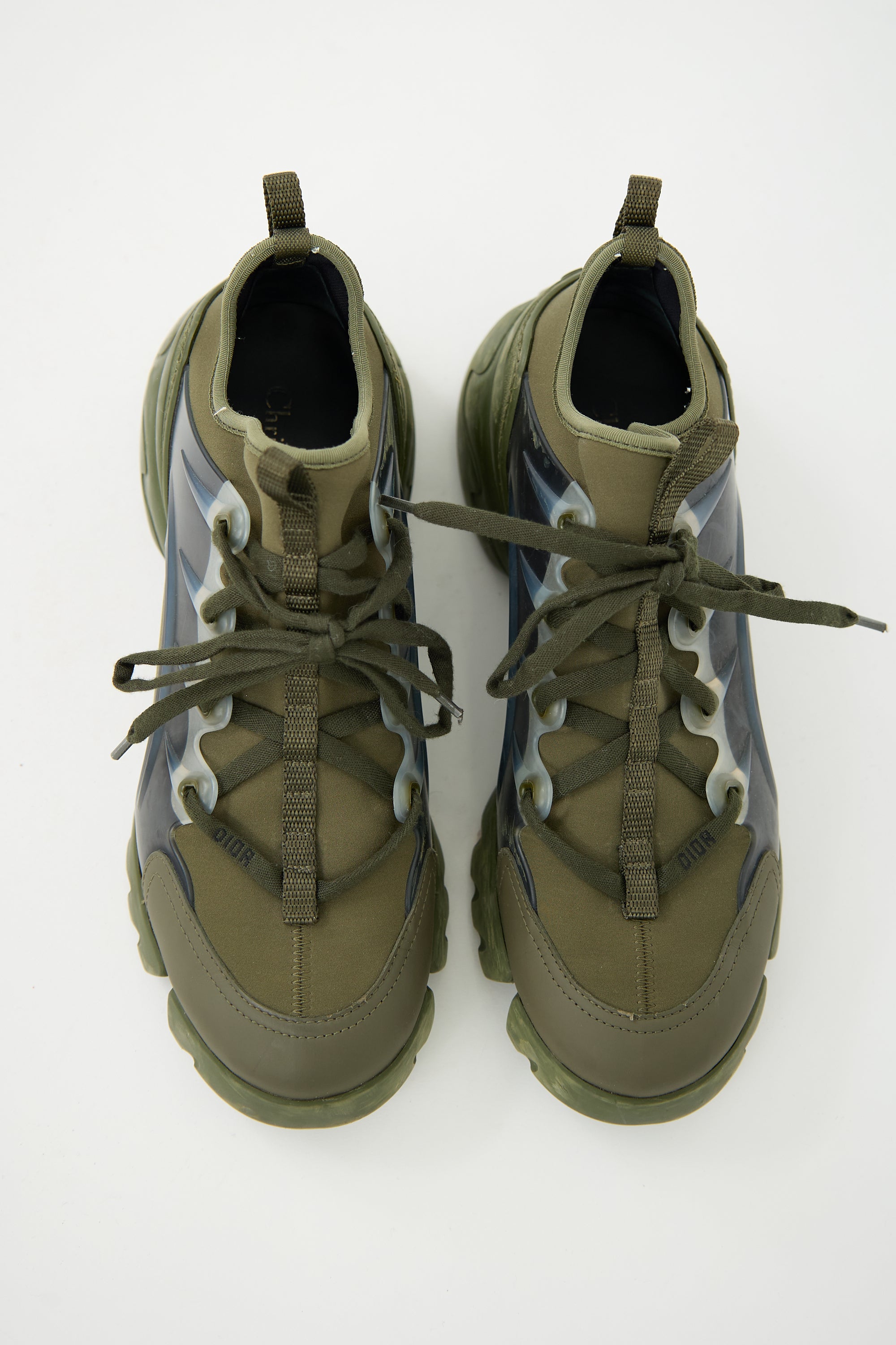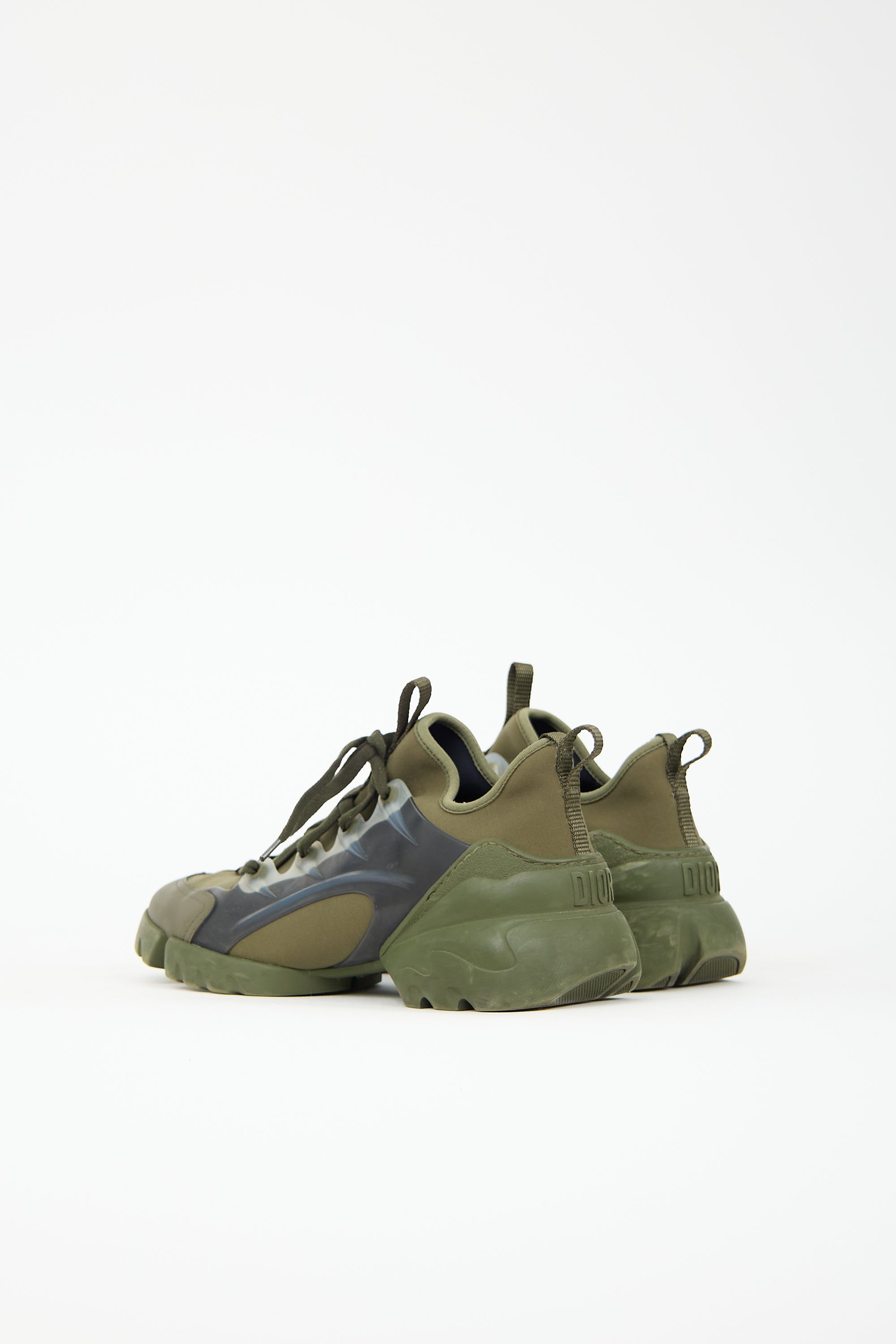 Pre-owned Dior green neoprene D-connect sneakers a rounded toe, lace up vamp with logo at front, black and grey rubber side panels, pull tab at tongue and heel, and a chunky rubber sole.