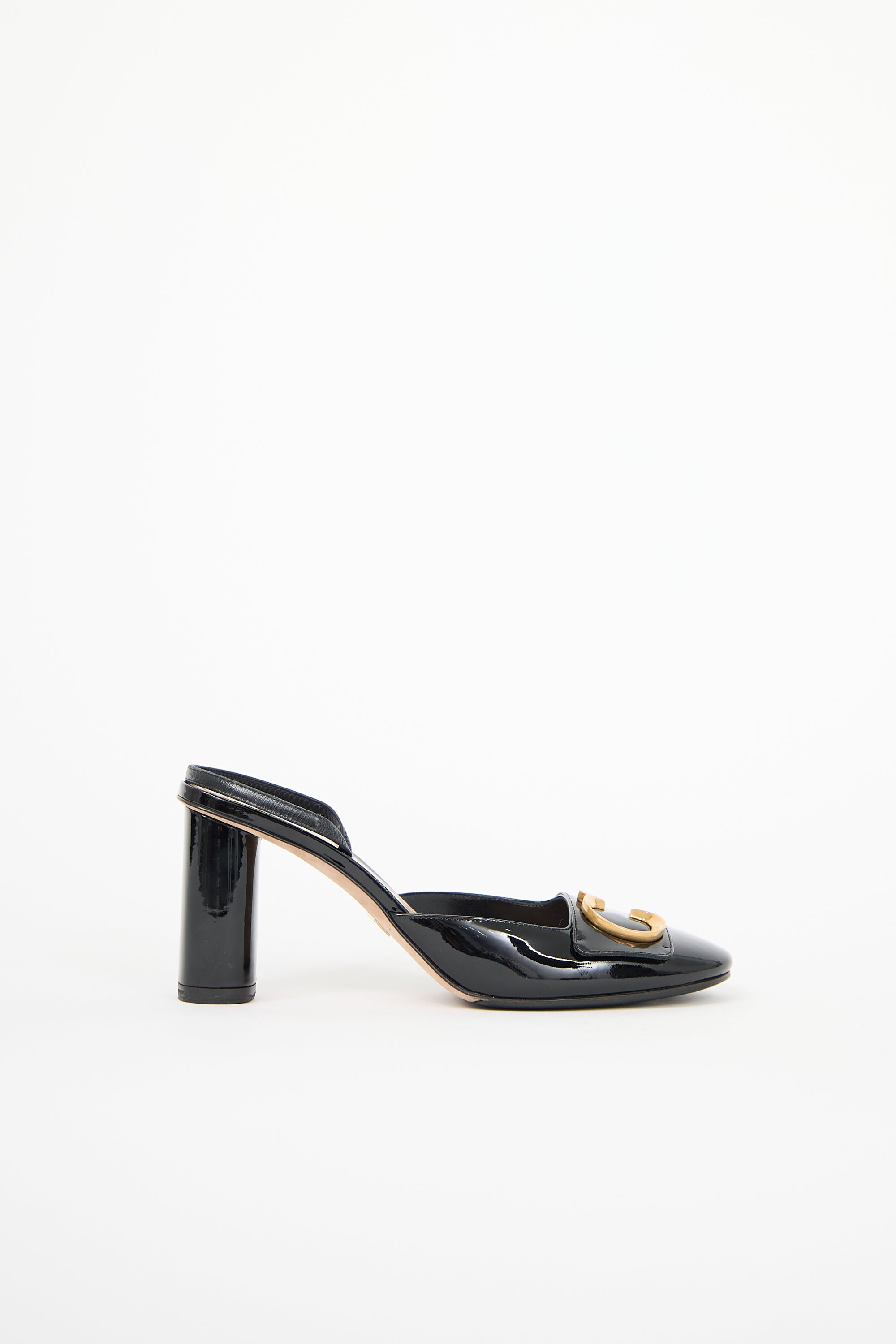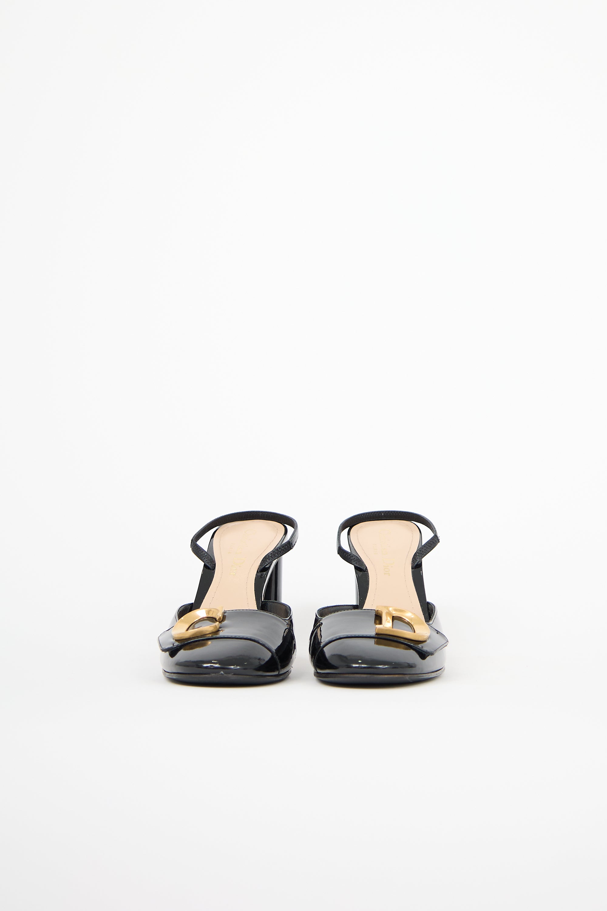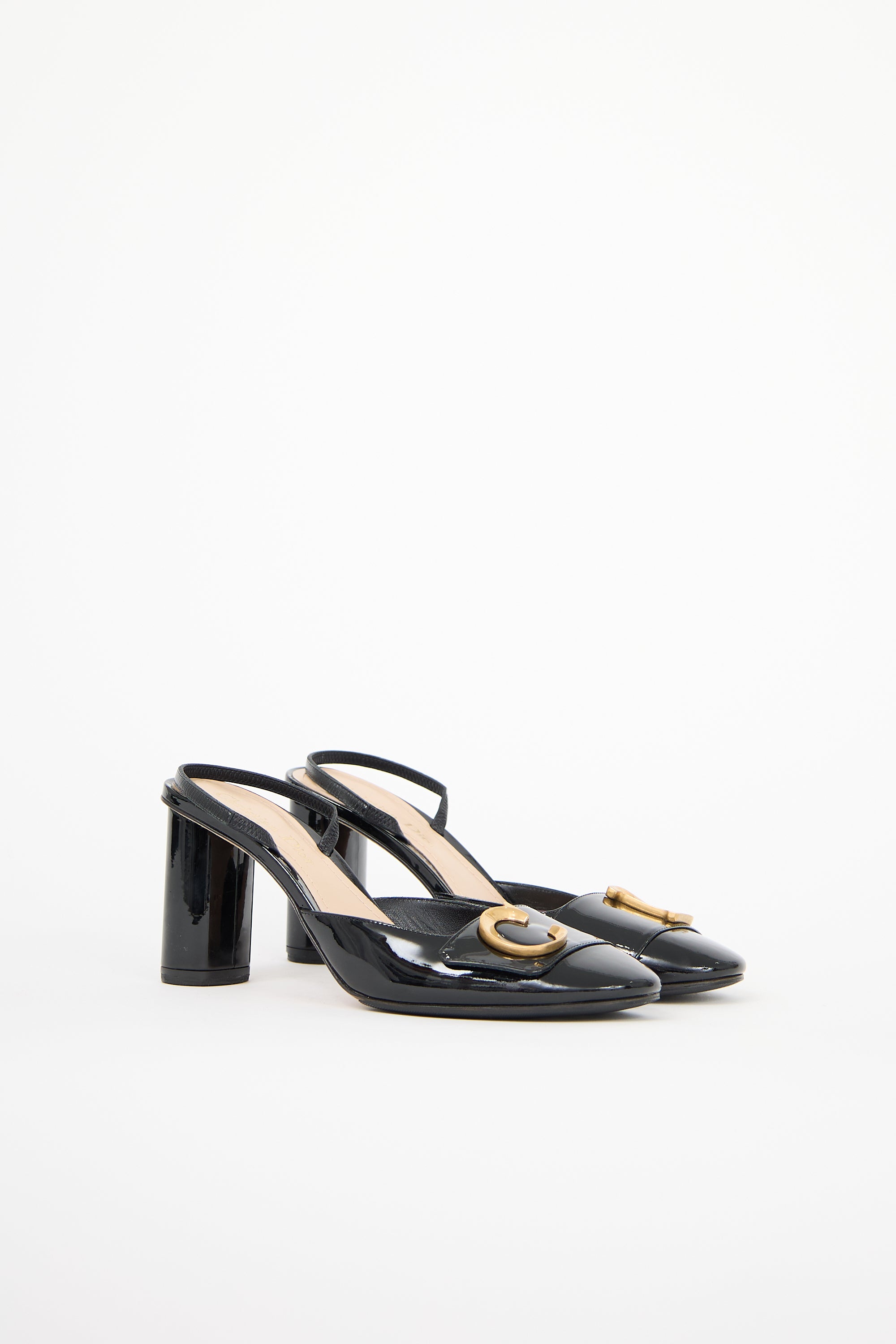 Pre-owned Dior black patent leather C'est Dior slingback pumps featuring rounded toe, gold tone CD logo hardware at vamp, and rounded block heel. Comes with original dust bags and box.