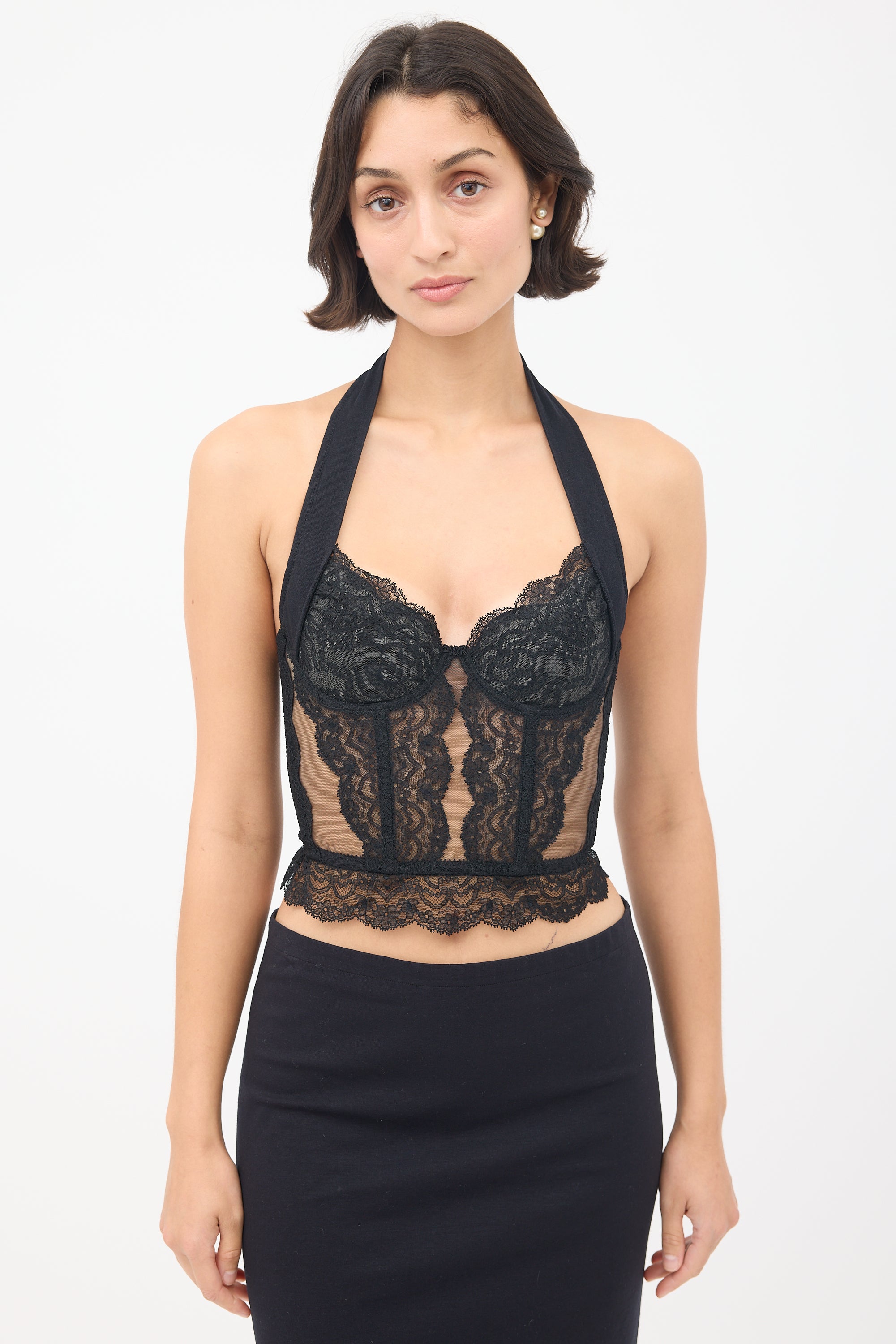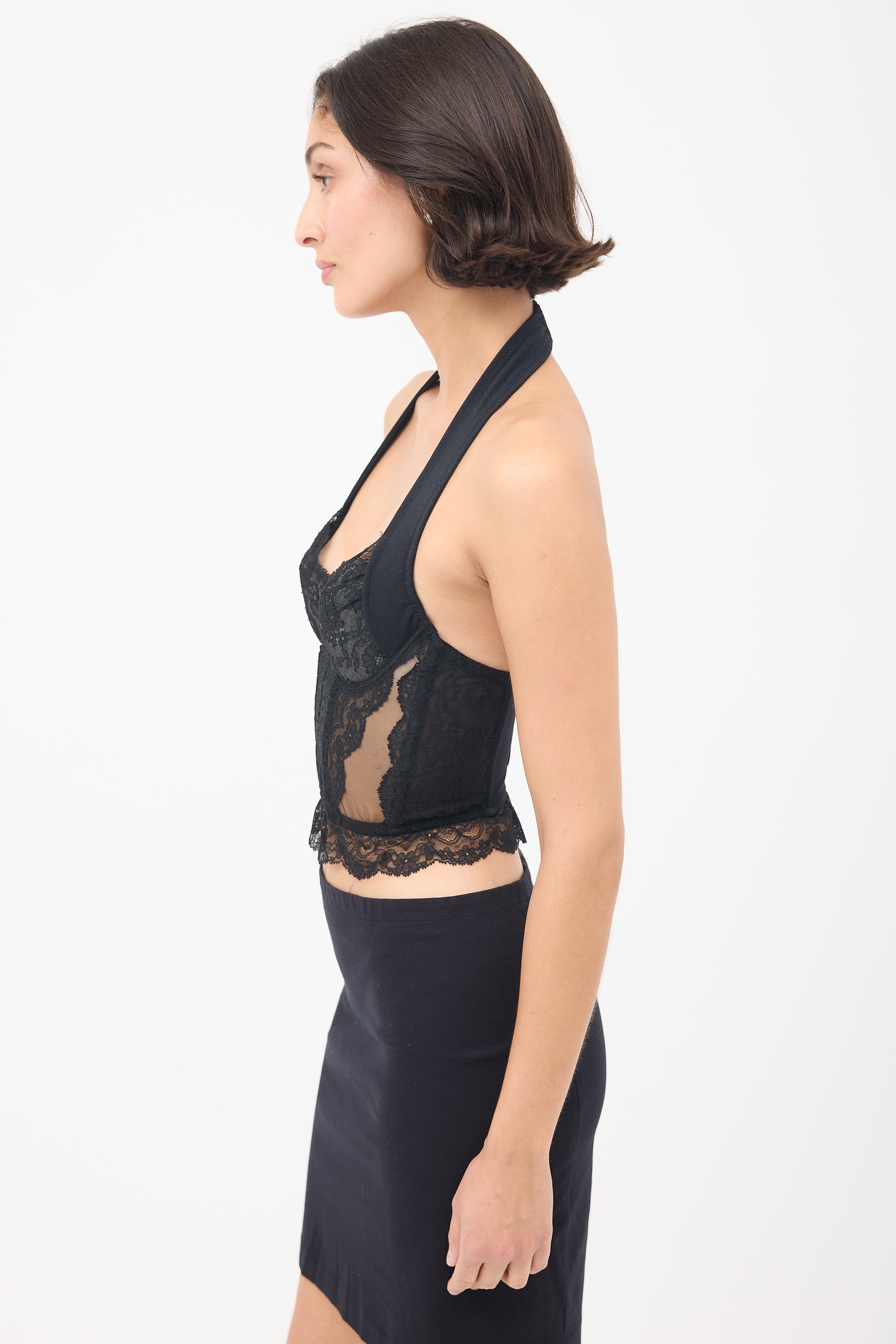 Pre-owned Christian Dior vintage black bustier top featuring an adjustable halter neck, floral lace panelled construction, embroidered logo at centre front chest, underwire and boning throughout, hook and eye back fastenings, and ruffle trim. John Galliano era design.