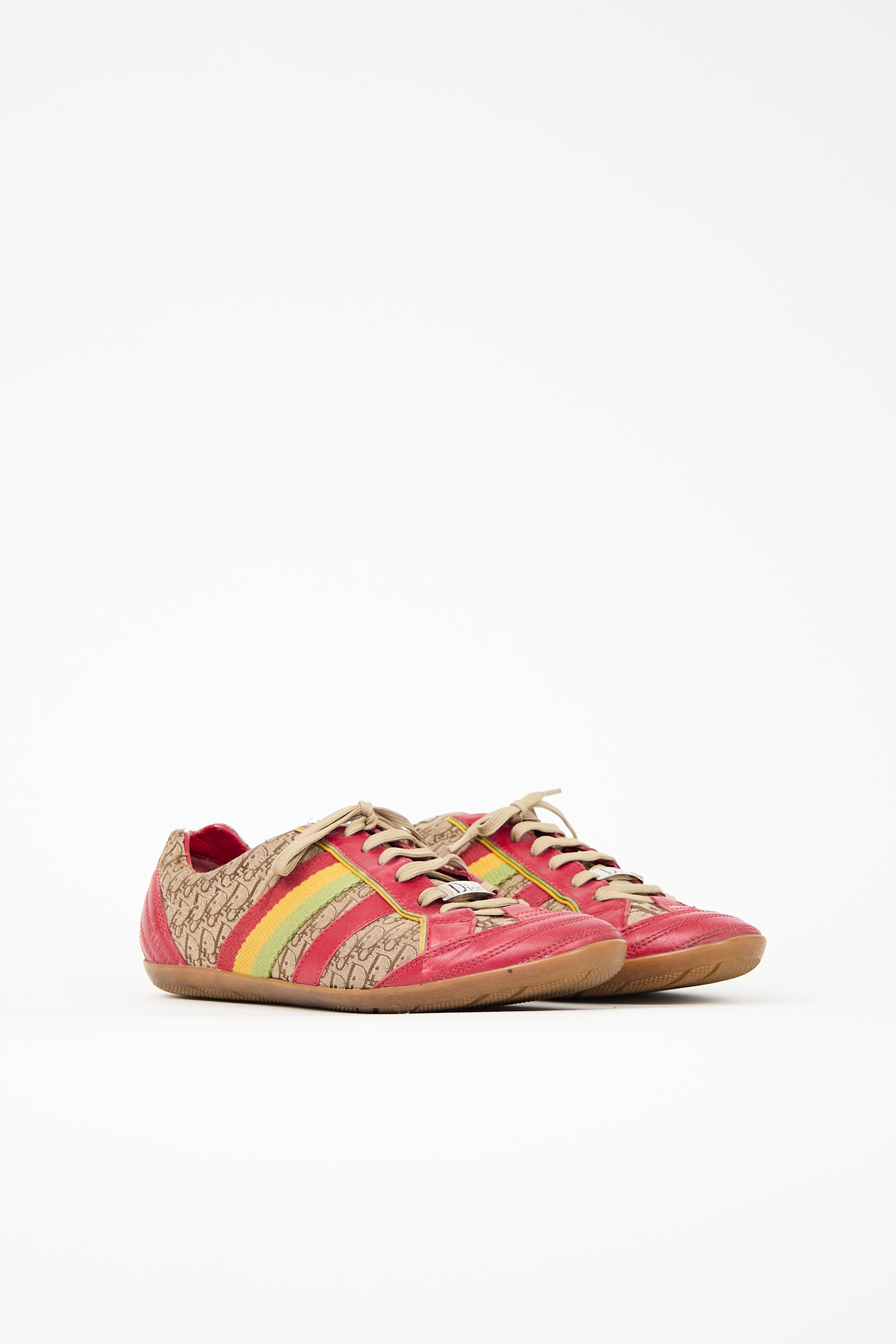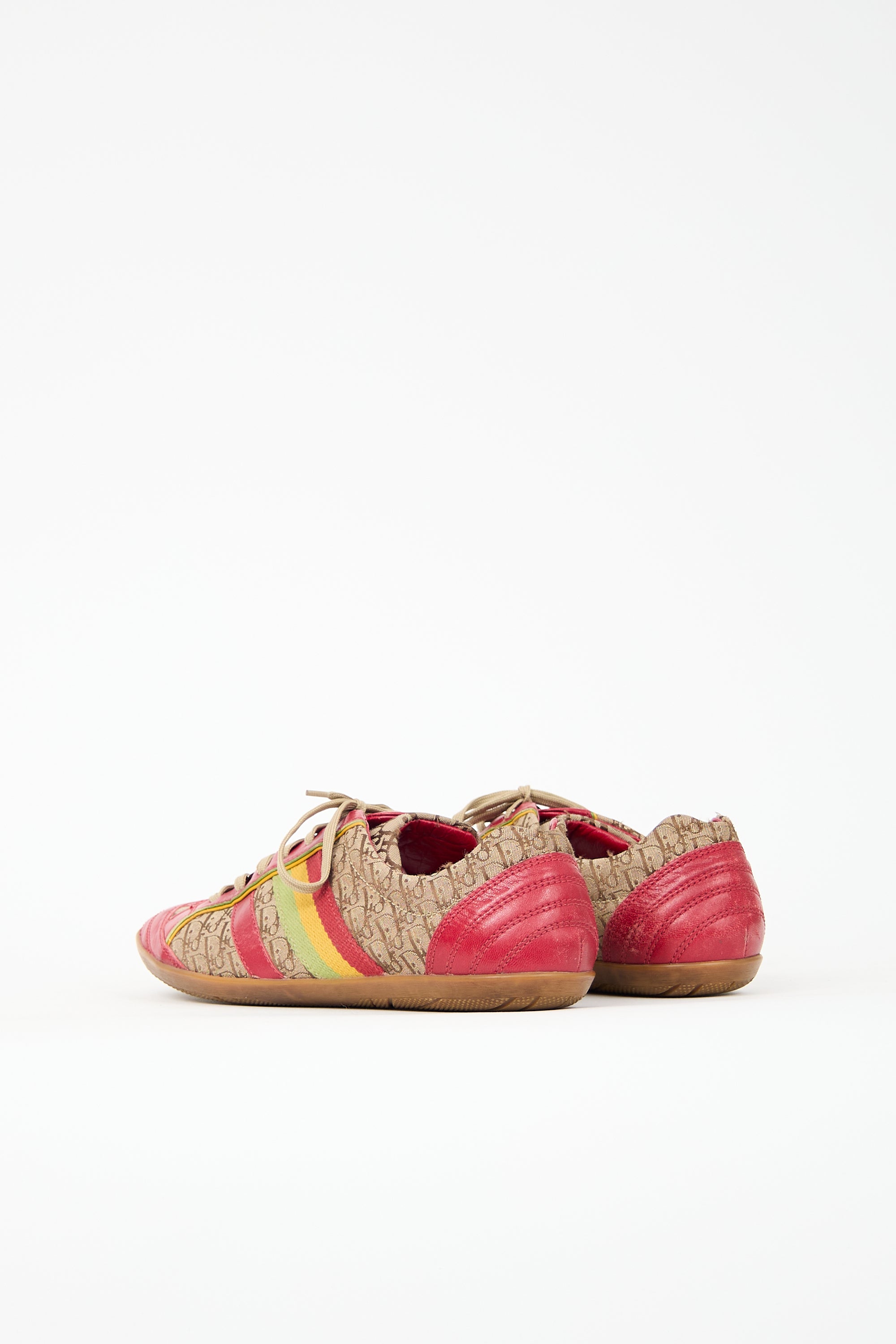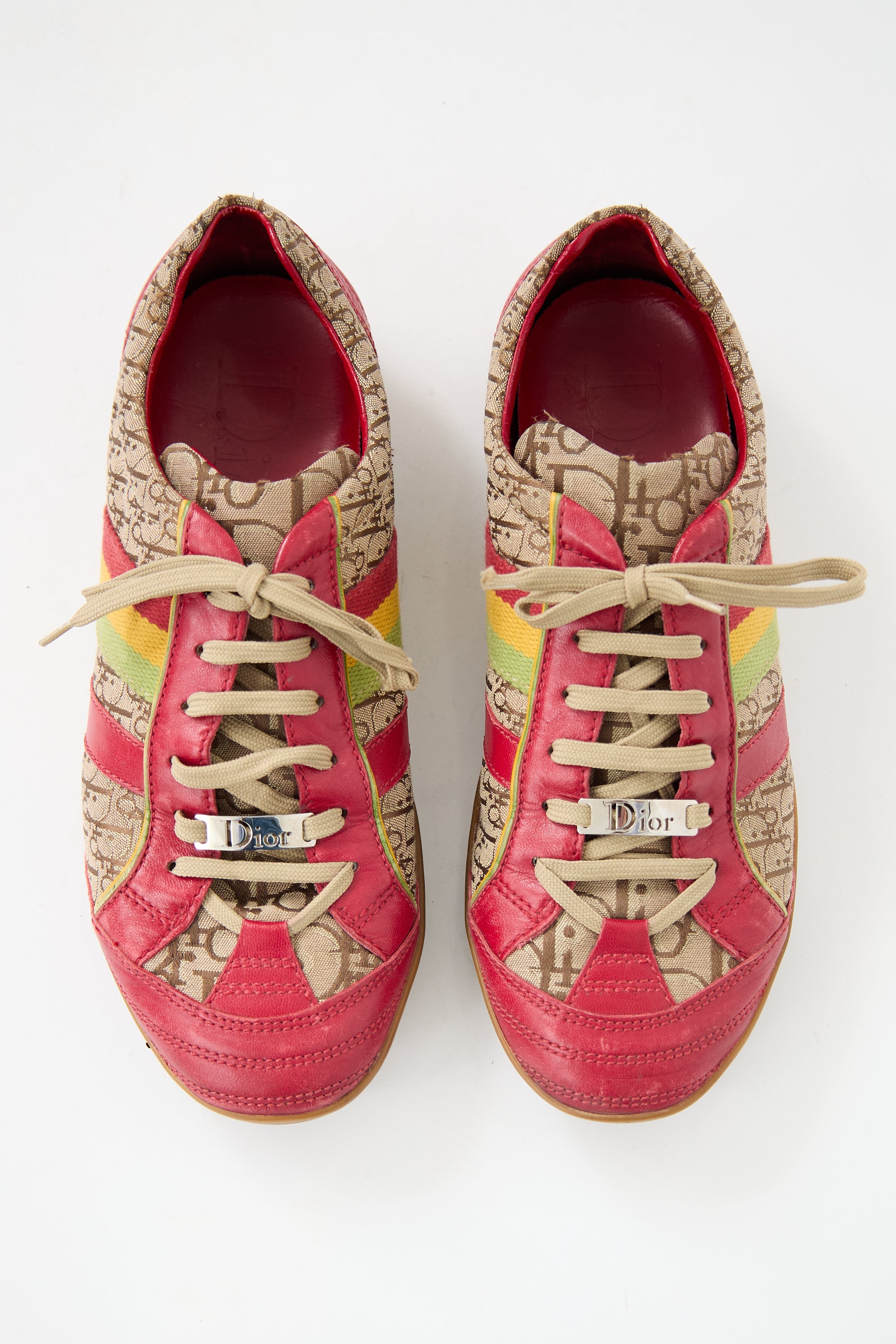 Pre-owned Christian Dior vintage sneakers featuring a rounded toe, brown Diorissimo monogram canvas and red leather upper, silver tone cutout logo tab at vamp, lace up front, multicolour webbing at sides, and rubber gum sole. c. 2004.