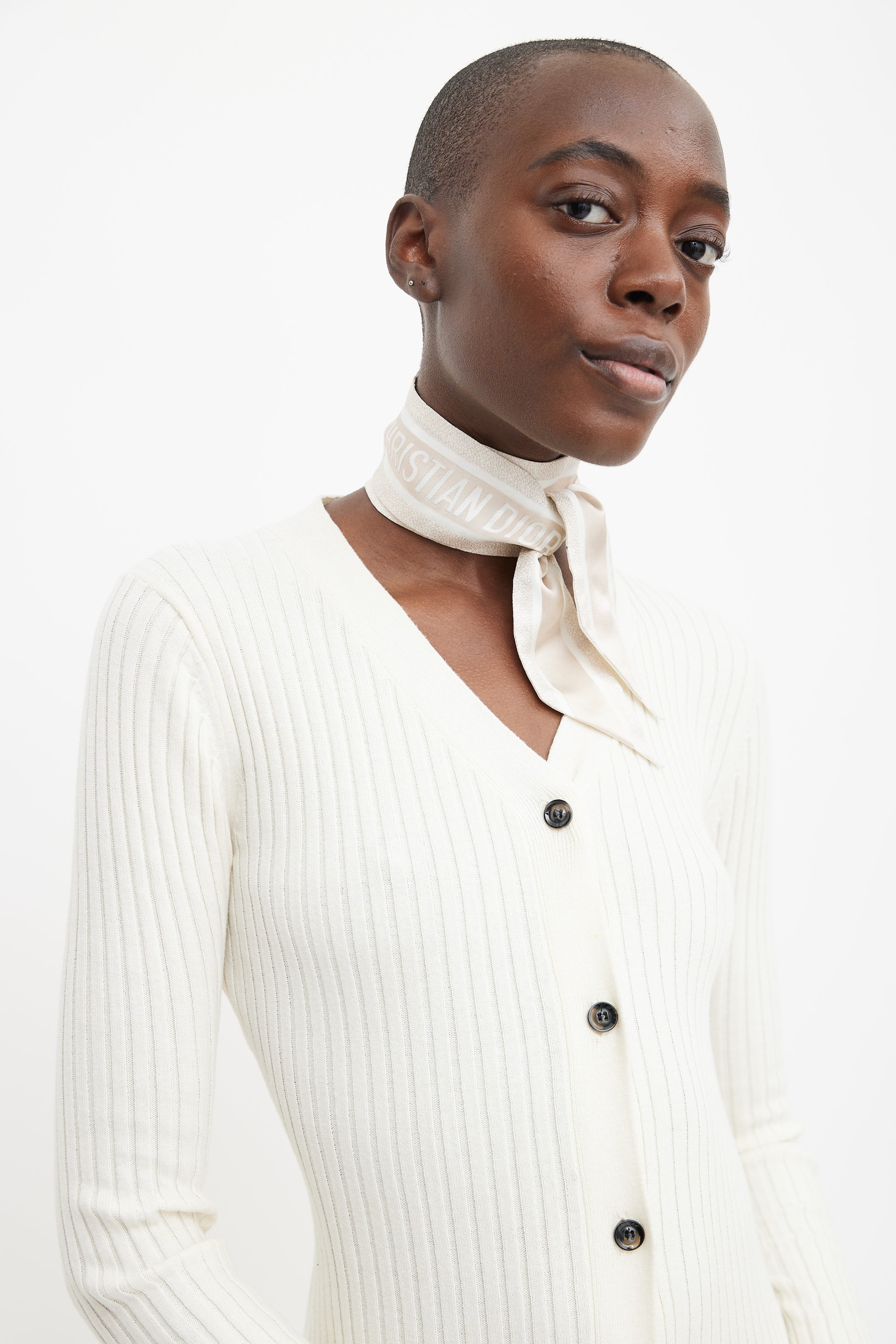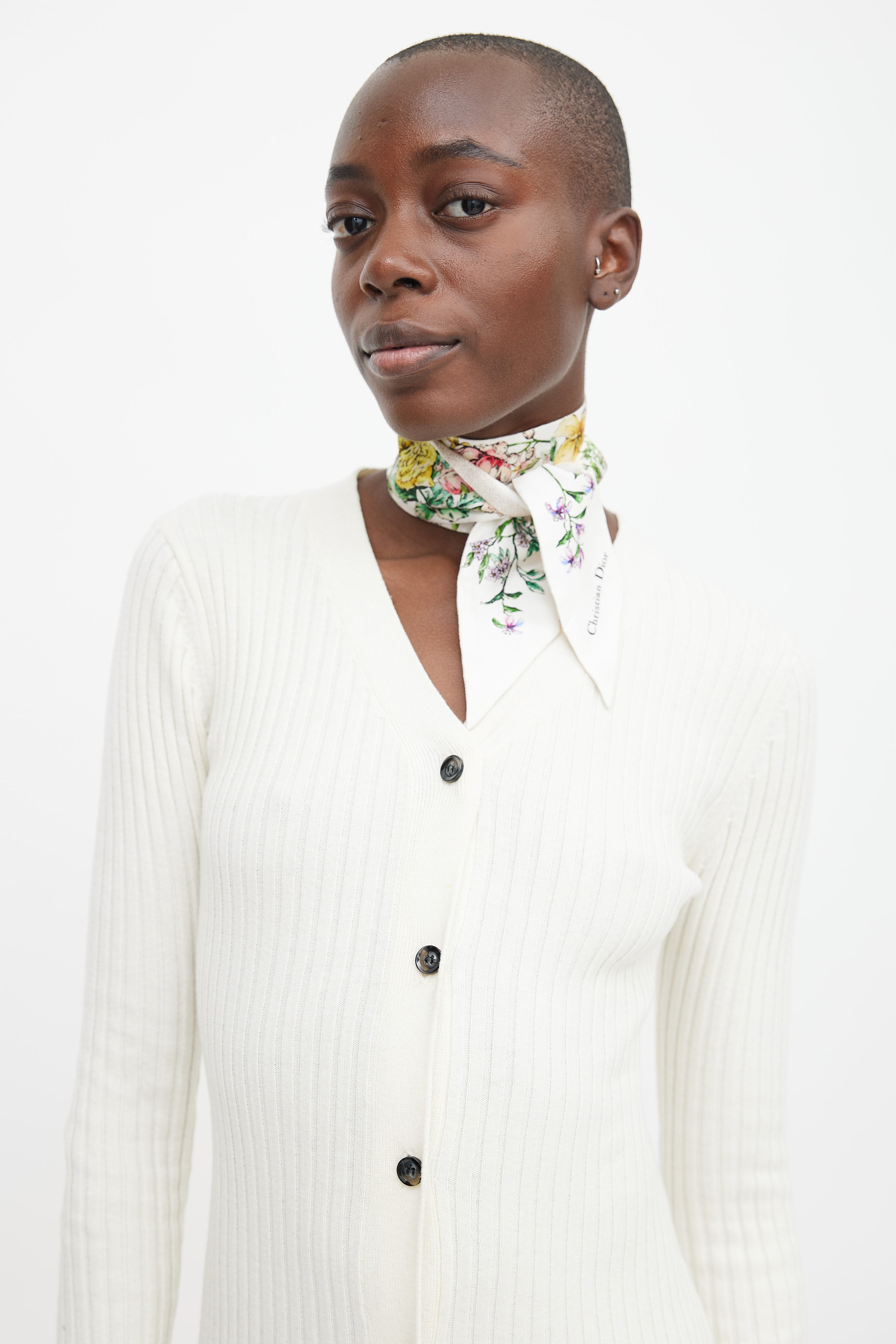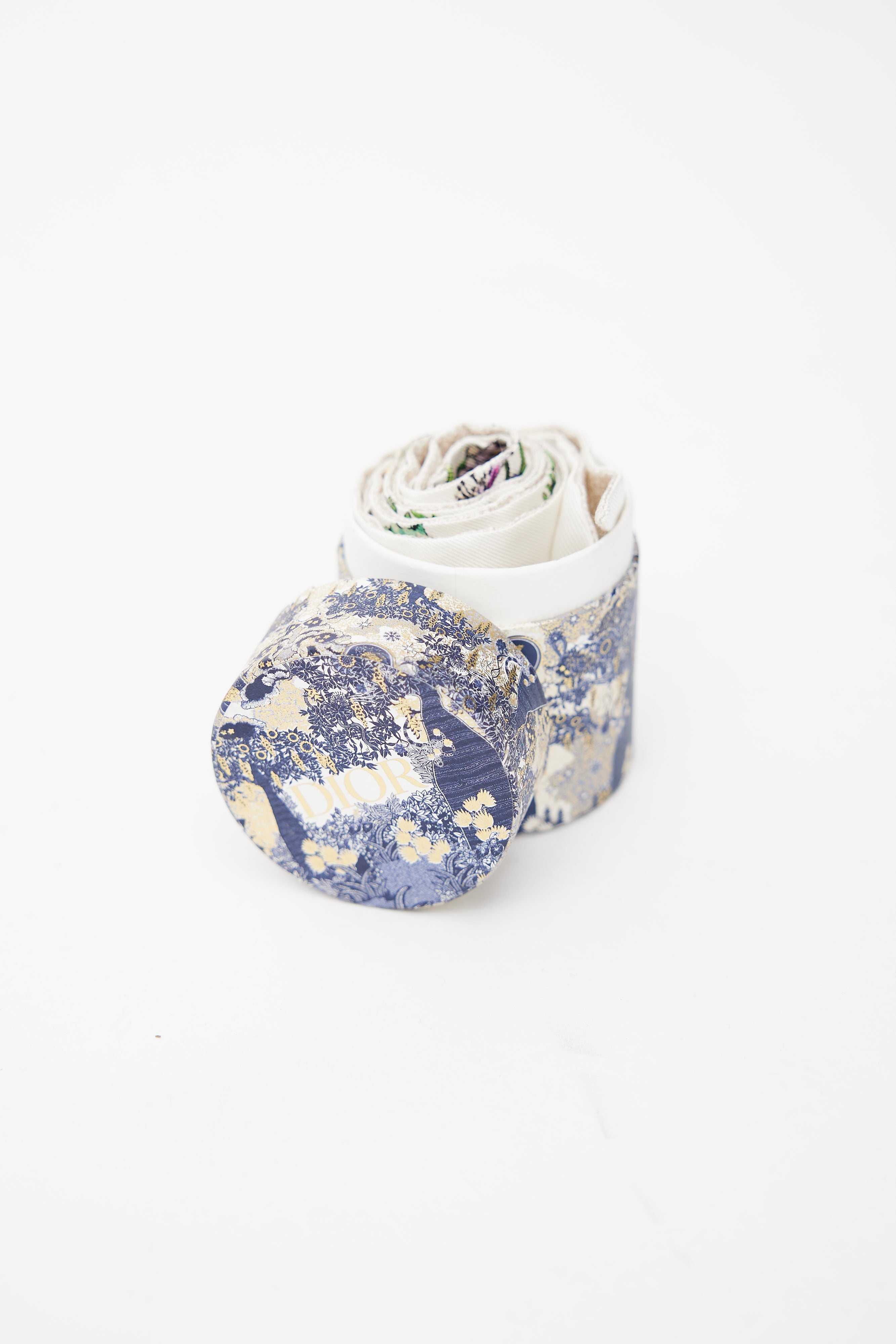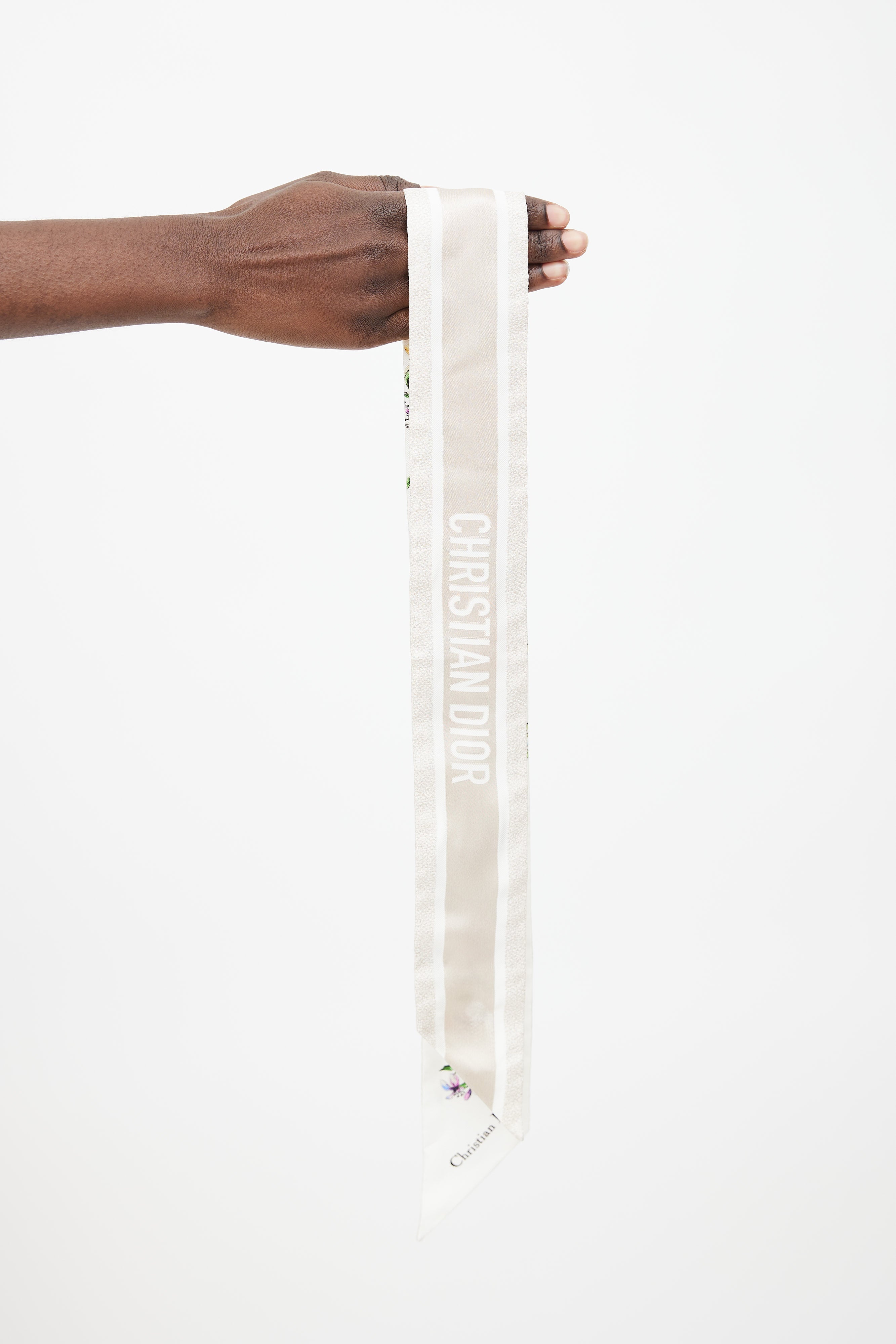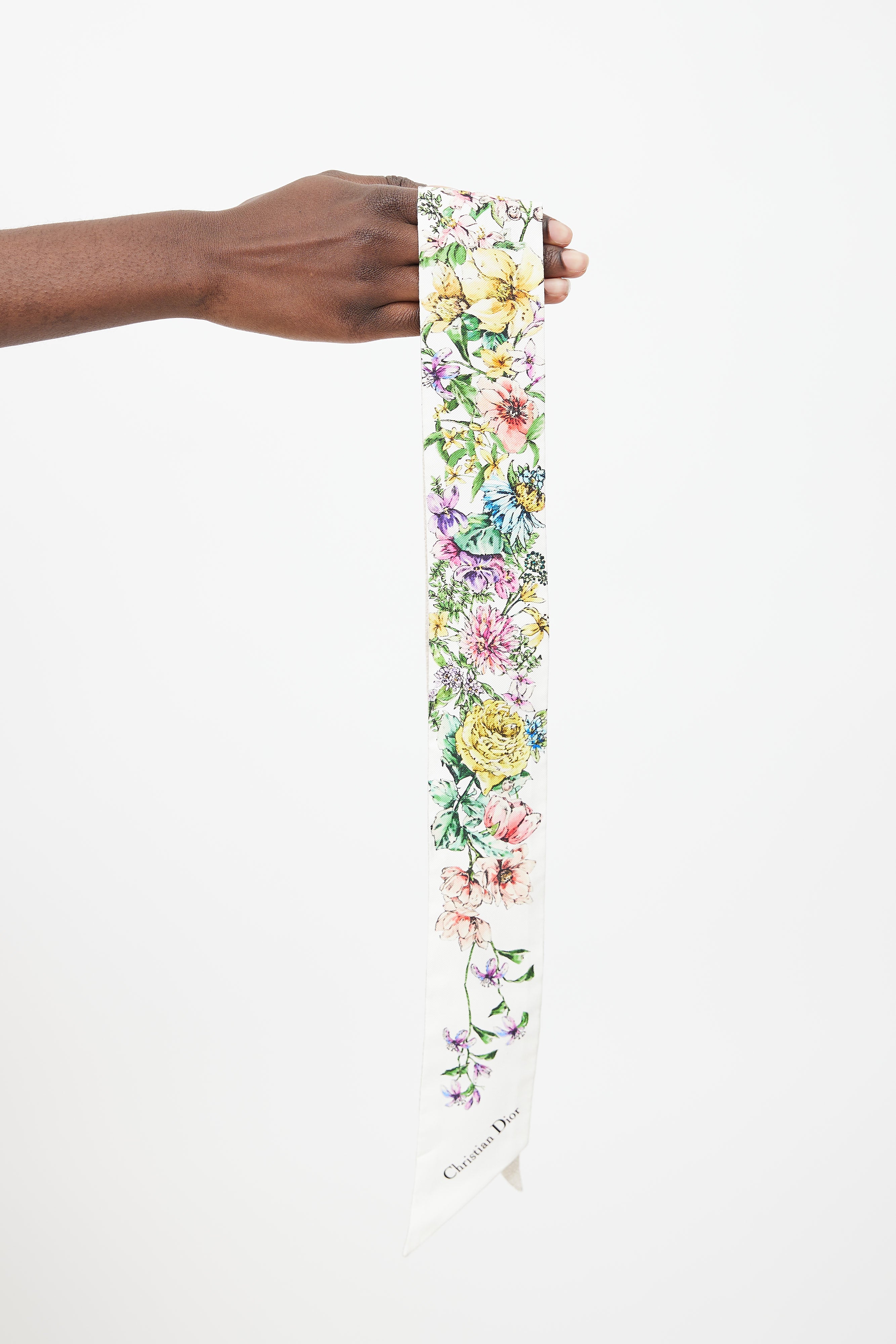Pre-owned Dior white D-Floral Mitzah twilly featuring multicolour floral print, pointed ends, and logo signature jacquard band at back. Comes with original box.