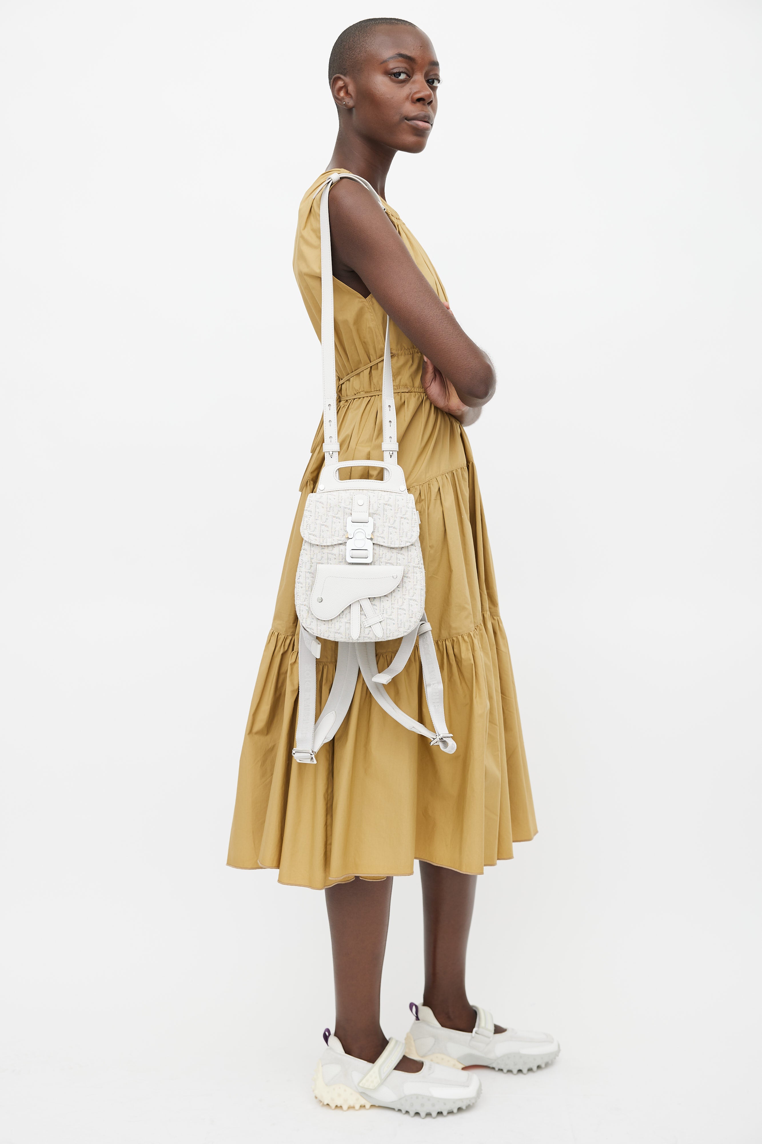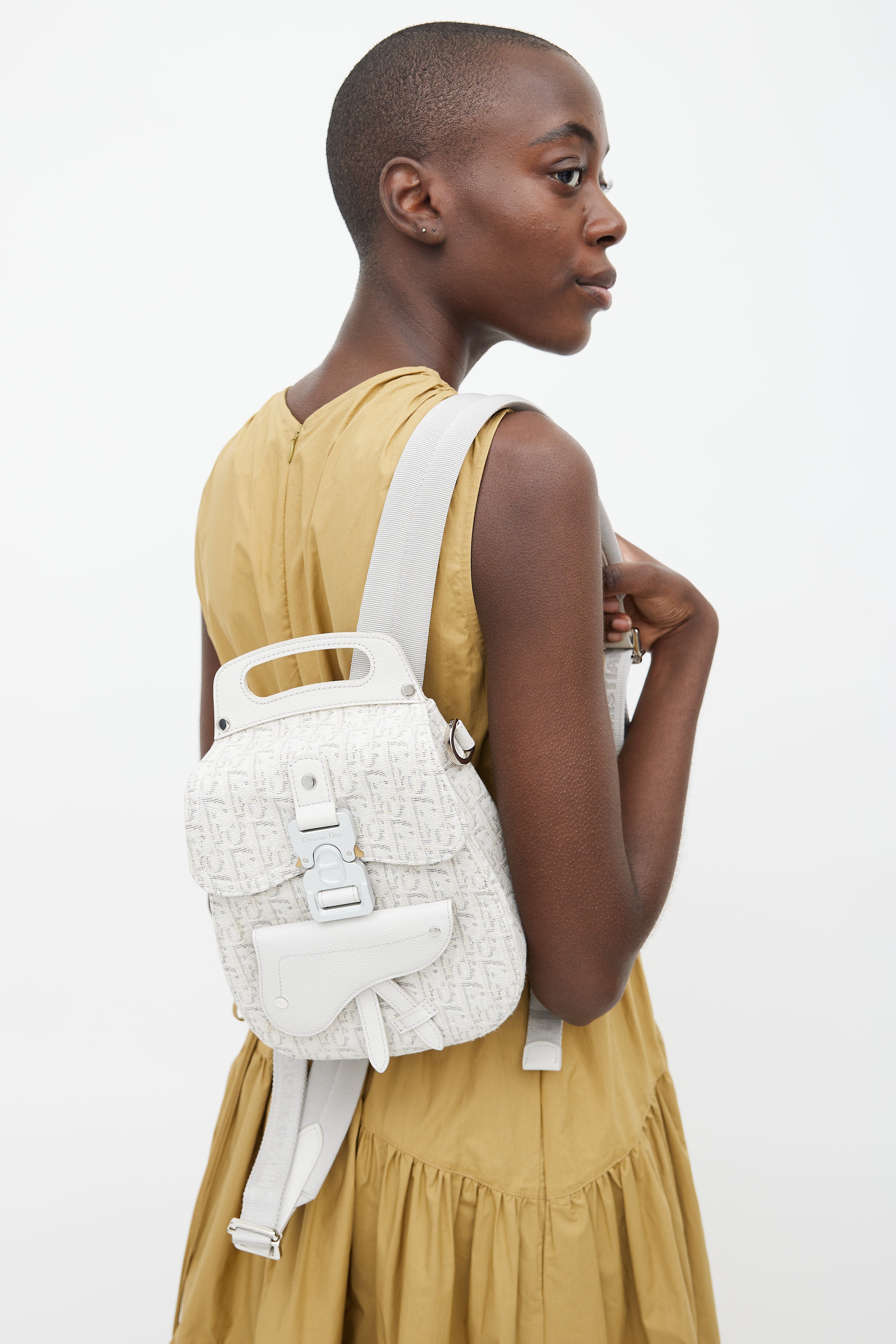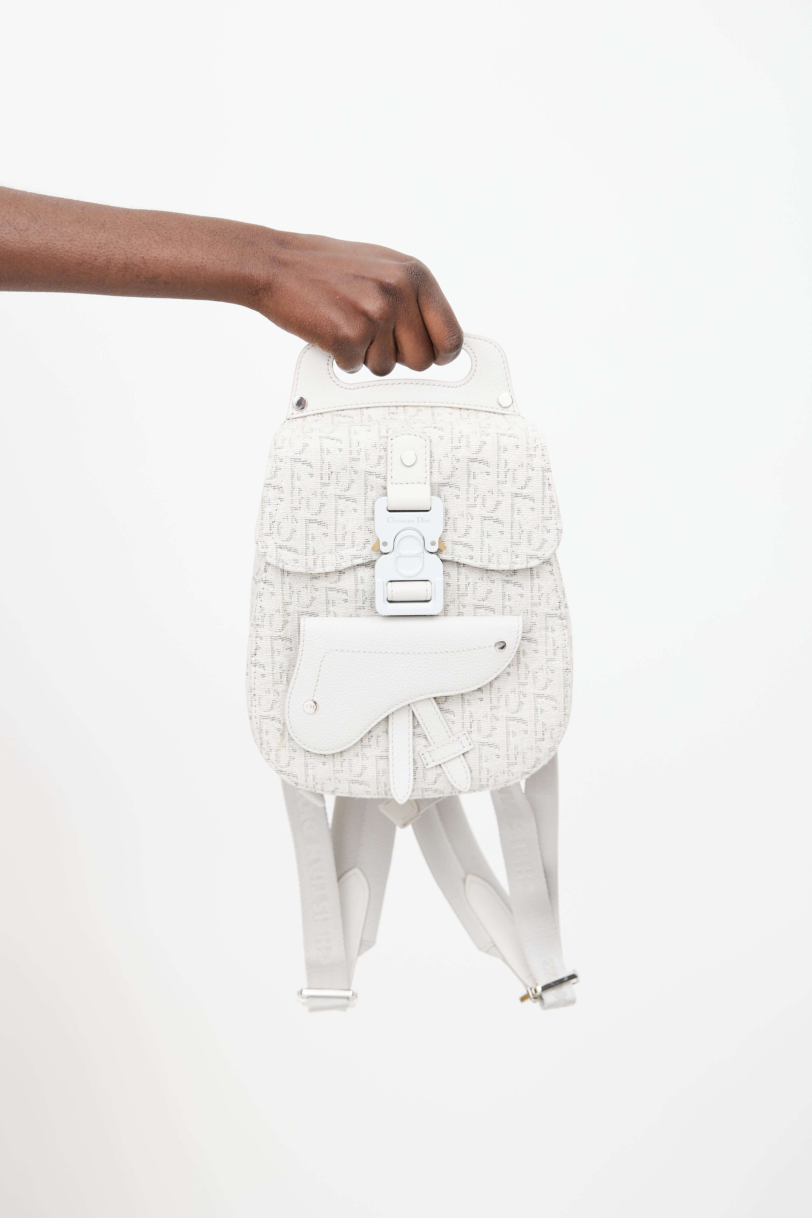 Pre-owned Dior white mini Saddle backpack featuring Oblique Canvas, grey leather trim, fixed top handle, adjustable shoulder straps, silver tone CD buckle closure, exterior zip pocket with saddle flap, lined main compartment, interior slip pocket, adjustable shoulder straps, and detachable leather strap. Comes with original dust bag. From Homme collection by Kim Jones.