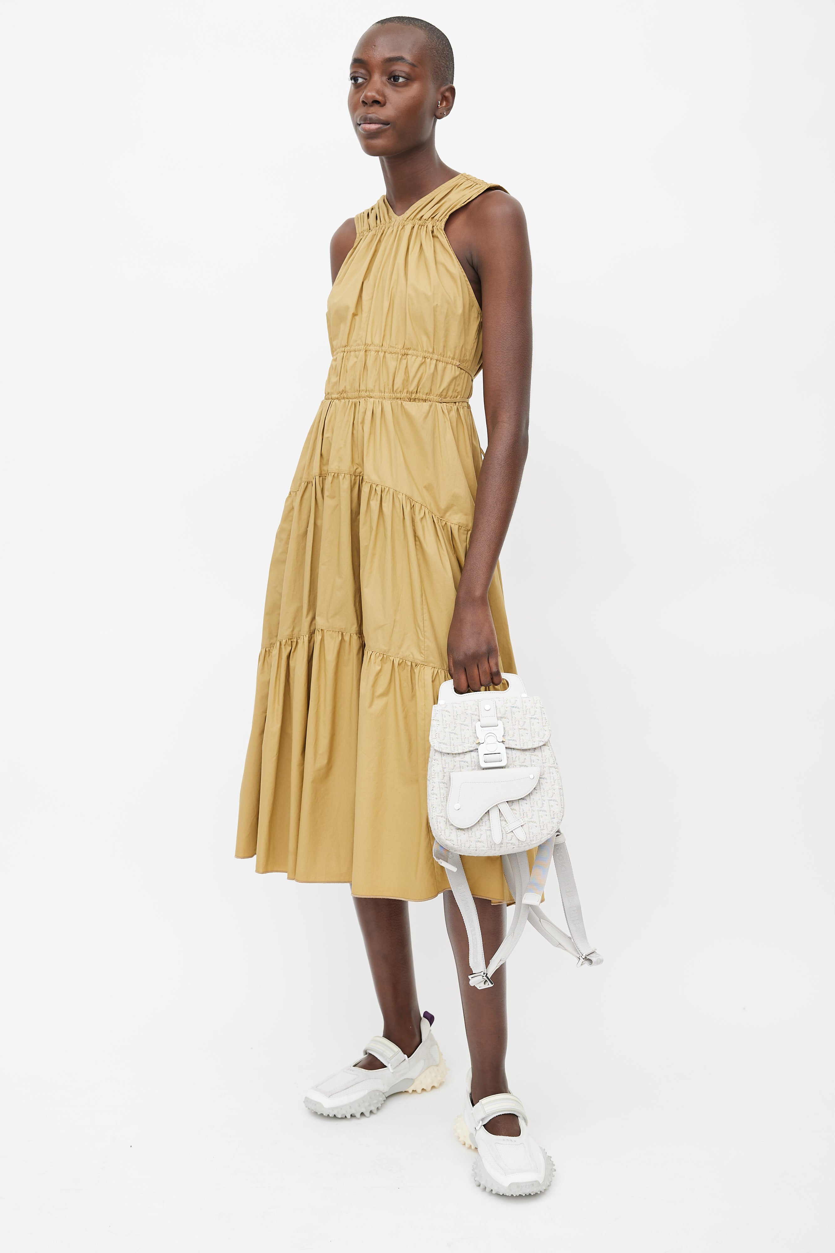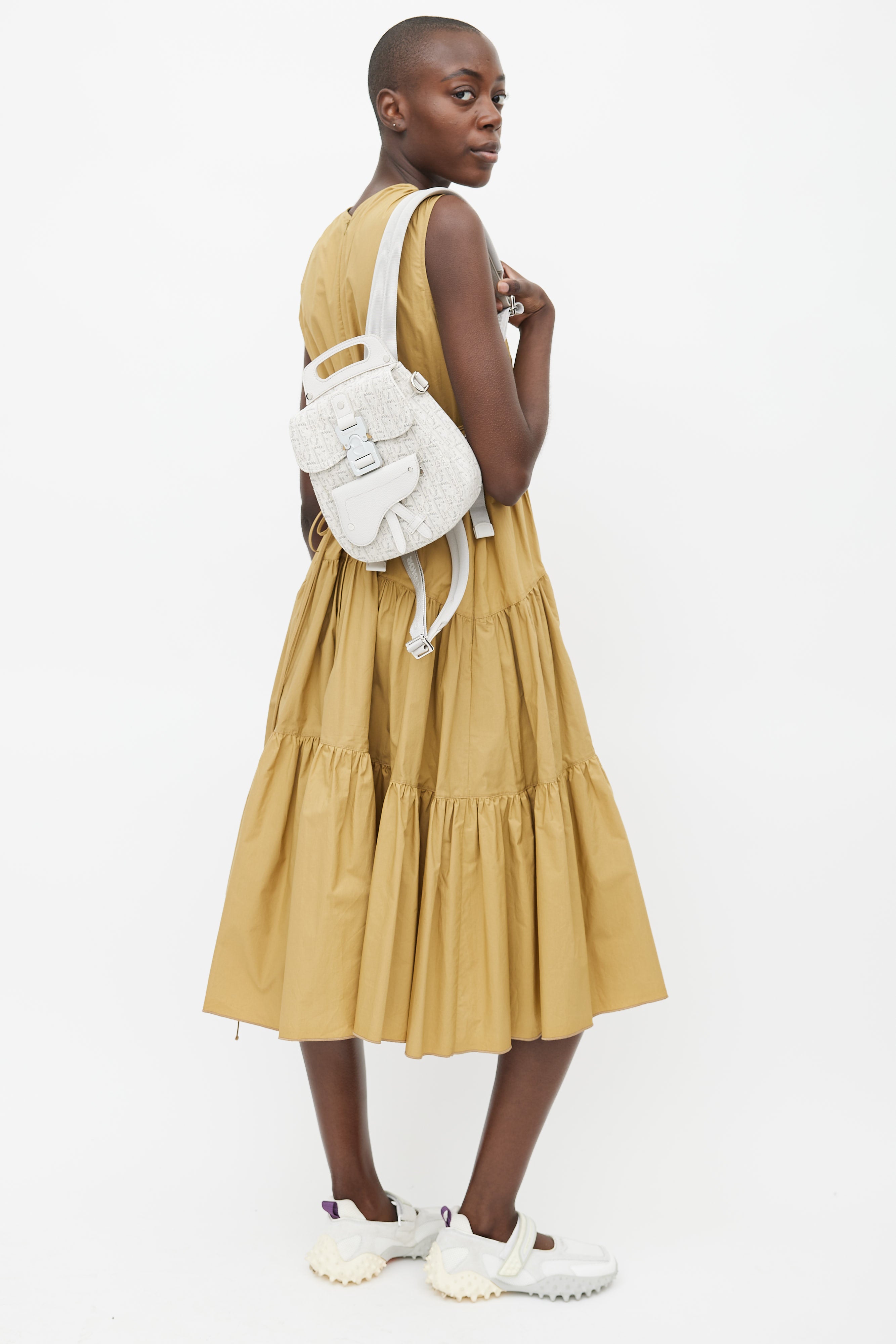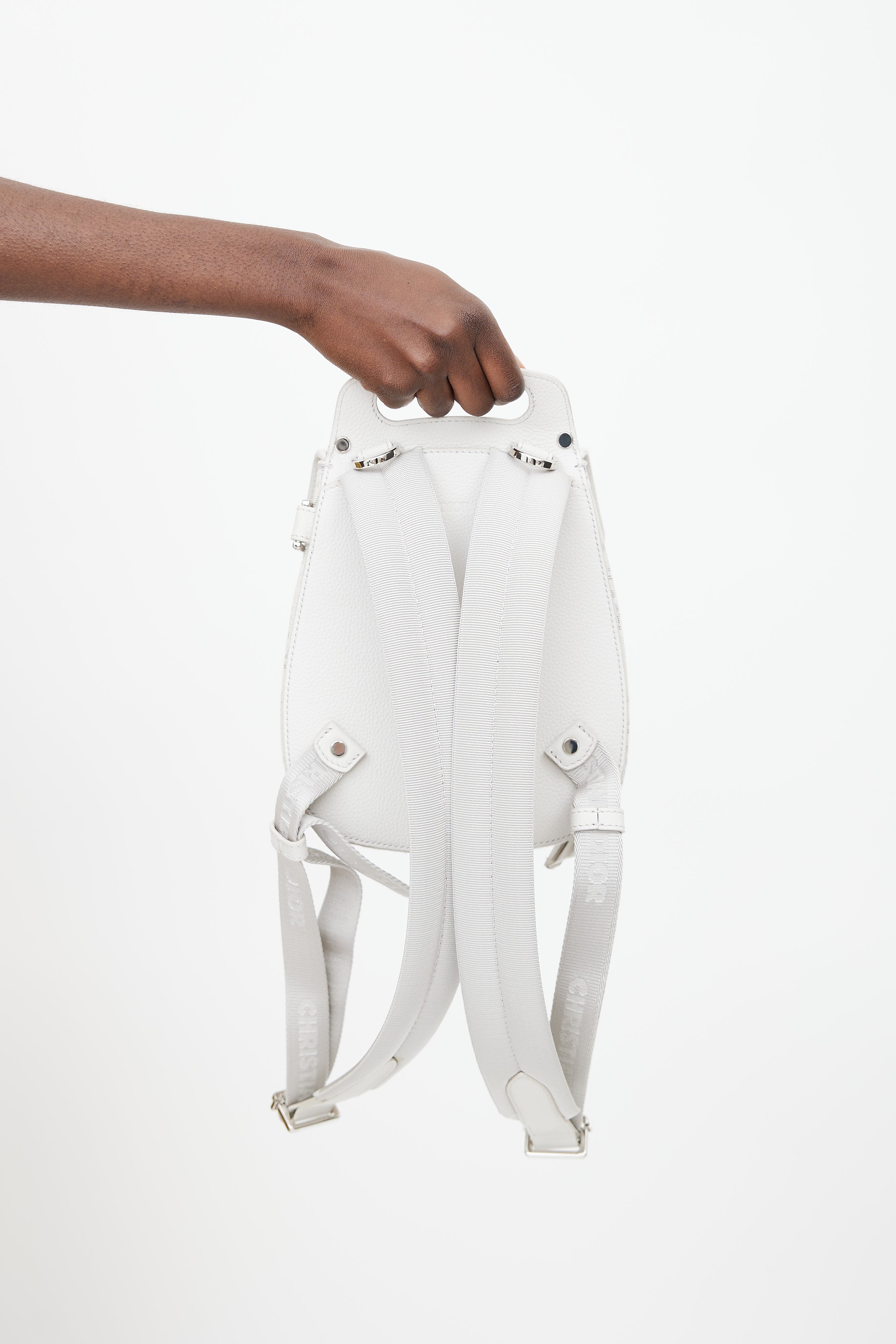 Pre-owned Dior white mini Saddle backpack featuring Oblique Canvas, grey leather trim, fixed top handle, adjustable shoulder straps, silver tone CD buckle closure, exterior zip pocket with saddle flap, lined main compartment, interior slip pocket, adjustable shoulder straps, and detachable leather strap. Comes with original dust bag. From Homme collection by Kim Jones.
