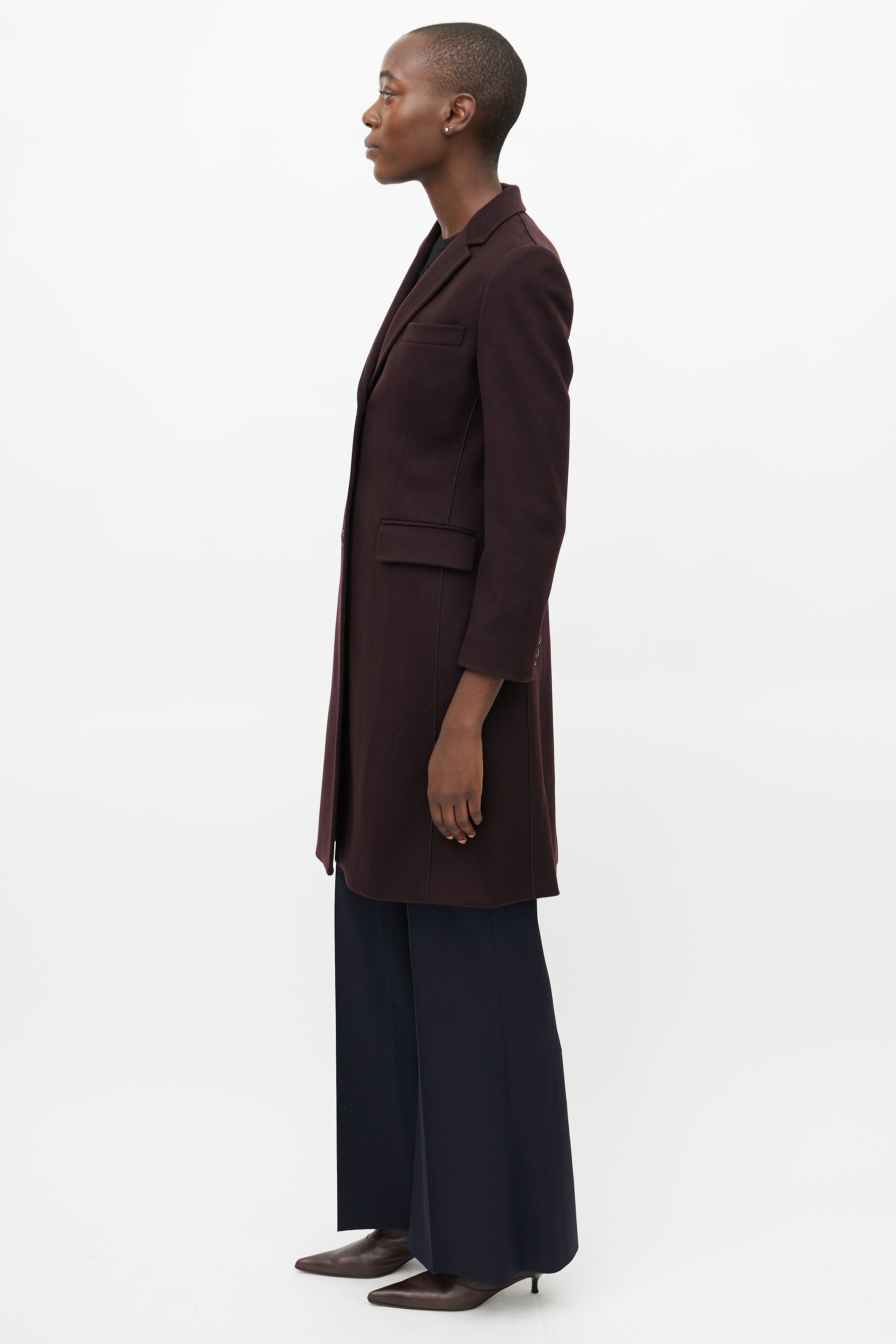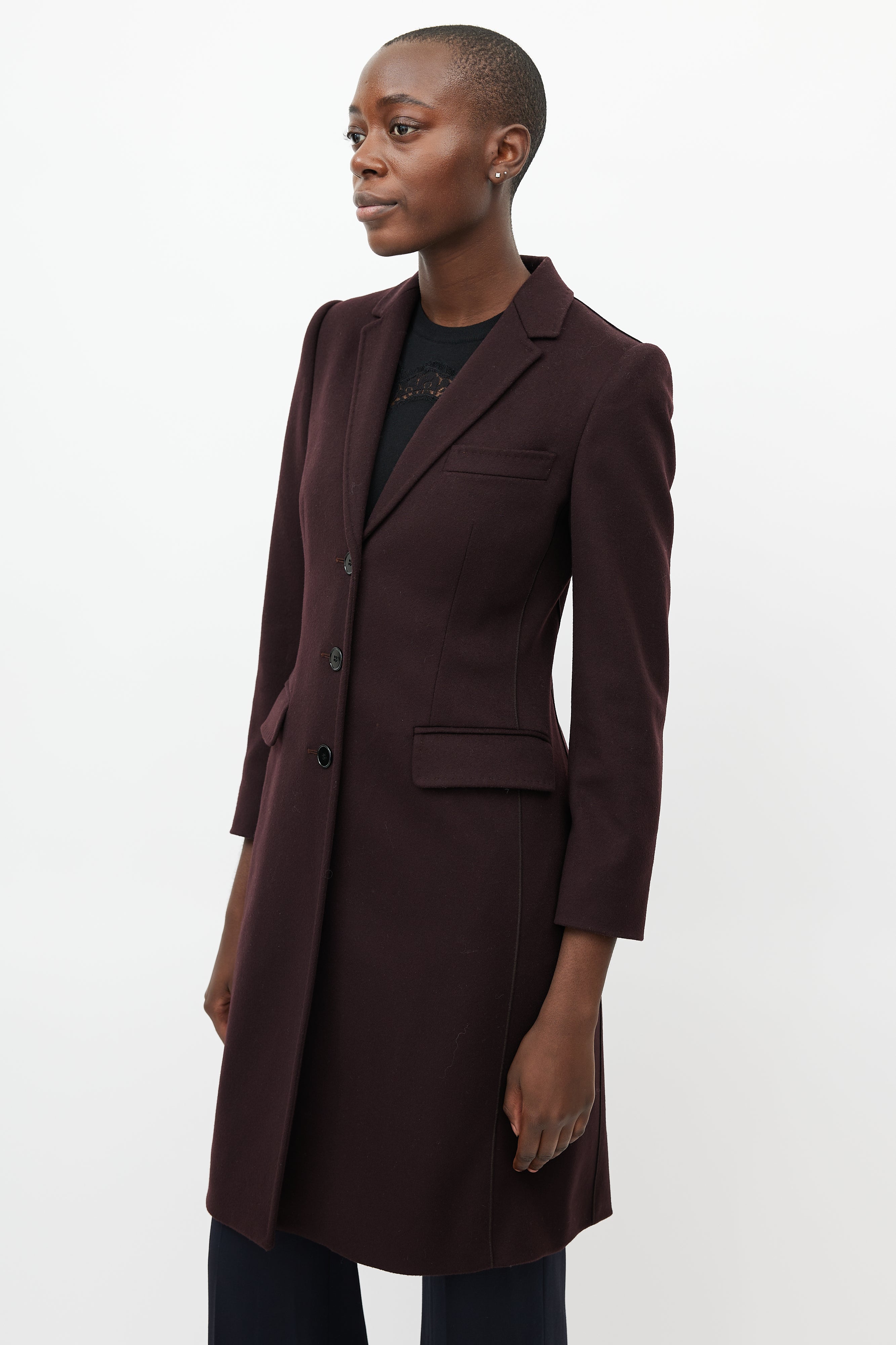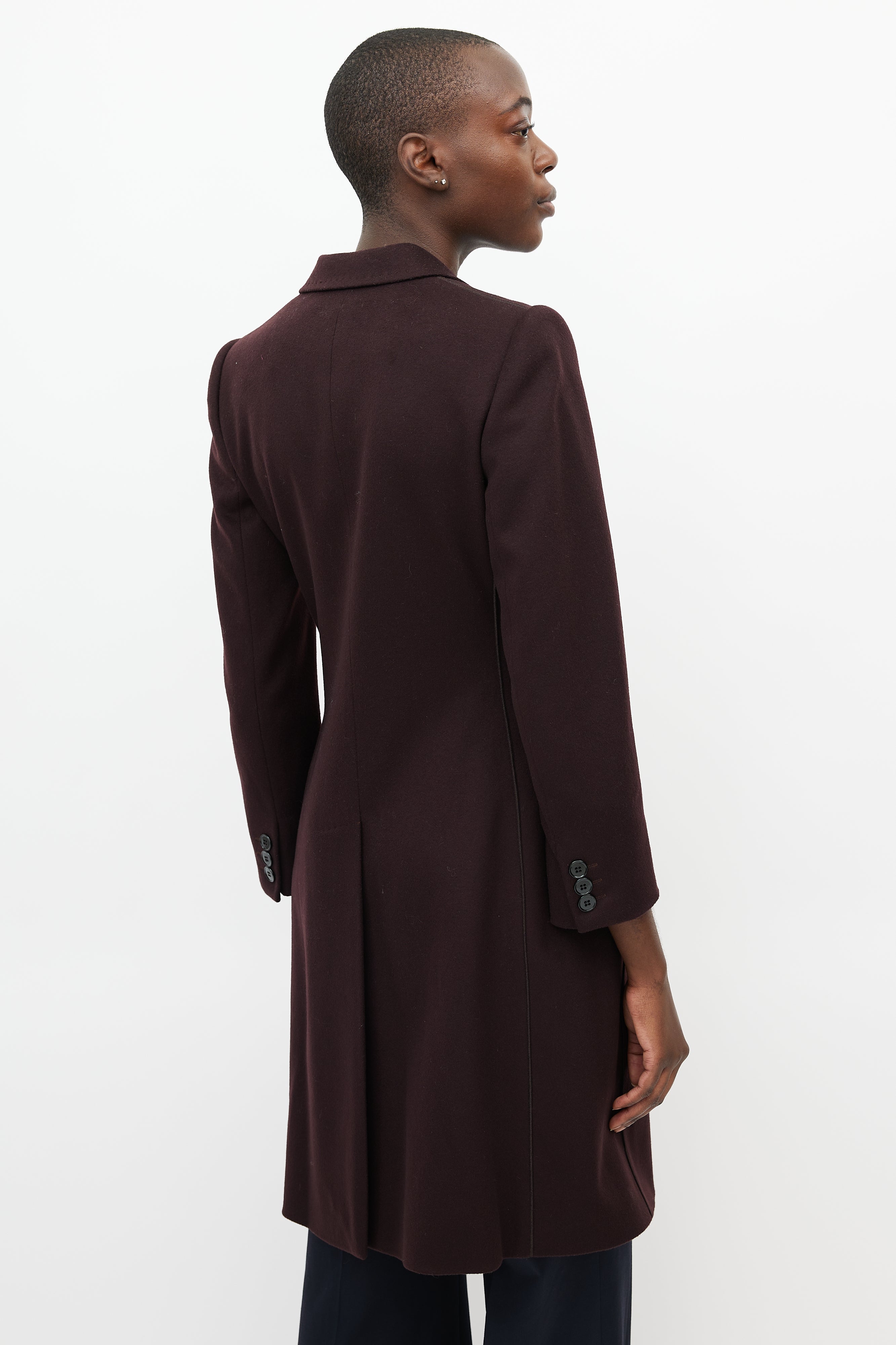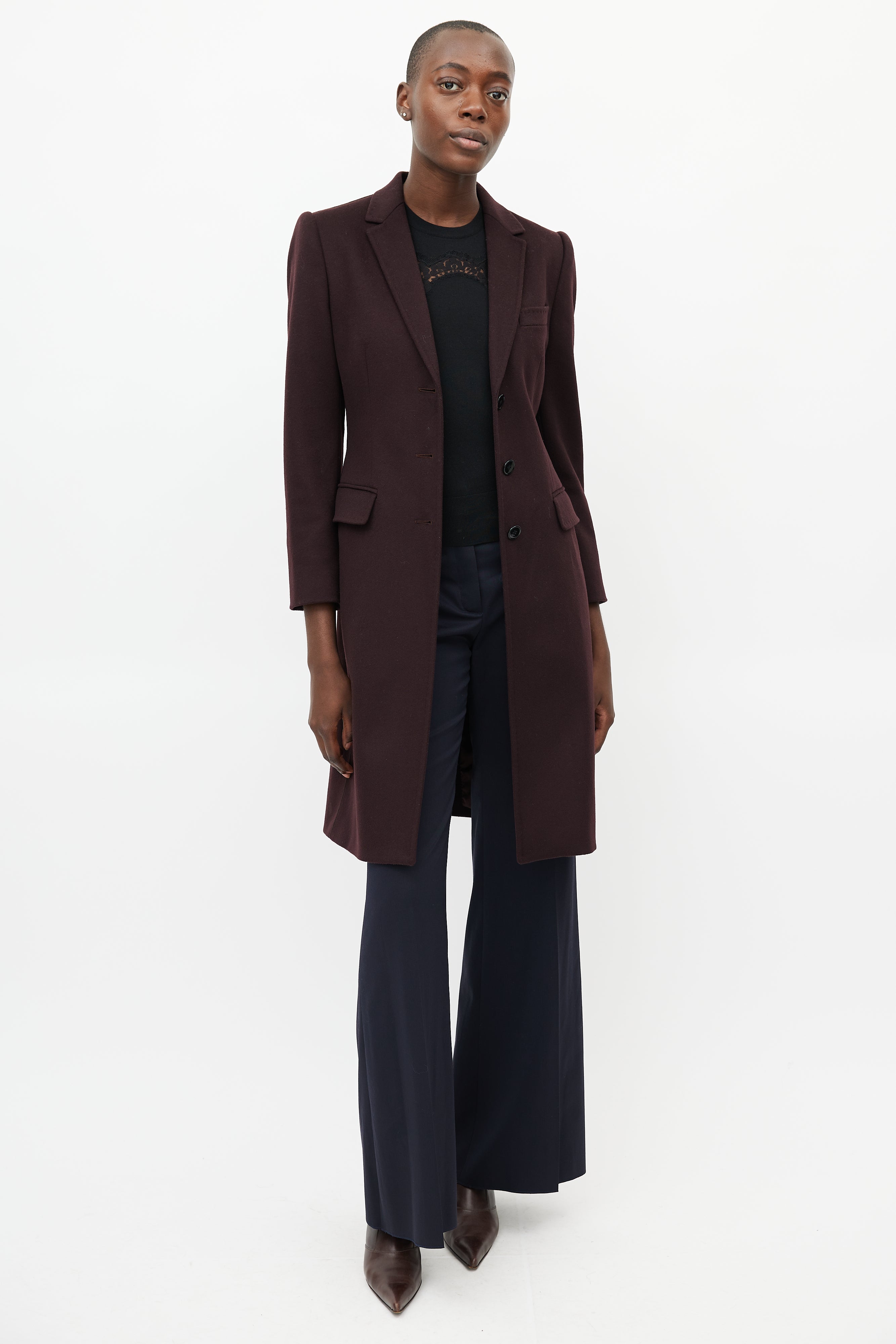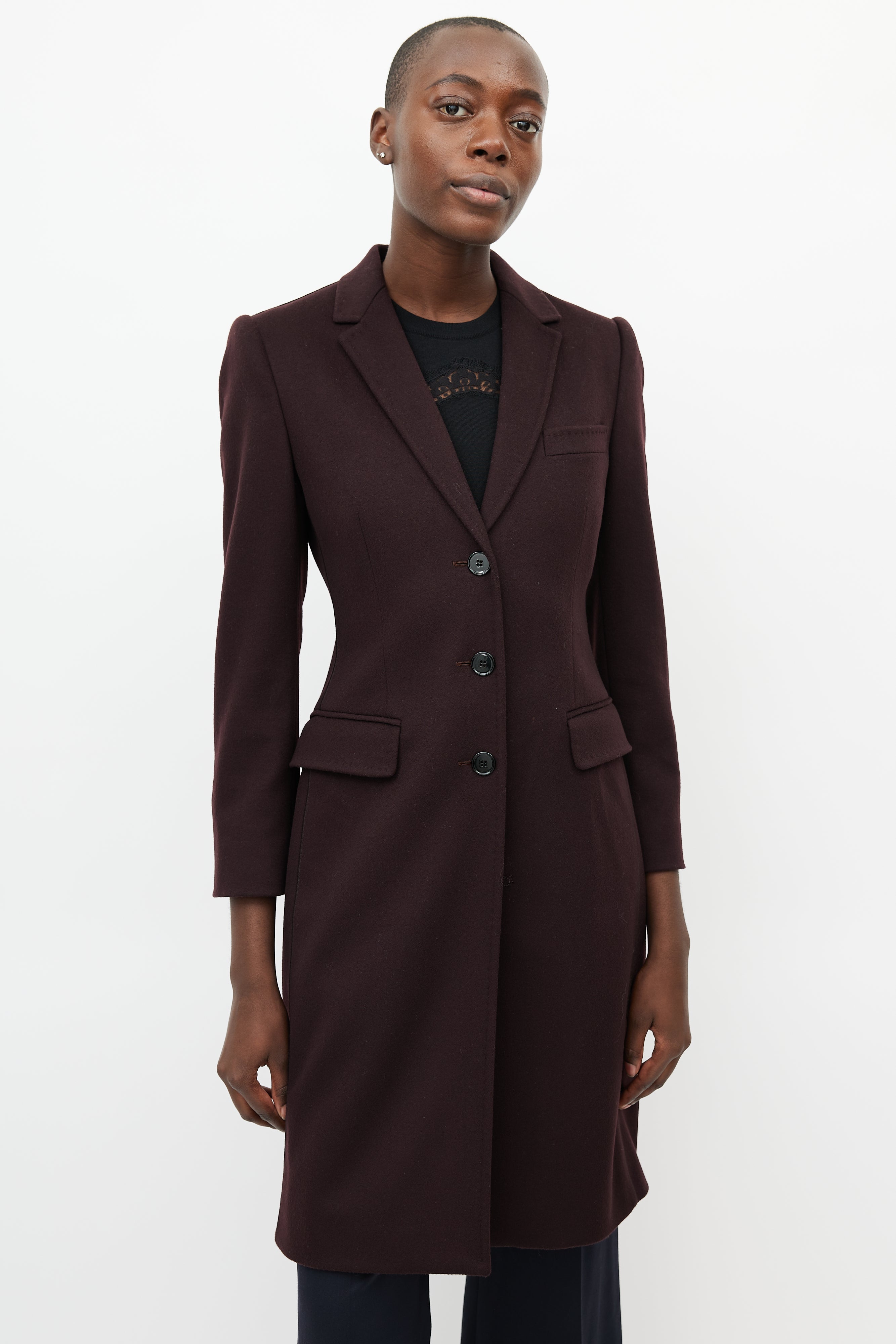 Pre-owned Dolce & Gabbana burgundy wool coat featuring a notched lapel, one welt pocket at chest, two flap pockets at hip, long sleeves with buttoned cuffs, and button up front. Lined.
