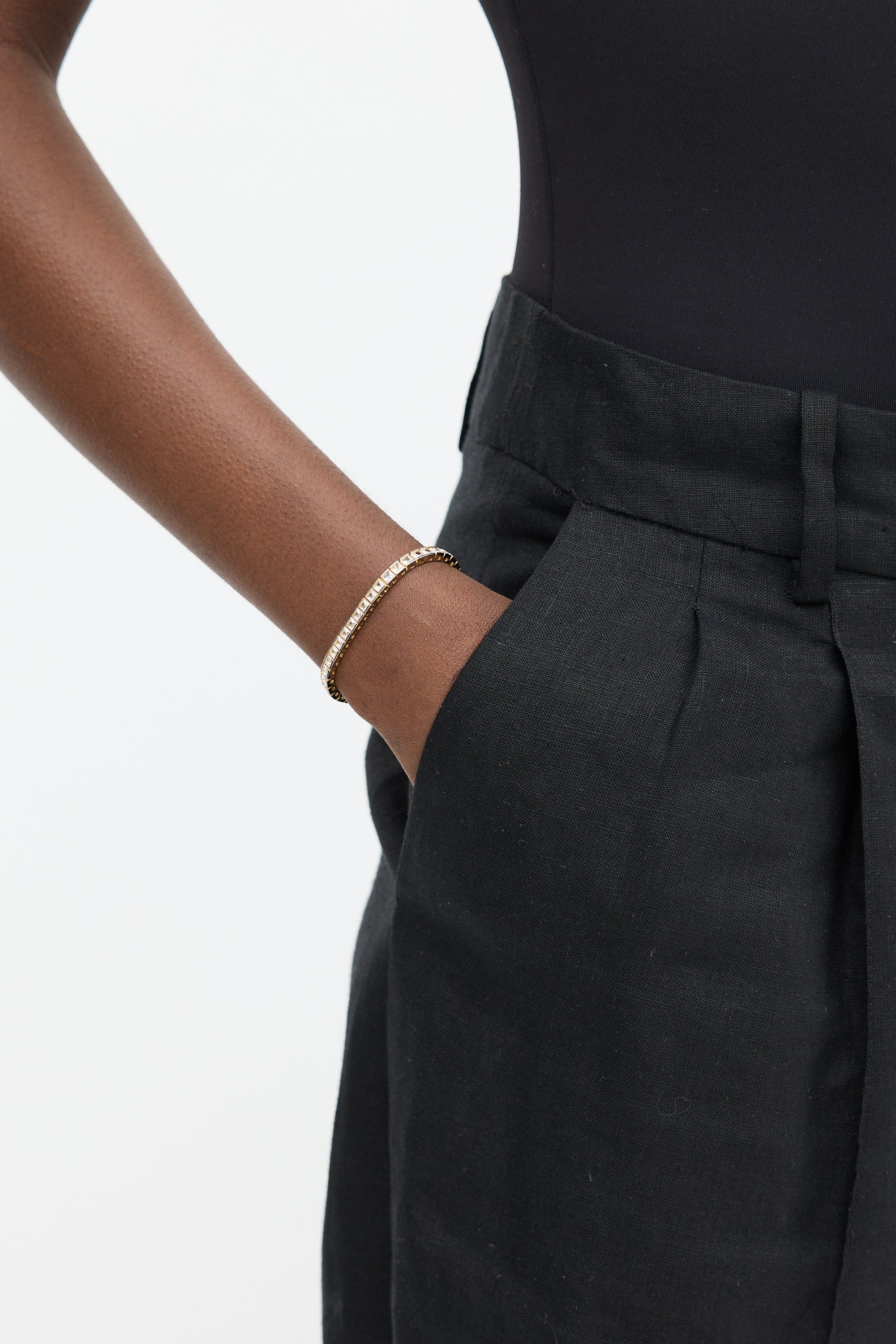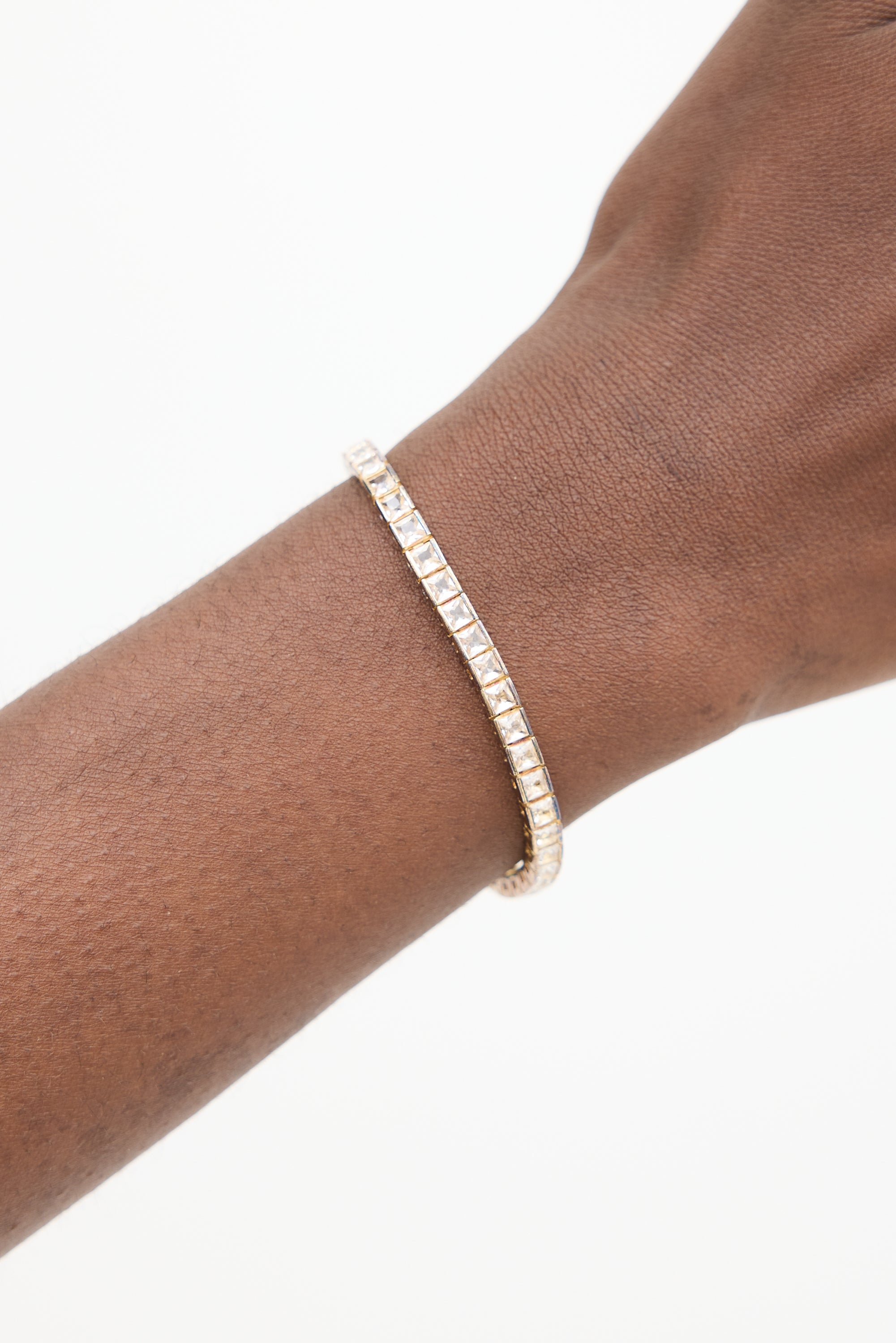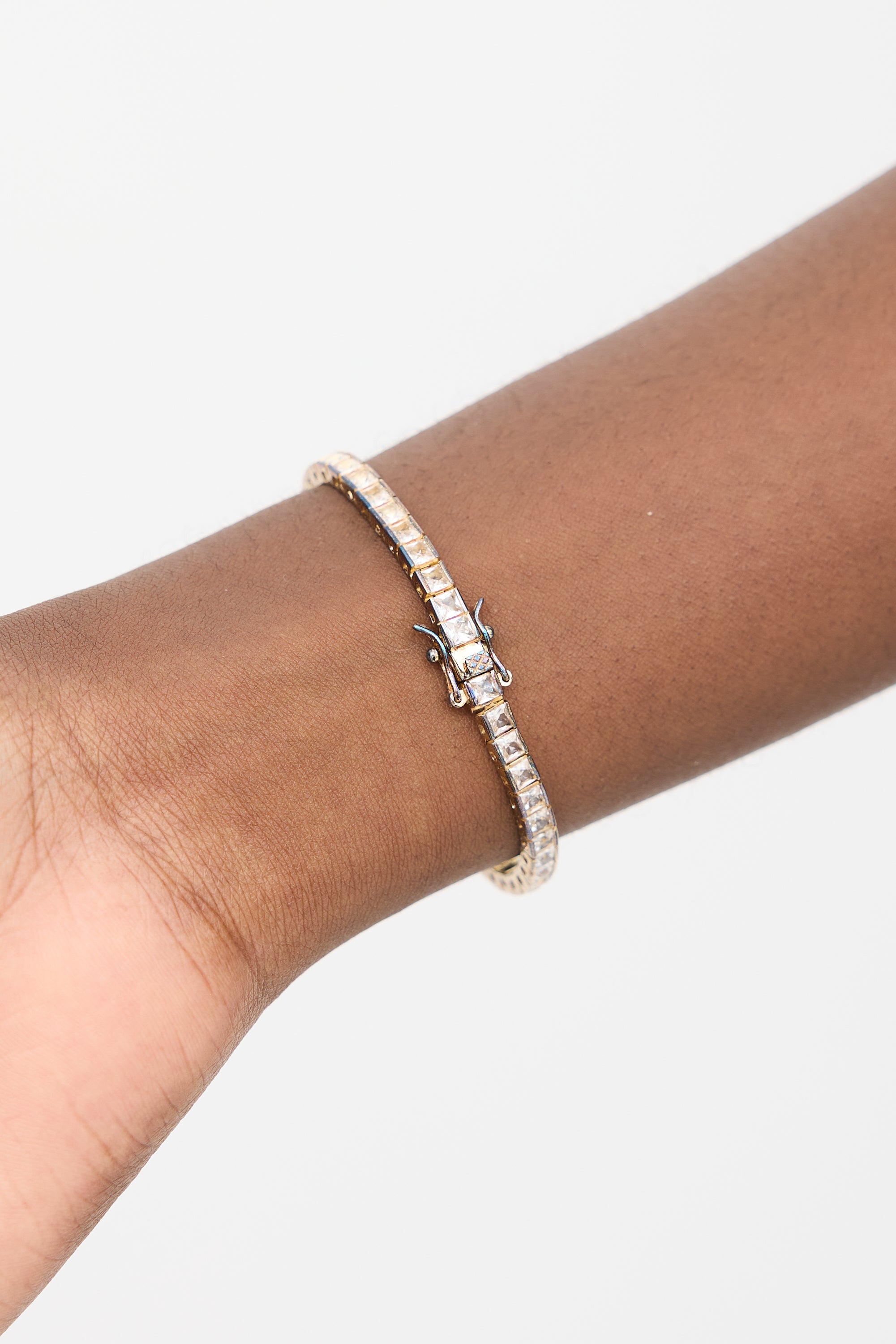 Pre-owned Dorsey 18k yellow gold coated sterling silver Kate Rivière tennis bracelet featuring 42 round cut lab grown 7.60 carat white sapphires in a prong setting, engraved logo and "925" at interior, and push clasp closure. Comes with original box.
