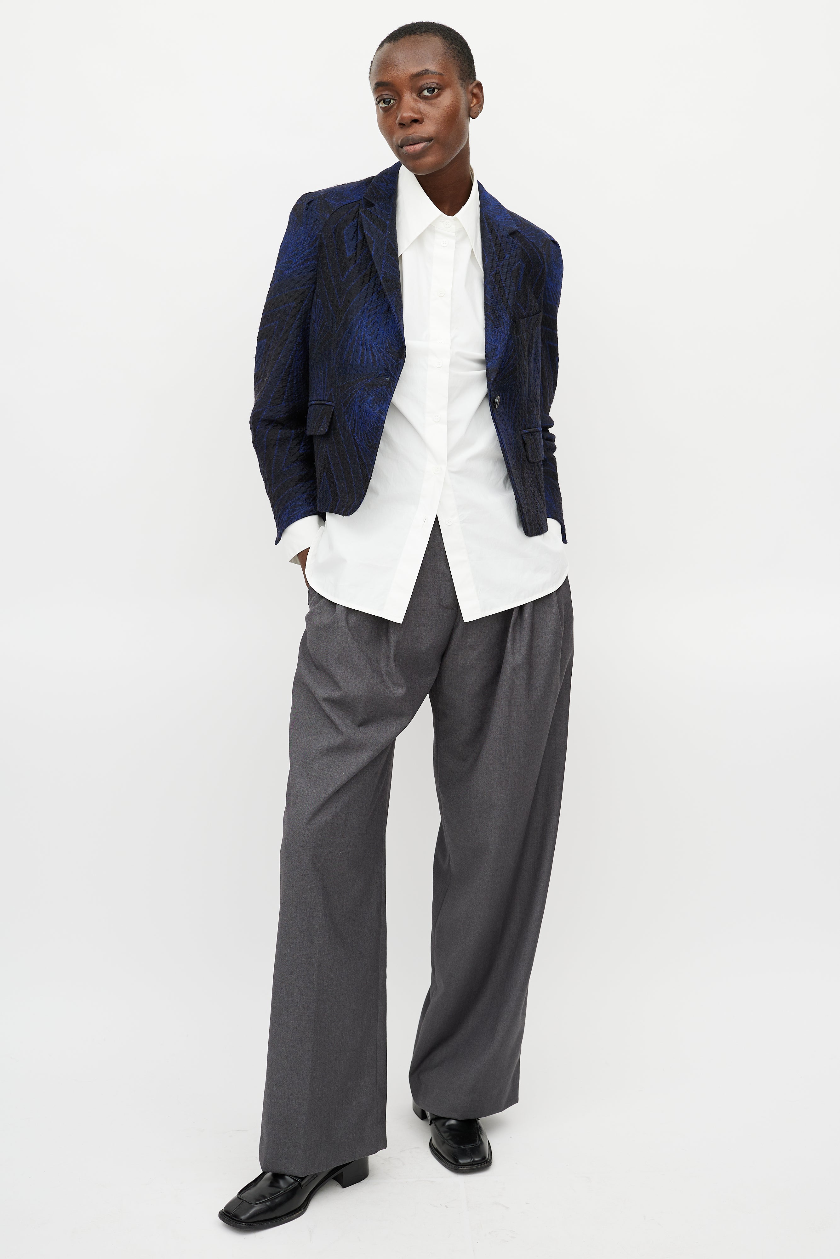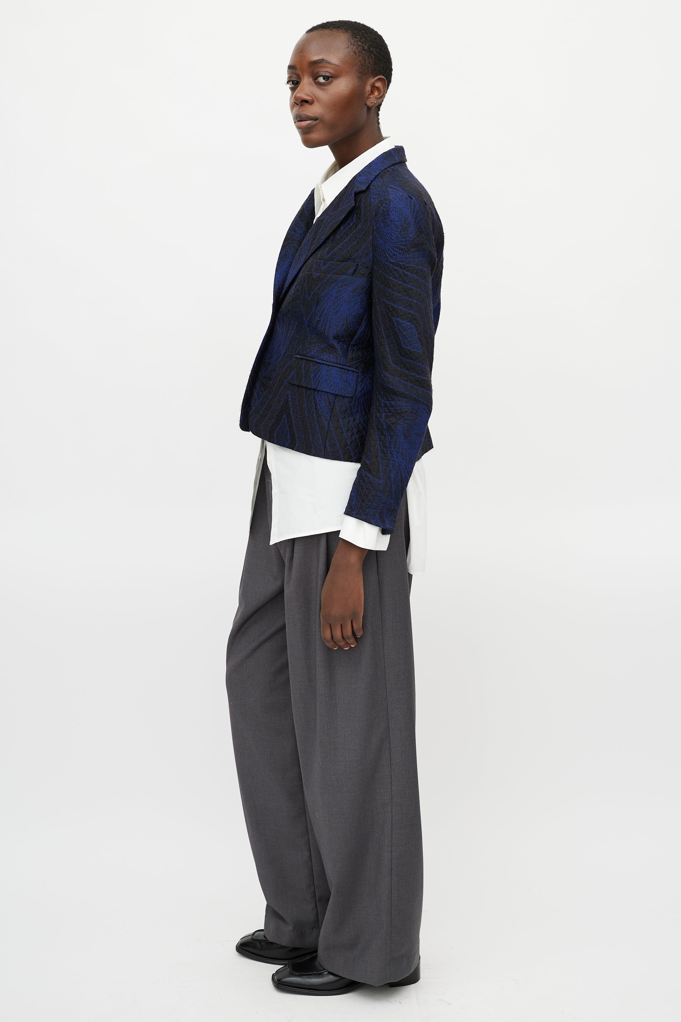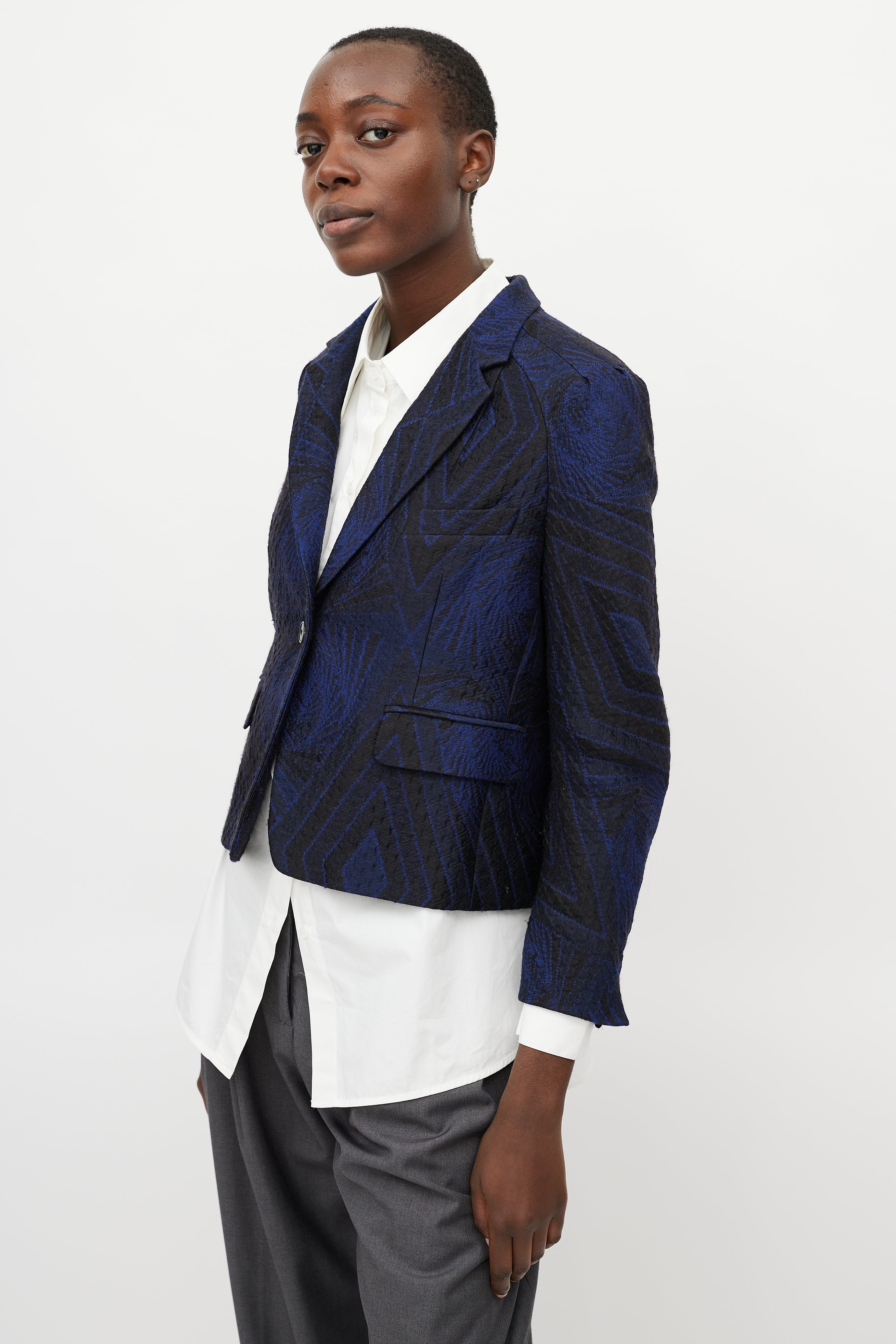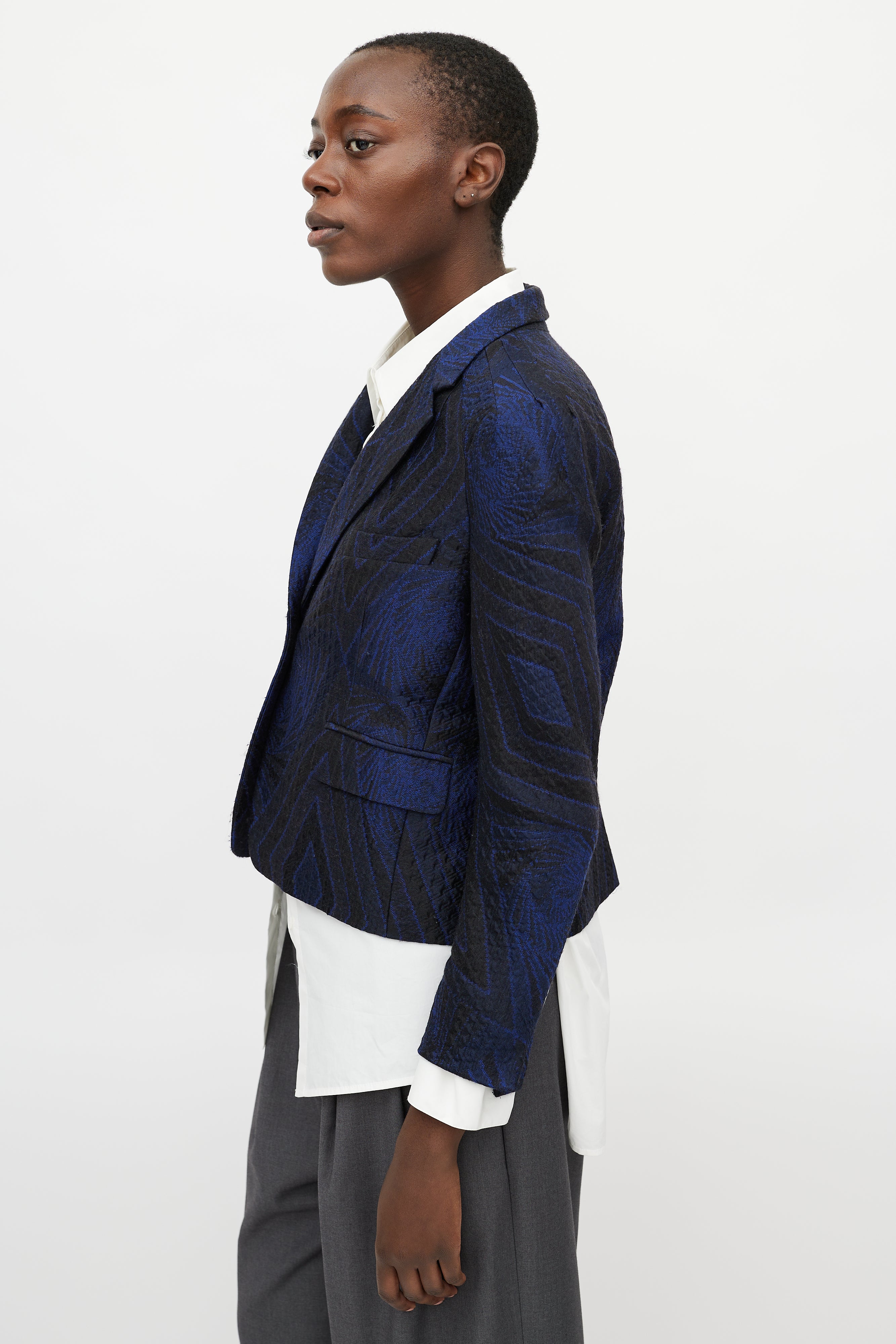 Pre-owned Dries Van Noten black blazer featuring navy brocade, notch lapel, single button closure, one welt pocket at chest, two flap pockets at hips, and slit at cuffs. Lined.