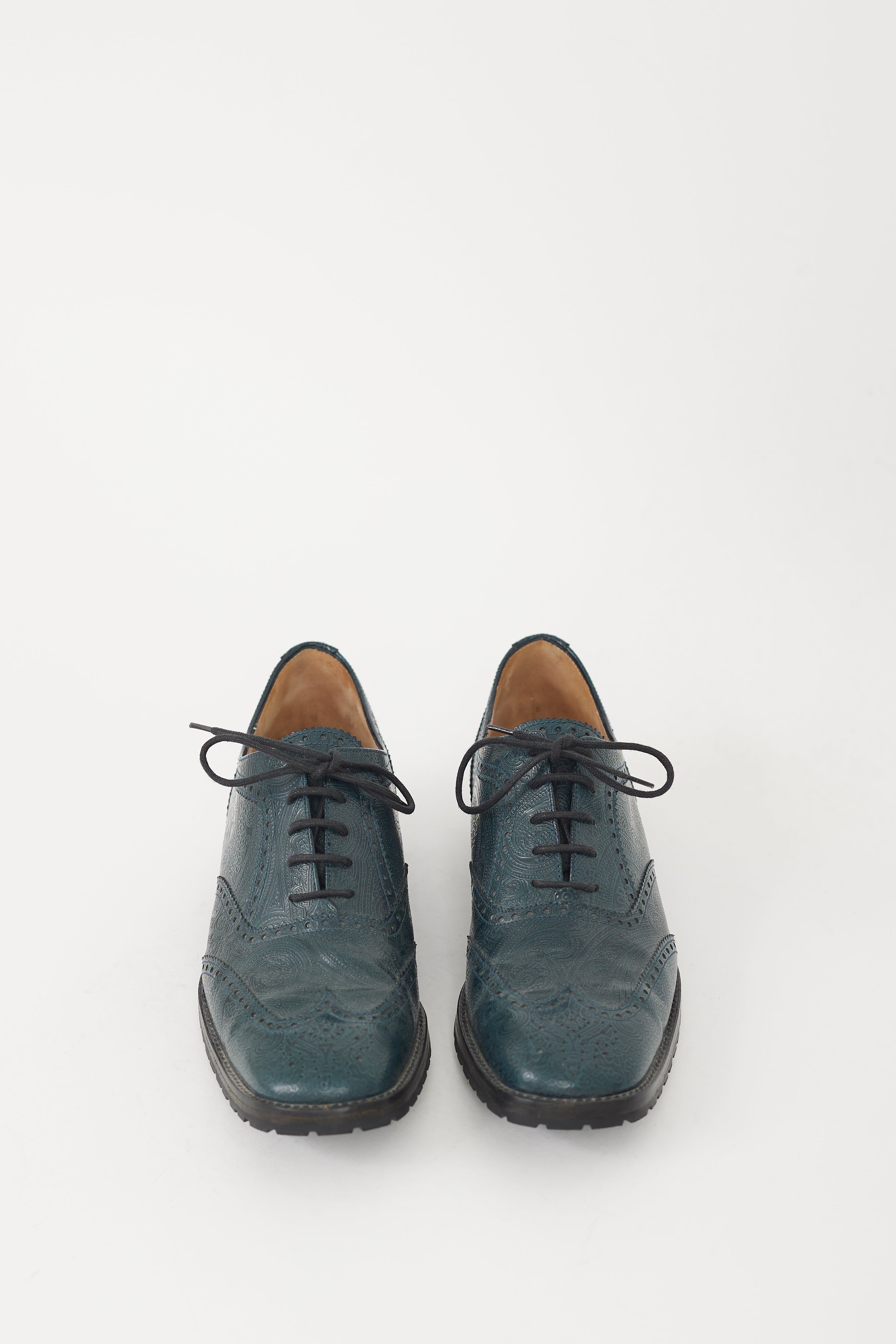 Pre-owned Dries Van Noten green brogues featuring a tapered square toe, embossed leather upper with ornate pattern throughout, wing tip at vamp, lace up front, and stacked heel.