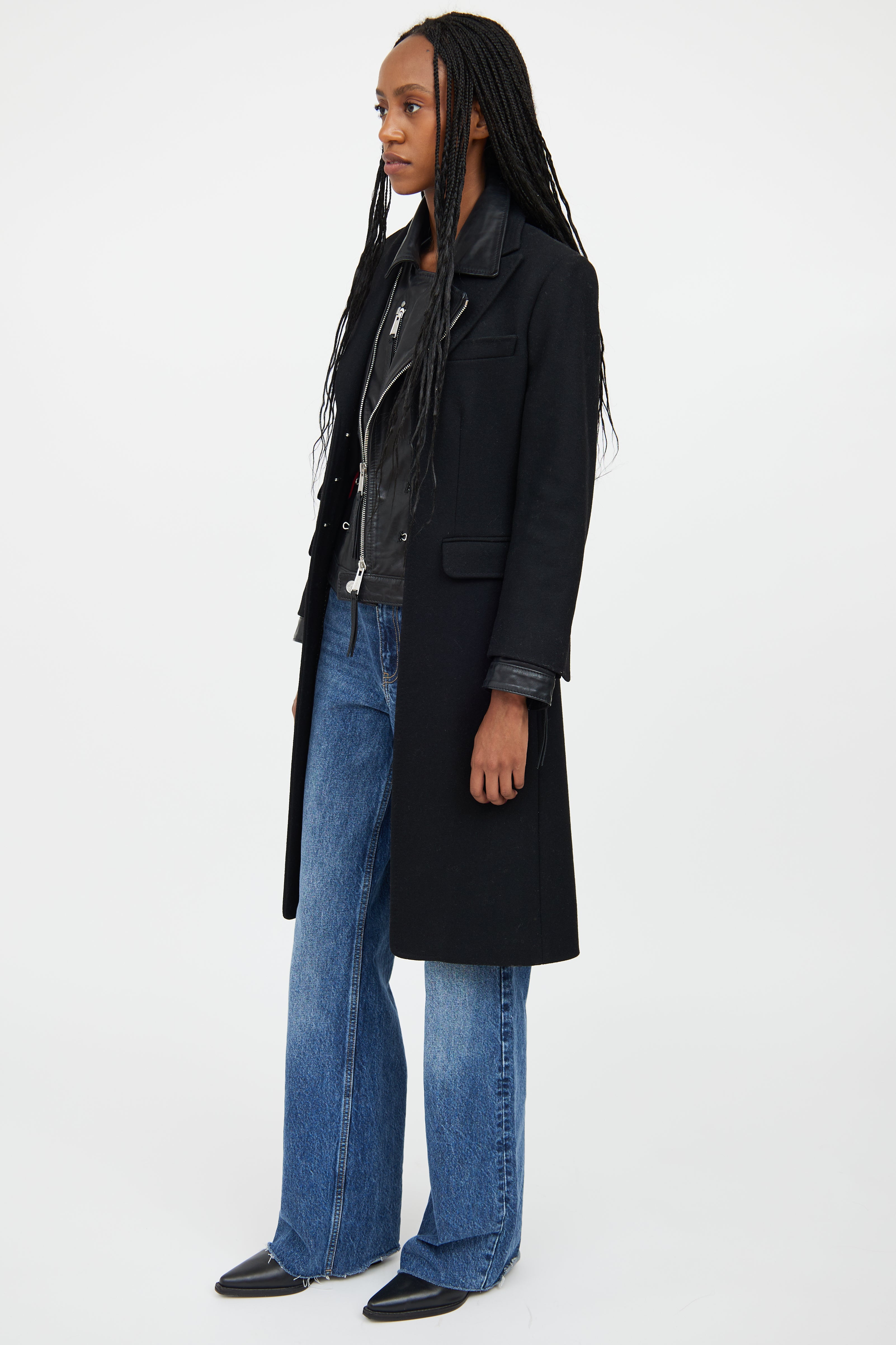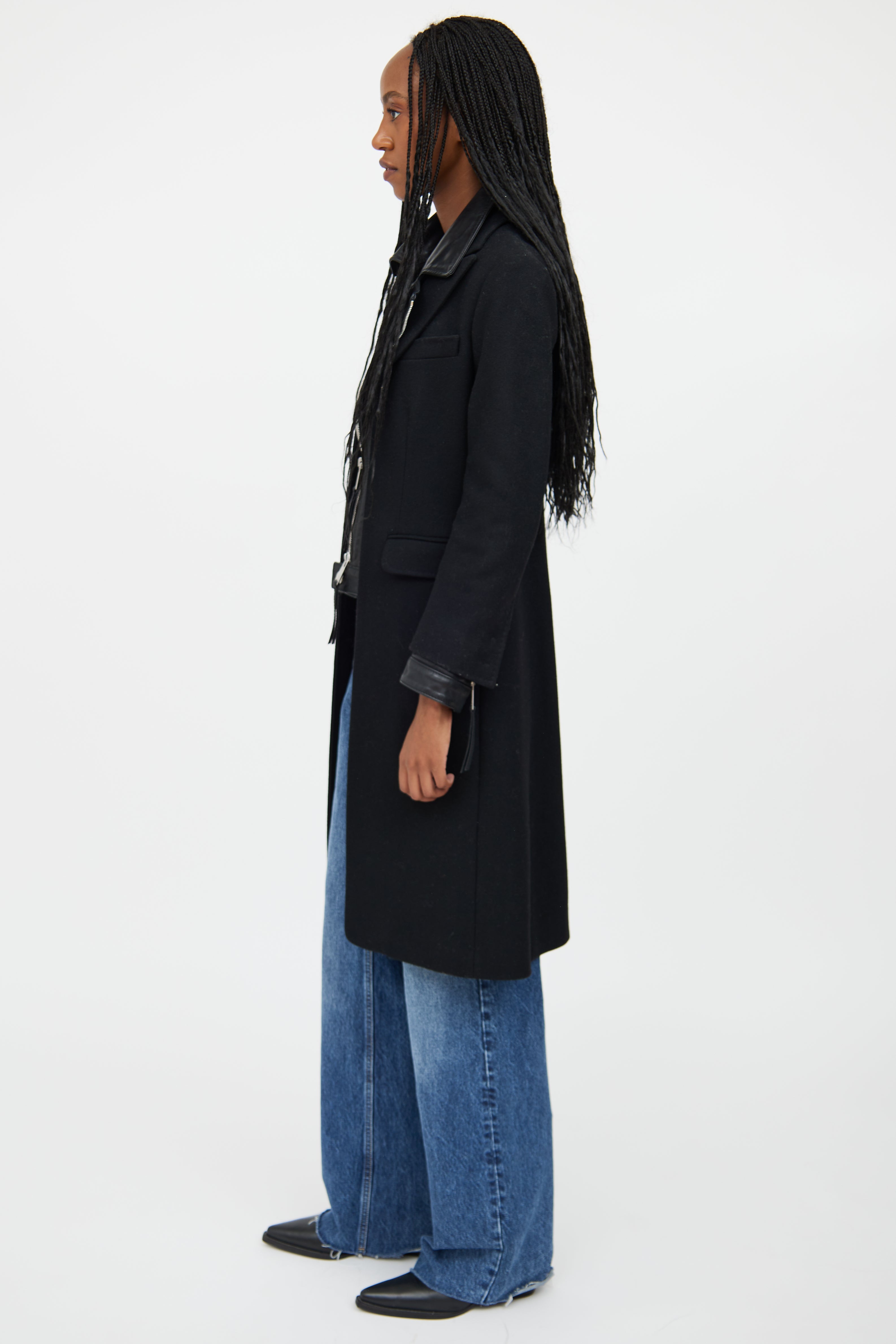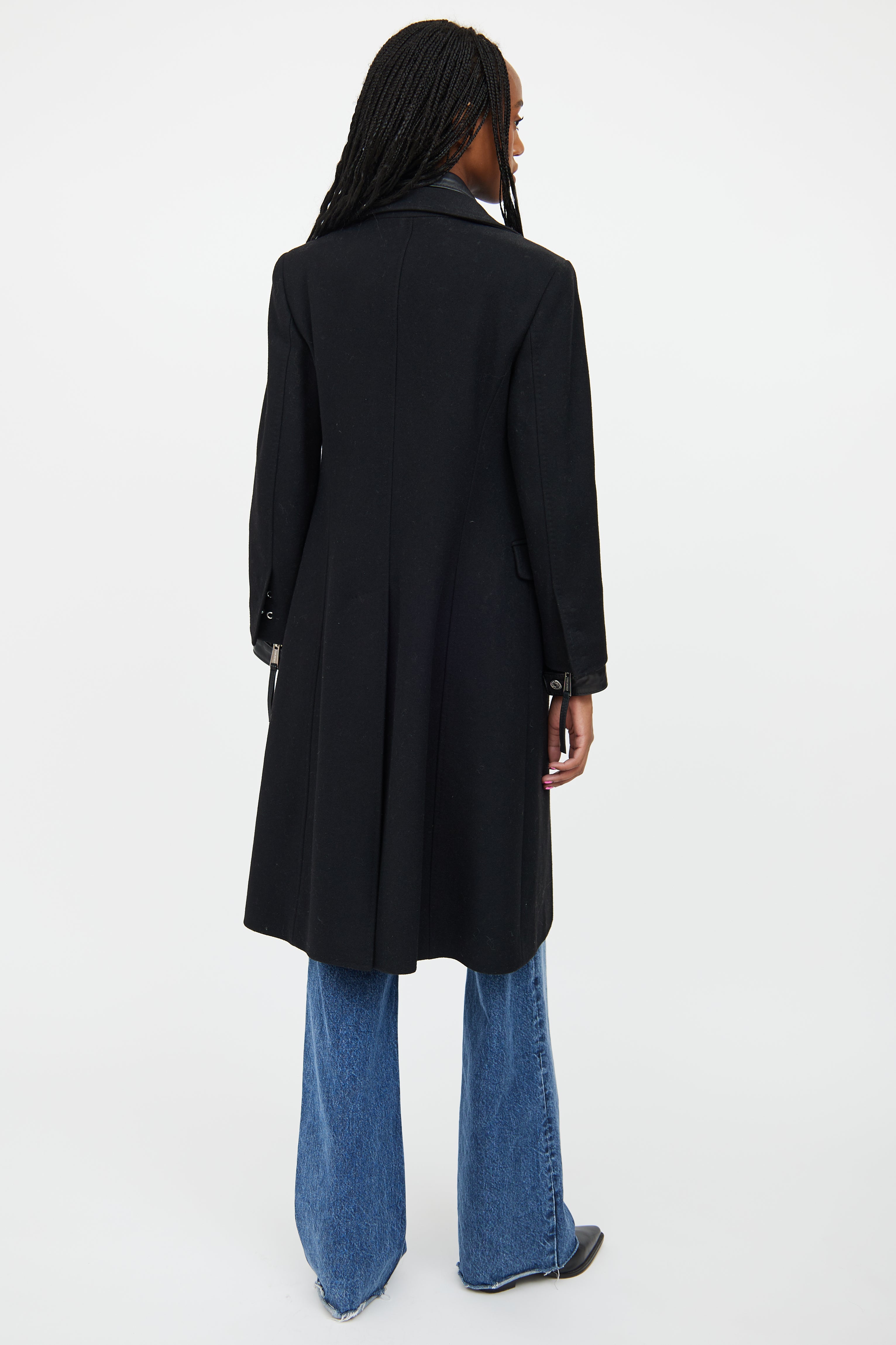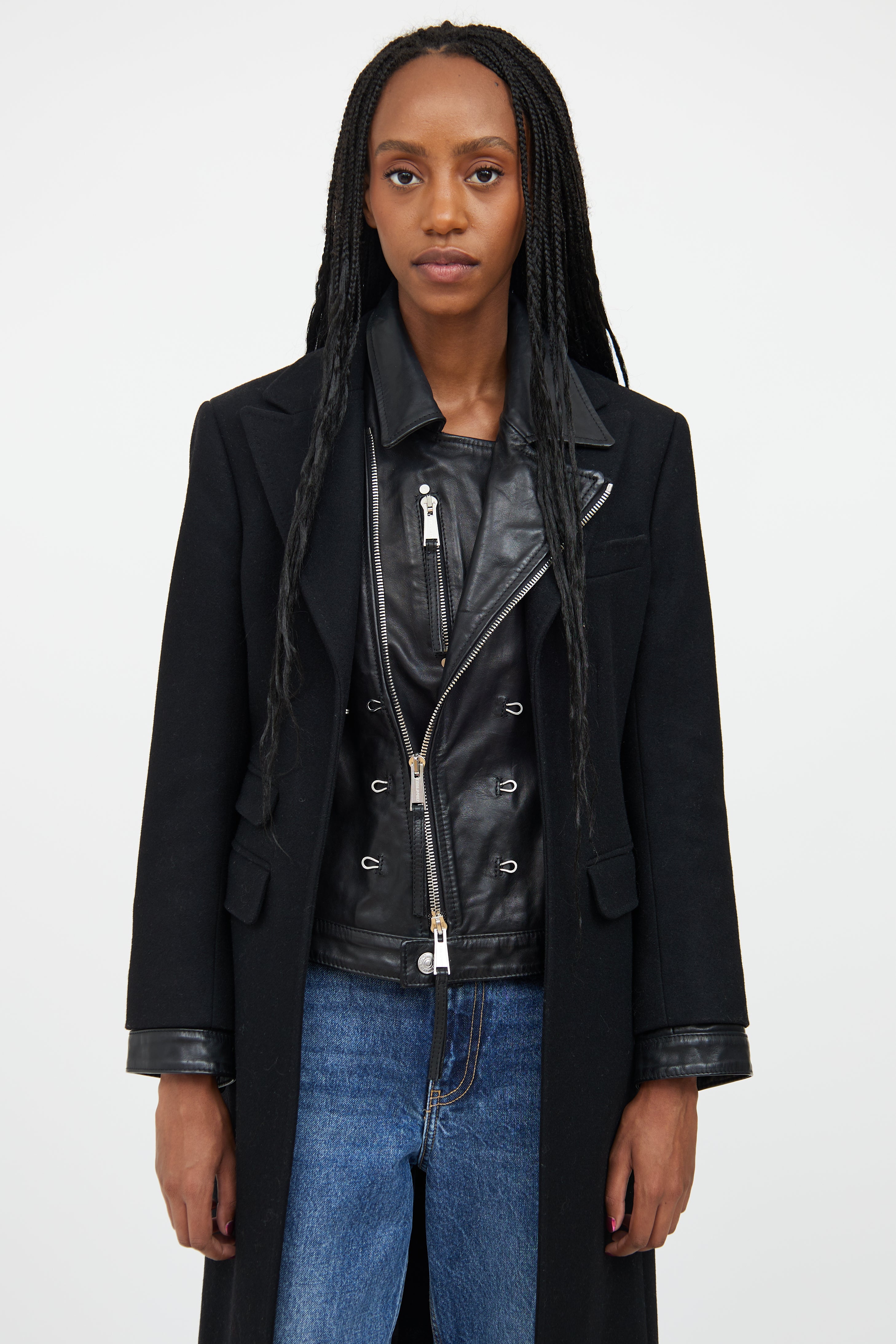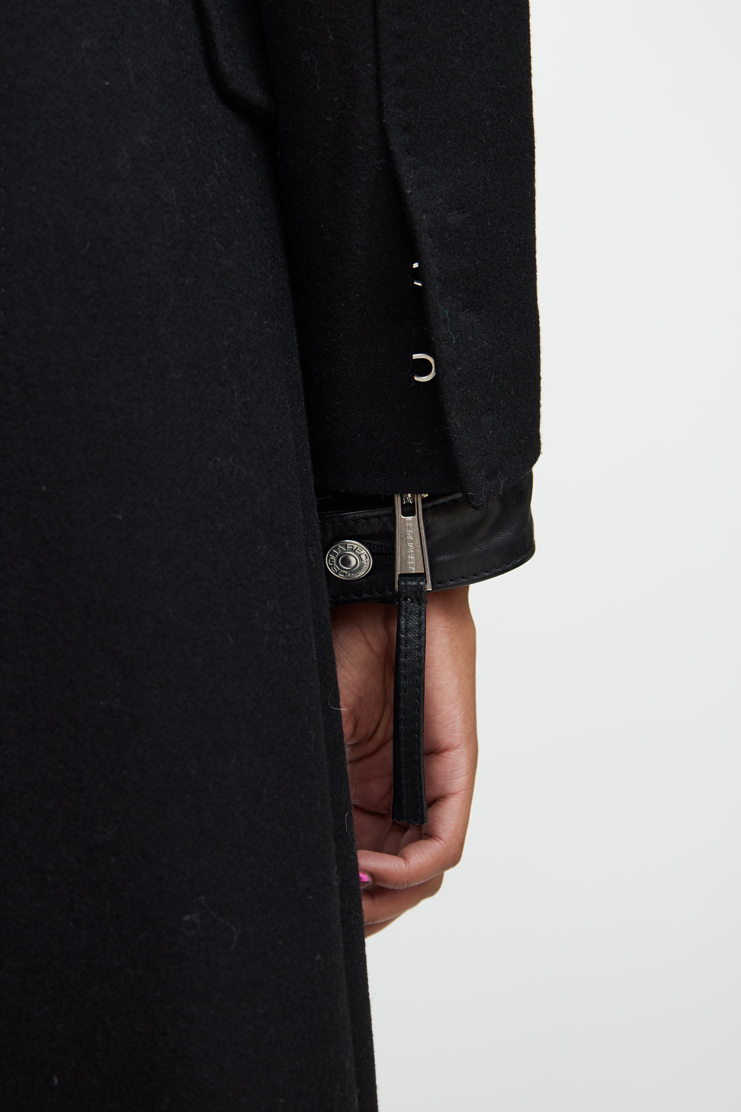 Pre-owned DSquared2 black wool coat featuring a notched lapel, tonal leather jacket insert at interior, long sleeves with leather zipped cuffs, one welt pocket at chest, three flap pockets at hip, slit at hem, and zip front closure. Lined.