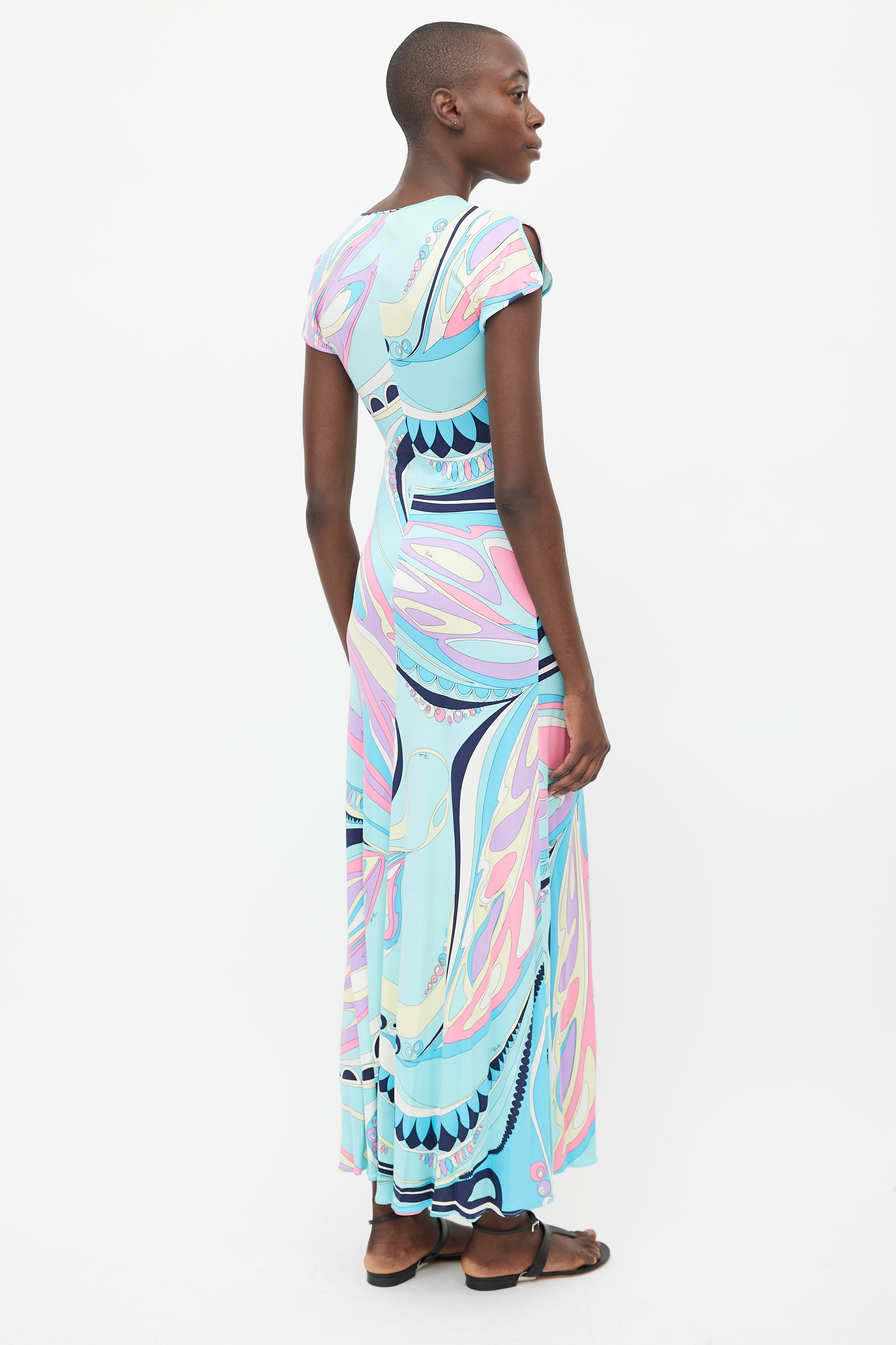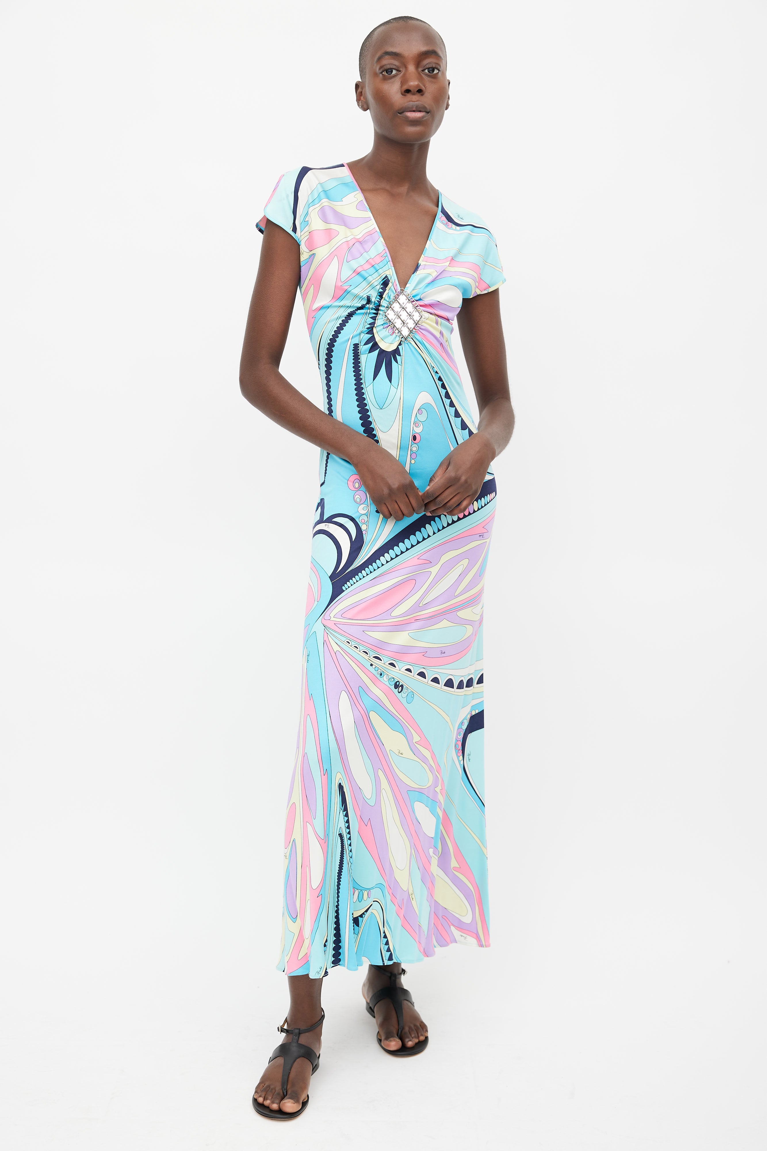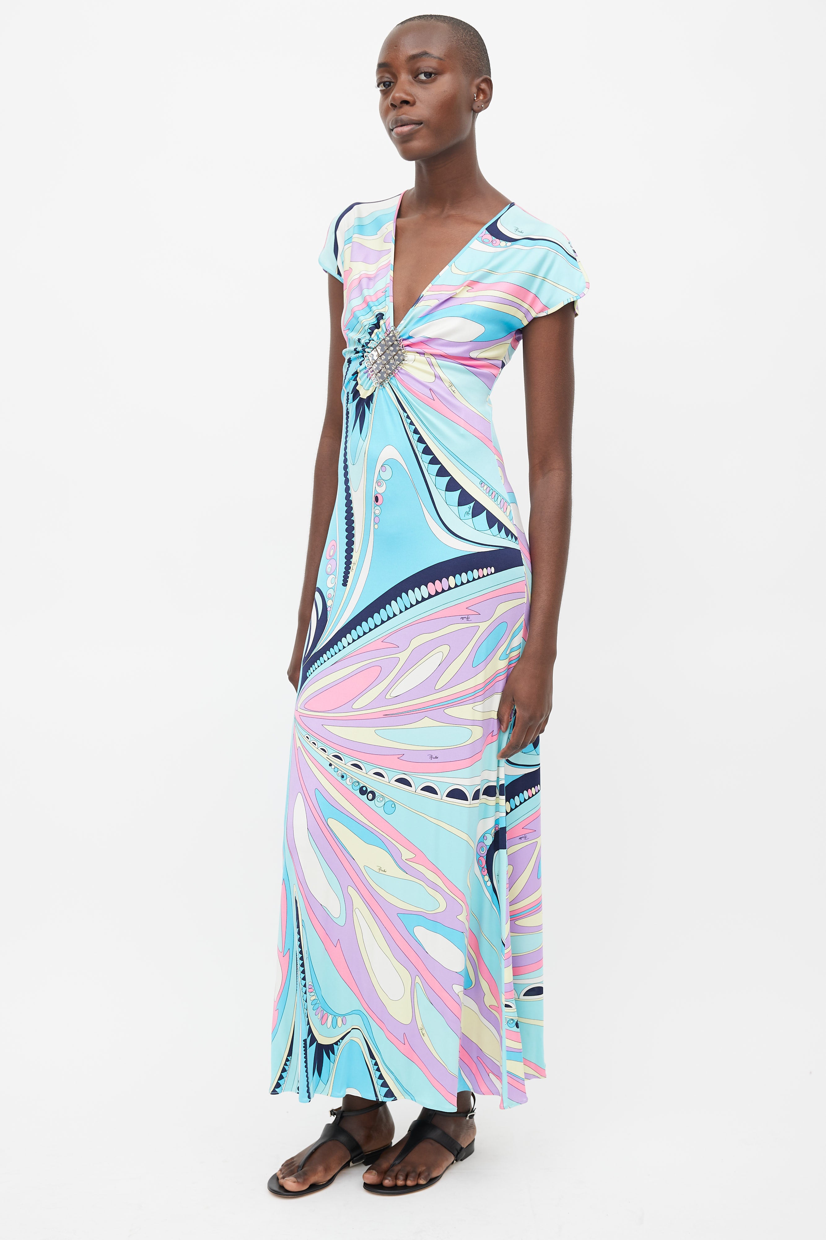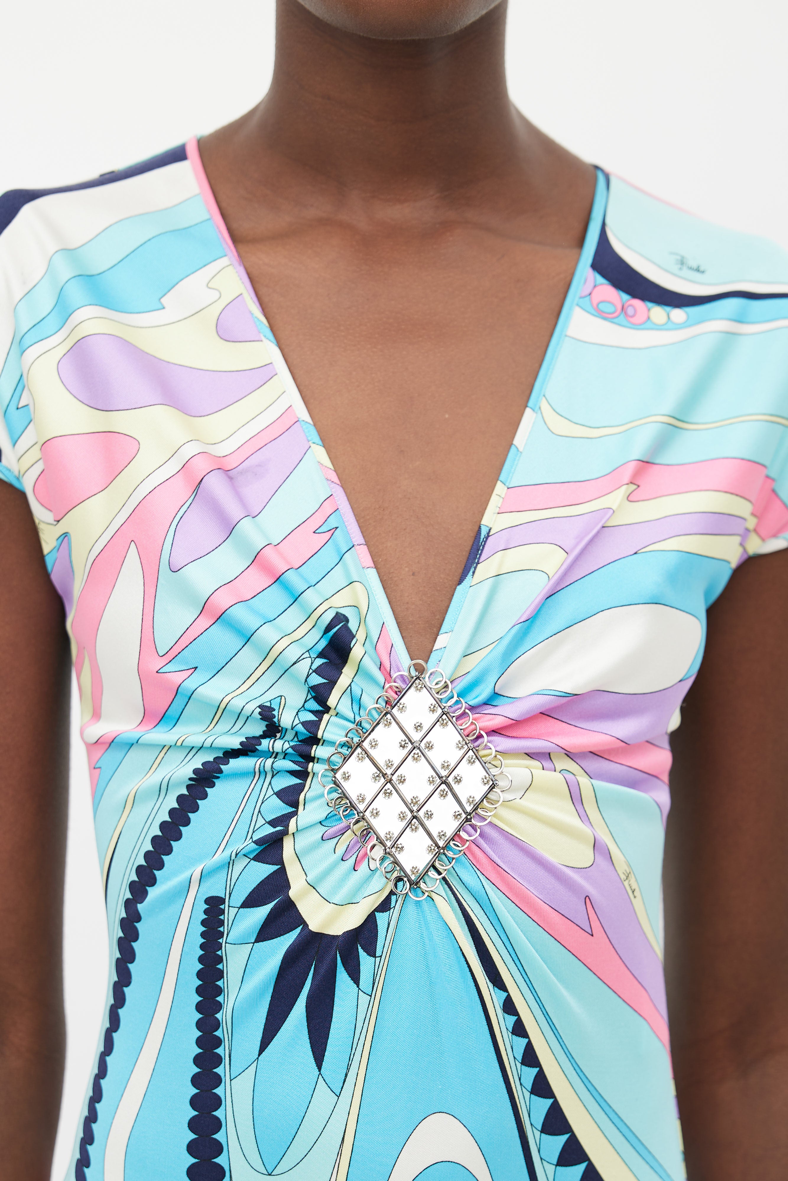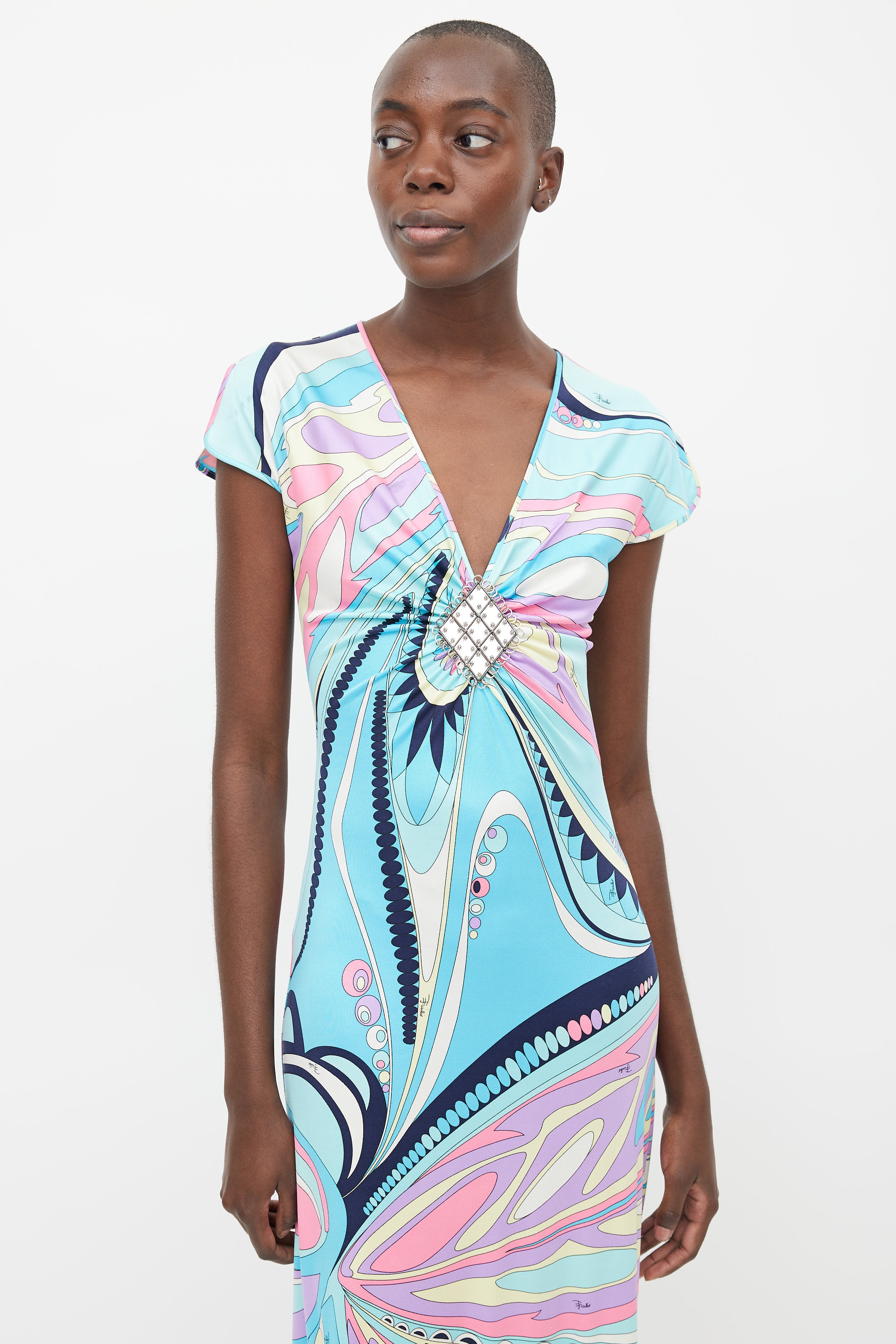 Pre-owned Emilio Pucci blue dress featuring multi coloured abstract print, V-neckline, cap sleeves, and silver tone diamond shaped embellishment at chest.