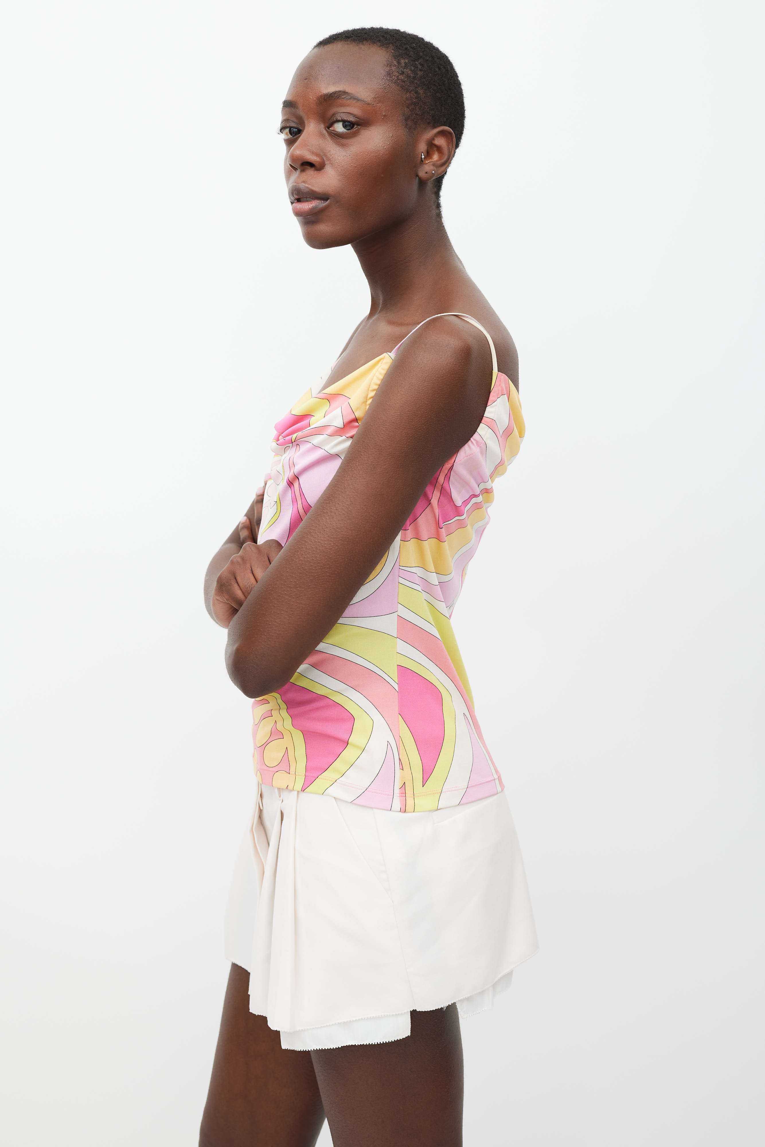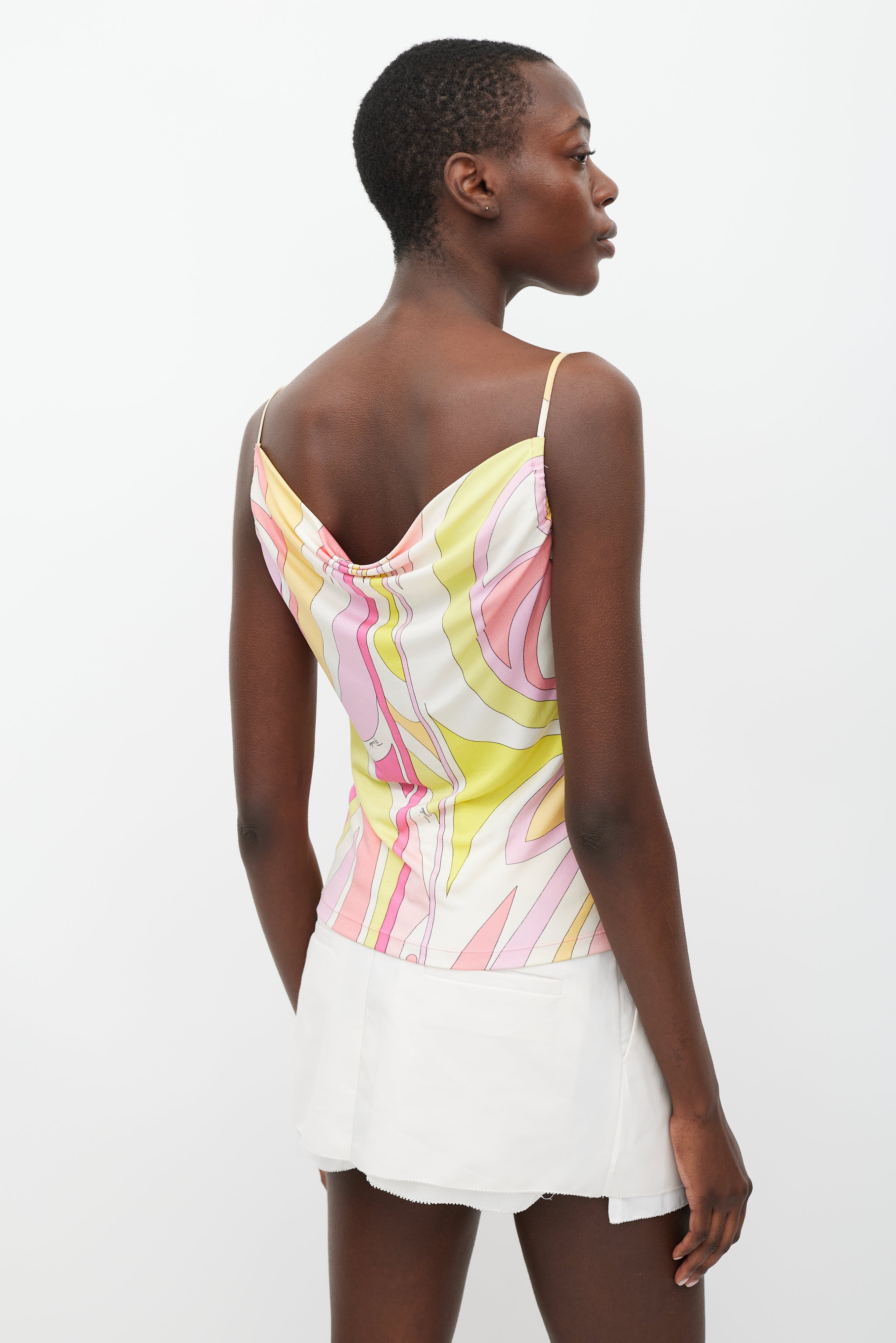 Pre-owned Emilio Pucci silk tank top featuring a pink, yellow, and white print throughout, adjustable cowl neck and back, and thin straps.