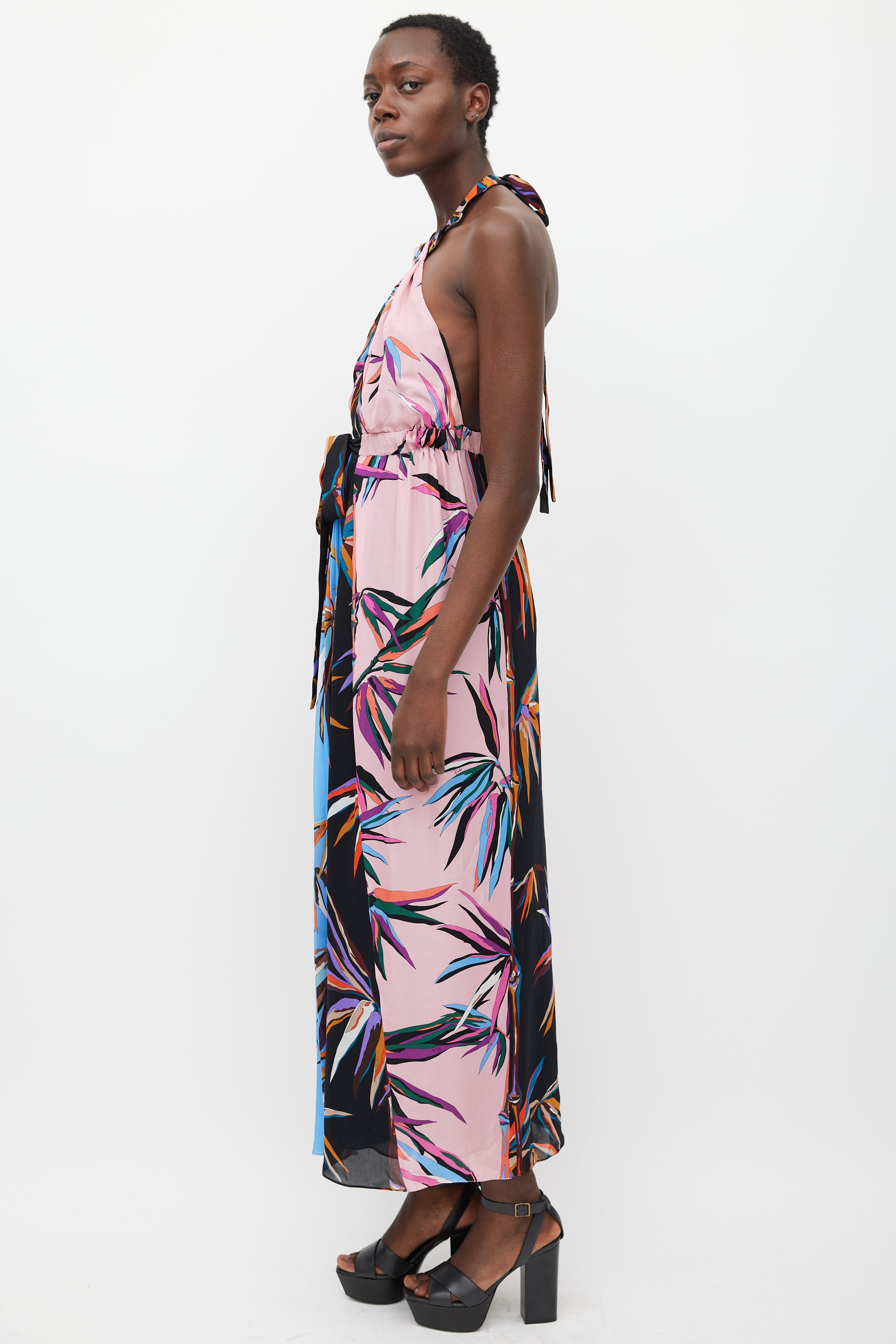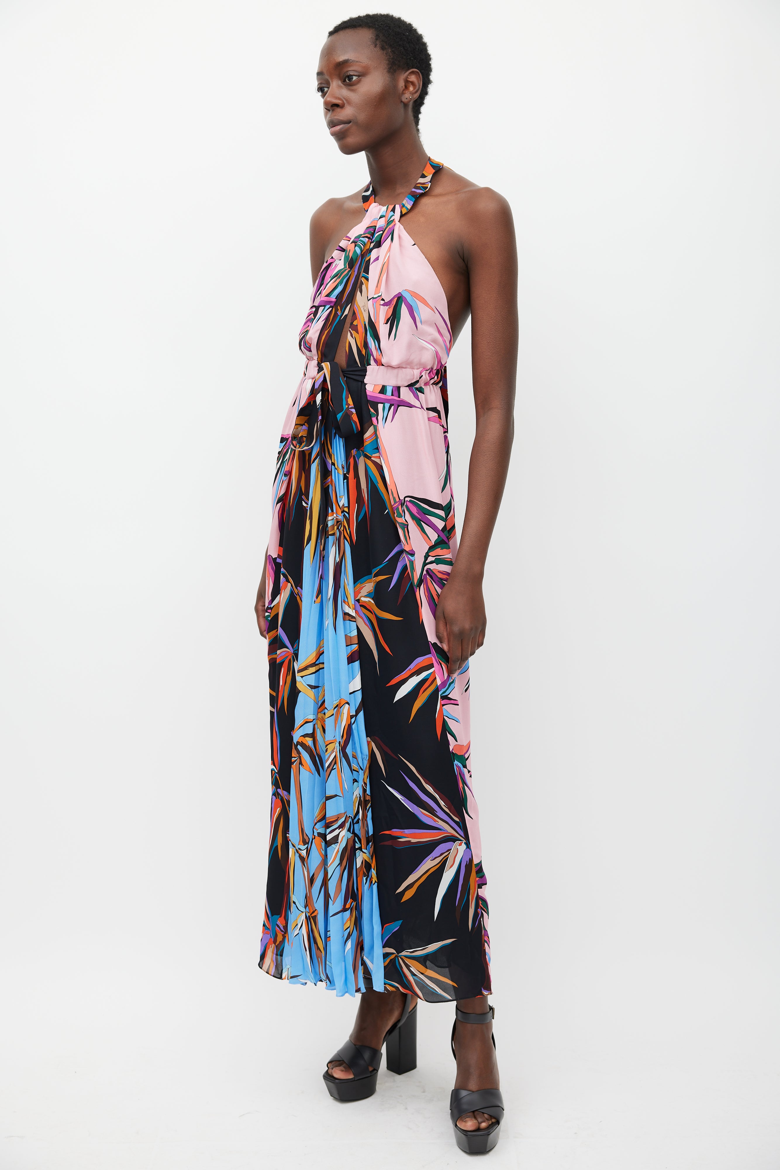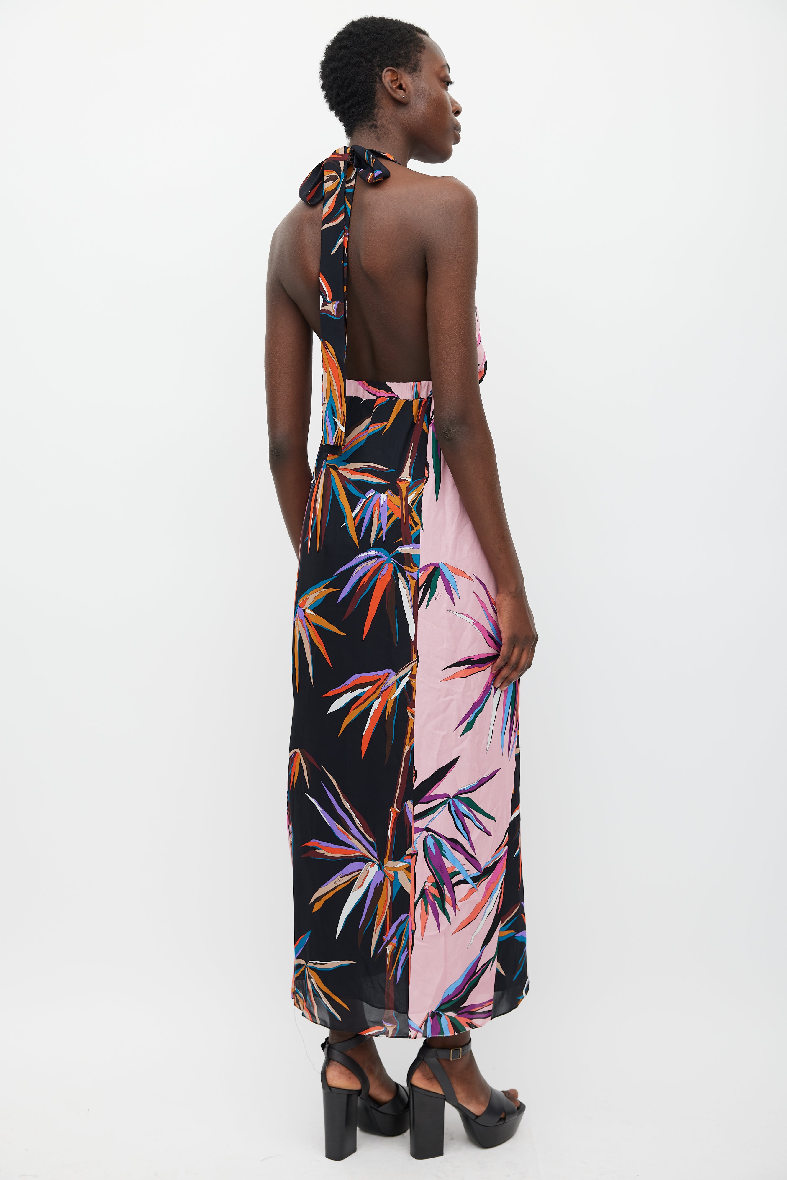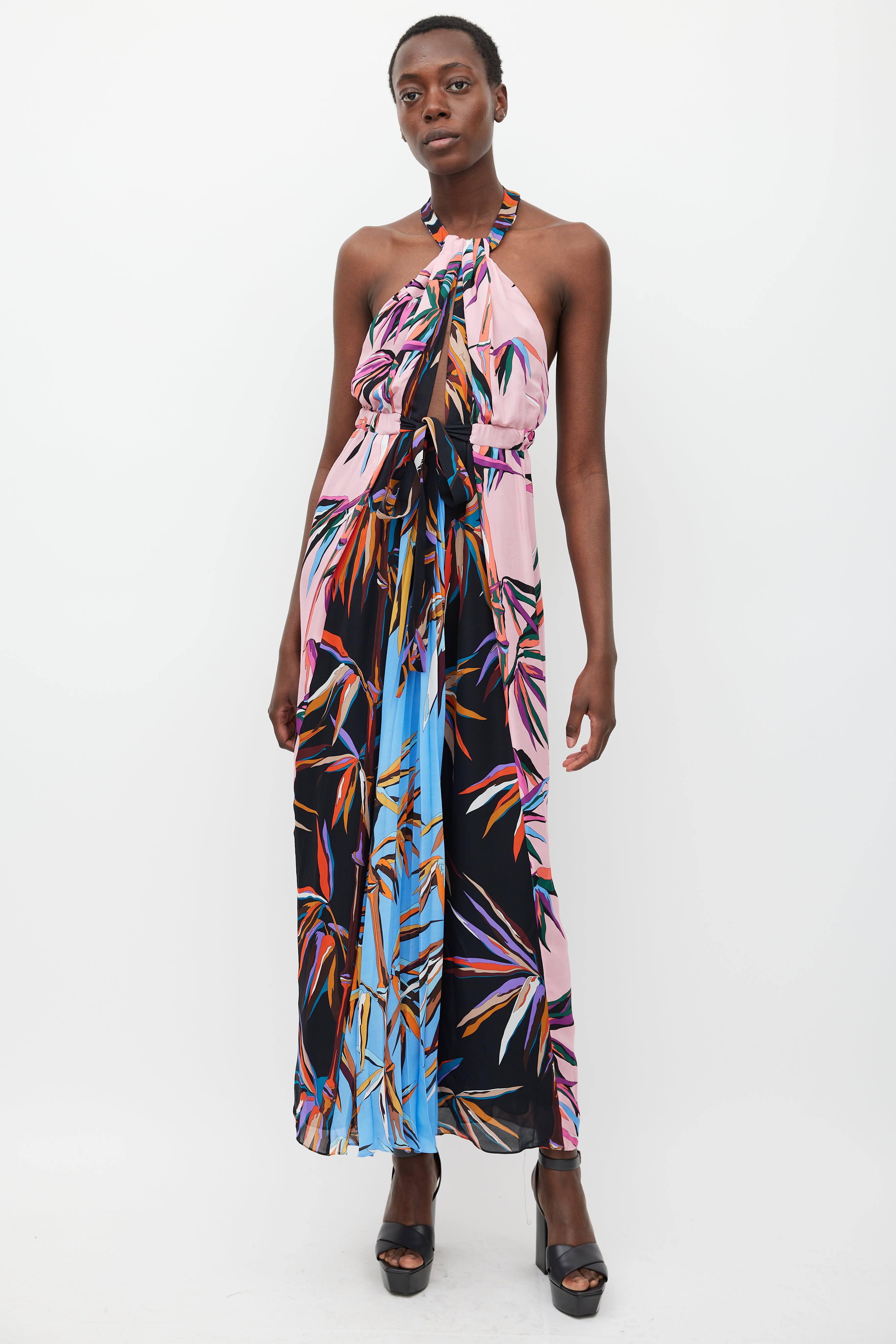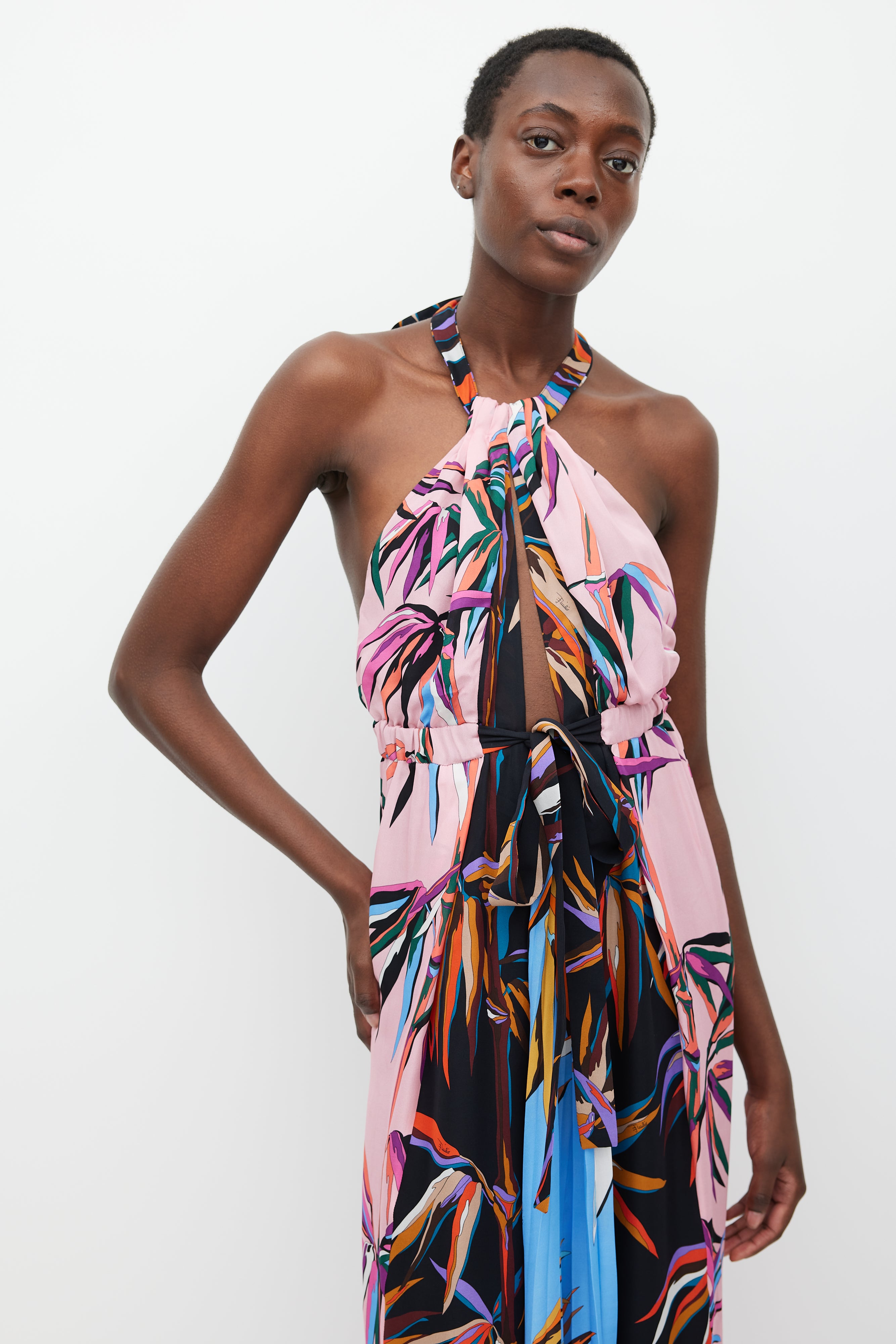 Pre-owned Emilio Pucci silk sleeveless maxi dress featuring panelled construction, multicolour stylized plant print throughout, tie halter neck with centre front cutout, open back, elasticized waist with tie front, and pleated front skirt panel. Lined.