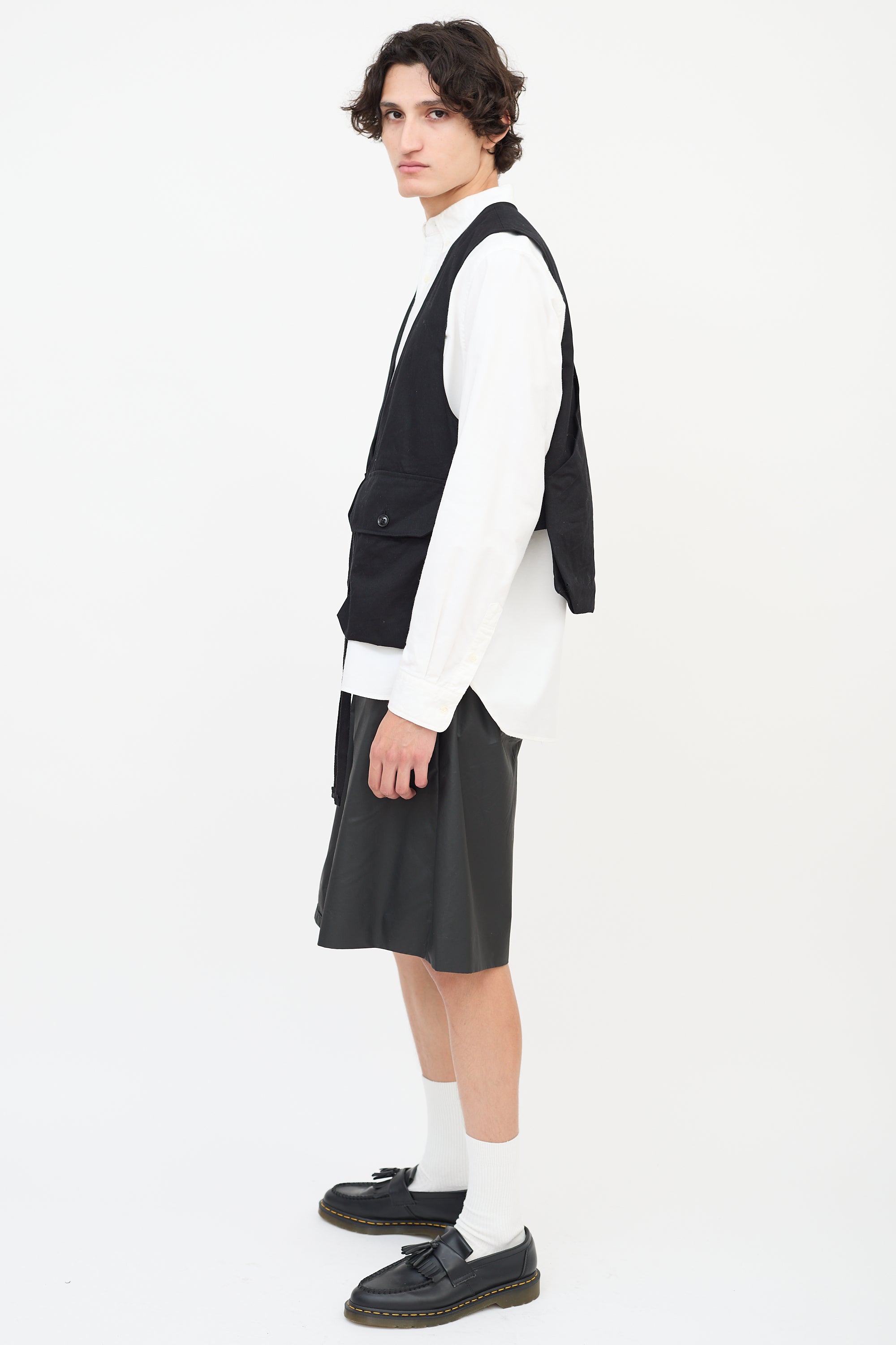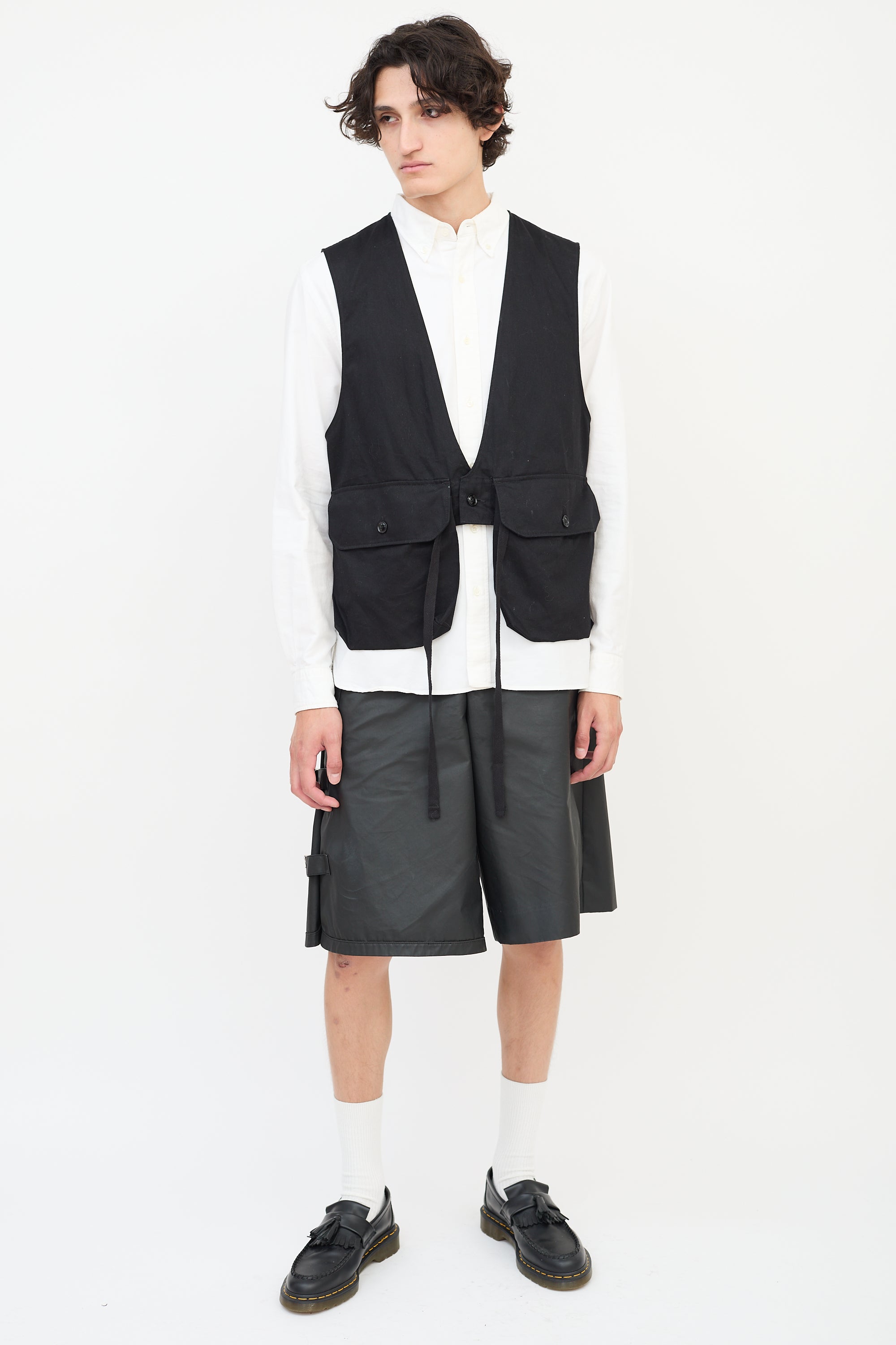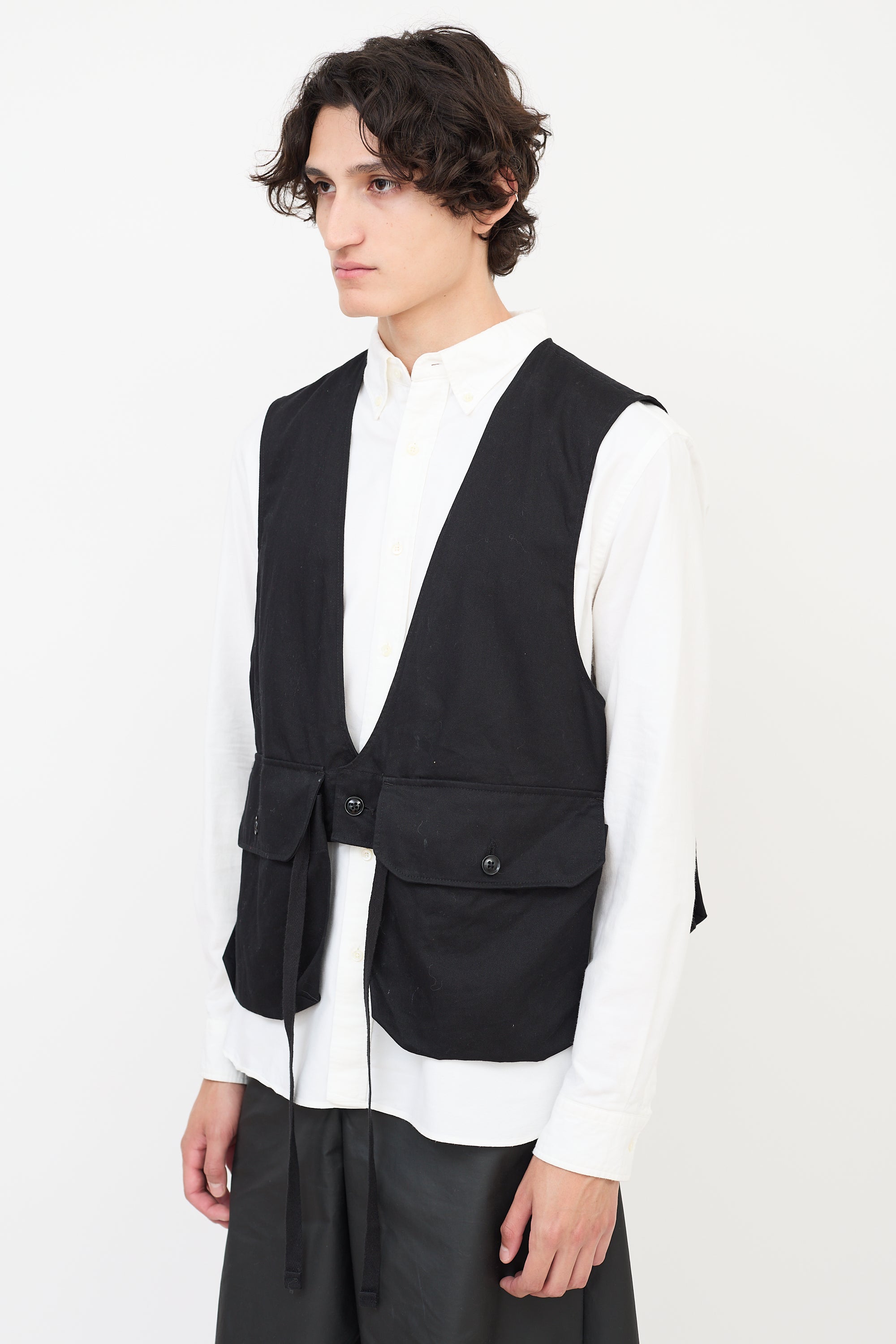 Pre-owned Engineered Garments black cotton fowl vest featuring a deep V-neckline with back locker loop, single front button and self tie detail at waist, two buttoned flap pockets at front hip, and one kangaroo pocket at centre back.