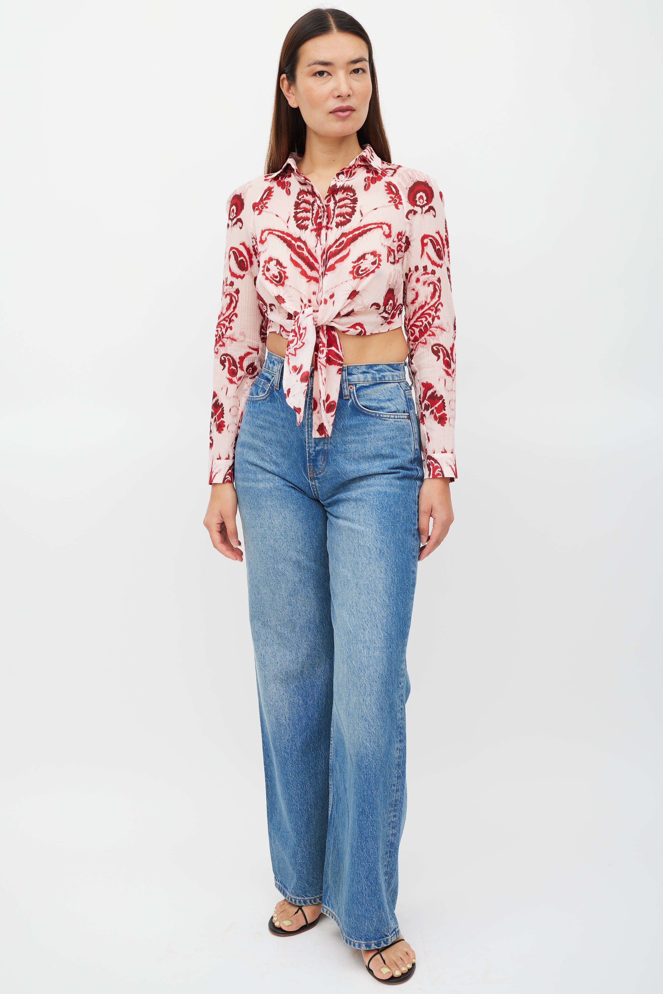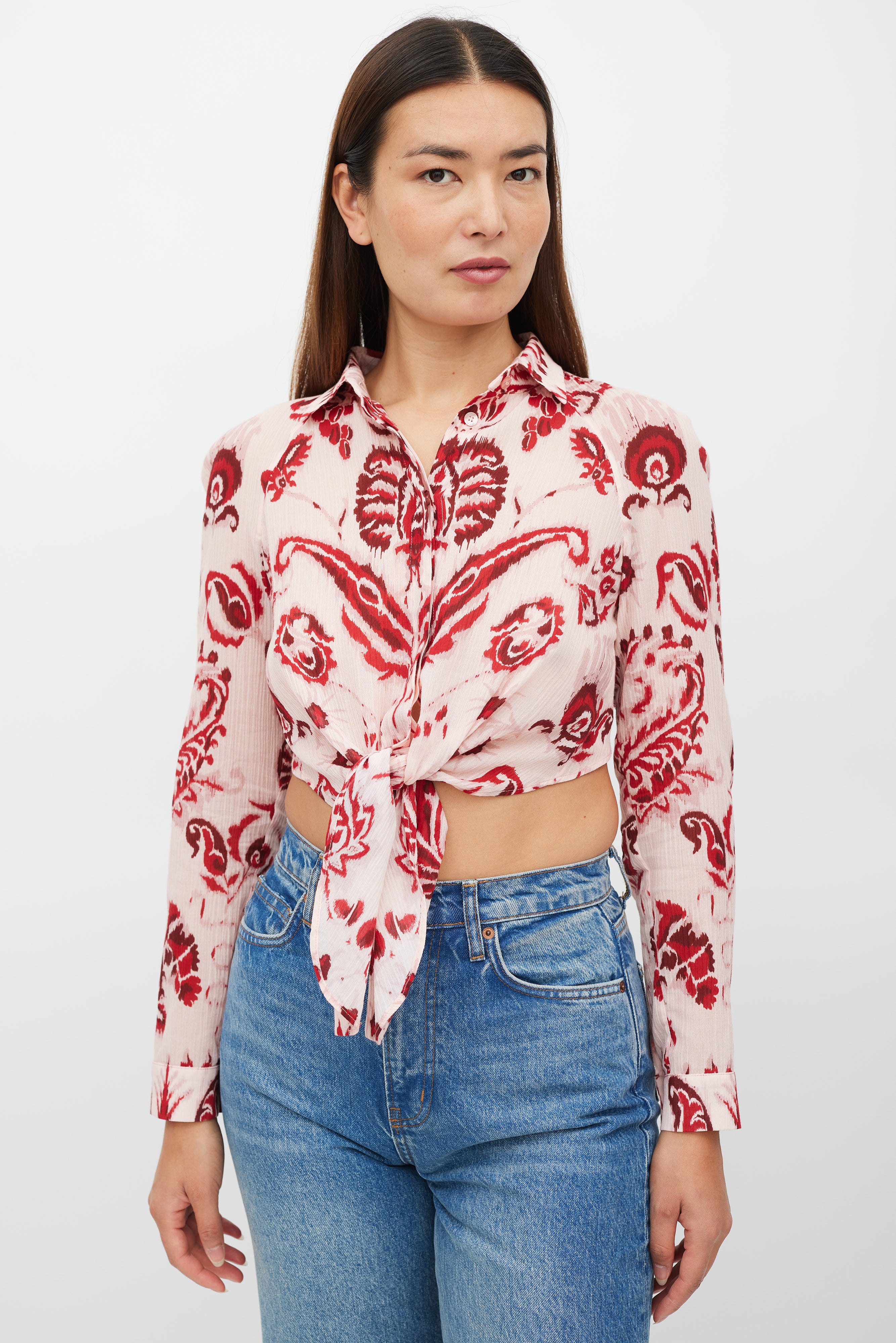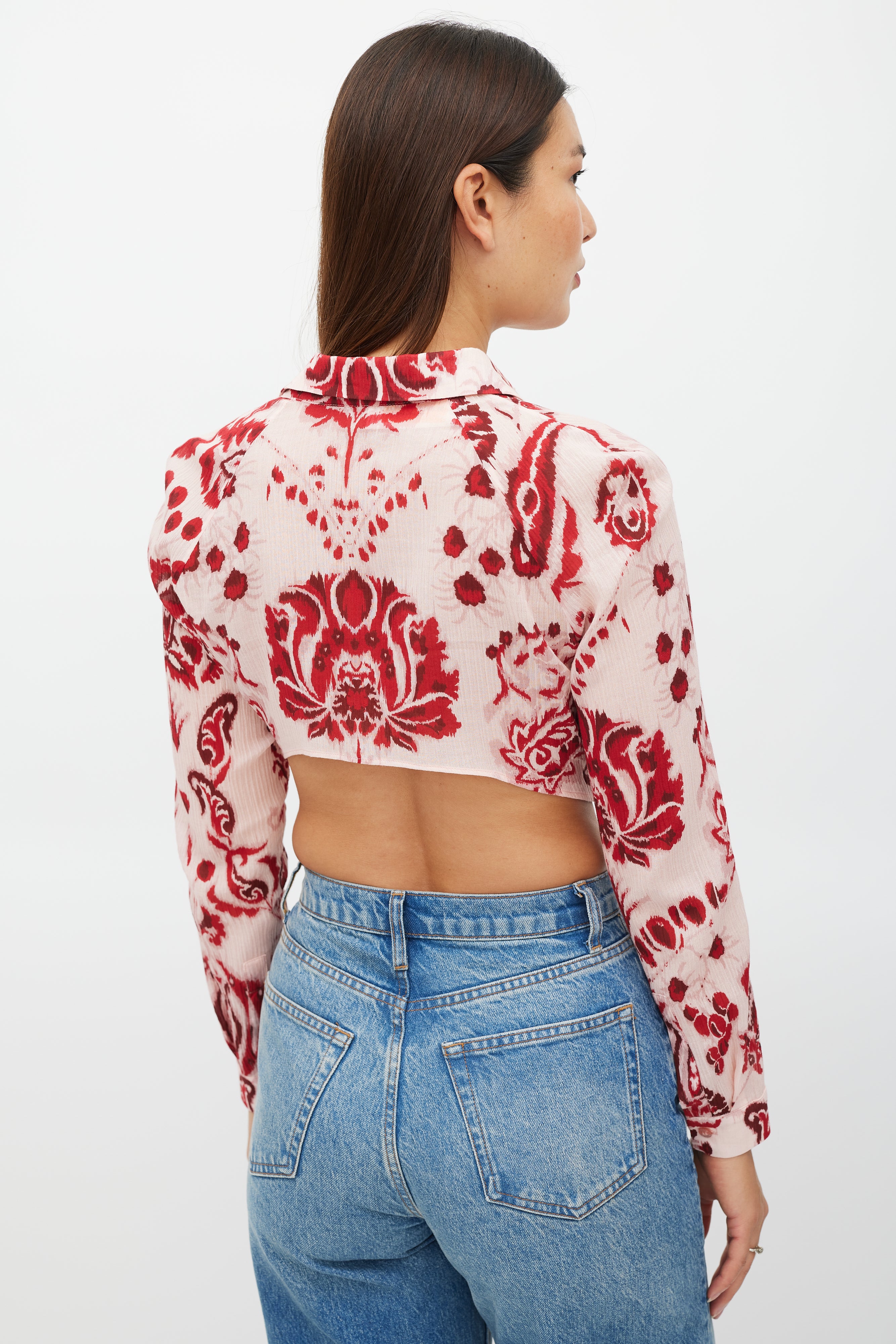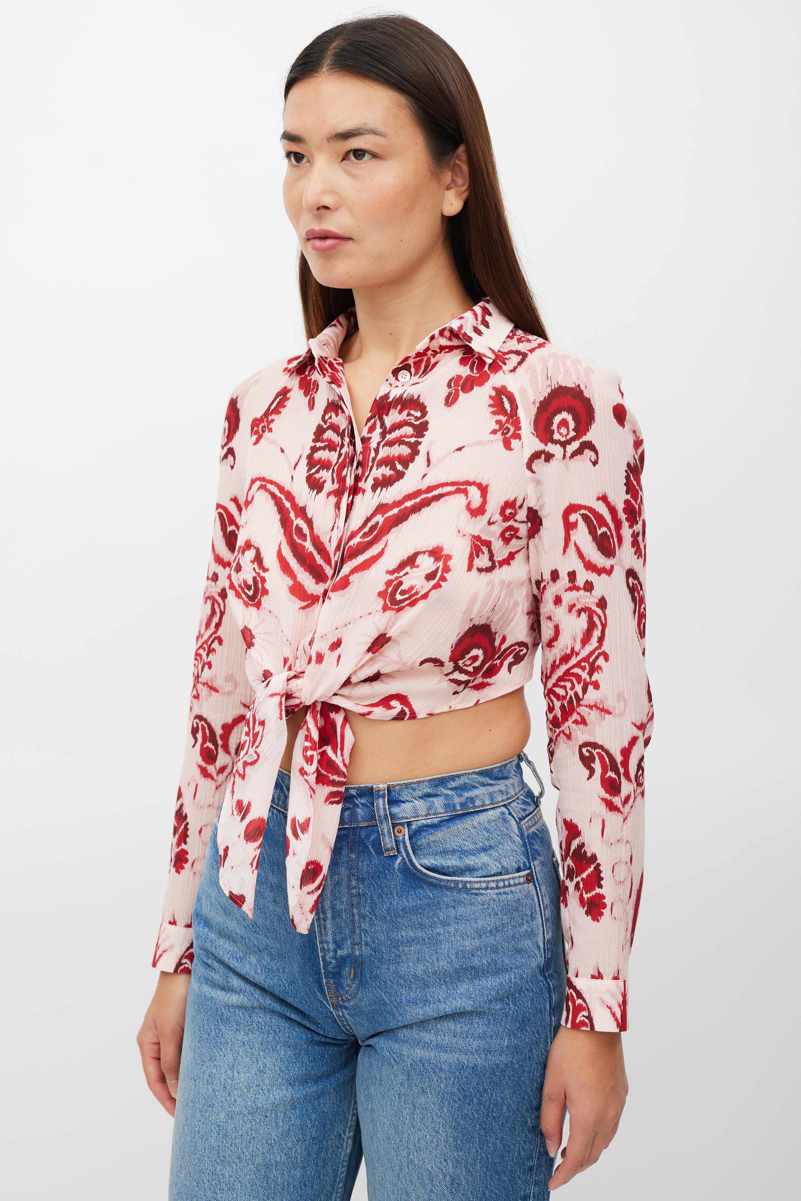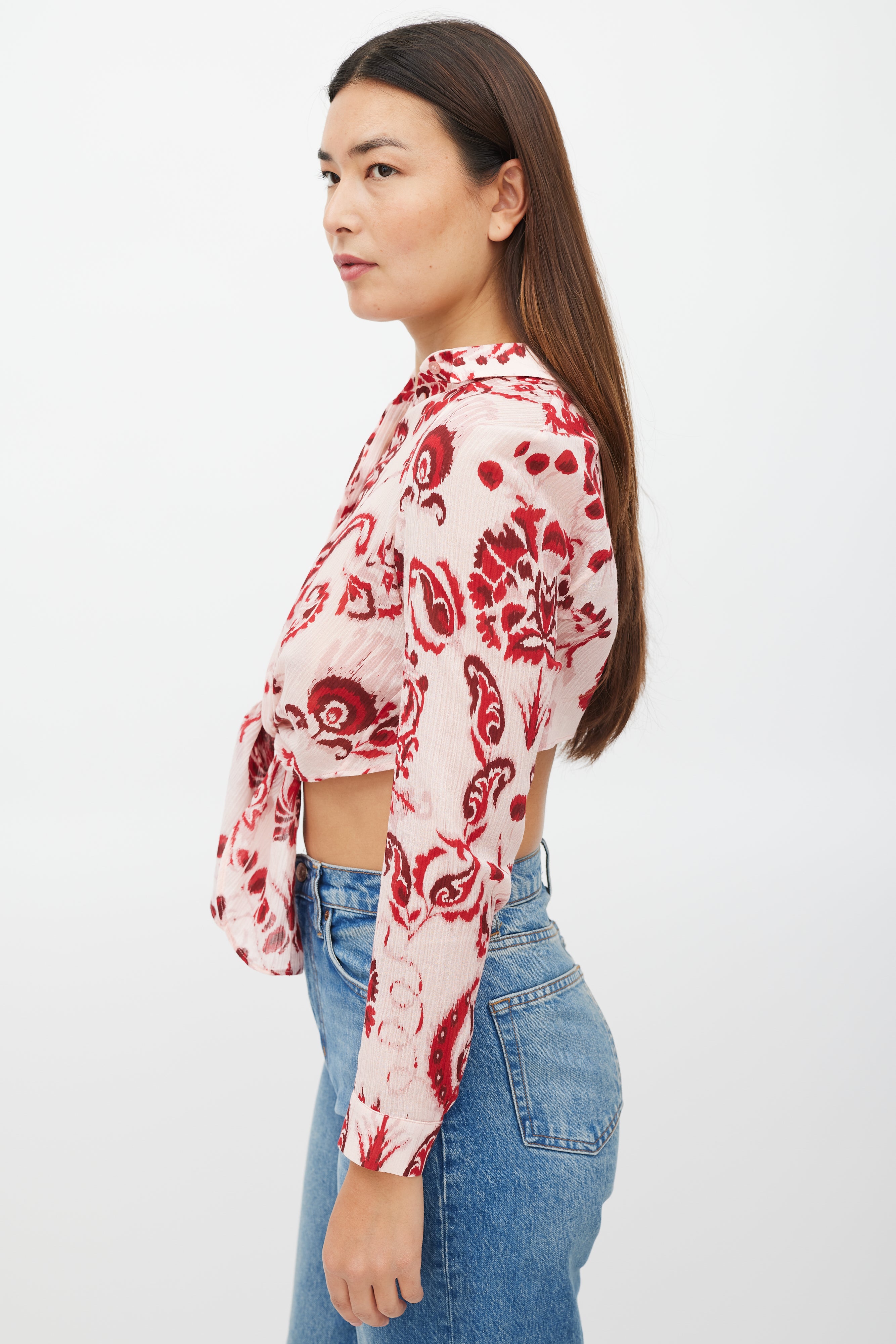 Pre-owned Etro pink top featuring a red floral pattern throughout, pointed collar, long sleeves with buttoned cuffs, cropped fit, and handkerchief hem with button up closure.