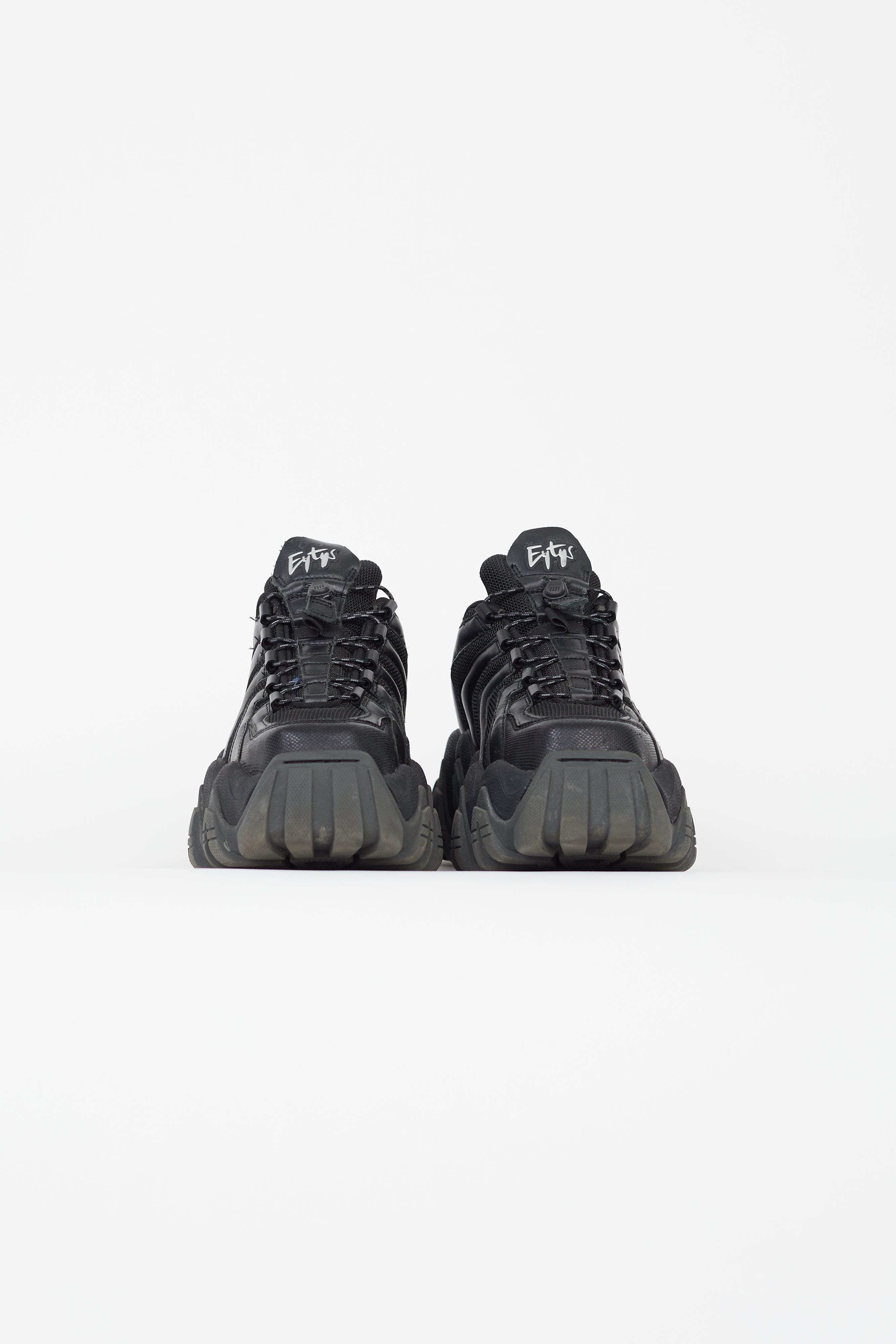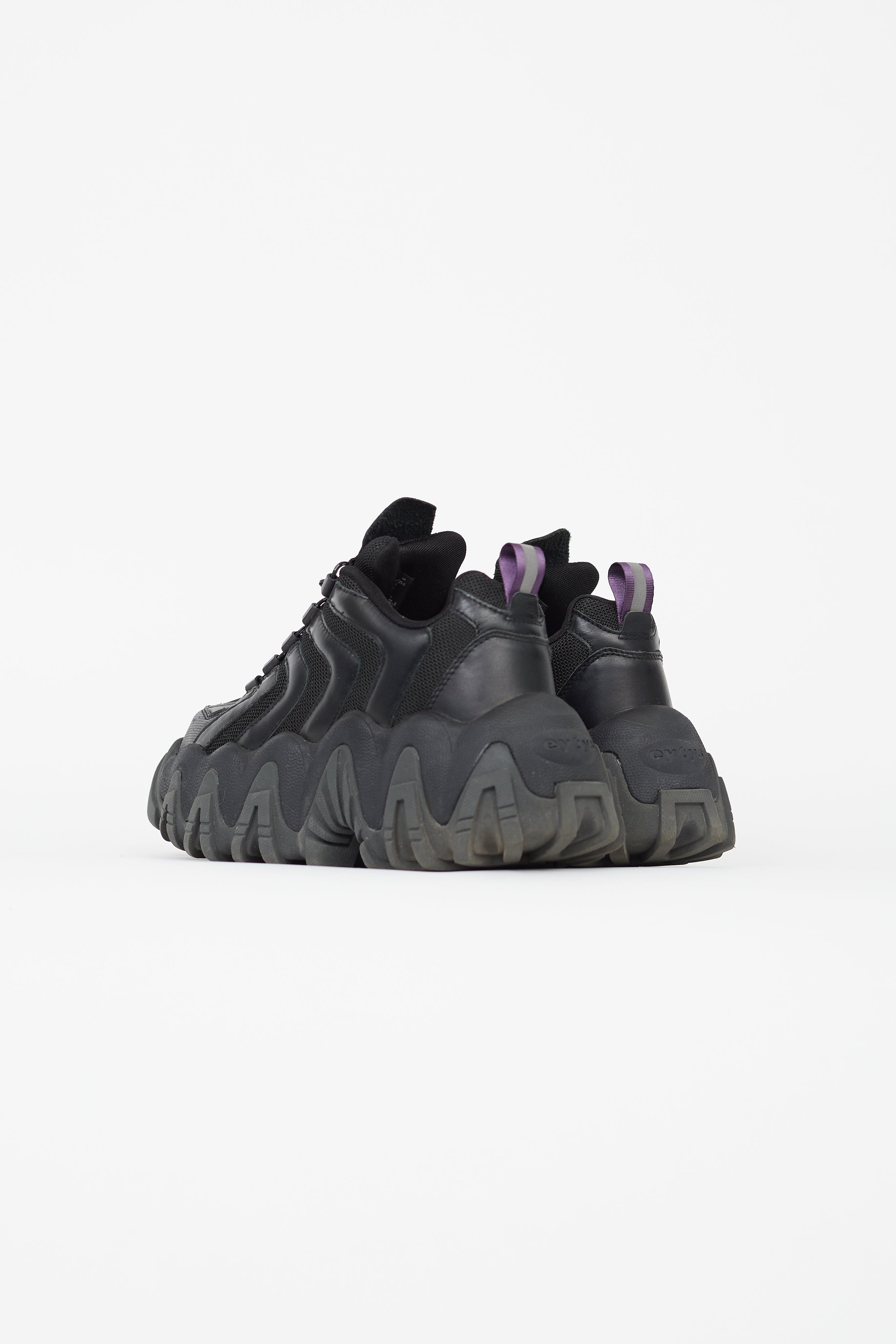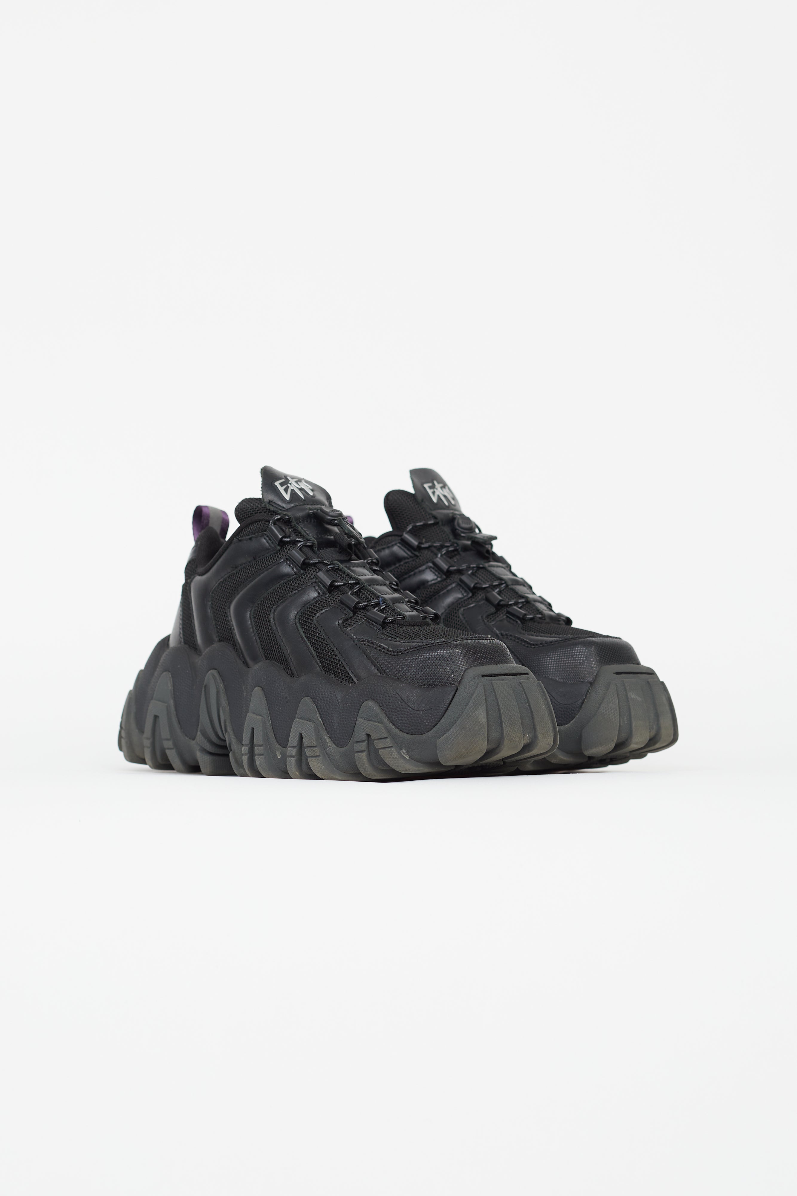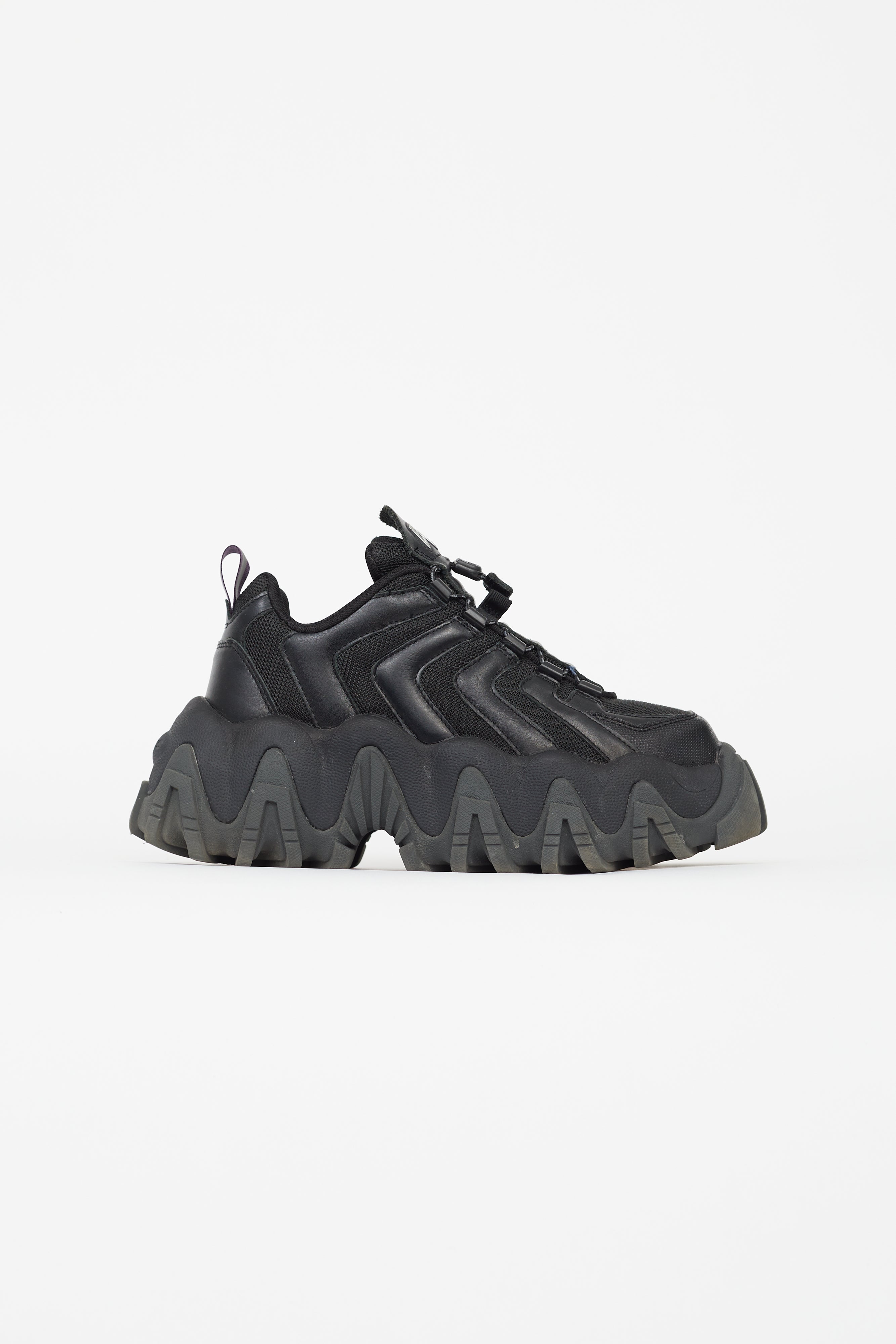 Pre-owned Eytys black Halo chunky sneaker featuring square toe, leather panelling at sides, platform rubber sole, pull tab at heel and front lace up closure.