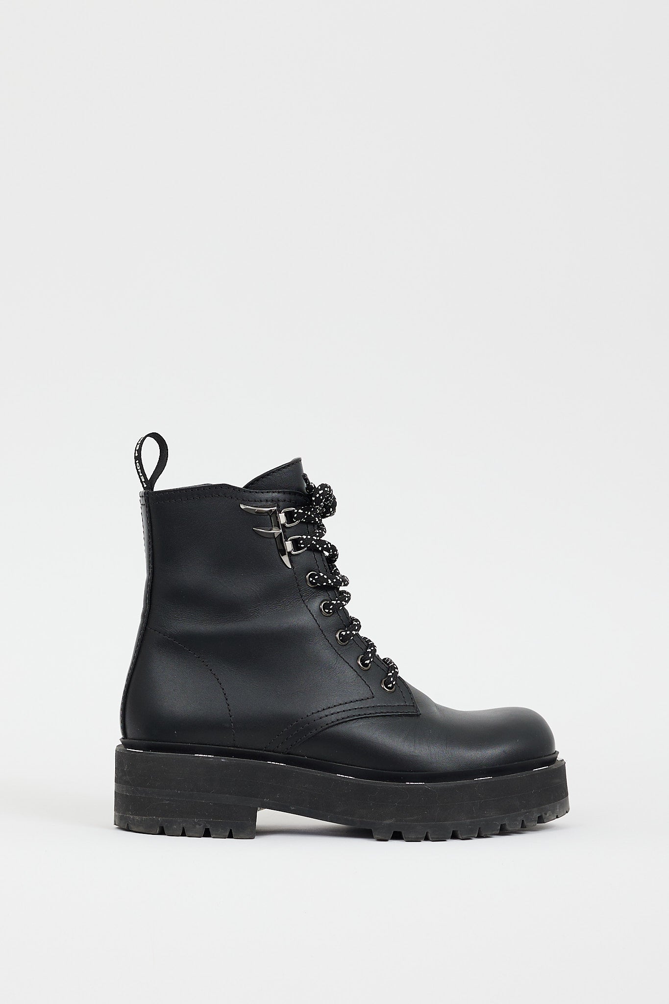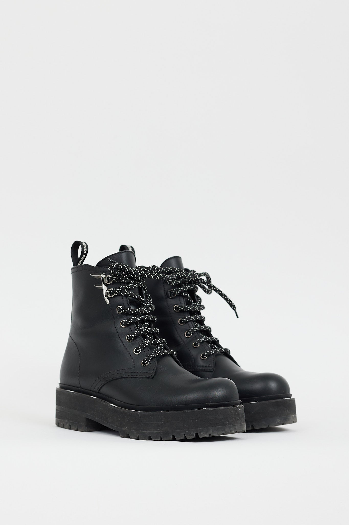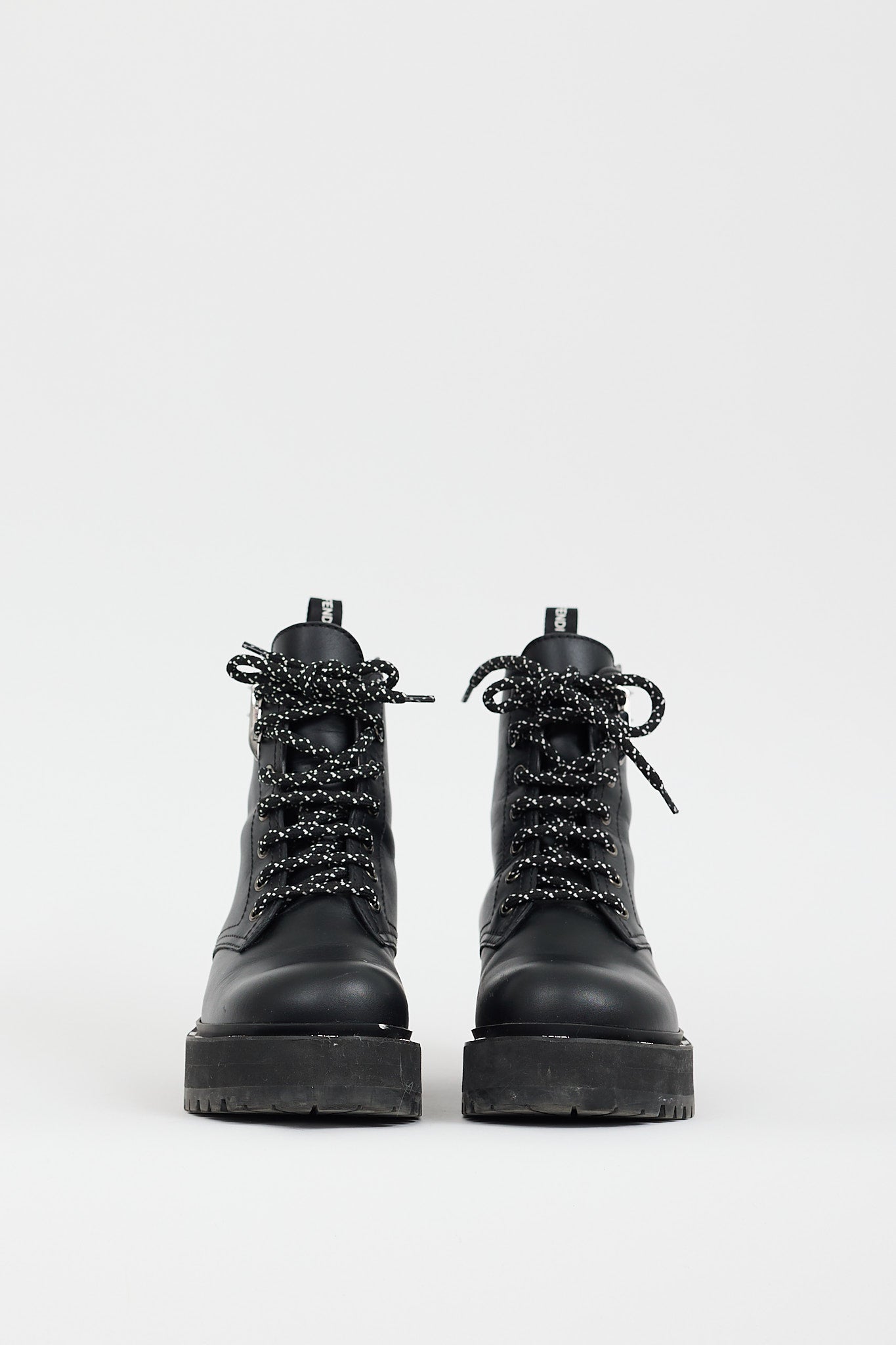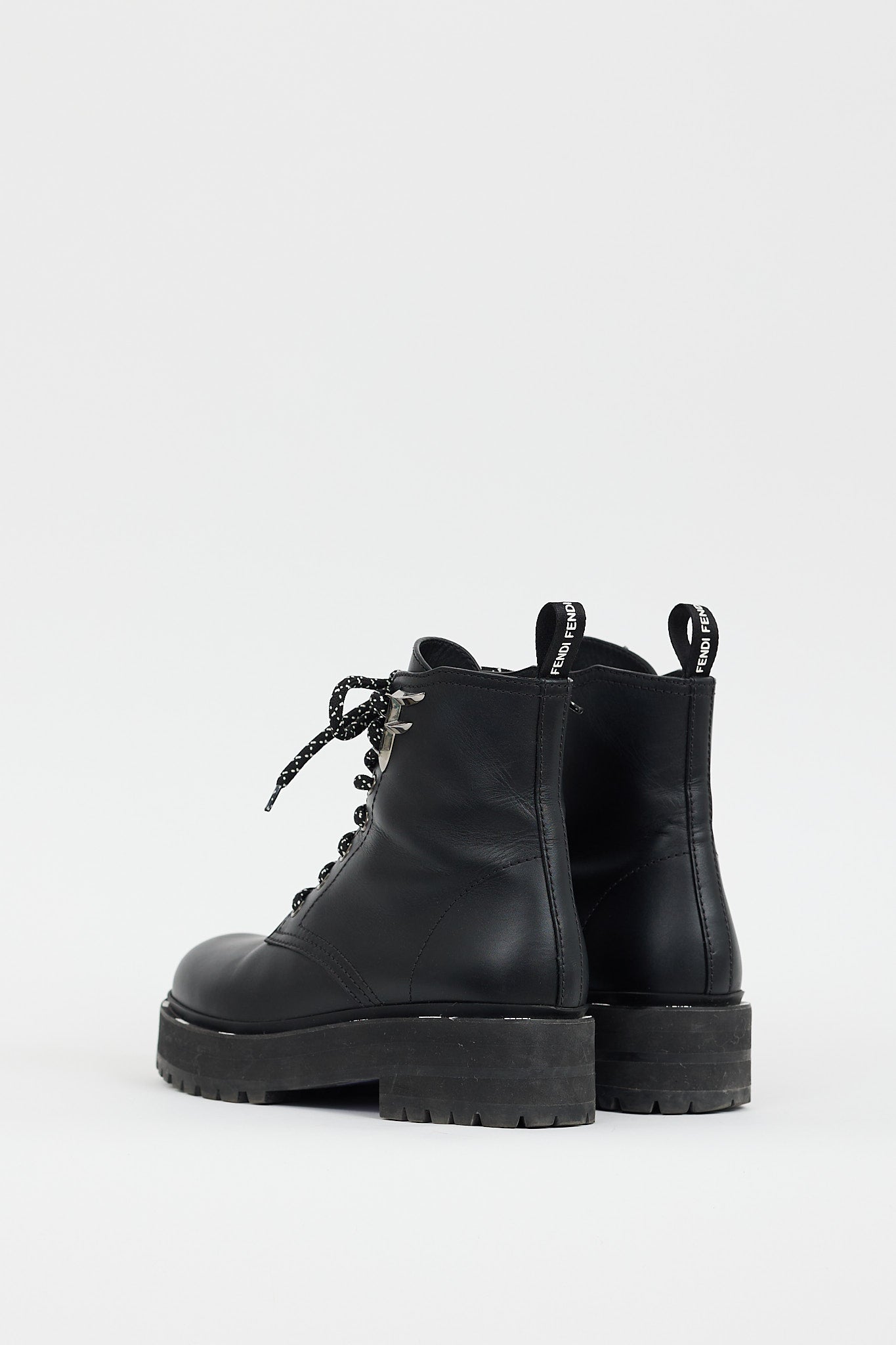Pre-owned Fendi black leather Freedom Biker boots featuring a rounded toe, lace up front, logo pull tab at counter, and treaded rubber sole with logo trim. Comes with original box and dust bags.