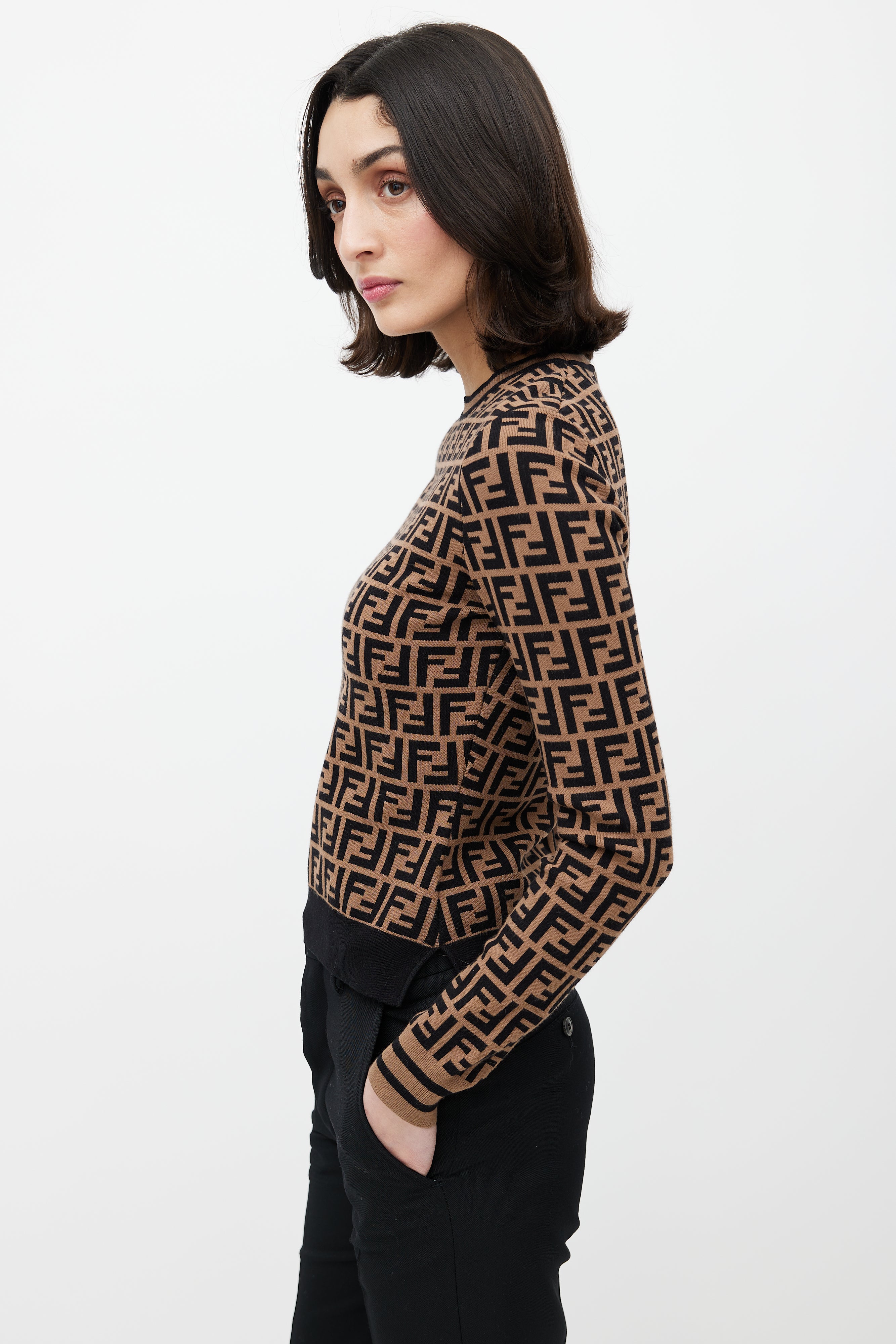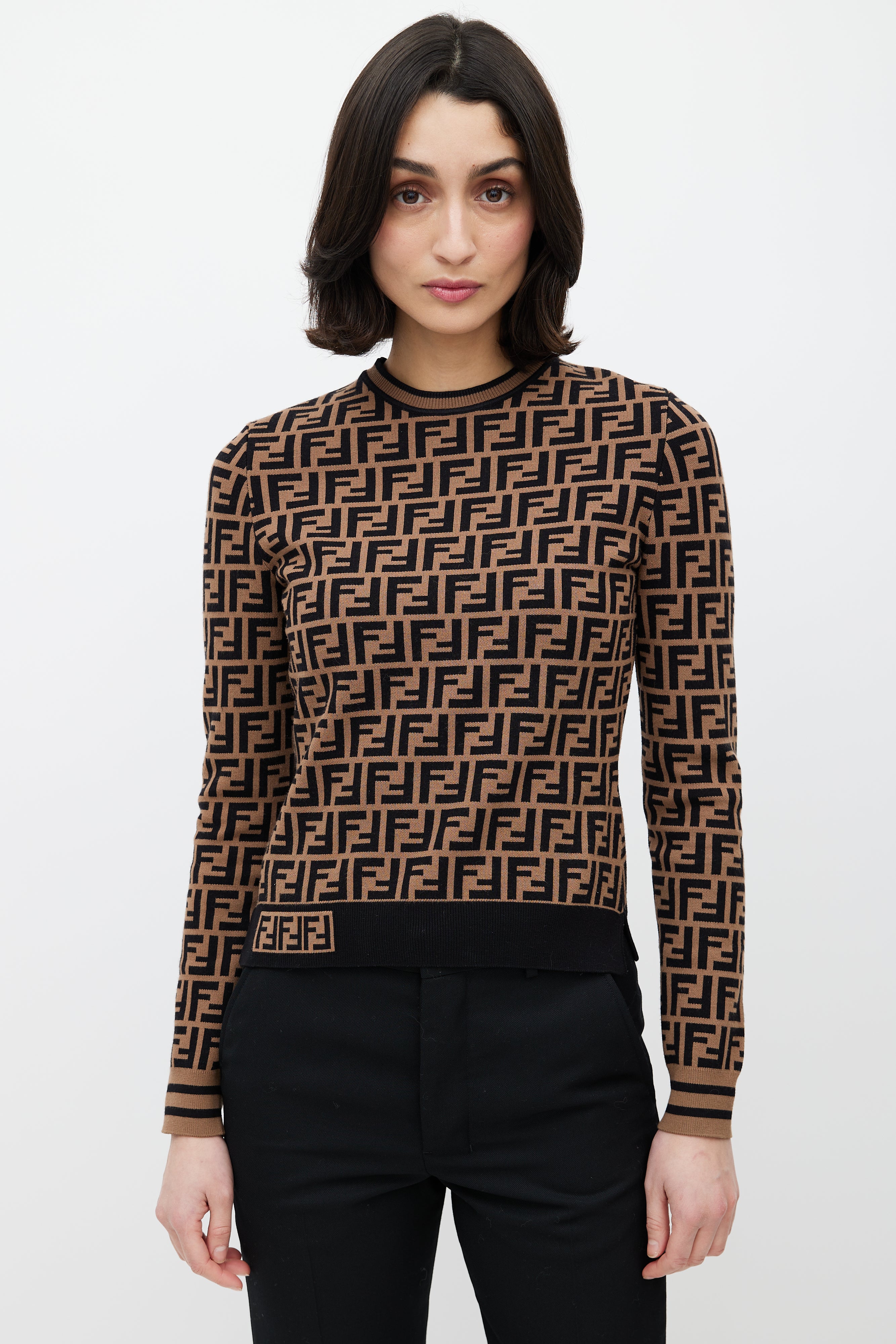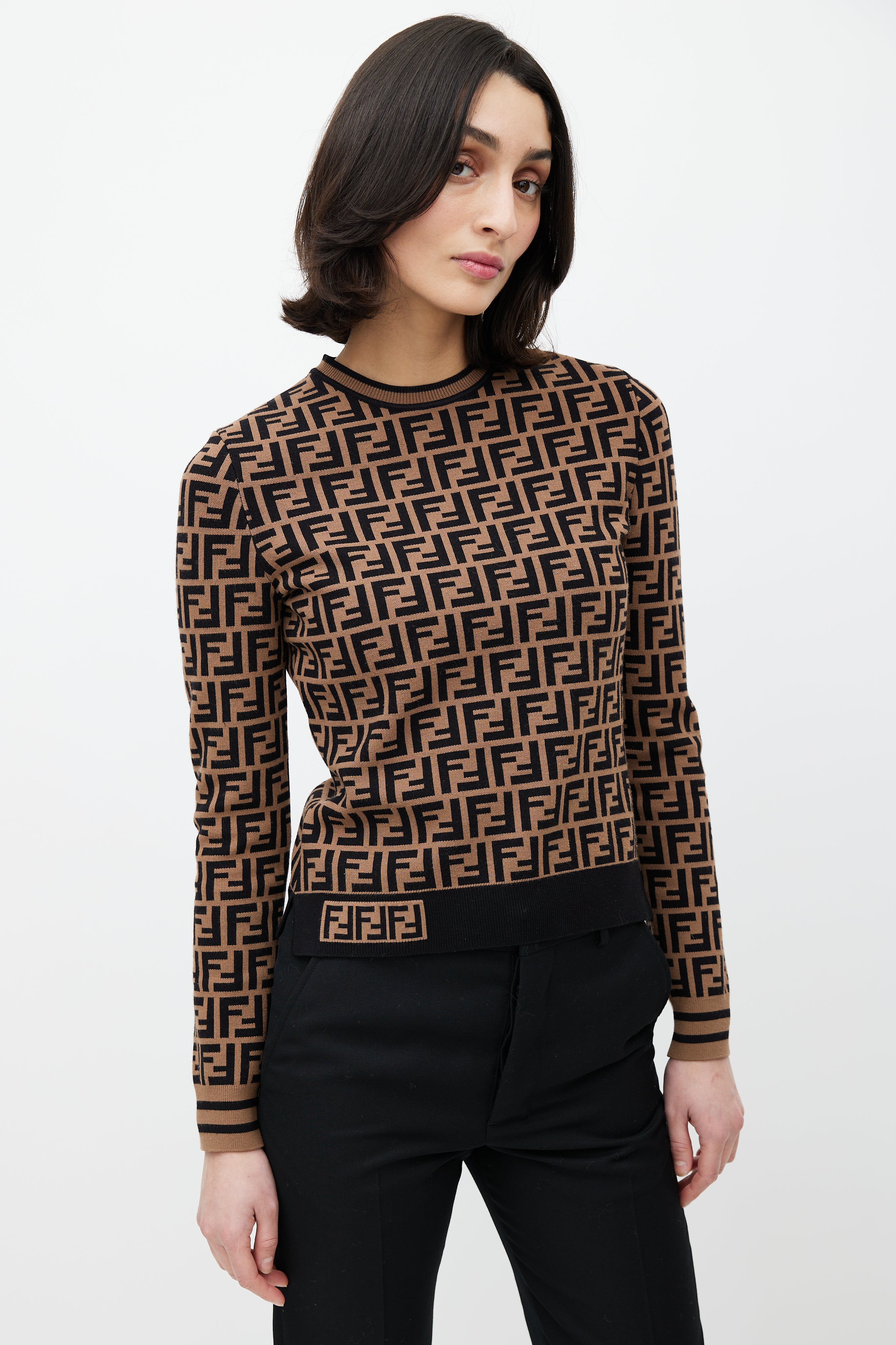 Pre-owned Fendi brown knit sweater featuring a black Zucca monogram throughout, round neckline, long sleeves, and ribbed hem.
