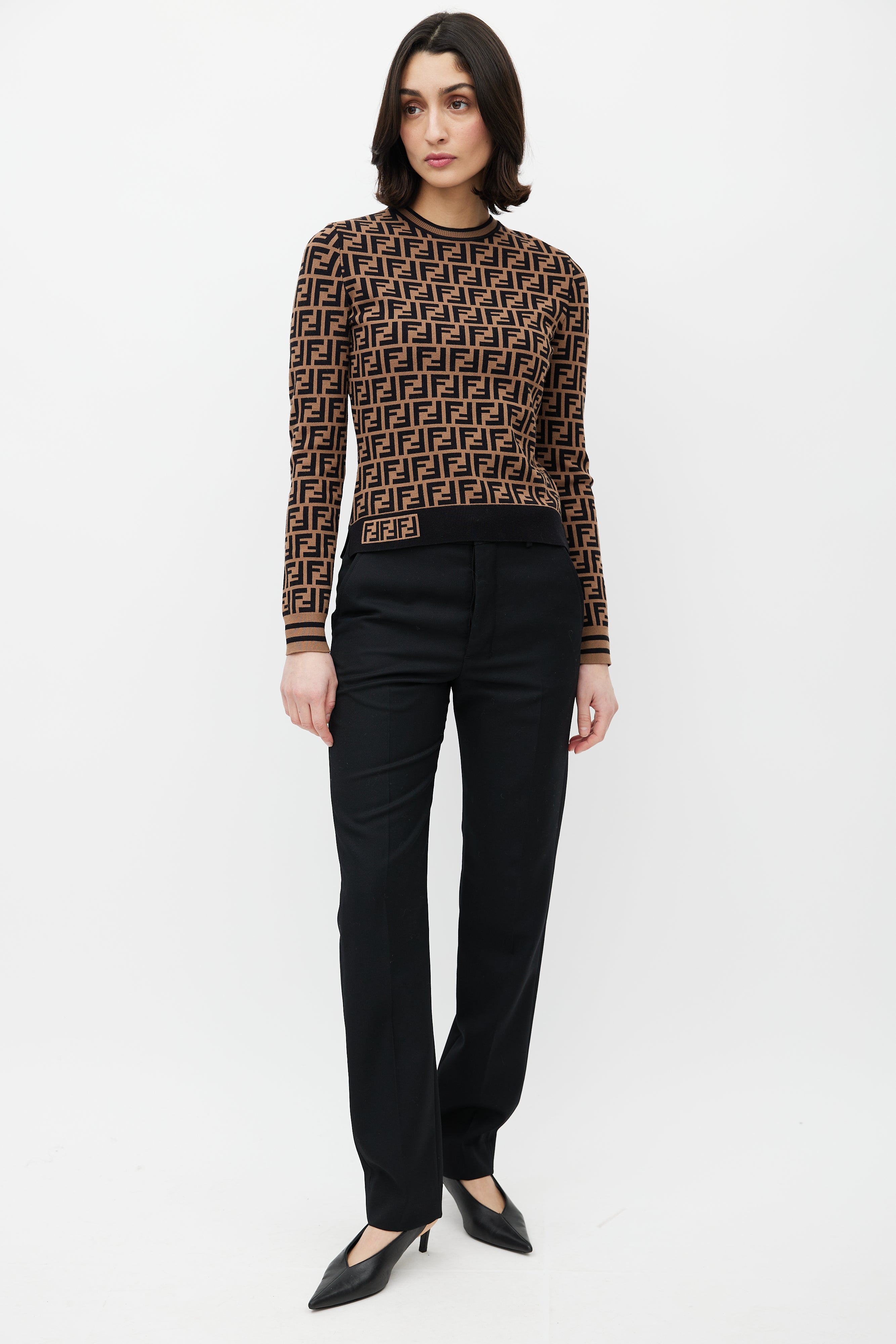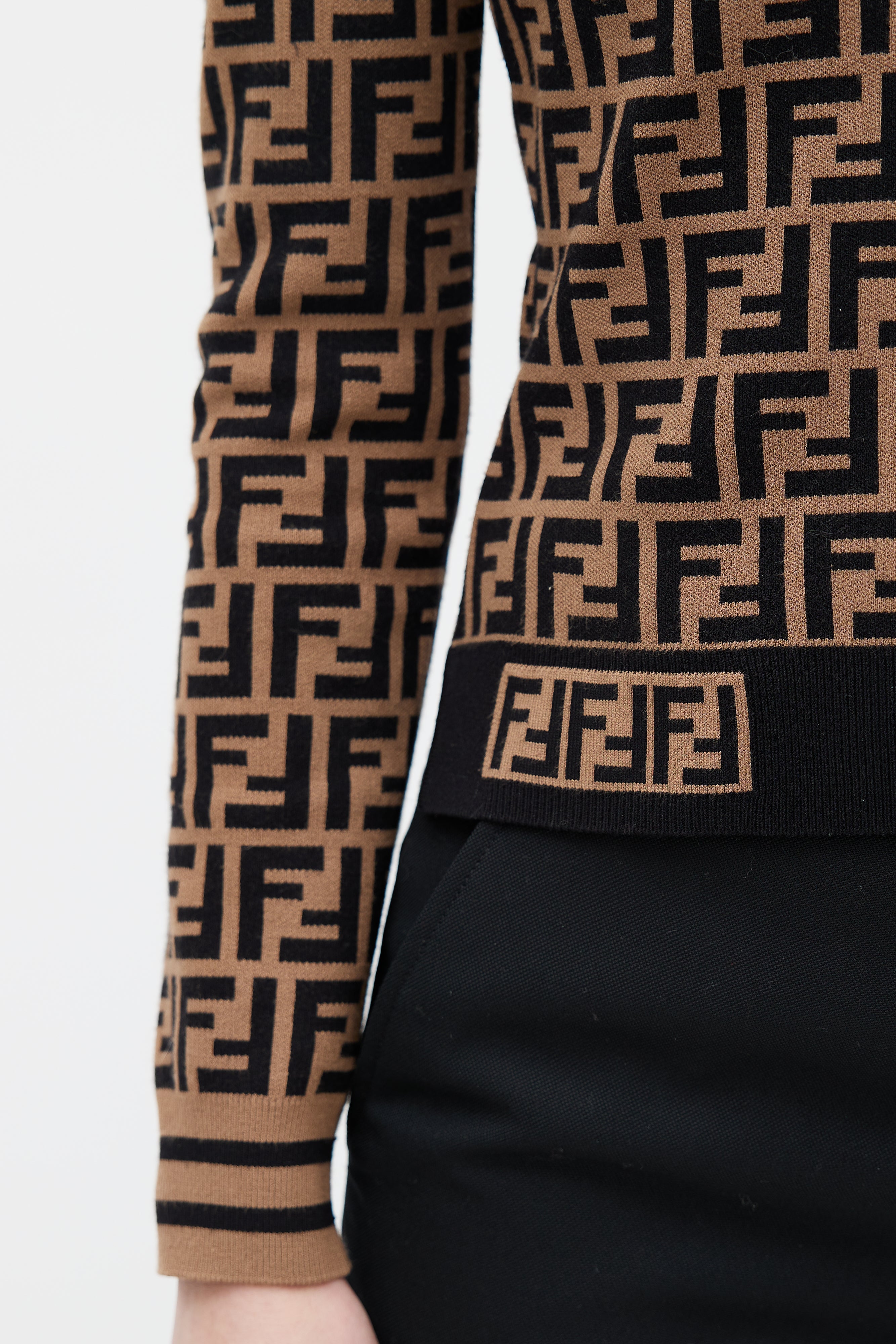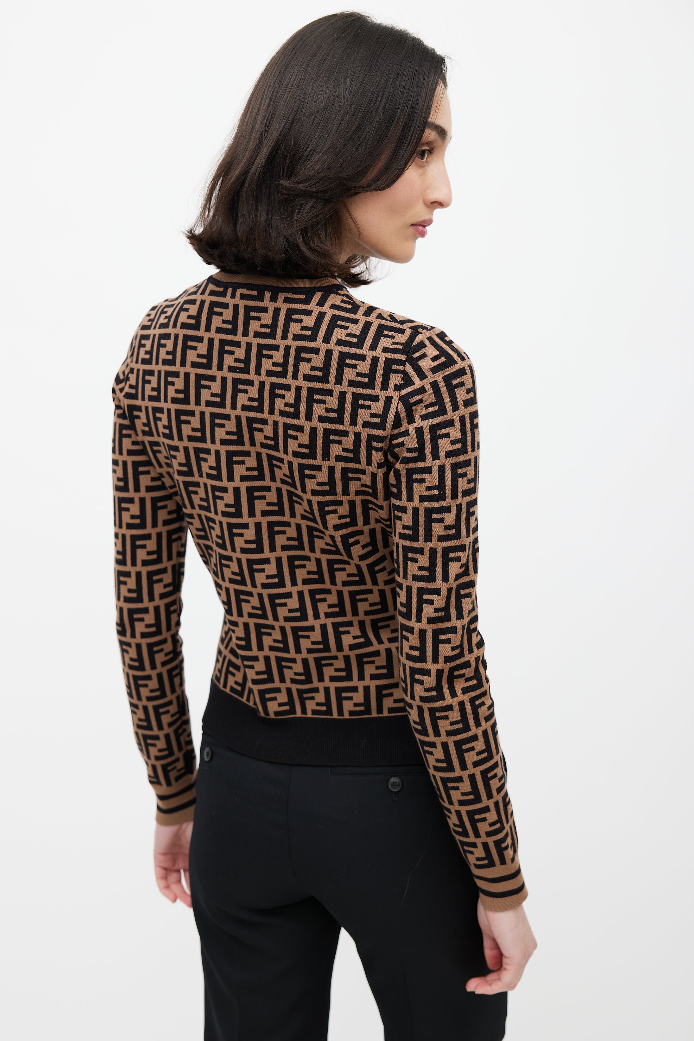 Pre-owned Fendi brown knit sweater featuring a black Zucca monogram throughout, round neckline, long sleeves, and ribbed hem.