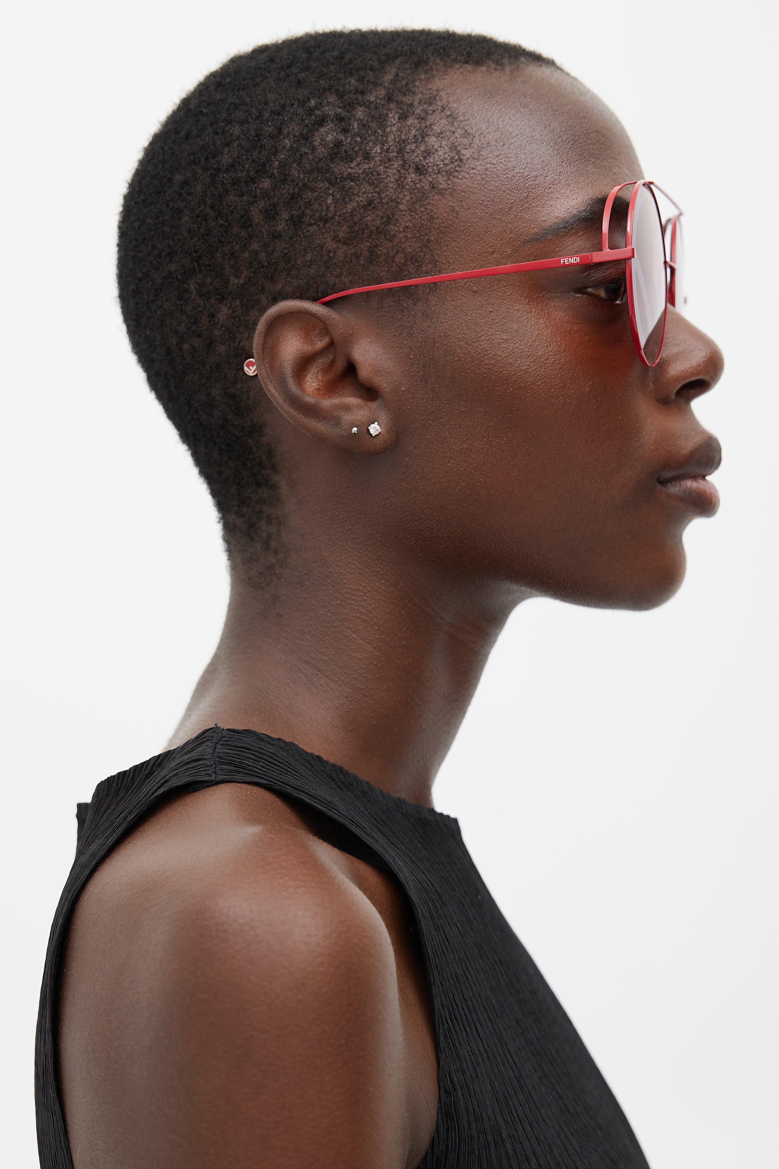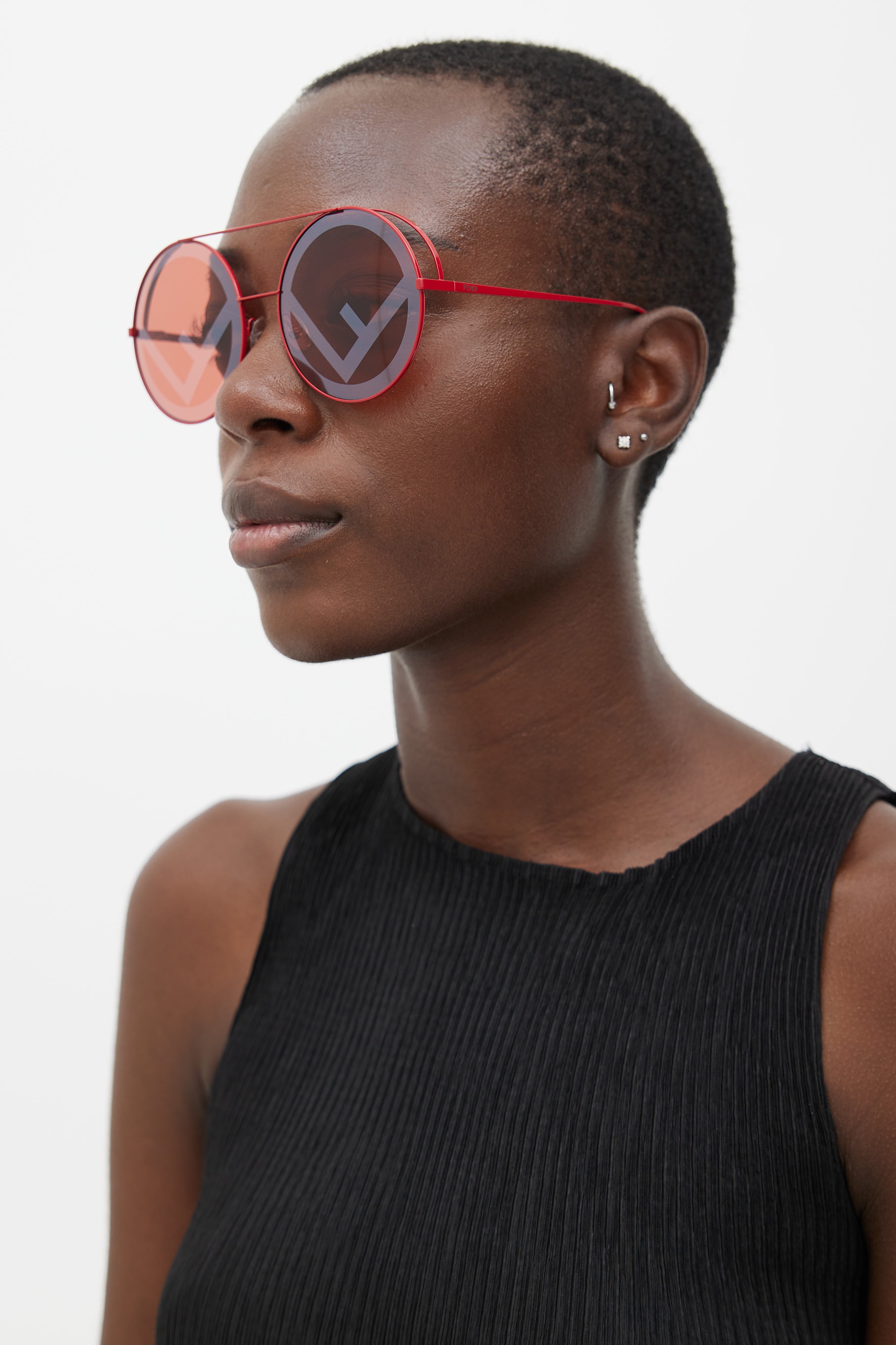 Pre-owned Fendi red FF0285/S sunglasses featuring oversized round lens, metal brow bar, nose pads, and F logo at lens. Comes with original case.