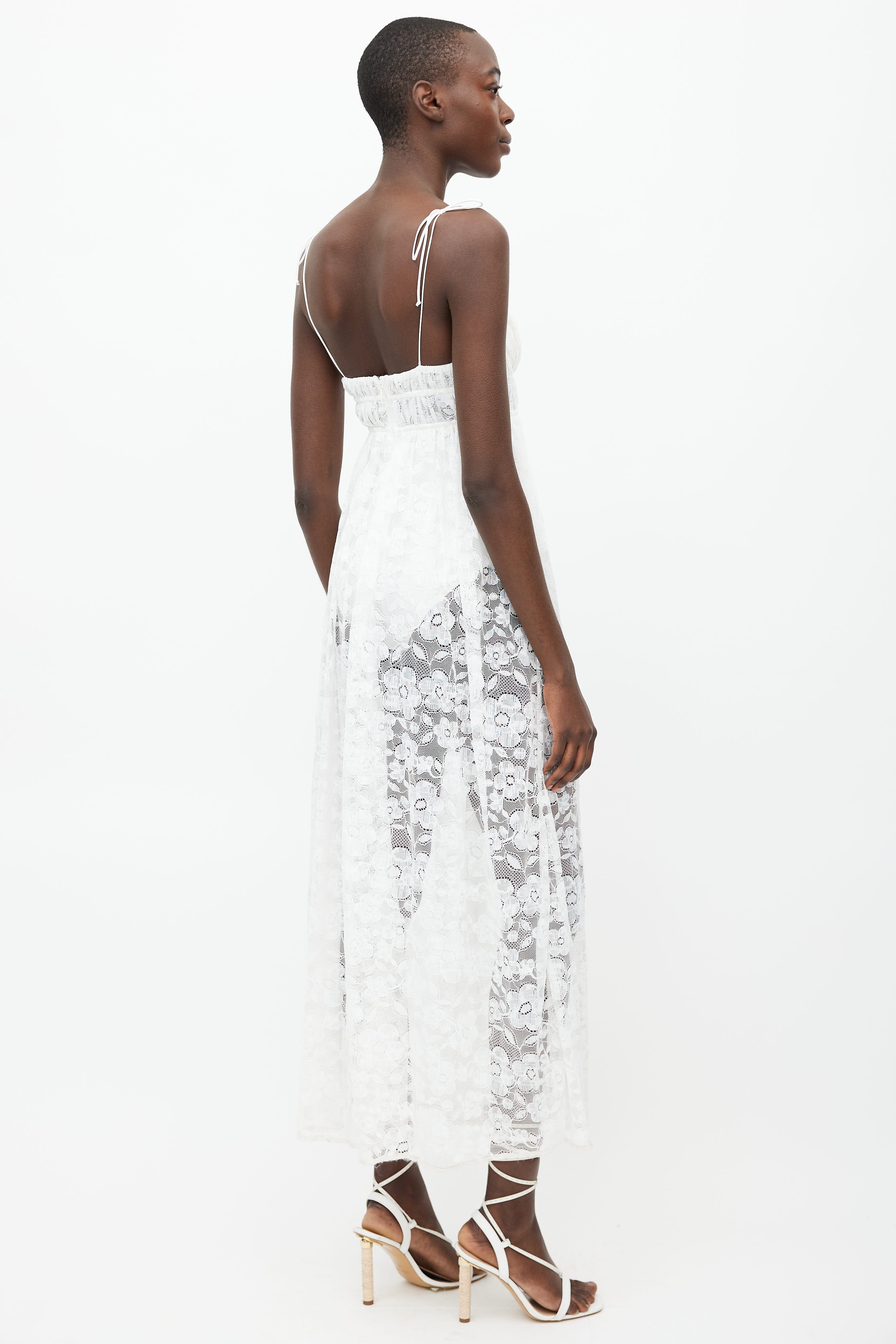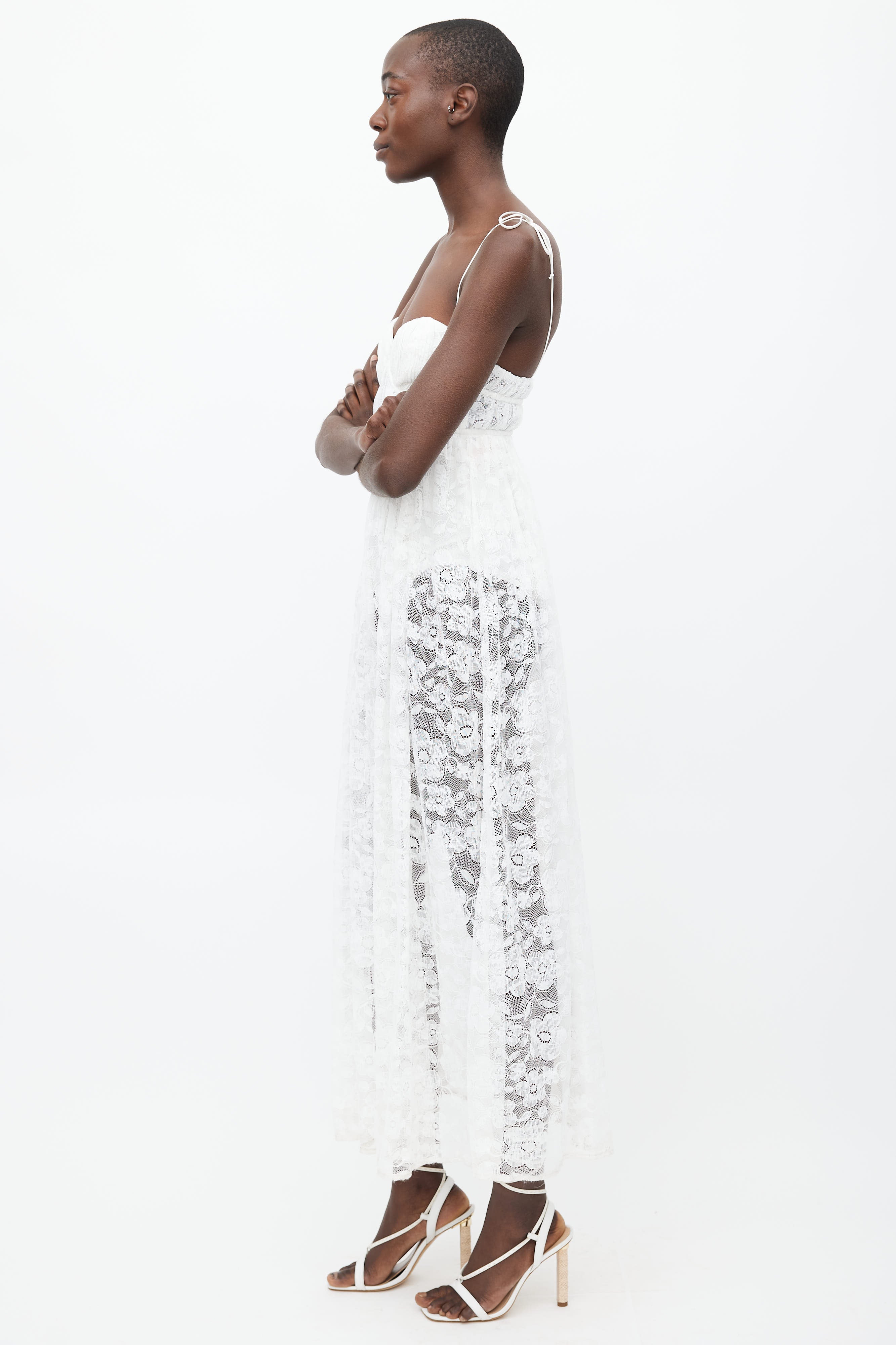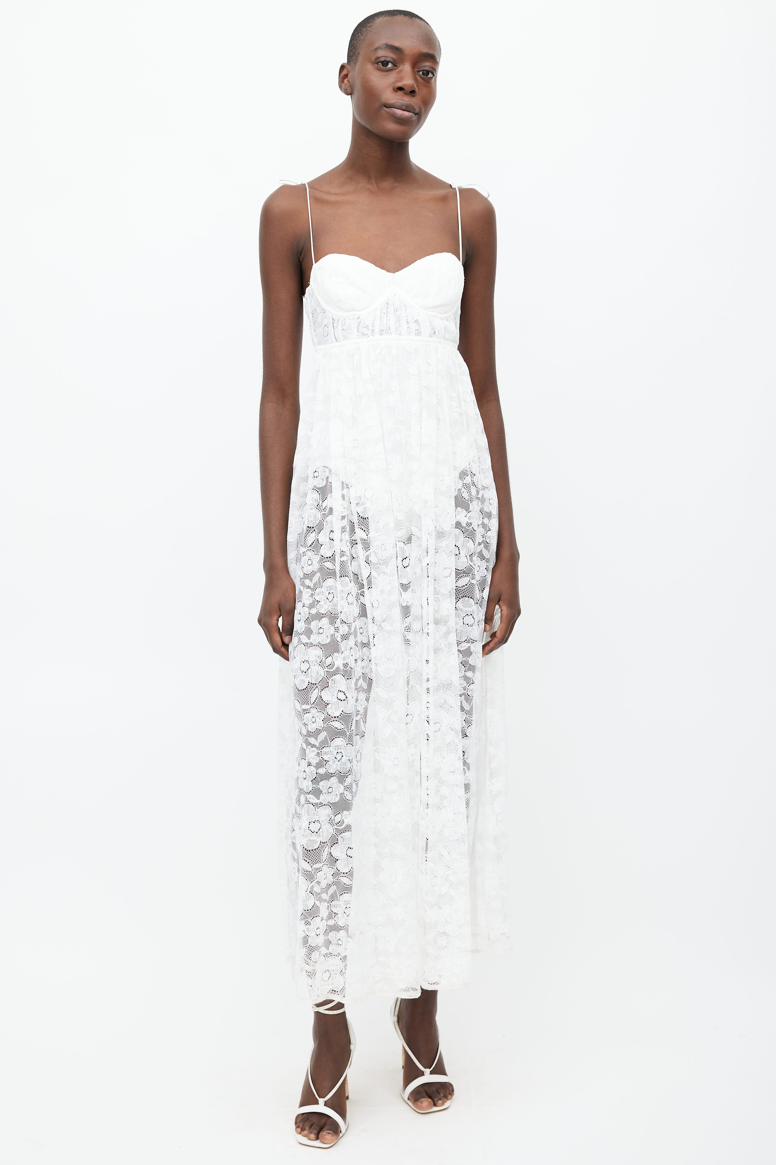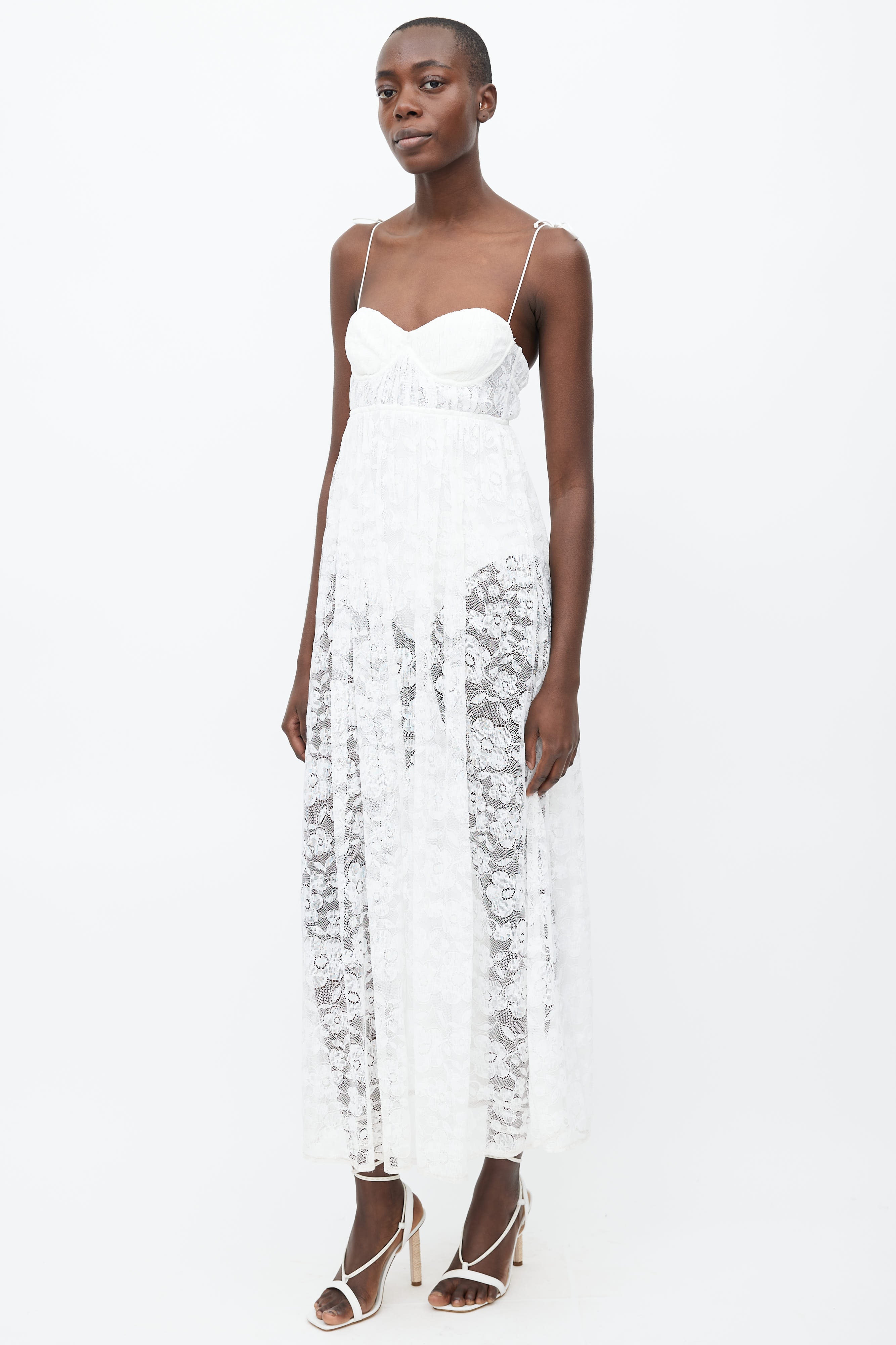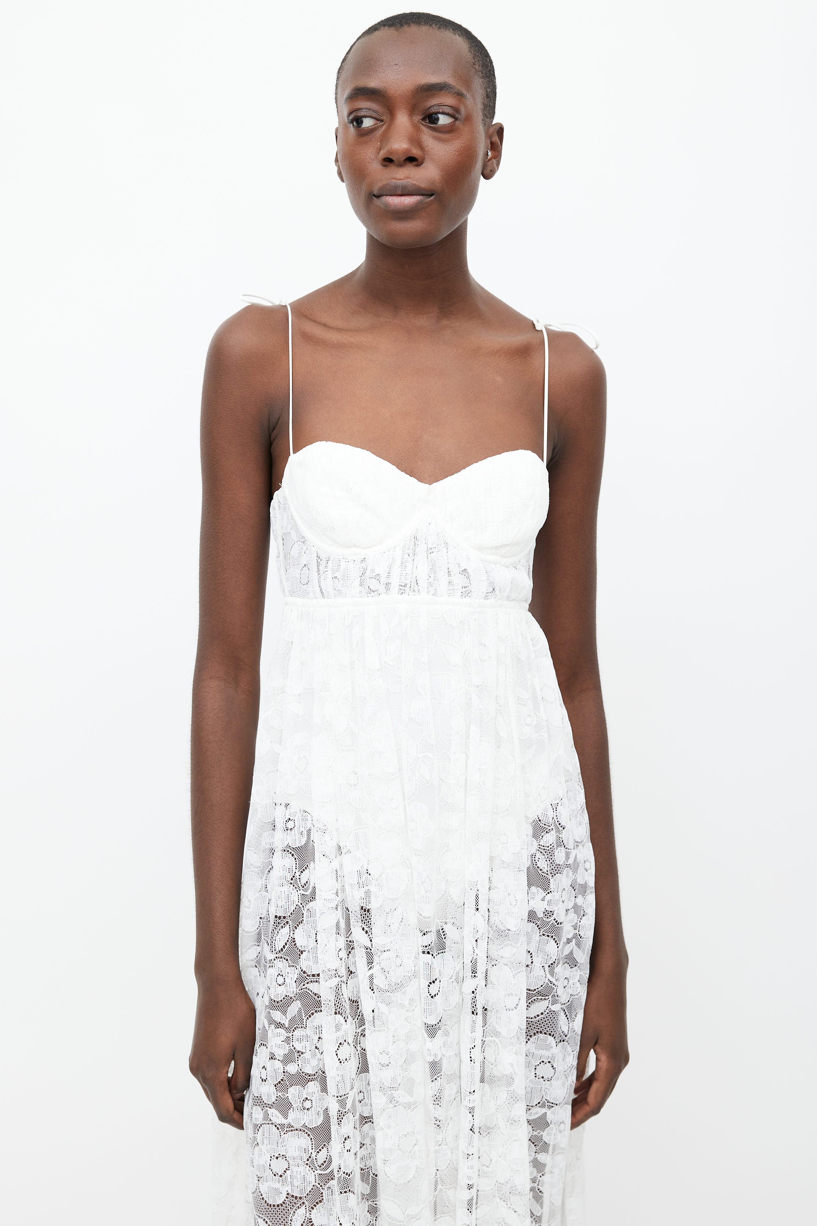 Pre-owned For Love & Lemons white dress featuring slim tie shoulder straps, sweetheart neckline, underwire bustier with pleated lace trims, boning detail at sides, elasticized waistband, concealed zip closure at back, long sheer lace skirt and attached one piece lining with snap buttons at bottom.
